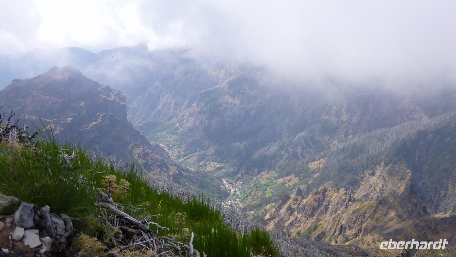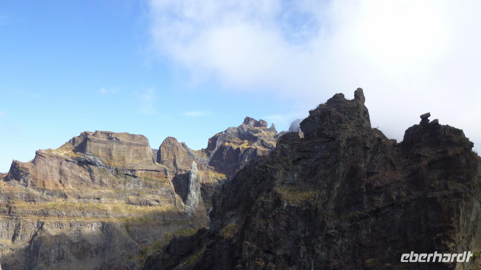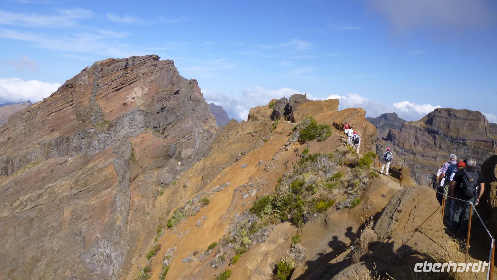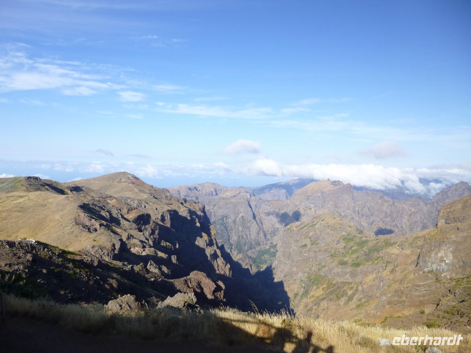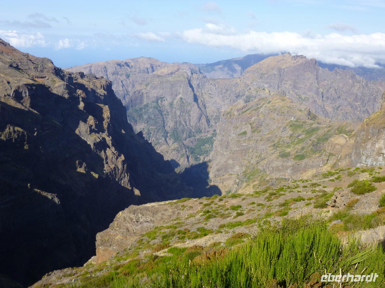 Heute lag die anspruchsvollste Wanderung vor uns, die Wanderung zwischen den Gipfeln Pico de Arivo und Pico Ruivo. Unsere Verpflegung, für diesen Tag, holten wir uns wieder in Santa Cruz. Wir starten unsere Wanderung am Pico Arivo. Vom Gipfel aus hatten wir einen schönen und weiten Blick. Sergio zeigte uns den Nonnenstall und erklärte uns wie der Name des Tals zustande kam. Die Wanderung führte entlang an Steilwänden in eine abgelegene Bergregion. Auf unsere Strecke teilte sich die Gruppe. Ein Teil ging mit Sergio den Tunnelweg, der andere Teil folgte mir über den Berg. Der Aufstieg war steil und durchaus anspruchsvoll, dafür hatte man einen wunderschonen Blick auf die beiden Gipfel. Die Gruppe, die Sergio führte verlief durch sieben Tunnel und über einen befestigten Weg. Beide Gruppen trafen sich am Forsthaus, von hier bewältigten wir die letzten 500m bis zum Gipfel. Von hier aus hatte man einen wunderbaren Blick über Madeira. Die letzte kurze Strecke legten wir dann gemeinsam zurück. Unser Busfahrer brachte uns anschließend nach Santana, wo wir die Möglichkeit hatten uns die Dreieckshäuschen mit ihren Strohdächern anzusehen oder uns die Zeit bei einem Kaffee oder Bier zu genießen.