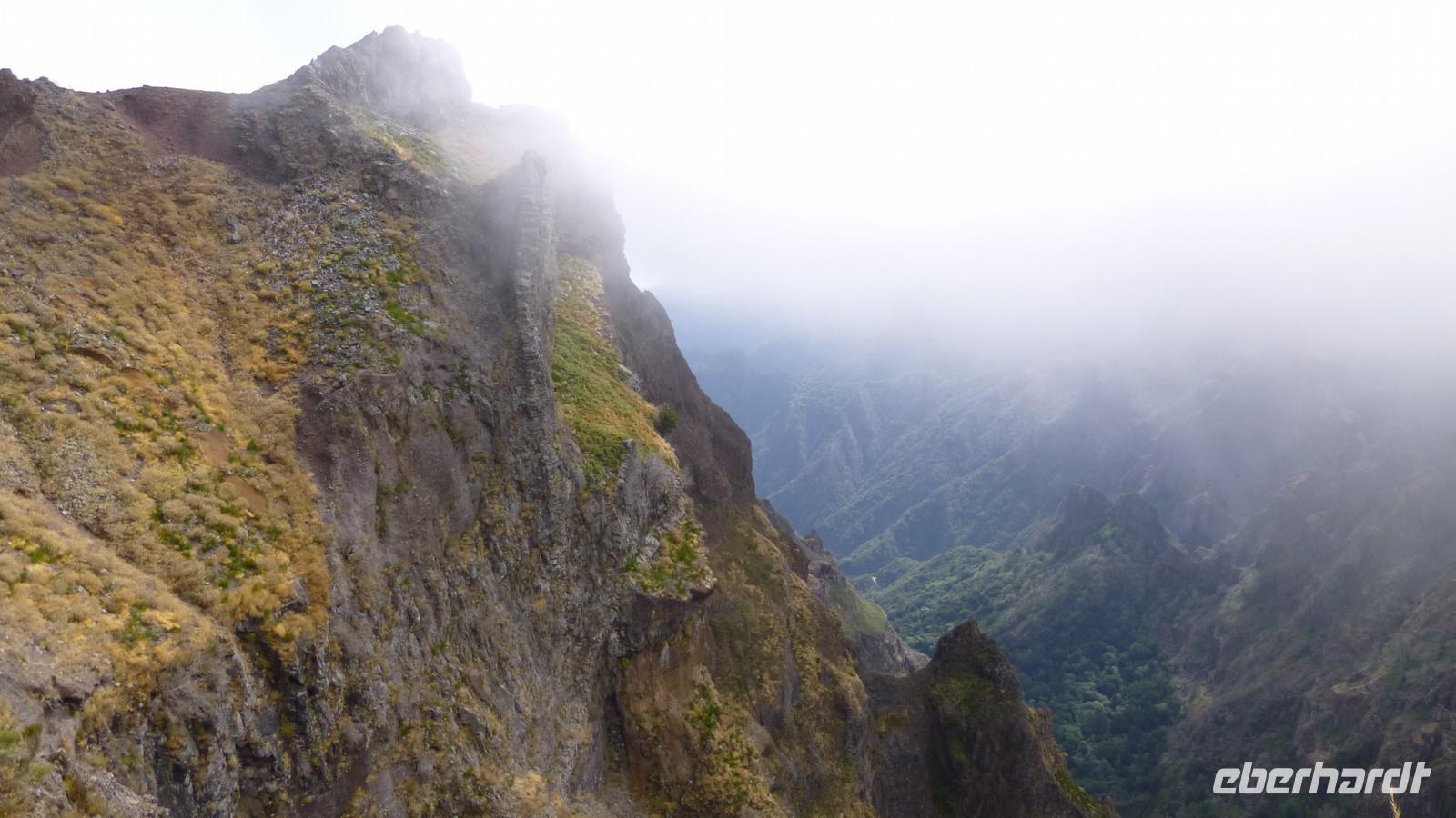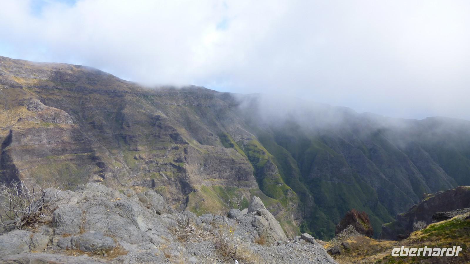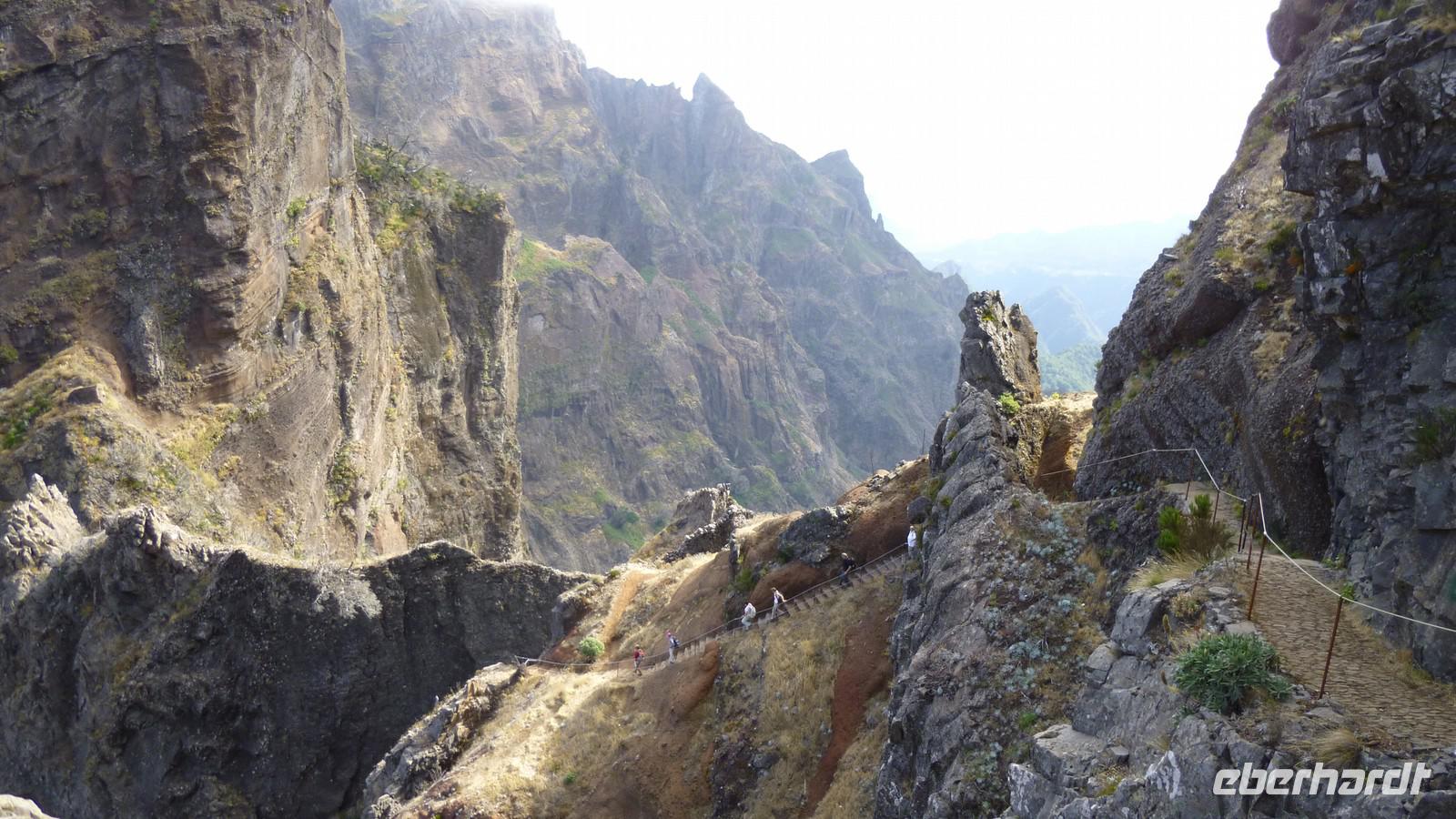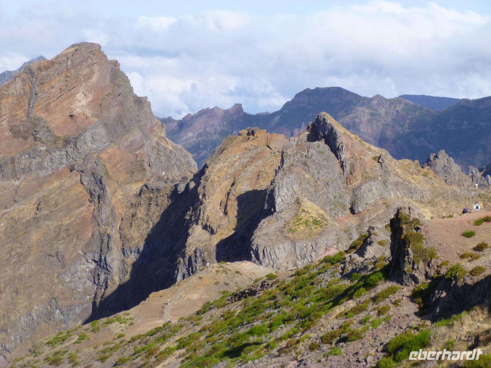 Heute lag die anspruchsvollste Wanderung vor uns, die Wanderung zwischen den Gipfeln Pico de Arivo und Pico Ruivo. Unsere Verpflegung, für diesen Tag, holten wir uns wieder in Santa Cruz. Wir starten unsere Wanderung am Pico Arivo. Vom Gipfel aus hatten wir einen schönen und weiten Blick. Sergio zeigte uns den Nonnenstall und erklärte uns wie der Name des Tals zustande kam. Die Wanderung führte entlang an Steilwänden in eine abgelegene Bergregion. Auf unsere Strecke teilte sich die Gruppe. Ein Teil ging mit Sergio den Tunnelweg, der andere Teil folgte mir über den Berg. Der Aufstieg war steil und durchaus anspruchsvoll, dafür hatte man einen wunderschonen Blick auf die beiden Gipfel. Die Gruppe, die Sergio führte verlief durch sieben Tunnel und über einen befestigten Weg. Beide Gruppen trafen sich am Forsthaus, von hier bewältigten wir die letzten 500m bis zum Gipfel. Von hier aus hatte man einen wunderbaren Blick über Madeira. Die letzte kurze Strecke legten wir dann gemeinsam zurück. Unser Busfahrer brachte uns anschließend nach Santana, wo wir die Möglichkeit hatten uns die Dreieckshäuschen mit ihren Strohdächern anzusehen oder uns die Zeit bei einem Kaffee oder Bier zu genießen.