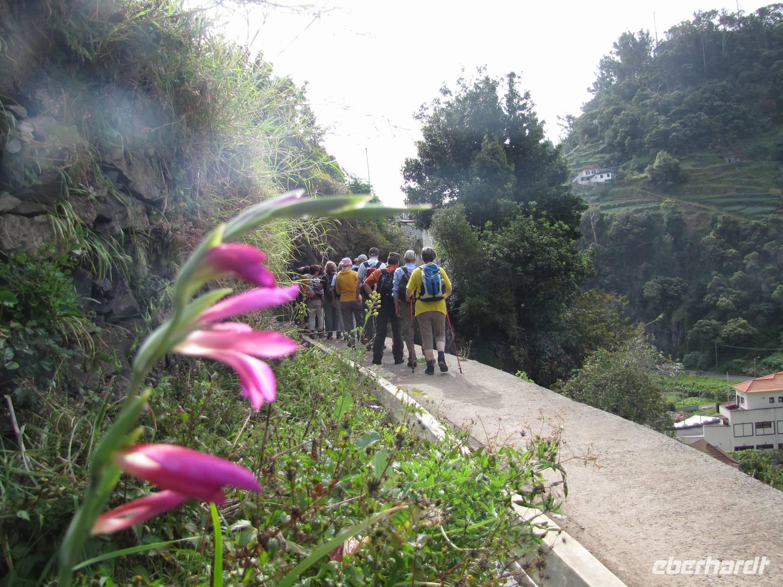 Früh am Morgen trafen sich 16 Wanderer am Flughafen Dresden um gemeinsam mit dem Reisebus nach Berlin-Tegel zu fahren. In der Hauptstadt angekommen stießen noch 5 weitere Wanderfreunde hinzu, so dass die Gruppe komplett war. Gemeinsam flogen wir mit voller Erwartung auf die Blumeninsel Madeira im Atlantik. Auf der portugiesischen Vorzeige Insel angekommen empfing uns unser Reiseleiter Nuno Oliveira gleich in der Ankunftshalle. Gemeinsam fuhren wir zum Hotel und checkten gemeinsam ein. Schon der erste Eindruck der schönen Hotelgartenanlage war beeindruckend für uns. Eine solche Vielzahl von Pflanzen hat kaum einer erwartet in einer Hotelanlage. Nachdem wir die Zimmer bezogen haben, trafen wir uns kurz danach alle zusammen mit Nuno und dem Agenturchef Hilario für ein kleines Infomeeting mit Begrüßungsgetränk. Gemeinsam besprachen wir die kommende Woche und die fakultativen Ausflüge. Abends gingen wir alle in ein Madeira typisches Restaurant und probierten als erstes den Degenfisch Espada und die traditionellen Fleischspieße Espetata. Es war ein Genuss! Gut gesättigt gingen wir gegen um 10 ins Bett und freuten uns auf den ersten Ausflugstag.Tag 2 Sonntag 21.04.13 - Wanderung entlang der Levada von Marocos