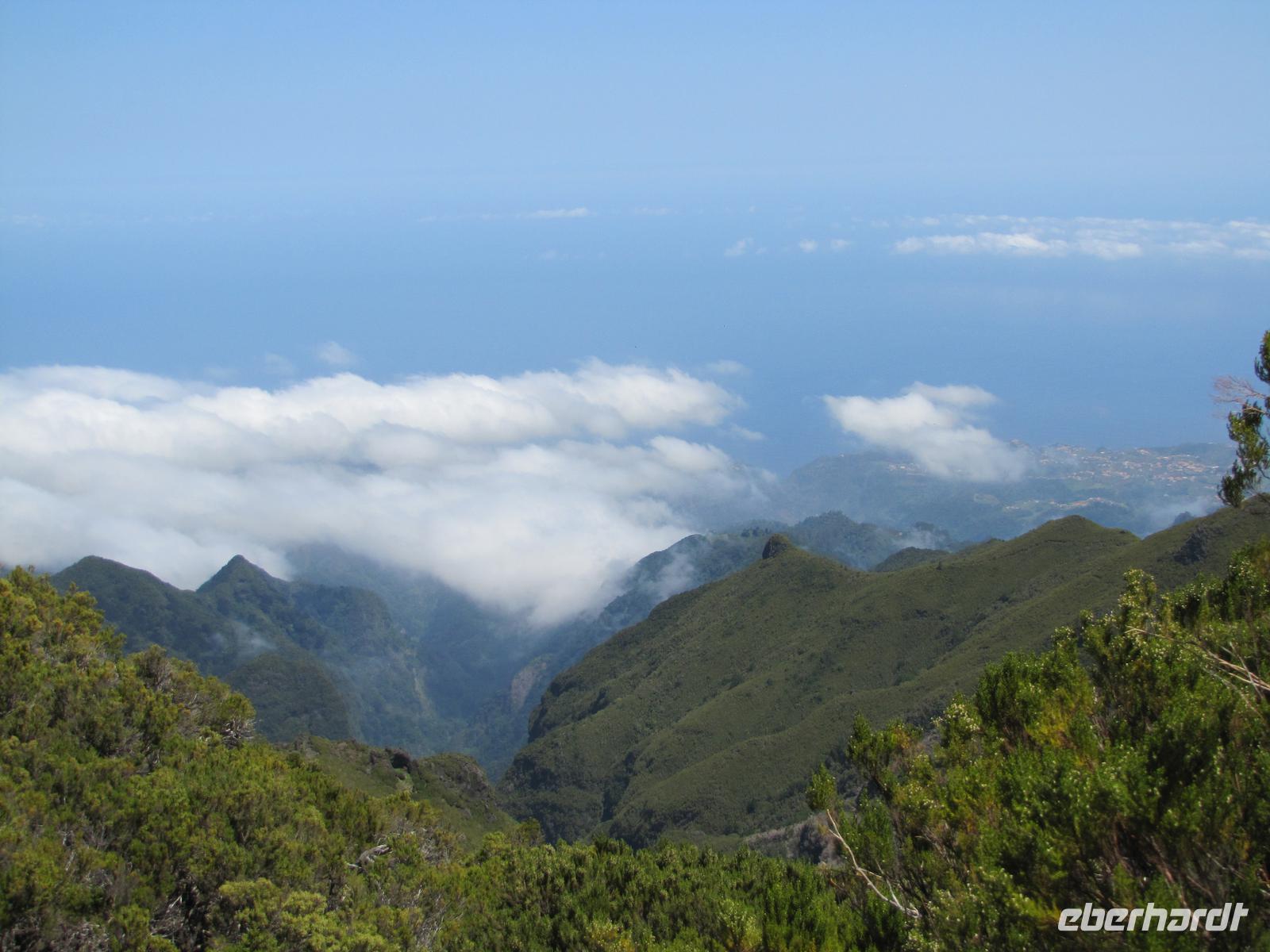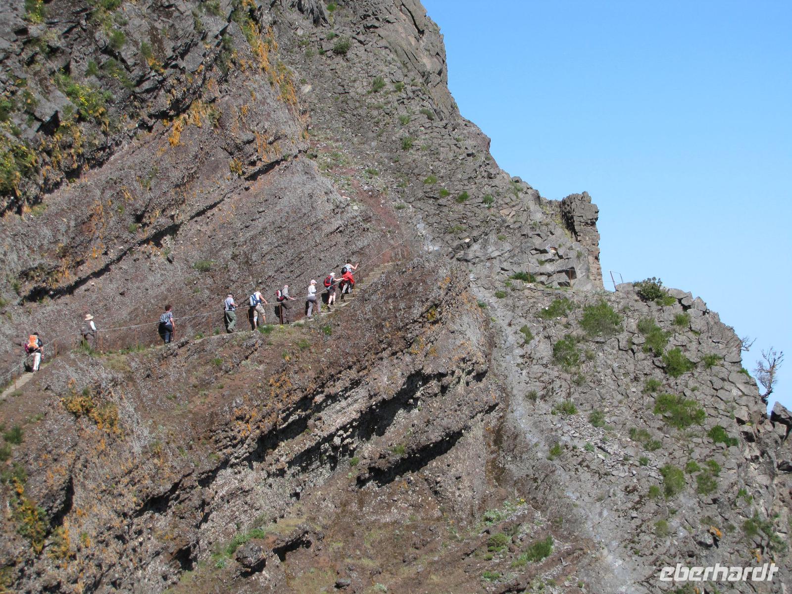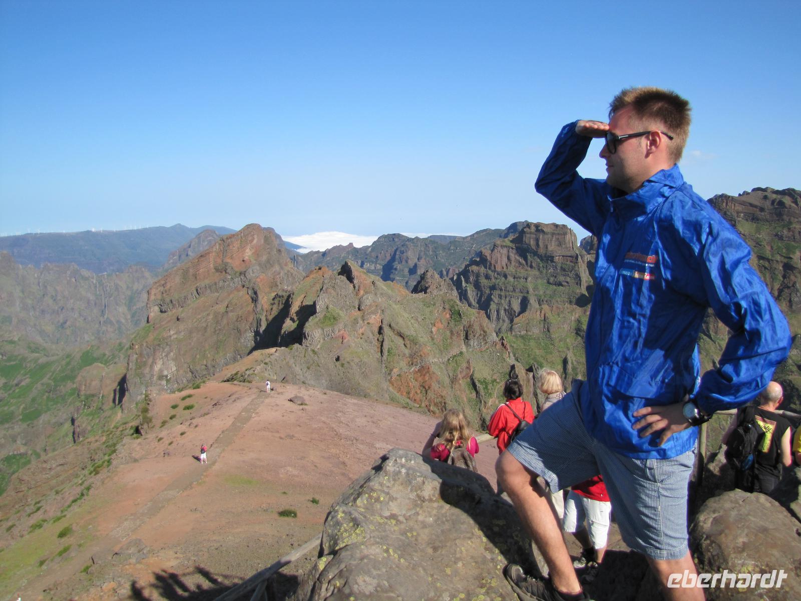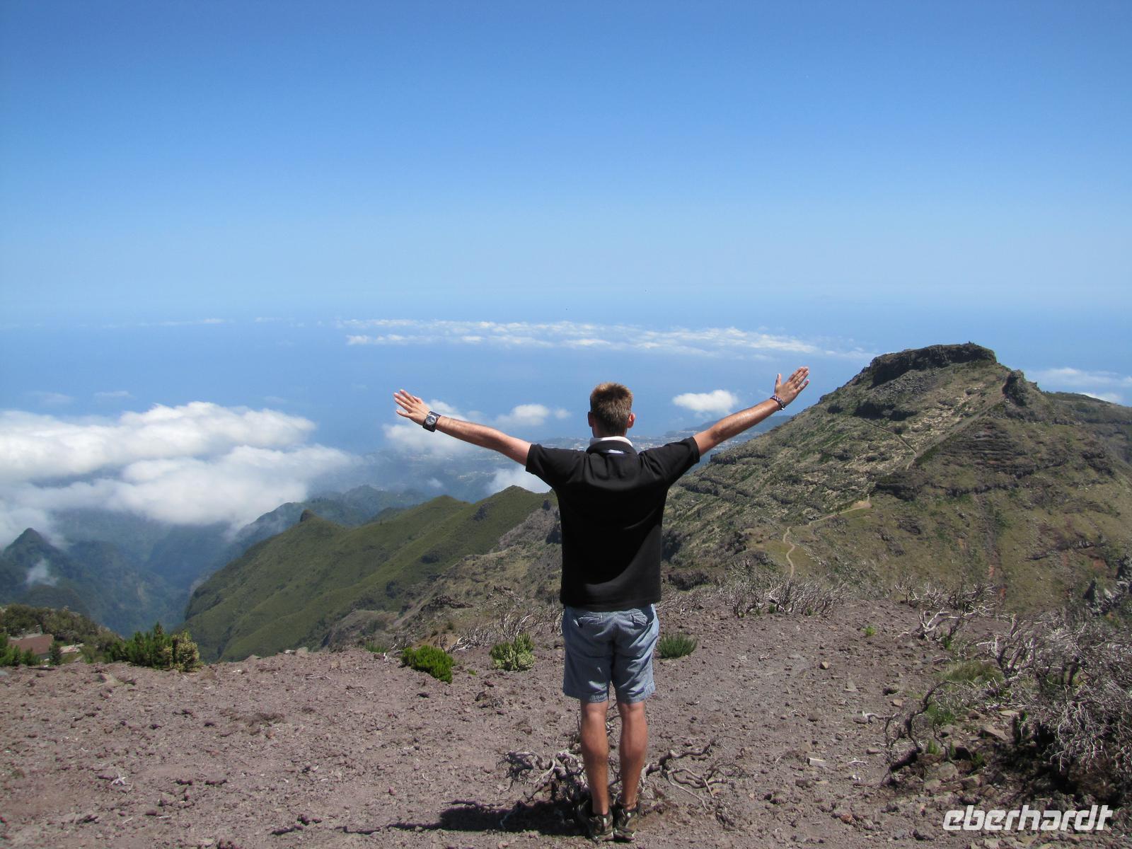 Wenn die tolle Reise einen Höhepunkt hätte, dann wäre es sicher der heutige Tag. Denn wahrhaftig erlebten wir heute den Höhepunkt der Gebirgswelt von Madeira. Schon allein der Ausgangspunkt der Wanderung begeisterte uns mit einem tollen Rundumblick über die ganze Insel. In über 1800m blickten wir über den Wolken auf unsere heutige Wanderstrecke. Die heutige Tour war die anspruchsvollste von allen, jedoch bei angenehmem Tempo kein Problem für uns. Der erste Teil ging ständig bergab, danach durchquerten wir 5 Tunnel, wofür wir unsere Taschenlampen brauchten. Kurz vor der Mittagspause auf einer Berghütte ging es noch einmal einige Meter wieder bergauf. Wir pausierten ca. 90min. denn wer wollte konnte in der Zeit ca. 20min. zum Gipfel des Pico Ruivo aufsteigen. Ganz oben in 1862m. blickten wir wieder über die imposante Bergwelt von Madeira. Nach der Pause bzw. dem Aufstieg versammelten wir uns alle wieder und wanderten noch ca. eine Stunde zum Bus. Nach dieser tollen Wanderung hatten alle gut Farbe abbekommen, da unterwegs so gut wie keine Wolken über uns waren. Auf dem Rückweg mit dem Bus hielten wir noch einmal für 30min. in Santana um die bekannten Strohhäuser zu fotografieren. Abends gingen wir wieder in ein tolles Restaurant in Canico de Baixo.