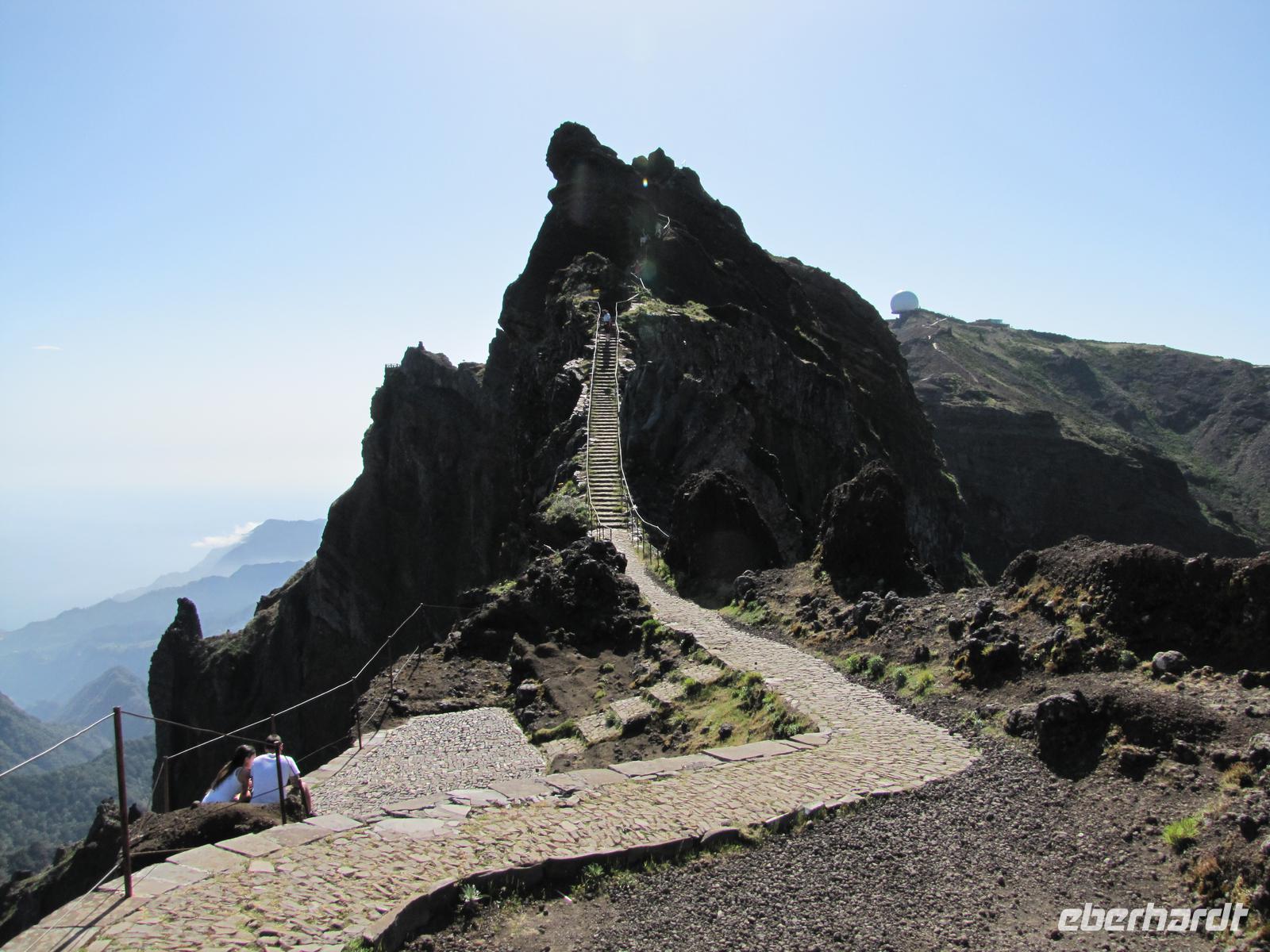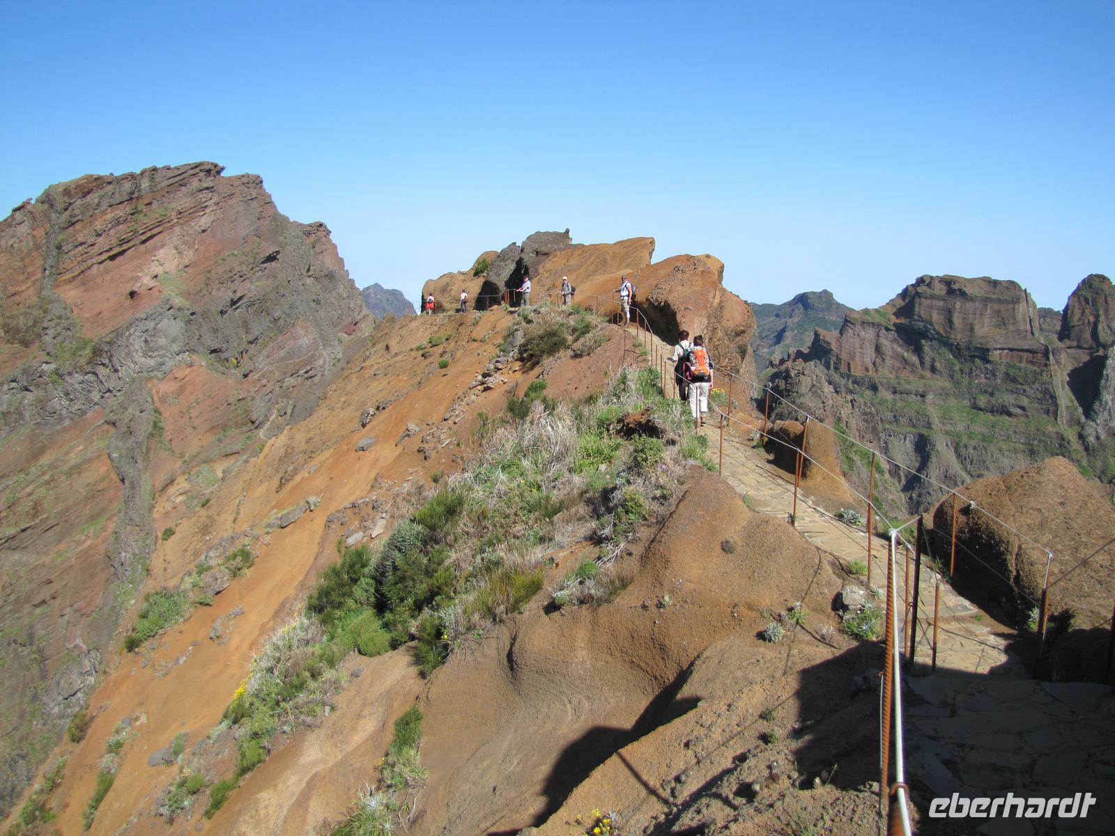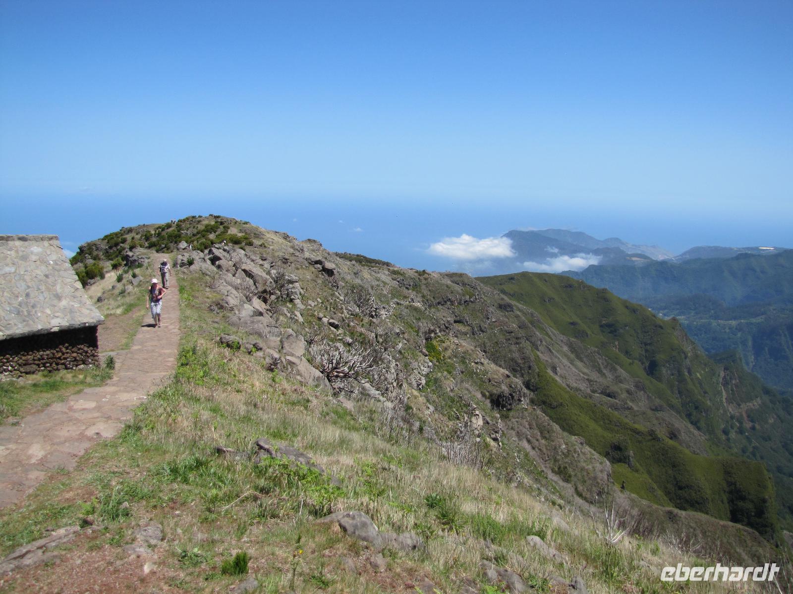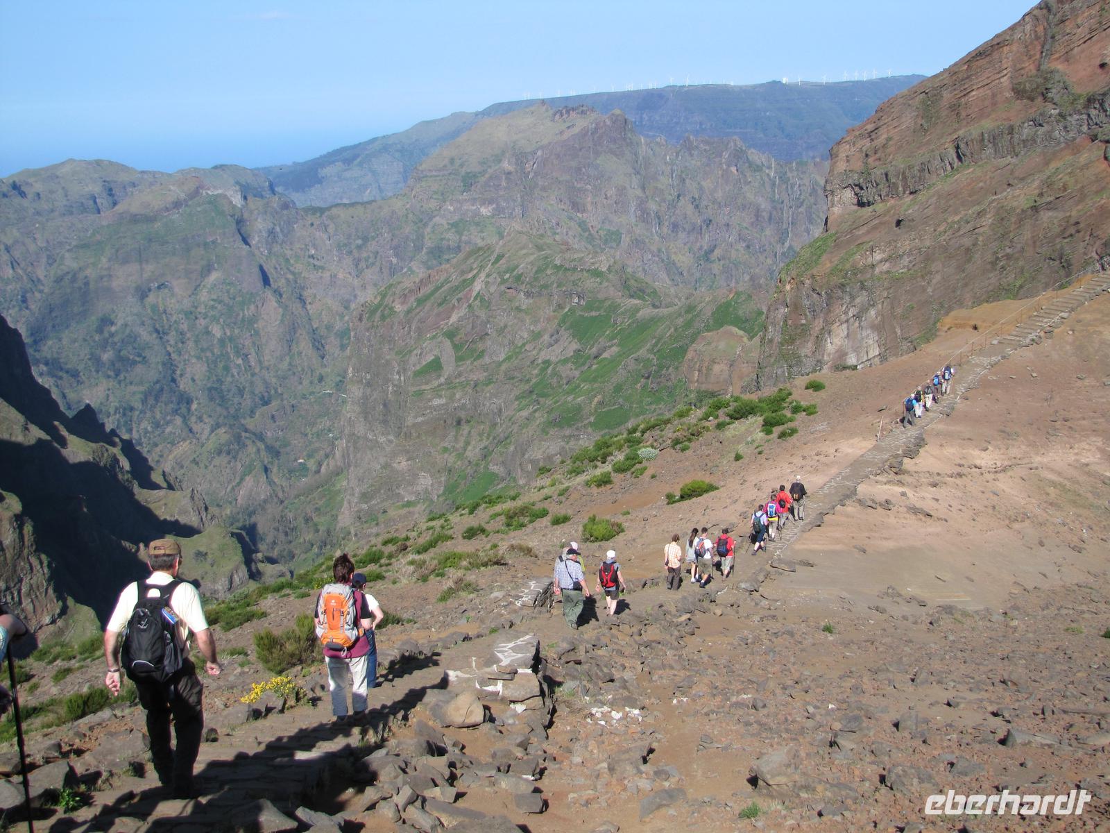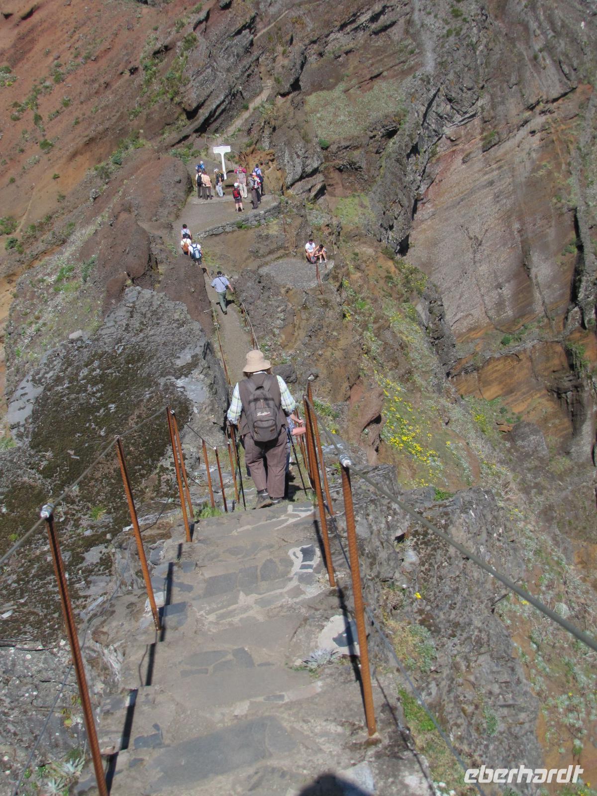 Wenn die tolle Reise einen Höhepunkt hätte, dann wäre es sicher der heutige Tag. Denn wahrhaftig erlebten wir heute den Höhepunkt der Gebirgswelt von Madeira. Schon allein der Ausgangspunkt der Wanderung begeisterte uns mit einem tollen Rundumblick über die ganze Insel. In über 1800m blickten wir über den Wolken auf unsere heutige Wanderstrecke. Die heutige Tour war die anspruchsvollste von allen, jedoch bei angenehmem Tempo kein Problem für uns. Der erste Teil ging ständig bergab, danach durchquerten wir 5 Tunnel, wofür wir unsere Taschenlampen brauchten. Kurz vor der Mittagspause auf einer Berghütte ging es noch einmal einige Meter wieder bergauf. Wir pausierten ca. 90min. denn wer wollte konnte in der Zeit ca. 20min. zum Gipfel des Pico Ruivo aufsteigen. Ganz oben in 1862m. blickten wir wieder über die imposante Bergwelt von Madeira. Nach der Pause bzw. dem Aufstieg versammelten wir uns alle wieder und wanderten noch ca. eine Stunde zum Bus. Nach dieser tollen Wanderung hatten alle gut Farbe abbekommen, da unterwegs so gut wie keine Wolken über uns waren. Auf dem Rückweg mit dem Bus hielten wir noch einmal für 30min. in Santana um die bekannten Strohhäuser zu fotografieren. Abends gingen wir wieder in ein tolles Restaurant in Canico de Baixo.