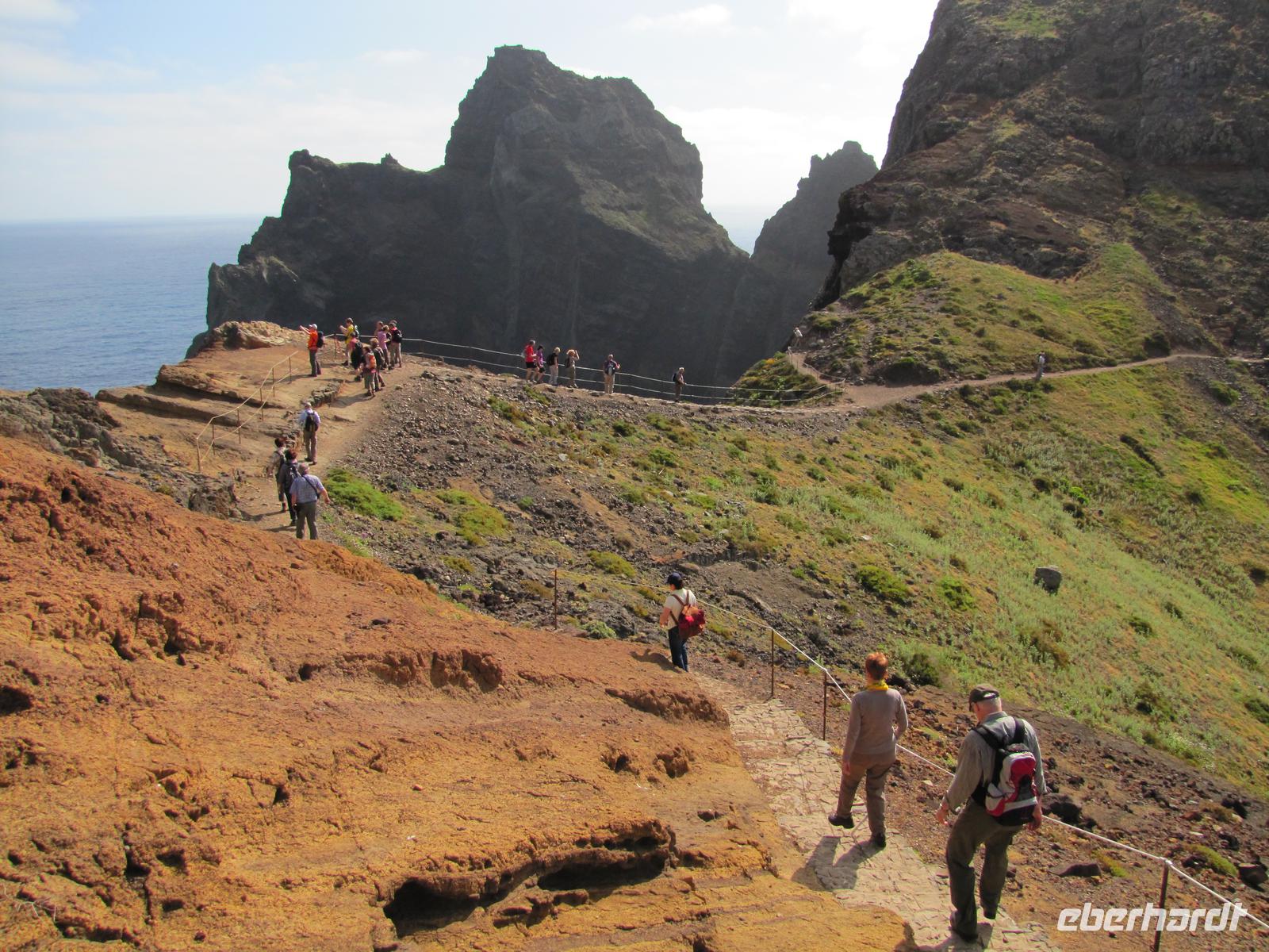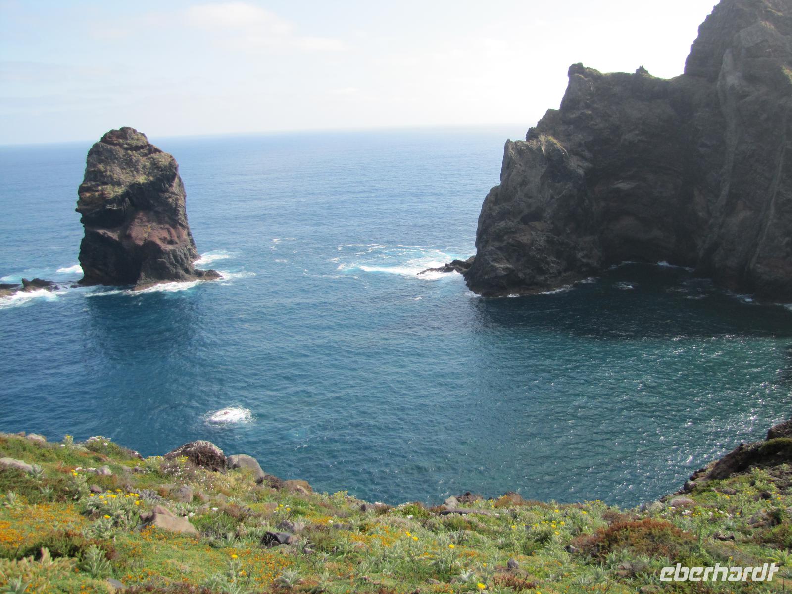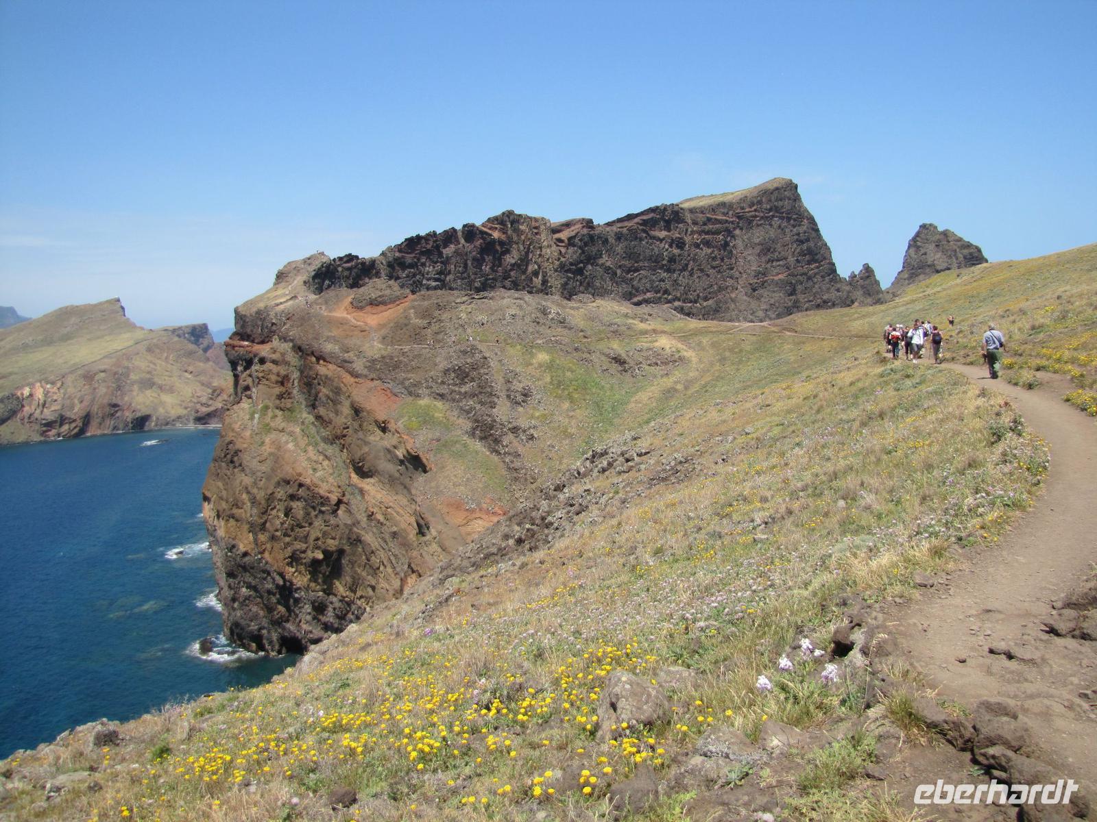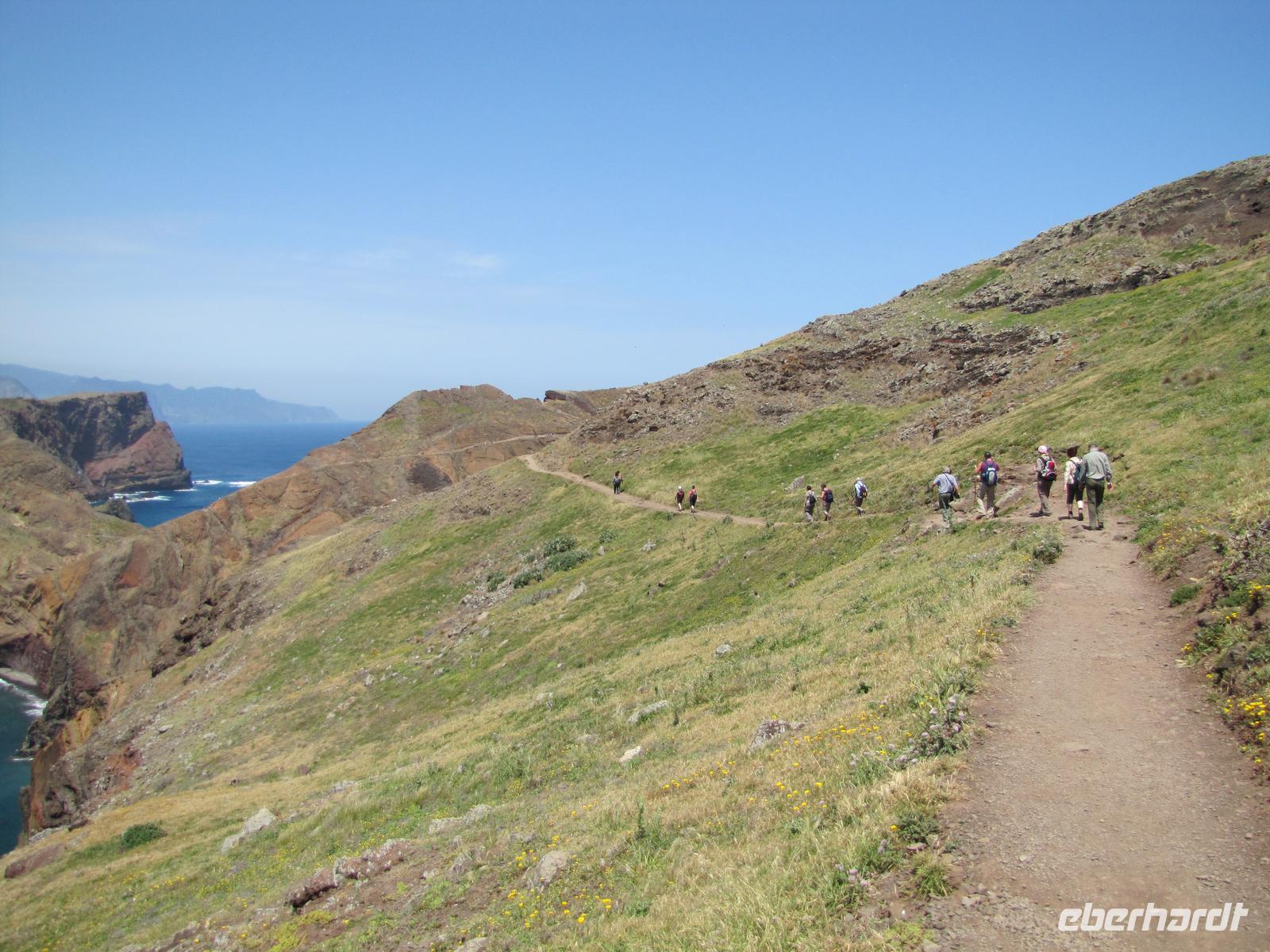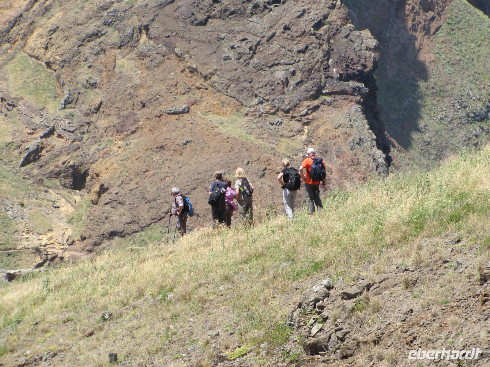 Die Ostküste von Madeira erstreckt sich mit schroffen Felsen weit ins Meer hinein. Bei herrlichem Sonnenschein starteten wir unsere Wanderung entlang der beeindruckenden Felskulisse in Richtung Ostspitze. Durch den angenehmen Küstenwind war die Sonne gut erträglich. Natürlich waren wir gut eingecremt und mit Kopfbedeckungen vor der Sonne geschützt. Wir wanderten alle hintereinander entlang der atemberaubenden Landschaft mit stetigem Blick auf den brausenden Atlantik. Kleine Fotostopps und kleine Erklärungen durch Nuno machten die Wanderung zu einer entspannten Tour. Nach ca. 2 Stunden erreichten wir eine kleine unbewohnte Hütte, nahe einer Bucht. Dort machten wir eine Stunde Mittagspause. In der Zeit konnten wir außerdem ca. 20min. zum Ostgipfel ca. 300 Meter aufsteigen. Von da aus hatte man einen traumhaften Blick auf die gesamte Süd und Ostküste. Danach ging es wieder zurück zur Ausgangsstelle der Wanderung. Der Rückweg führte etwas weiter unten entlang der Küste. Nach 2 Stunden erreichten wir wieder den Bus. Jeder von uns hatte gut Farbe abbekommen und war stets gut gelaunt nach dieser tollen Wanderung. Um den Tag abzurunden hatte ich für die Gruppe noch am späten Nachmittag eine kleine Gartentour organisiert. Wir wurden von einem Pflanzenkenner durch die Gartenanlage des Hotels geführt und erfuhren viel über die verschiedenen Kräuter und Gemüsearten. Zum Abendessen trafen wir uns wieder 19.00Uhr und es ging noch einmal in das tolle Restaurant vom Vorabend, ins Café Central, weil dies das einzige mit TV war, um das Champions League Halbfinale zwischen Dortmund und Madrid zu sehen.