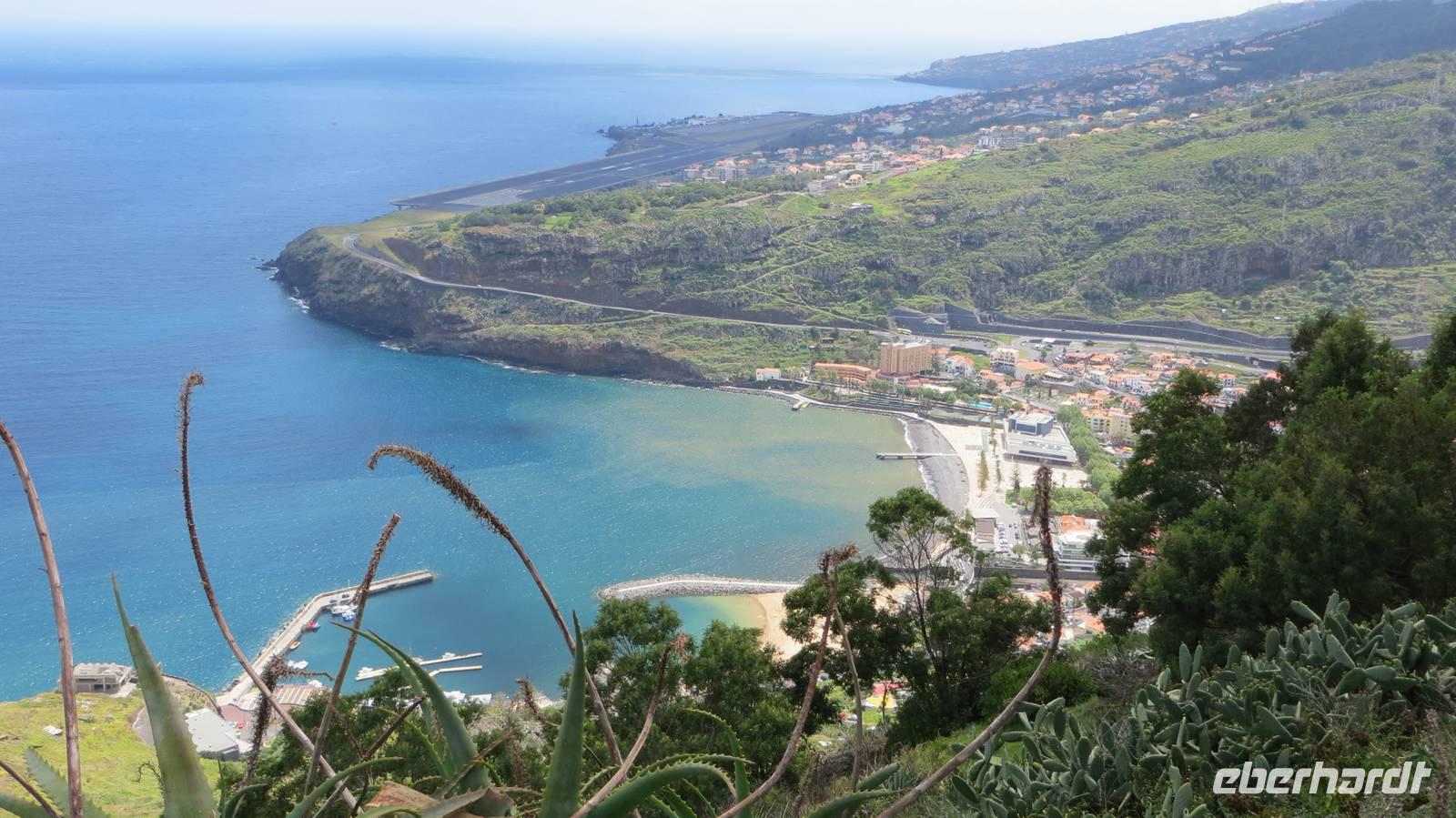Nach einer kürzeren Nachtruhe und einem reichhaltigen, leckeren Frühstück im Hotelrestaurant brechen wir gegen 09:00 Uhr mit unserem Reiseleiter Samuel zu unserer ersten Wanderung auf Madeira auf. Doch bevor wir starten können, benötigen wir Proviant für den Tag und so geht es zuerst in einen Supermarkt. Ausgestattet mit kleinen Snacks für ein Mittagspicknick und ausreichend Wasser fahren wir zum Ausgangspunkt der heutigen Wanderung. Unterwegs gibt uns Samuel wichtige Informationen zu der Insel. Am Ortsrand von Marocos angekommen starten wir schließlich mit unserer Wanderung, die uns heute entlang der Levada do Canical - einem Bewässerungskanal führt. Zwischen Gemüseterrassen und Bananenstauden laufend legen wir immer mal wieder kleine Pausen ein und Samuel erklärt uns viel über das Anbauwesen sowie über die Lavadeure, die sogenannten „Wächter" bzw. „Manager" der Levadas. Am Wegesrand finden wir neben Ziegen und Schafen, welche uns freundlich begrüßen, auch kleine Verkaufsstände, wo wir frisches Obst und Gemüse direkt vom Feld bzw. Garten probieren. Schmeckt das lecker. Nachdem wir ein Weilchen gelaufen sind, bietet sich uns ein herrlicher Blick über Machico und die offizielle Entdeckerbucht Madeiras. Nun sehen wir auch schon von Weitem eine kleine Bar, wo wir unsere heutige Mittagspause machen. Bei einem kühlen Getränk und unseren mitgebrachten Snacks ruhen wir uns ein bisschen aus. Frisch gestärkt brechen wir schließlich zum 2. Teil der Wanderung auf und erreichen gegen 15:00 Uhr unseren Bus. Fazit unser ersten Wanderung sind 3 fehlende Schuhsohlen . Zudem haben wir alle etwas Farben bekommen - der eine mehr und der andere weniger. Um noch einen schönen Ausblick über Machico und den Flughafen zu haben, fahren wir auf den Pico do Facho (Fackelberg), wo wir auf bekannte Gesichter - nämlich die Rundreisegäste treffen. Zum Abschluss unseres Ausfluges legen wir noch einen Stopp in Machico ein, wo wir an der Uferpromenade spazieren gehen, in einem Café einkehren oder die Wassertemperatur des Atlantiks mit unseren Füßen am schönen Sandstrand prüfen. Wieder in Canico im Hotel angekommen, machen wir uns etwas frisch bevor wir uns zu unserem ersten Abendessen im Restaurant „Cafe Central" treffen. Das Essen und die Stimmung sind super, so dass wir einen tollen Abend verleben.