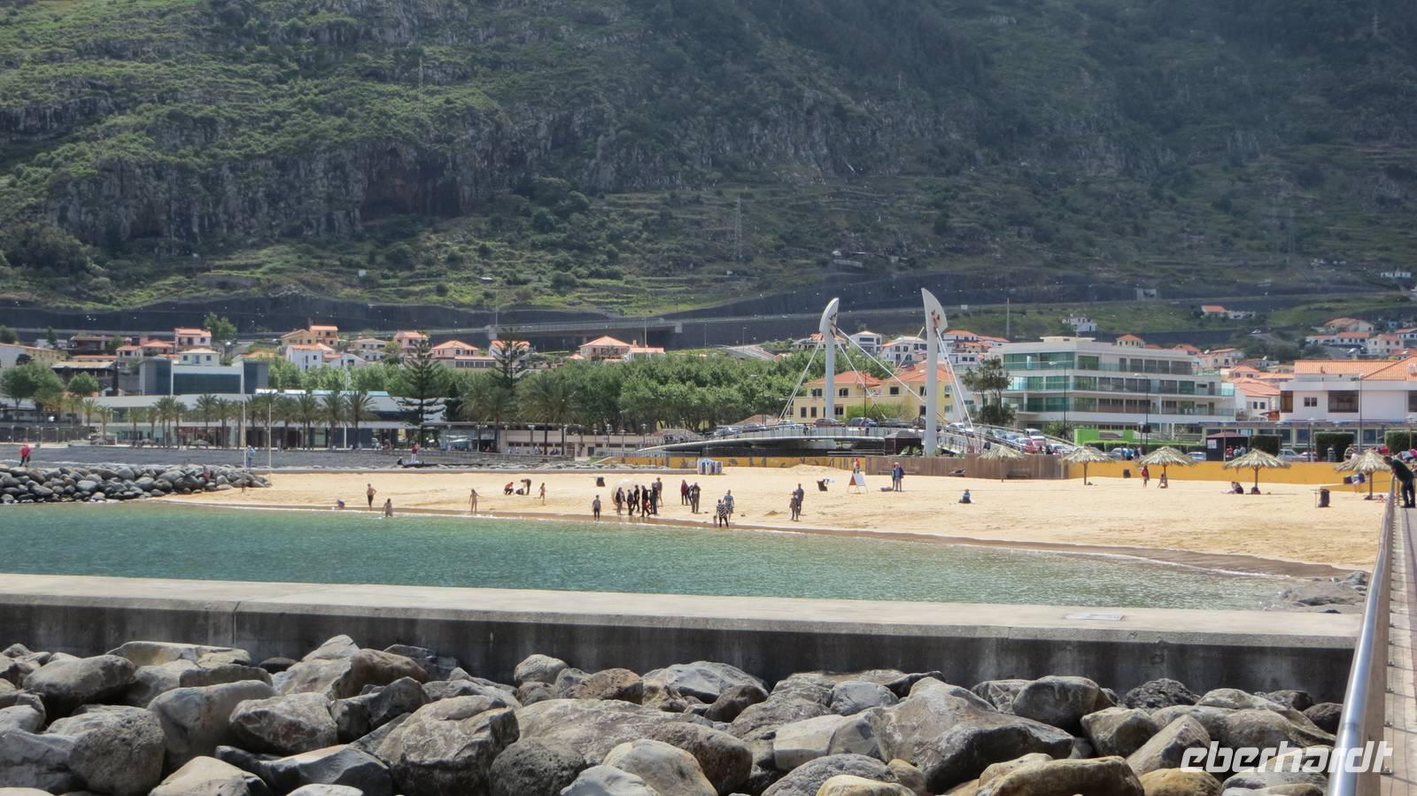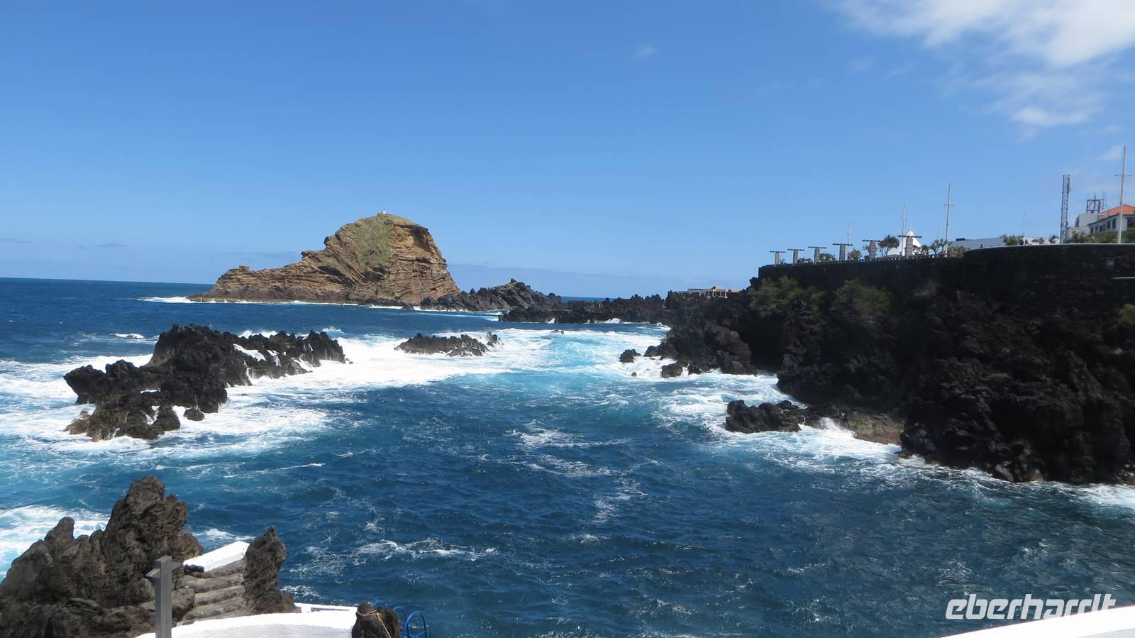 Unser letzter Tag auf der tramhaften Blumeninsel Madeira ist angebrochen. Es ist heute der 40. Jahrestag der Nelkenrevolution und somit Feiertag auf Madeira. Da auch viele Madeirenser diesen Tag für Ausflüge nutzen, starten wir zu dem heutigen Ausflug bereits schon 08:30 Uhr. Über Funchal fahren wir in das Fischerdörfchen Câmara de Lobos, wo wir unseren ersten Stopp einlegen und den Hafen mit den bunten Holzbooten auf dem dunklen Sand anschauen. Auf manchen Booten kann man sogar Streifen vom Katzenhai, welcher zum Trocknen aufgehängt ist, sehen. Weiter führt uns die Fahrt zum Cabo Girao, der mit 580 Metern höchsten Steilklippe Europas. Auf einer Glasplatte können wir hier ohne Gefahr einen Blick in die Tiefe wagen - wirklich ein atemberaubender Anblick. Auf einer Straße oberhalb der Autobahn fahrend erreichen wir schließlich den Ort Ribeira Brava. Auch heute werden wir wieder von der Sonne verwöhnt, sodass wir während einem Spaziergang an der Uferpromenade oder durch die Gassen der Stadt eine tolle Zeit verbringen. Nun verlassen wir die Südküste und fahren über den Encumeada Pass auf die Nordseite der Insel. Doch bevor wir dort ankommen, legen wir noch einen Stopp an einer Bar ein. Hier wird die wohl beste Poncha der Insel serviert. Ich gebe eine Runde aus und wir schauen dem Barmann bei der Zubereitung des Getränkes zu. Wir stoßen auf die gemeinsame schöne Zeit an und lassen uns die leckere Poncha schmecken. Anschließend fahren wir weiter nach Sao Vincente. Unterwegs verteilt Samuel köstliche Zuckerrohrsirupkekse - ist das ein langes Wort . Bei einem kurzen Spaziergang durch den Ortskern besuchen wir auch die kleine Kirche im Ort und führen unsere Fahrt dann nach Porto Moniz fort. Hier verbringt jeder die Mittagspause nach seinen eigenen Vorstellungen und einige Gäste nutzen die Zeit um in einem der Naturschwimmbäder eine Abkühlung im Atlantik zu nehmen. Nun ist es auch schon wieder Zeit Abschied von der Nordseite der Insel zu nehmen. Bei einem letzten Fotostopp oberhalb von Porto Moniz genießen wir einen letzten Ausblick über den Ort und fahren wieder zurück auf die Südseite der Insel. Damit es im Bus nicht langweilig wird, erzählen wir uns gegenseitig Witze und singen Lieder . Den letzten Stopp des heutigen Tages machen wir in Ponto do Sol, wo wir uns bei Samuel und auch Diogo für die tolle Zeit auf Madeira bedanken. Wieder im Bus stellen wir schließlich fest, dass nach langem Warten der Osterhase uns dann doch noch auf Madeira gefunden und eine kleine Überraschung für jeden im Bus verloren hat . Bevor wir wieder zurück zum Hotel fahren können, muss noch der Bus für die neuen Gäste gereinigt werden und so fahren wir noch schnell mal in einer der „natürlichen" Autowaschanlagen Madeiras . Am Abend trifft sich ein Großteil der Gruppe zu einem Abschiedsessen im Restaurant „La Reira". Danach heißt es schnell schlafen, da wir nur eine sehr kurze Nacht vor uns haben.