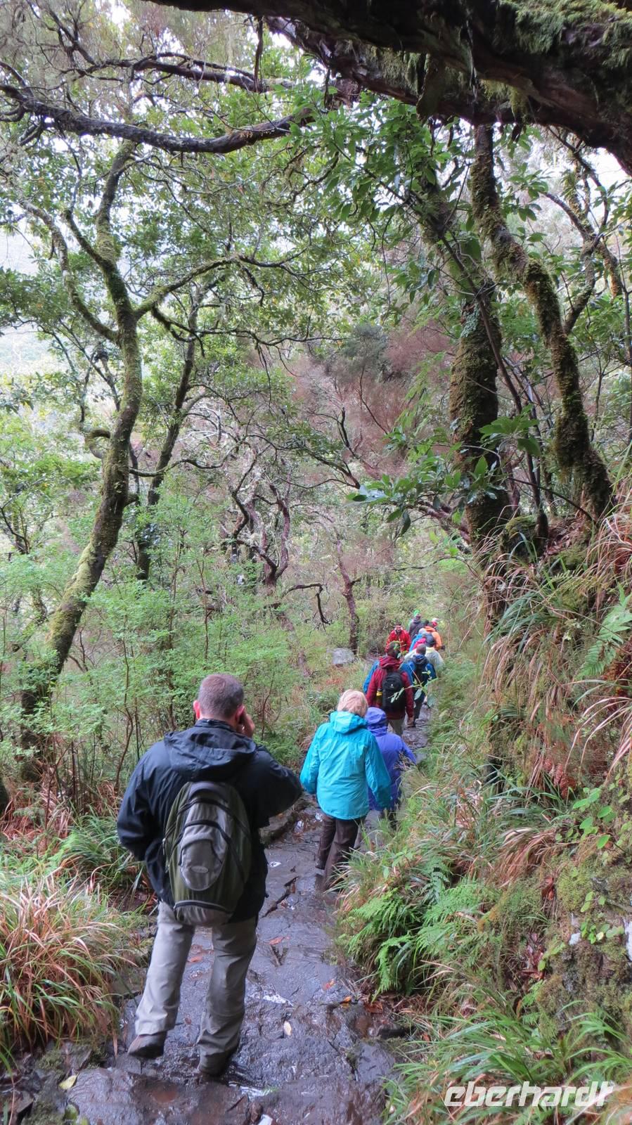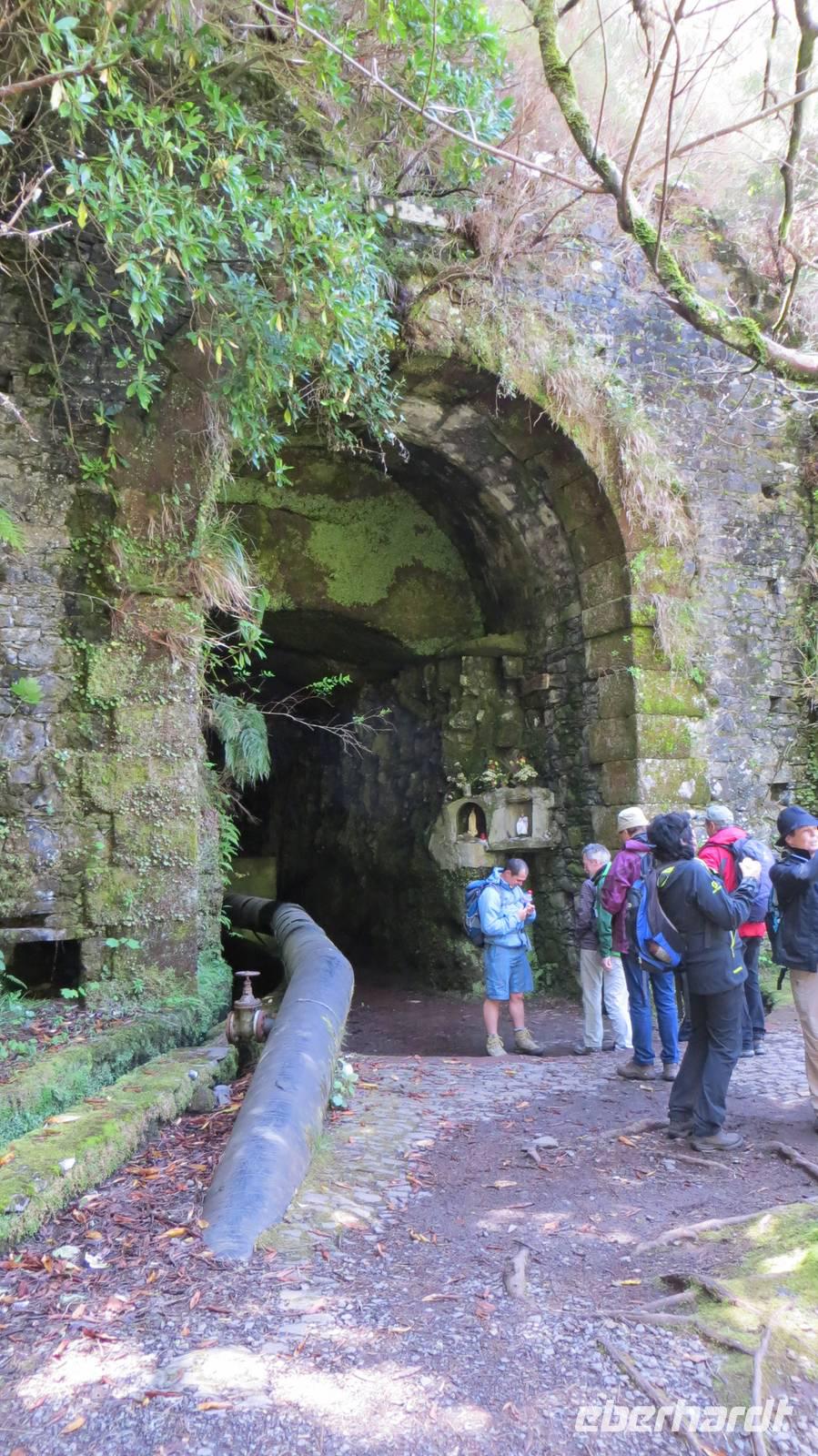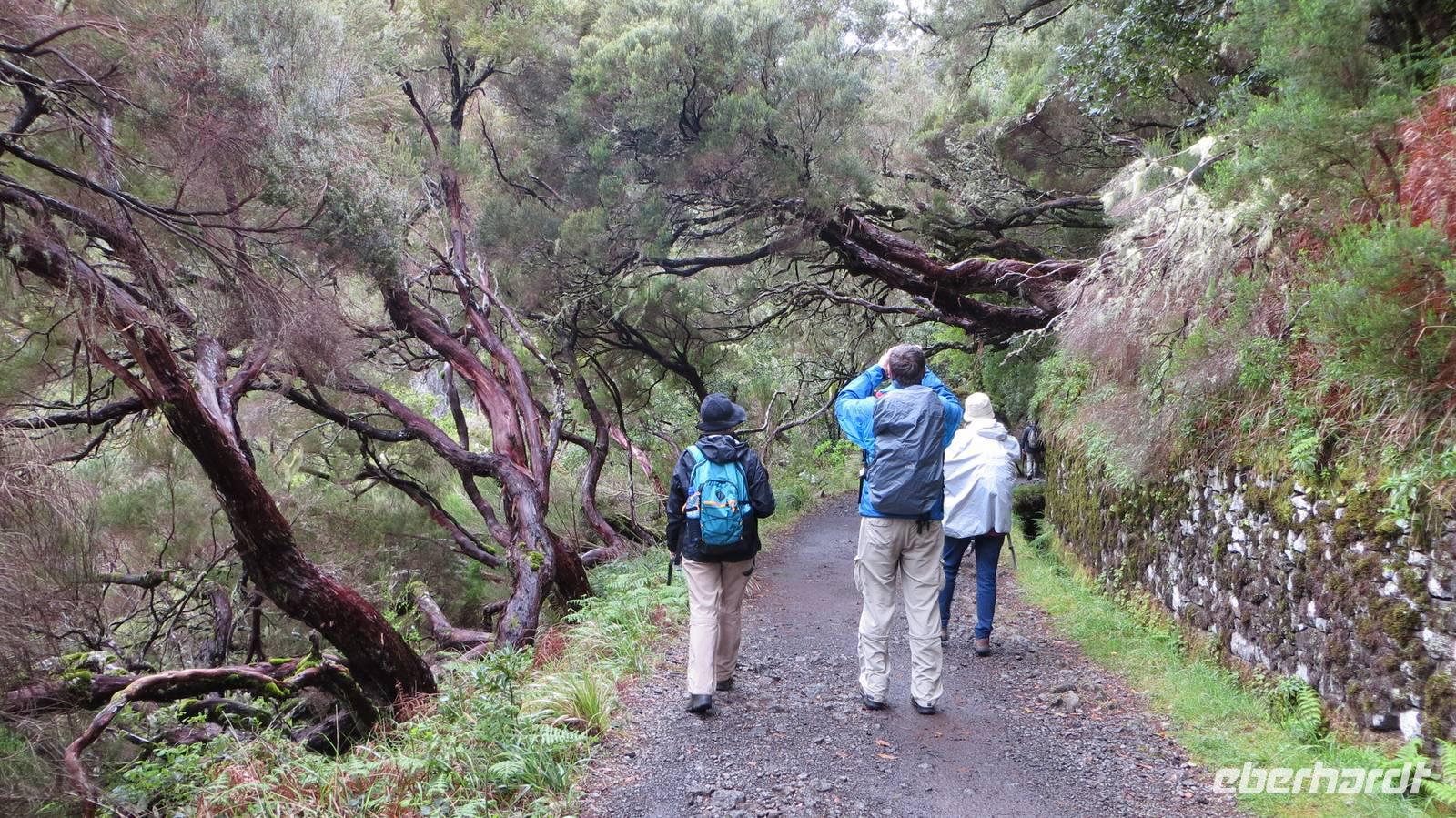 Tag zwei auf Madeira ist angebrochen und so werden wir pünktlich um 09:00 Uhr bei strahlendem Sonnenschein von Samuel und unserem Busfahrer Diogo abgeholt. Nachdem wir gestern im Osten der Insel unterwegs waren, fahren wir heute in den westlichen Teil Madeiras. Damit wir wieder für den Tag mit ausreichend Marschverpflegung ausgerüstet sind, besuchen wir einen Supermarkt in Ribeira Brava. Nach kurzer Fahrt verlassen wir schließlich die Küste in Richtung Landesinnere. Durch einen Eukalyptuswald, der 2010 bei dem schweren Brand auf Madeira auch stark betroffen war, fahren wir auf 1350 m Höhe bis zur Hochebene Paul da Serra. Je höher wir fahren desto schlechter wird leider auch das Wetter und so müssen wir unsere heutige Wanderung bei Regen starten. Aber das ist für uns kein Problem, da wir alle mit Regenkleidung ausgestattet sind. Schließlich müssen wir gar nicht weit laufen, bis sich die Wolken etwas aufziehen und es nicht mehr regnet. Und so erreichen wir auch schon unser erstes Highlight - den Riscowasserfall. Von einer Aussichtsplattform genießen wir den Blick auf die 100 m hohe Basaltfelswand. Von hier müssen wir nun erst einmal ein Stück zurücklaufen und dann einige Treppen bergab überwinden. Unten angekommen wandern wir entlang einer Levada zu den 25 Quellen. Der Weg wir immer enger und schließlich laufen wir nur noch auf einer schmalen Mauer. Aber mit Trittsicherheit und Aufmerksamkeit meistern alle bravourös den Weg. Bei den 25 Quellen legen wir unsere heutige Mittagspause ein und zur Stärkung verteile ich an alle ein kleines Blätterteigtörtchen mit Pudding, das hier auf Madeira als Pastel Nata bezeichnet wird. Mit vielen schönen Fotos im „Kasten" treten wir unsere weitere Wanderung an. Diese führt uns schließlich durch einen 800 m langen Tunnel, welchen wir mithilfe hilfreicher Erläuterungen von Samuel und unseren Taschenlampen „überwinden". Am Ende des Tunnels wartet schließlich ein toller Ausblick auf den Atlantik sowie strahlender Sonnenschein auf uns. Wir ziehen unsere Regenbegleitung nun endgültig aus und genießen die Aussicht. Wieder am Bus angekommen, fahren wir nach Funchal, wo wir Esmeralda in ihrem kleinen aber feinen Kräutergarten besuchen. Bei Zitronengras-Ingwer-Tee und selbstgebackenen Nusskuchen sowie Brot mit leckerer Apfel-Chili-Marmelade legen wir erst einmal eine „Teestunde" ein. Anschließend werden wir von Esmeralda durch den Garten geführt. Sie erklärt uns, welche Kräuter in ihrem Garten wachsen und für was diese gut sind. Auch dürfen wir das ein oder andere Pflänzchen mal probieren. Und so „verarzten" wir unseren Sonnenbrand am Ende unserer Führung mit Aloe Vera . Am Abend fahren wir nach einer kurzen Auszeit im Hotel nochmals in die Hauptstadt, um unser Abendessen über den Dächern von Funchal im Restaurant „Vasco da Gama" einzunehmen.