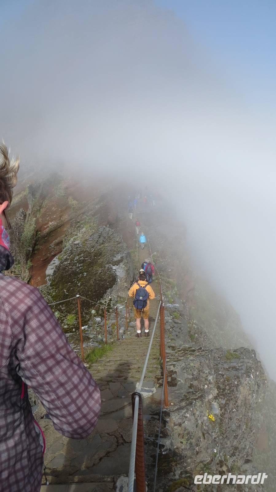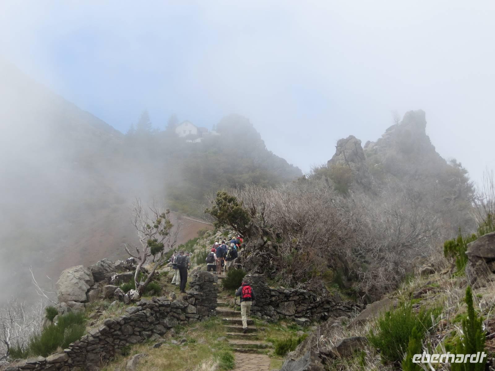Auf 1818 Meter Höhe auf dem Pico do Arieiro, dem dritthöchsten Gipfel Madeiras, angekommen, werden wir von der strahlenden Sonne begrüßt. Wir sind nun über den Wolken und haben trotzdem einen tollen Ausblick auf die Gipfel. Voller Elan und Freude über das tolle Wetter starten wir unsere Wanderung zum Pico do Cidrao, dem vierthöchsten Berg Madeiras. Unterwegs legen wir einen kleinen Stopp auf einer Aussichtsplattform ein, wo wir eine tolle Aussicht auf den zweithöchsten Gipfel, den Pico das Torres, sowie über Ponta de Sao Lourenco haben. Am Pico do Cidrao angekommen, machen wir nochmals eine kurze Pause. Das Wetter schlägt etwas um und die umliegenden Gipfel verschwinden im Nebel. Nun war endlich mein großer Augenblick gekommen, da ich die Gruppe zurück zum Ausgangspunkt führen durfte . Mit dem Bus fahren wir anschließend zu dem zweiten Ausgangspunkt der Wanderung - nach Achada do Teixeira. Es ist immer noch sehr neblig, so dass wir auch von hier leider keine wirkliche Aussicht mehr genießen können. Aber davon lassen wir uns nicht die Laune vermiesen und genießen Teil zwei des heutigen Tages - unseren Aufstieg zu dem höchsten Gipfel der Insel, dem Pico Ruivo. Doch bevor wir diesen erreichen, kommen wir erst zu einem kleinen Forsthaus, wo sich einige Gäste ein kühles Bier gönnen. Die anderen Gäste stellen sich den letzten Metern bis wir schließlich den Gipfel erreichen. Mit Beweisfotos steigen wir wieder zum Forsthaus und dann weiter zum Parkplatz in Achada do Teixeira ab. Glücklich über die Eindrücke des heutigen Tages fahren wir in die Stadt Santana, welche berühmt für ihre strohbedeckten Dreiecksholzhäuser ist. Hier haben wir etwas Zeit um uns diese markanten Häuser anzuschauen und Kaffee und Kuchen in einem Café zu genießen.