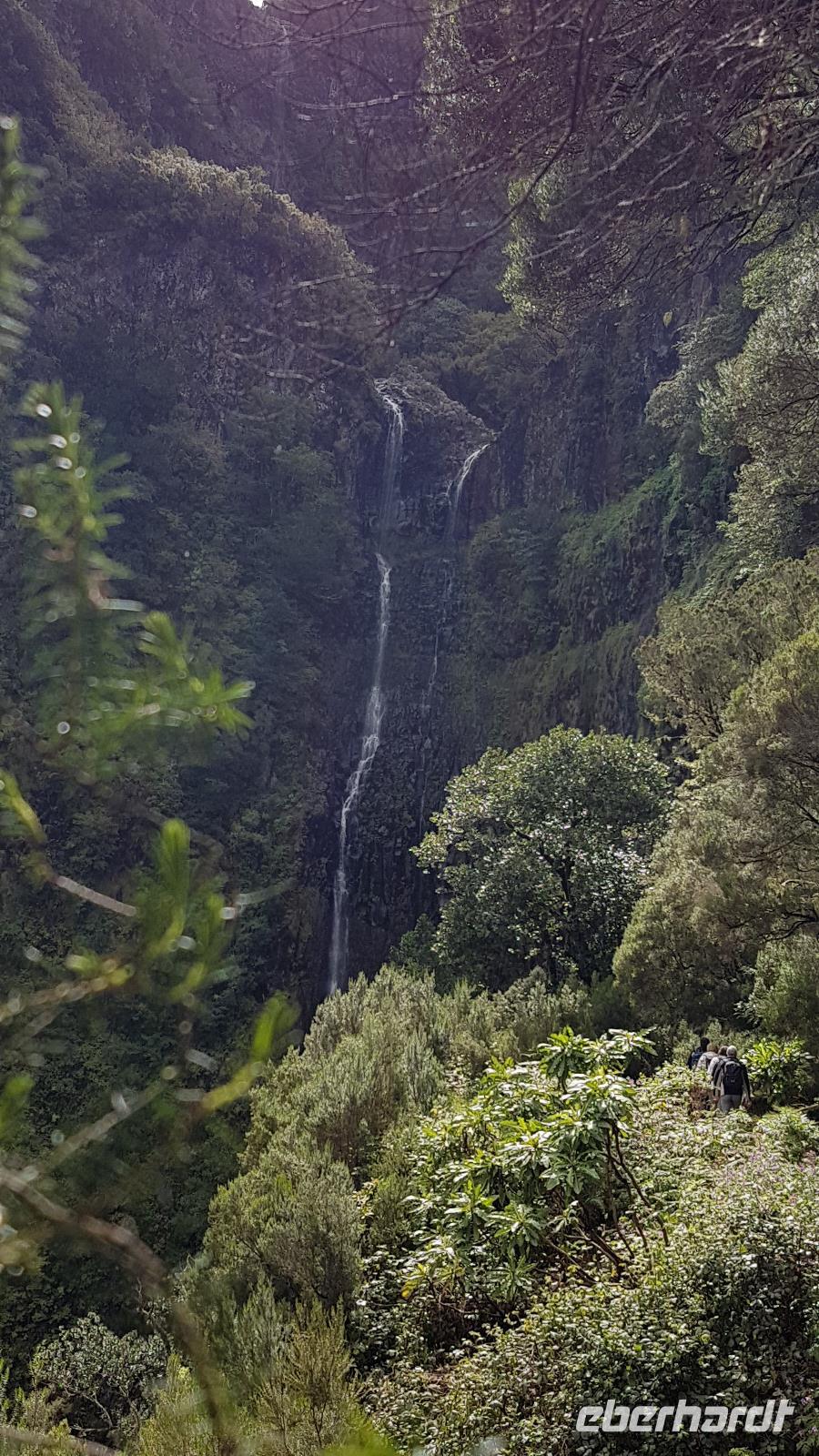 Erwartungsfroh starten wir heute in den Tag uns Santos bringt uns auf die Hochebene, wo unsere Wanderung zu den 25 Quellen beginnt. Zuerst spazieren wir bei bestem Sonnenschein ins Tal hinabzur Levada. Dort geht es erst zu einem beeindruckendem Wasserfall. Der herrlich grüne Wald und der Blick ins Tal von Rabacal lassen uns immer wieder verweilen. Über viele Stufen geht es zur nächsten Leada. Hier führt uns der schmale Weg, mit einem Seil zum Berghang gesichert, zu den 25 Quellen, wo wir unseren Picjnickstopp einlegen. auch viele andere Wanderer haben den Weg hierher gefunden. Als wir diese Levada zurück gehen, müssen wir immer wieder andere Gruppen vorbei lassen.