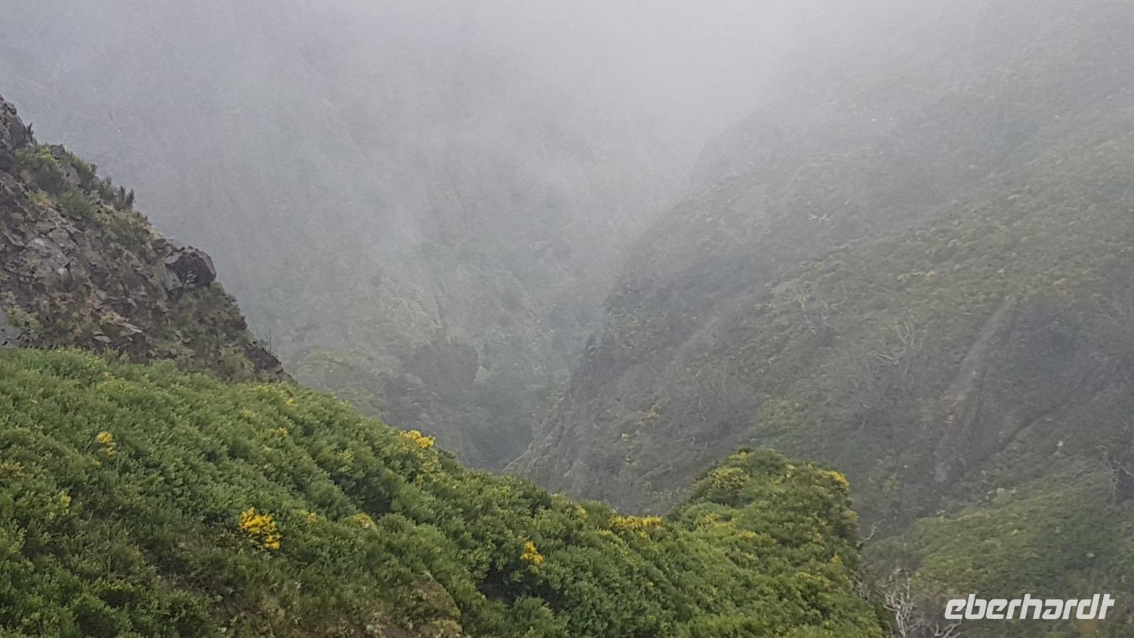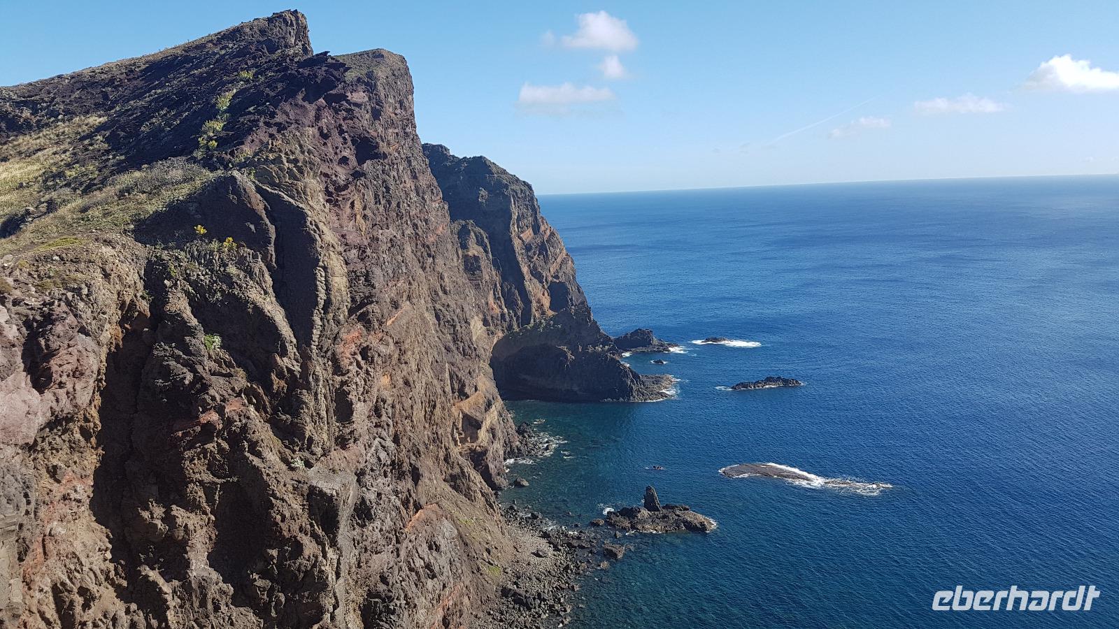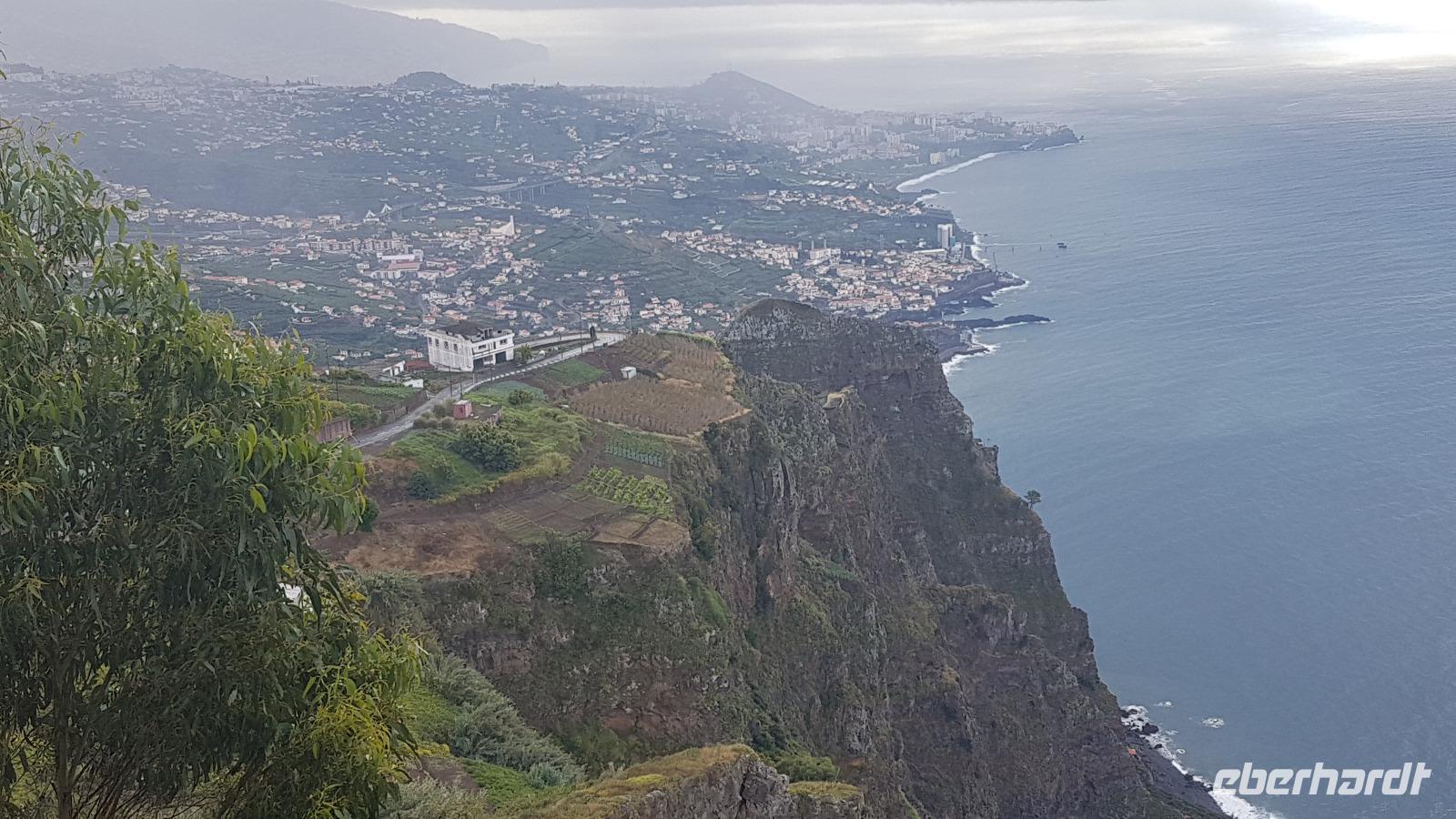 Nur 4 km weiter ist der Aussichtspunkt Cabo Cirao. Hier stehen wir über dem Abgrund auf der mit 580 m höchsten senkrecht zur Felswand abstürzenden Steilküste, der höchsten Steilküste Europas. Es biete sich uns ein grandioser Blick über Funchal und den Alantik.