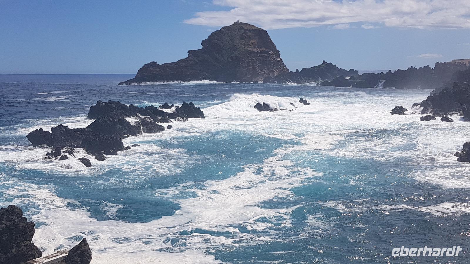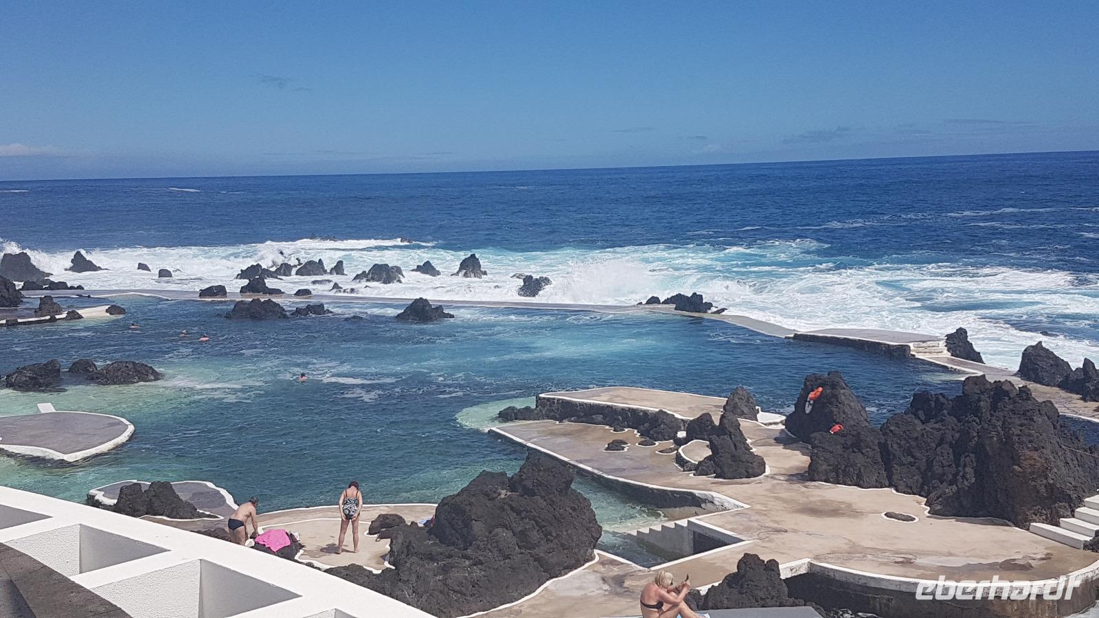 Die Fahrt führt uns an den am Meer gelegenen Ort "Ribeira Brava"(Wilder Bach). Hier legen wir einen Stop ein und besichtigen die dortige Kirche. Weiter geht es die steilen Straßen hinauf über den "Encumeada-Pass" zur Hochebene "Paul da Sarra". Die Hochebene, zeigt sich uns heute im Nebel. Im äußersten Nordwesten erreichen wir dann die Stadt "Porto Moniz" mit ihren Meeresschwimmbecken. Nach dem Mittagessen staunen wir über die Wellen und die Brandung. Ein mutiger Gast nimmt ein Bad.