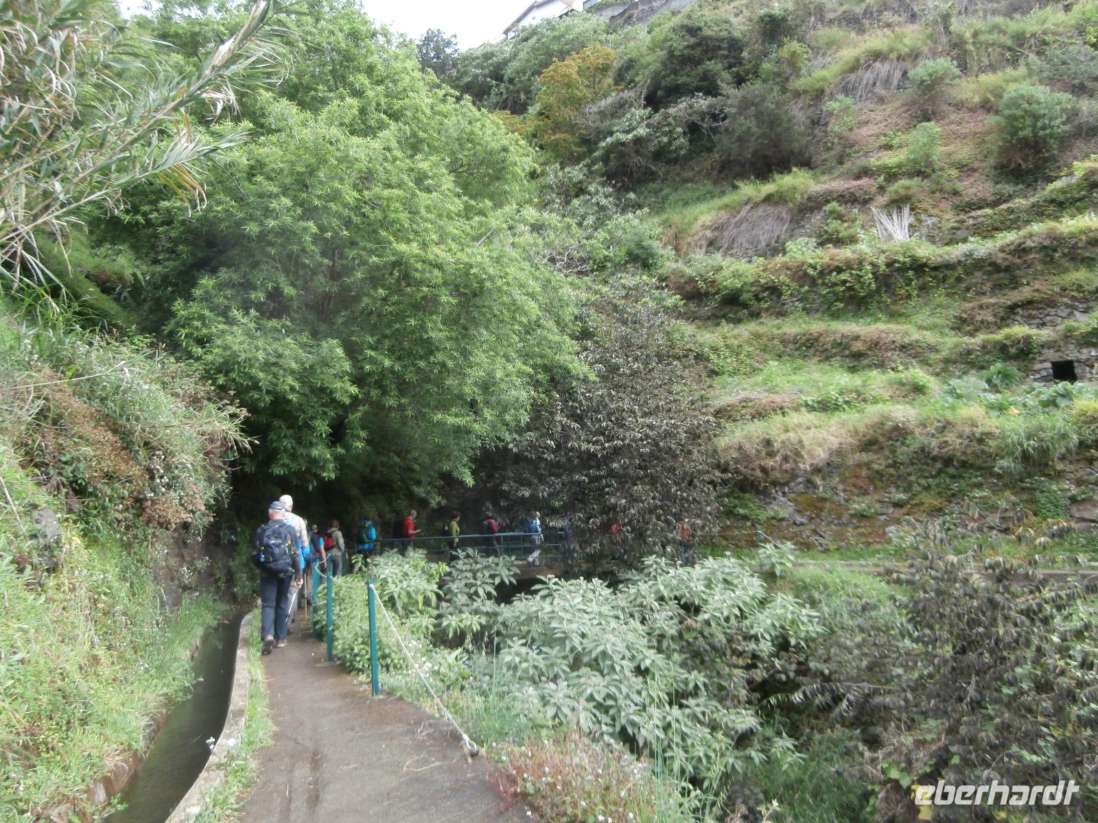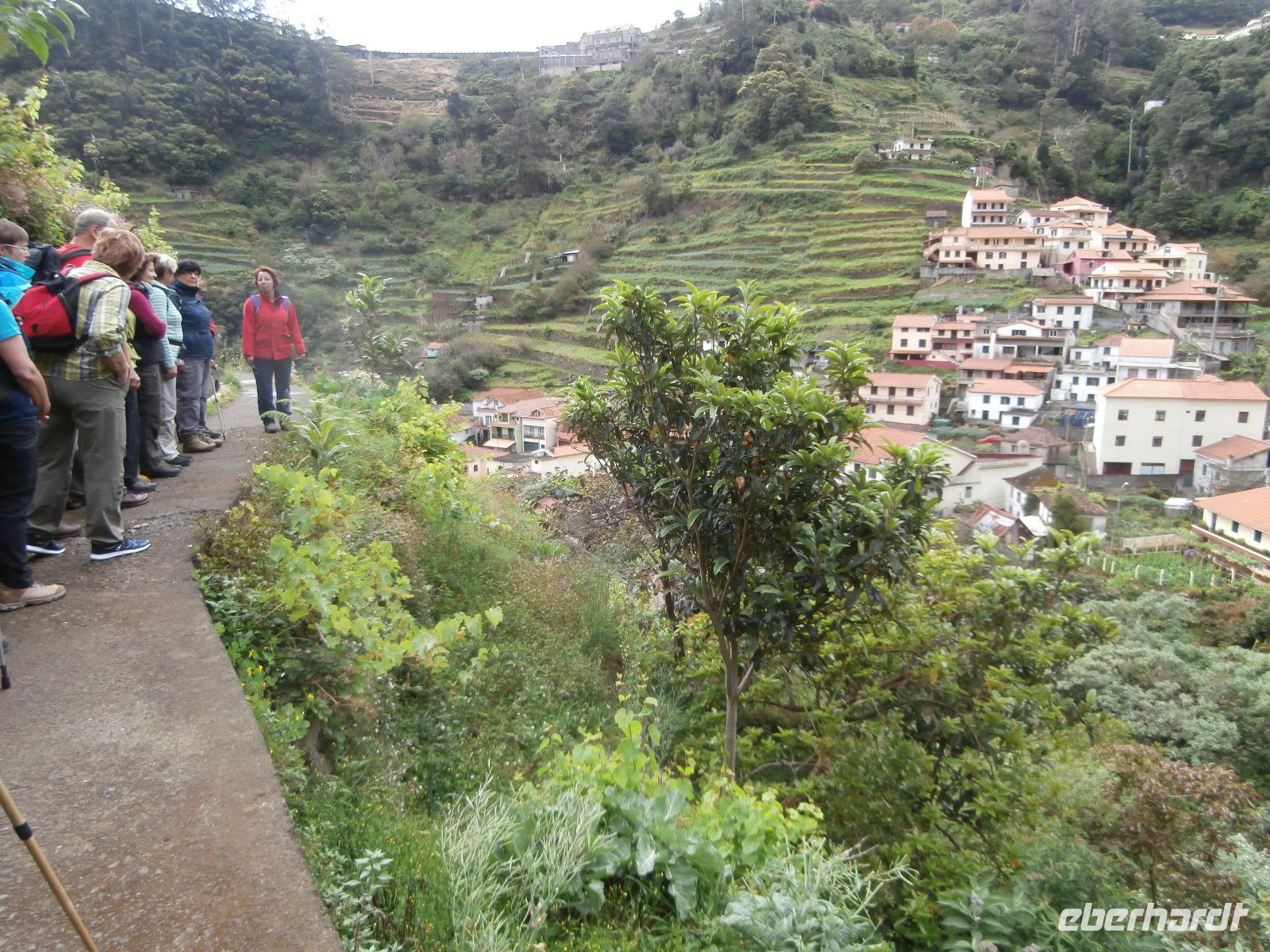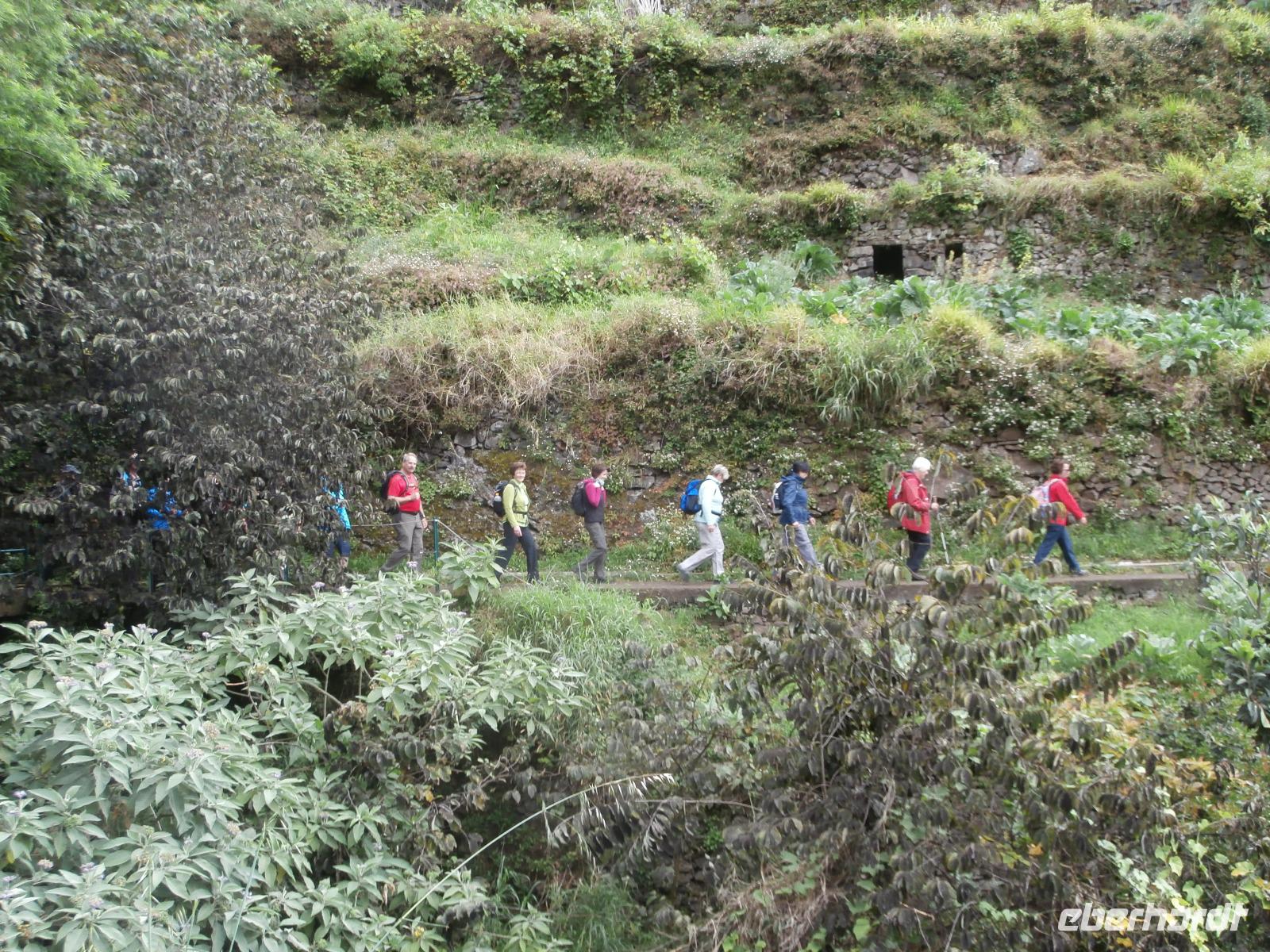 Wir treffen uns 9 Uhr mit Fatima zur Abfahrt, sie wird nun in den nächsten Tagen unsere Wanderreiseleiterin auf Madeira sein. Nelson nimmt uns in seinem fast neuen Bus auf, erst 8000km ist er unterwegs, wir sind begeistert vom Gefährt. Wir sind alle gespannt auf unseren ersten Wandertag, der uns an den künstlichen Wasserkanälen, den Levadas, entlang führt. In Marocos verlassen wir den Bus und hier startet unsere Wanderung bei kühlem aber noch trockenem Wetter. Wir genießen die fantastische Natur, viele Blumen und Pflanzen, die wir sehen, kommen uns bekannt vor. Fatima beschreibt uns immer wieder die vielen Pflanzen, Blumen und Früchte, die wir unterwegs sehen. Regenschauer begleiten unsere Wanderung, aber der Blick zu den Terrassen und Häusern bis hin zum Atlantik entschädigt, schnell ist es wieder warm und trocken. In einer kleinen Bar ist Halbzeit Pause mit WC und Getränkestopp.