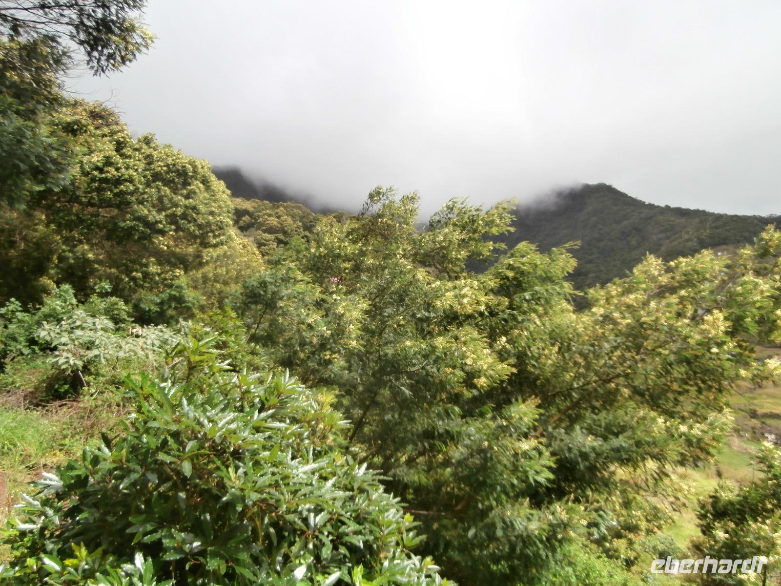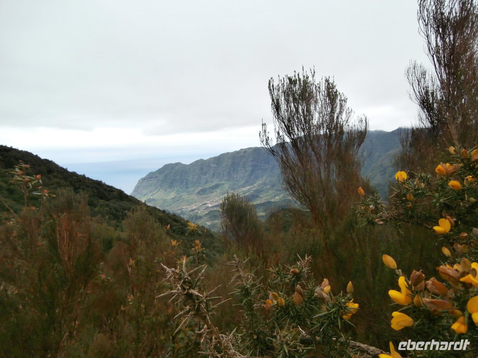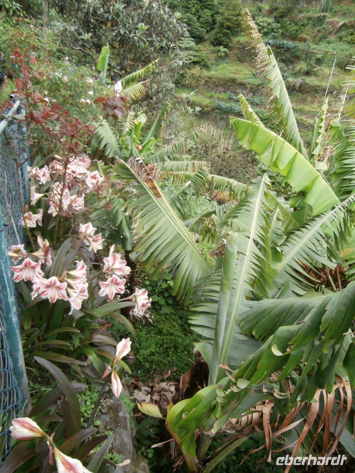 Wir treffen uns 9 Uhr mit Fatima zur Abfahrt, sie wird nun in den nächsten Tagen unsere Wanderreiseleiterin auf Madeira sein. Nelson nimmt uns in seinem fast neuen Bus auf, erst 8000km ist er unterwegs, wir sind begeistert vom Gefährt. Wir sind alle gespannt auf unseren ersten Wandertag, der uns an den künstlichen Wasserkanälen, den Levadas, entlang führt. In Marocos verlassen wir den Bus und hier startet unsere Wanderung bei kühlem aber noch trockenem Wetter. Wir genießen die fantastische Natur, viele Blumen und Pflanzen, die wir sehen, kommen uns bekannt vor. Fatima beschreibt uns immer wieder die vielen Pflanzen, Blumen und Früchte, die wir unterwegs sehen. Regenschauer begleiten unsere Wanderung, aber der Blick zu den Terrassen und Häusern bis hin zum Atlantik entschädigt, schnell ist es wieder warm und trocken. In einer kleinen Bar ist Halbzeit Pause mit WC und Getränkestopp.