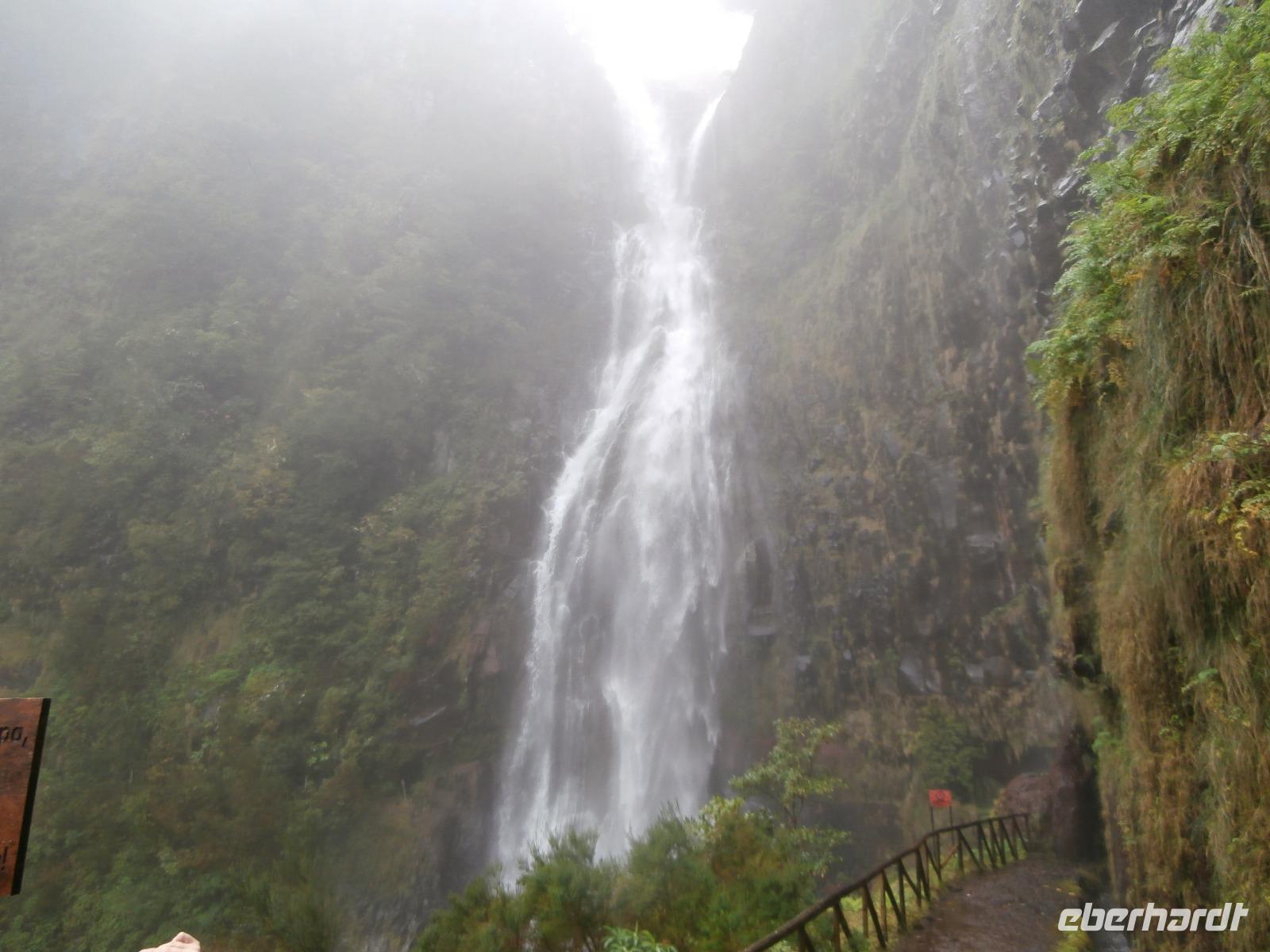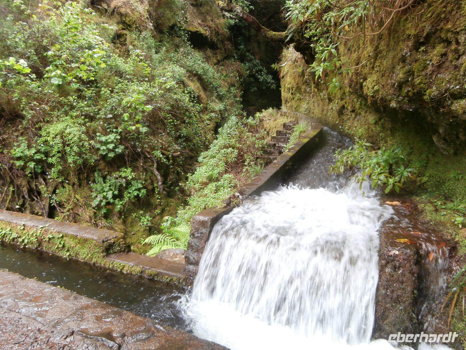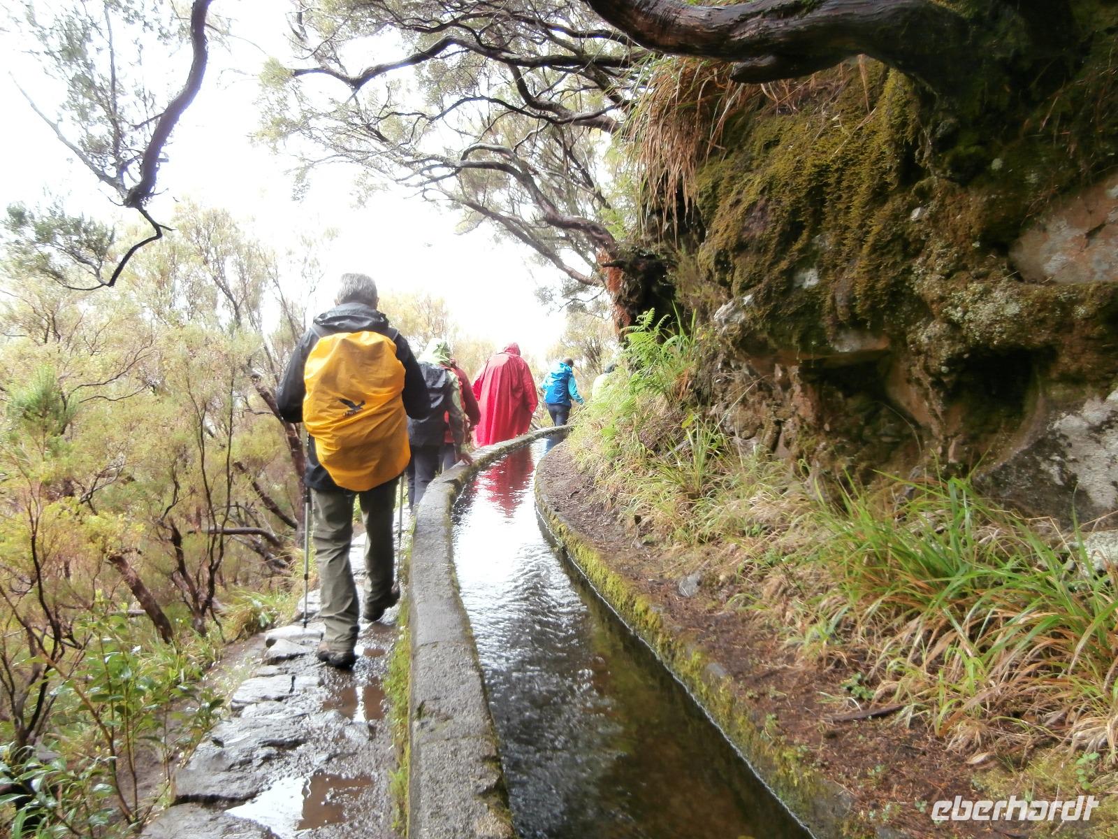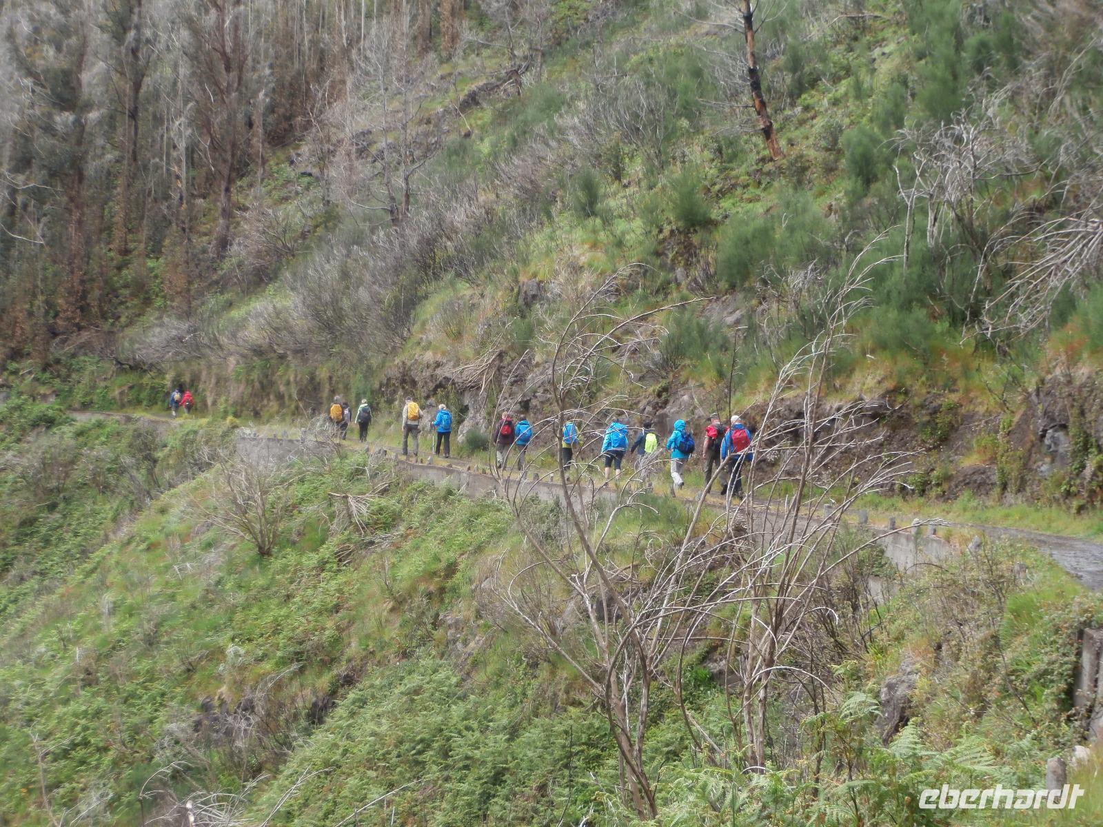 09. Uhr holt uns Fatima mit dem Bus ab und los geht die Fahrt zur Wanderung im Tal von Rabacal zu den 25 Quellen. WC Stopp legen wir in Loreto in einer Bar ein, später gibt es kaum Möglichkeit zum Tolettieren. Die Wanderung begleitet Regen und Nässe, aber wir sind darauf vorbereitet. Das Tal von Rabacal ist reizvoll mit rauschenden Wasserfällen, grünen Bergen mit berauschender Natur. Viel Wasser und der Regen verlangen uns viel Konzentration für die Strecke ab, sie ist teilweise sehr schmal und schlängelt sich unterhalb der Levada sehr holprig entlang. Viele Engstellen mit Gegenverkehr müssen wir passieren. An den 25 Quellen, die sich in einem engen Felskessel befinden, legen wir 30 min Pause zum Fotografieren und betrachten des Naturwunders ein. Zurück geht unsere Wanderung zum Teil auf anderer Strecke, dabei müssen wir einen Tunnel von knapp 1 km passieren, alle haben wir unsere Stirnlampen für die gute Sicht dabei. Das Ende unserer Wanderung führt noch ein Stück durch Eukalyptuswald und Blick zum Meer. Nelson unser Fahrer erwartet uns mit dem Bus, ja anstrengend war es schon heute, viel Aufmerksamkeit und Konzentration mussten wir an den Tag legen. In Calheta stoppen wir an einer Bar für Kaffee und WC, die Sonne wärmt uns den Rücken, eine schöne Wanderung war es für uns alle.