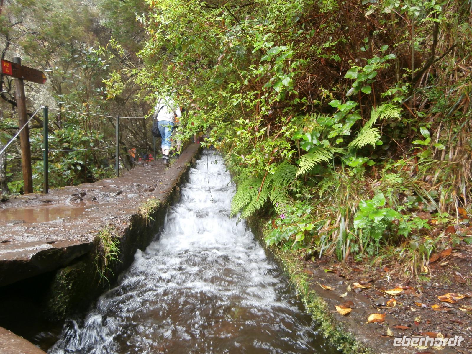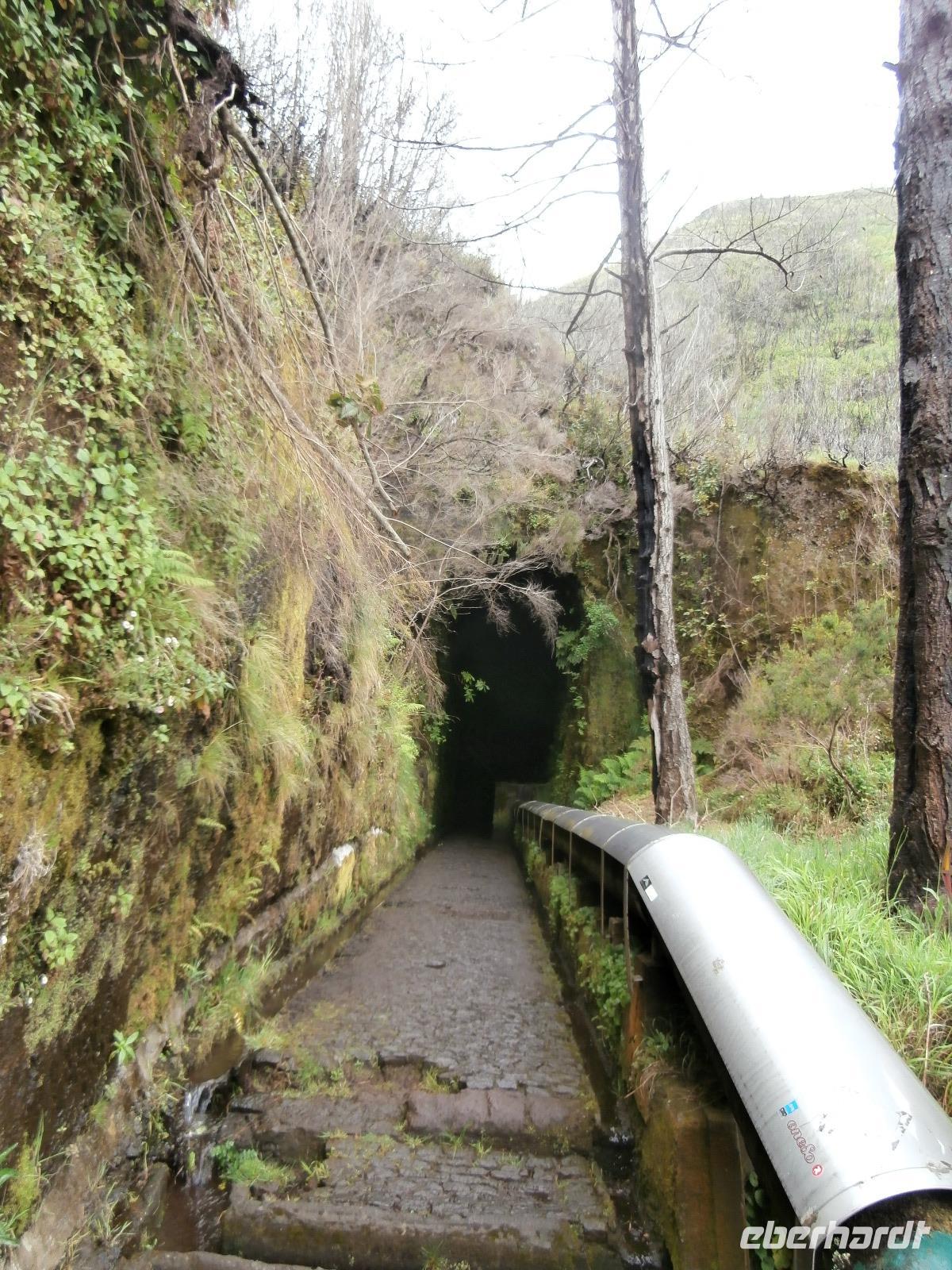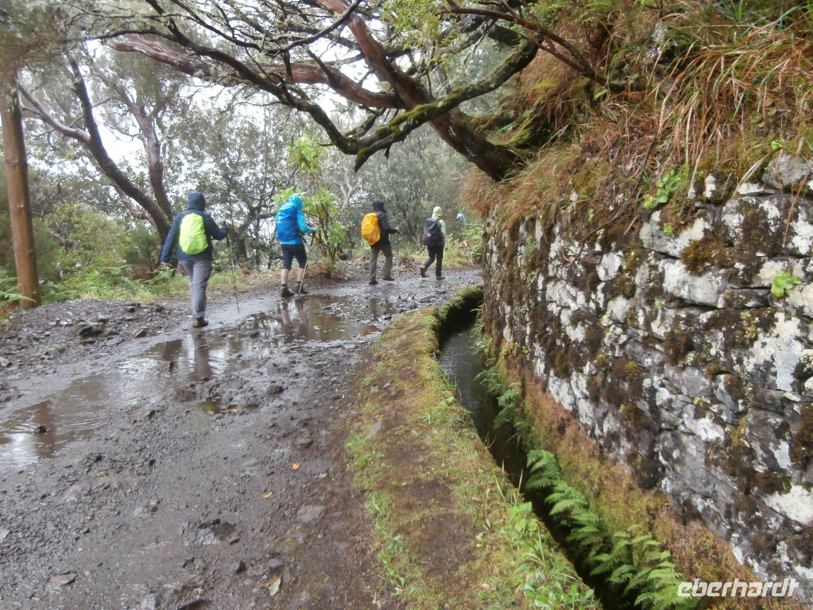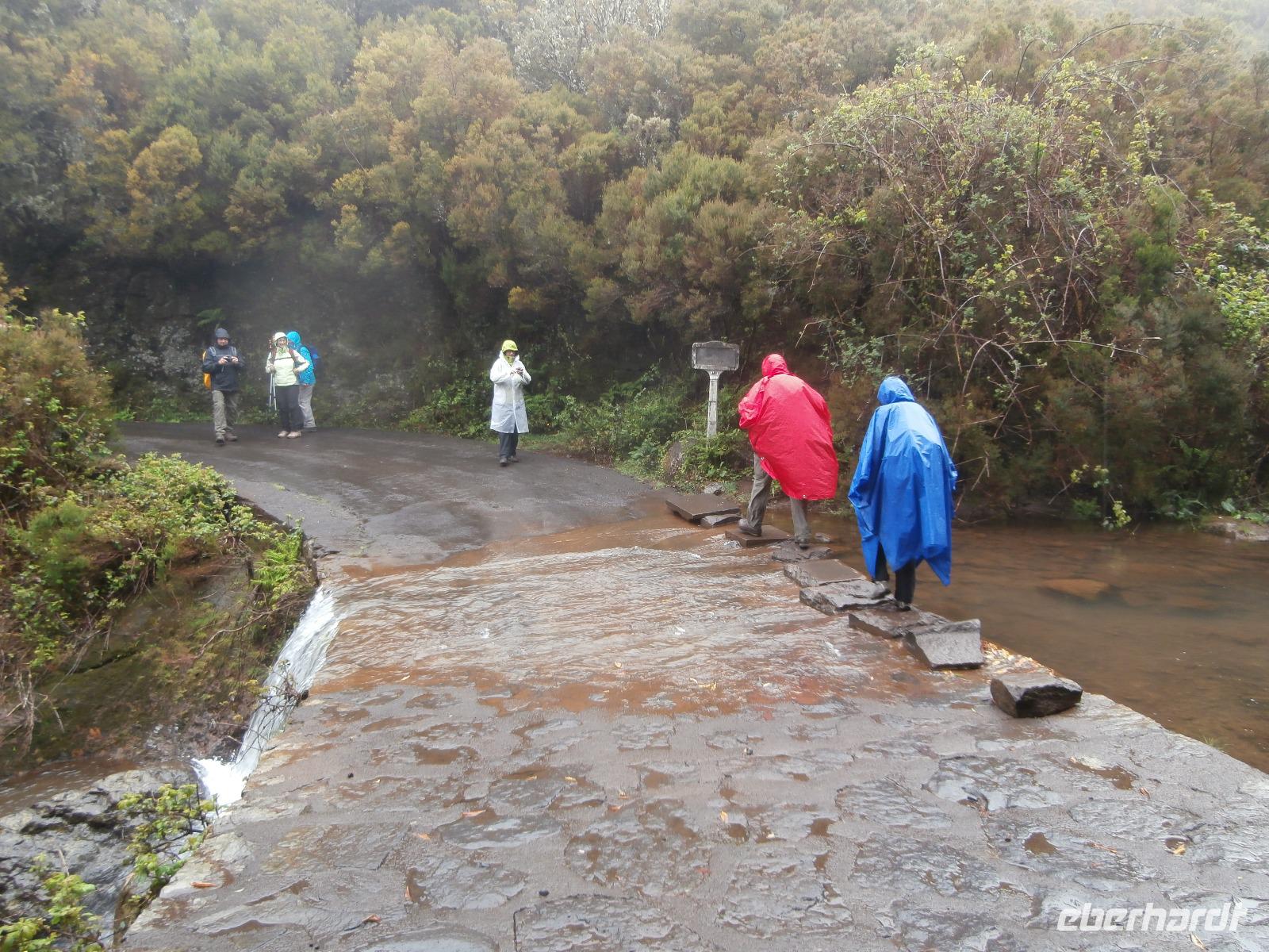 09. Uhr holt uns Fatima mit dem Bus ab und los geht die Fahrt zur Wanderung im Tal von Rabacal zu den 25 Quellen. WC Stopp legen wir in Loreto in einer Bar ein, später gibt es kaum Möglichkeit zum Tolettieren. Die Wanderung begleitet Regen und Nässe, aber wir sind darauf vorbereitet. Das Tal von Rabacal ist reizvoll mit rauschenden Wasserfällen, grünen Bergen mit berauschender Natur. Viel Wasser und der Regen verlangen uns viel Konzentration für die Strecke ab, sie ist teilweise sehr schmal und schlängelt sich unterhalb der Levada sehr holprig entlang. Viele Engstellen mit Gegenverkehr müssen wir passieren. An den 25 Quellen, die sich in einem engen Felskessel befinden, legen wir 30 min Pause zum Fotografieren und betrachten des Naturwunders ein. Zurück geht unsere Wanderung zum Teil auf anderer Strecke, dabei müssen wir einen Tunnel von knapp 1 km passieren, alle haben wir unsere Stirnlampen für die gute Sicht dabei. Das Ende unserer Wanderung führt noch ein Stück durch Eukalyptuswald und Blick zum Meer. Nelson unser Fahrer erwartet uns mit dem Bus, ja anstrengend war es schon heute, viel Aufmerksamkeit und Konzentration mussten wir an den Tag legen. In Calheta stoppen wir an einer Bar für Kaffee und WC, die Sonne wärmt uns den Rücken, eine schöne Wanderung war es für uns alle.