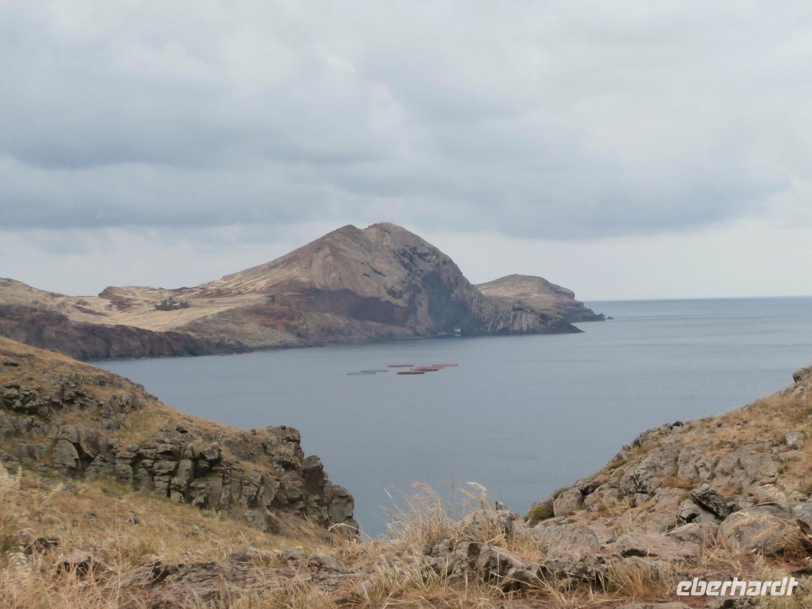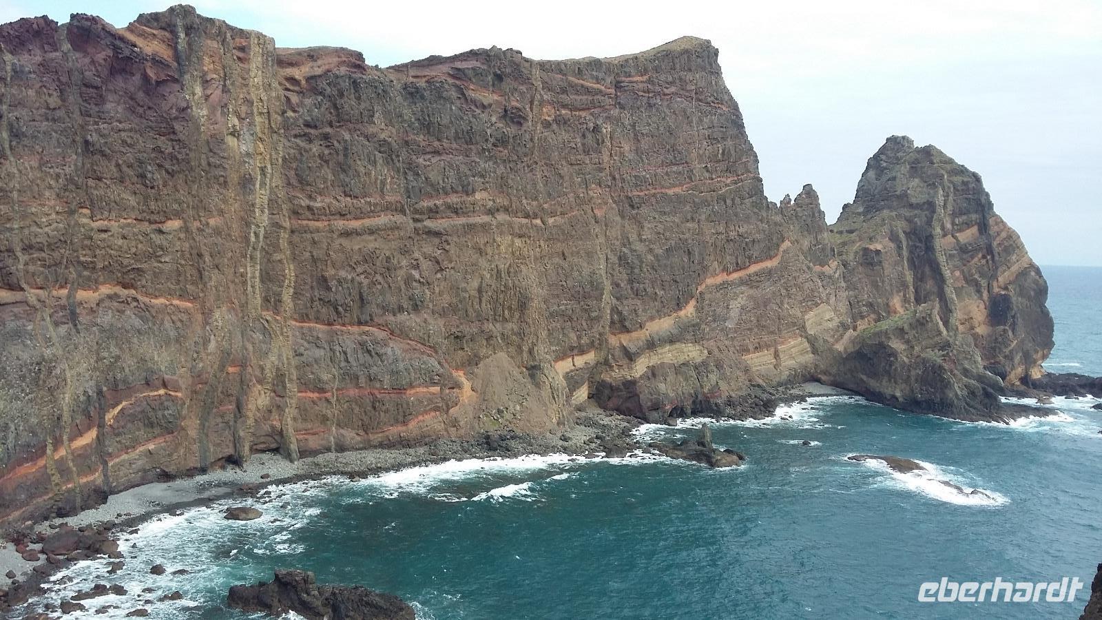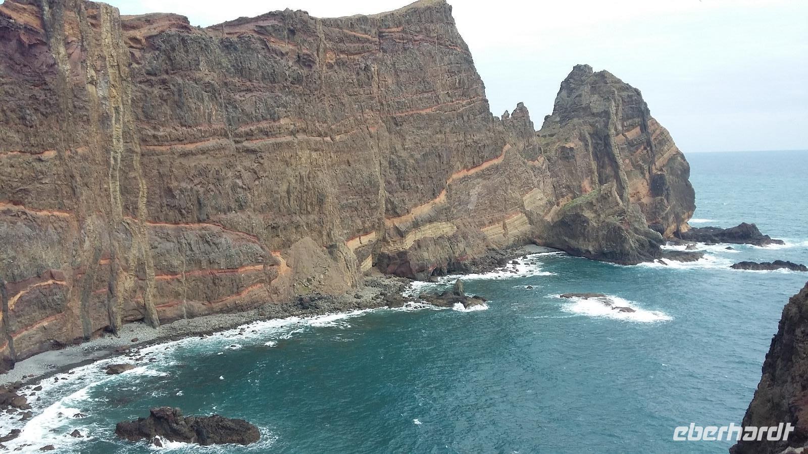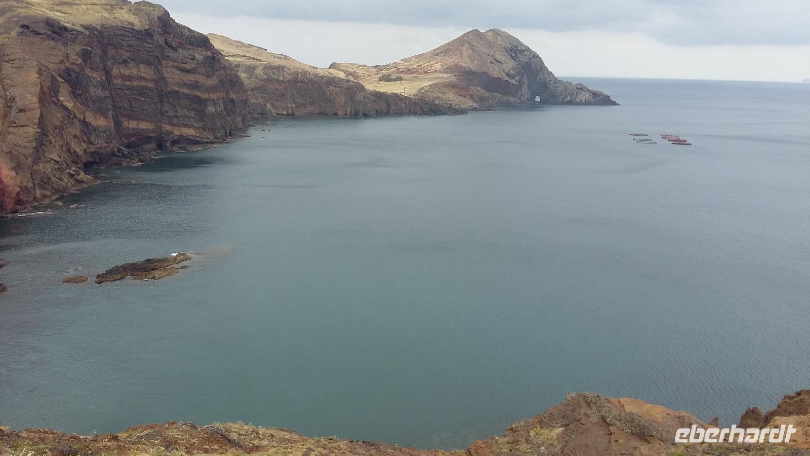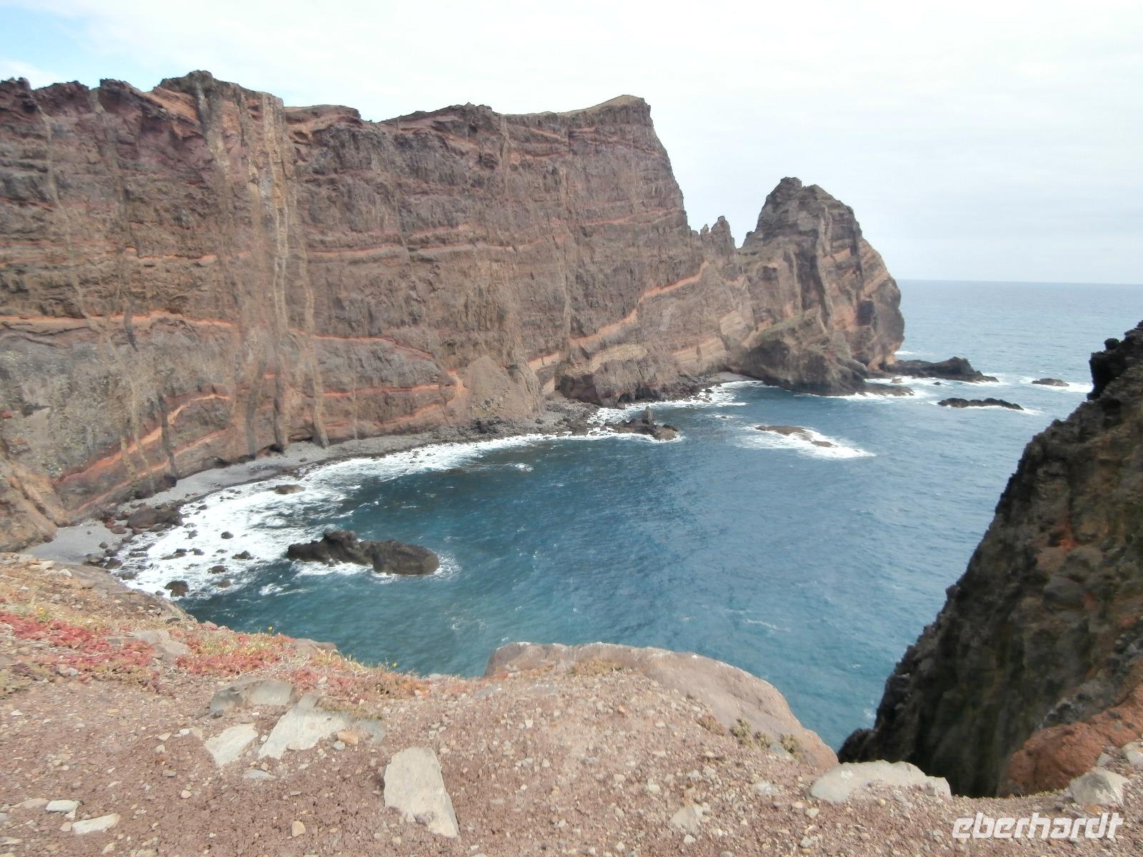 Pünktlich Neun Uhr werden wir von Fatima und Nelson abgeholt, die äußerste Ostspitze von Madeira wollen wir heute erwandern. Sie steht als karges Stück Land mit wenig Vegetation im starken Kontrast zum Rest der Insel Madeira. Gutes Wetter ist uns hold, trocken und nicht zu warm ist es, also ideal zum Wandern. Am Parkplatz lassen wir den Bus zurück, denn hier ist Start für unsere heutige Wanderung in die baumlose, karge Landschaft der Ostspitze Madeiras. Wir blicken auf den Atlantik, in die Bucht Baia de Abra und sehen hinüber zu den 3 unbewohnten Inseln, den Desertas. Herrliches Wetter, tolle Farben mit dem Blau des Atlantik und der aufschäumenden Gicht bieten einen Kontrast zum kargen Bild des Stückes Land mit der spärlichen Vegetation. Scharfe Grate, extreme Auf-und Abstiege, sie wechseln mit grandiosen Ausblicken, schroffen Felsformationen und Gesteinsgebilden, die in vielen Farben schimmern. Das Gestein hat uns viel aufgezeigt, der Fluss der Lava ist immer wieder deutlich sichtbar. Ein Picknick legen wir an einem Rastplatz ein, viele Tauben umgeben uns hier. Zum Gipfel wandern einige unserer Gäste, Ingrid ist mit dabei. Genial, aber sehr windig ist es oberhalb am Aussichtspunkt, bis zum letzten Zipfel der Ostspitze können wir schauen.
