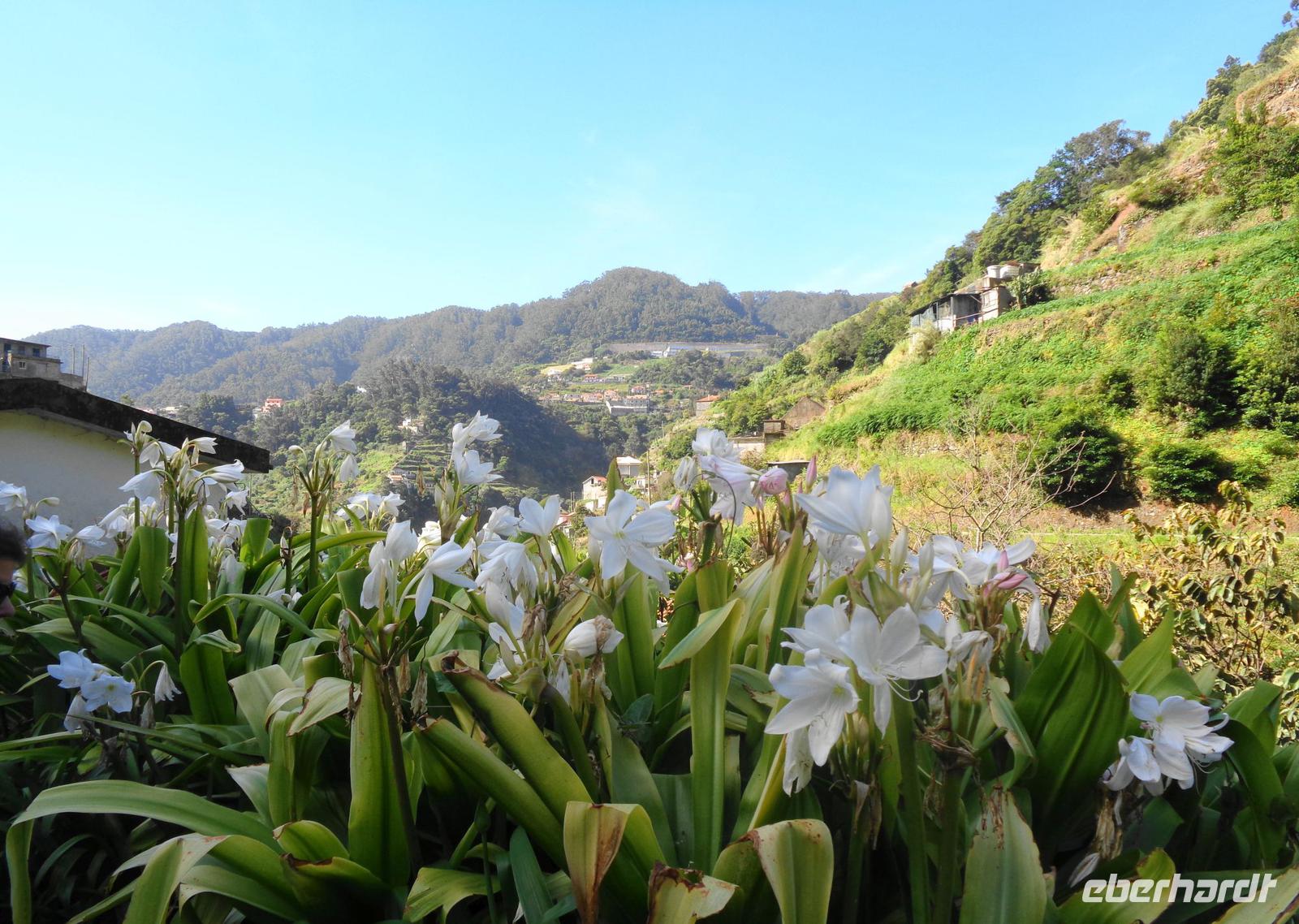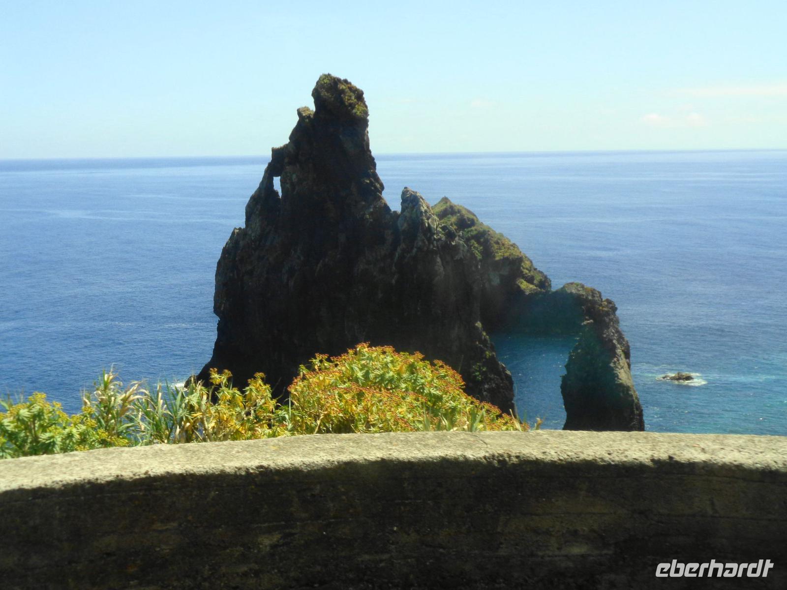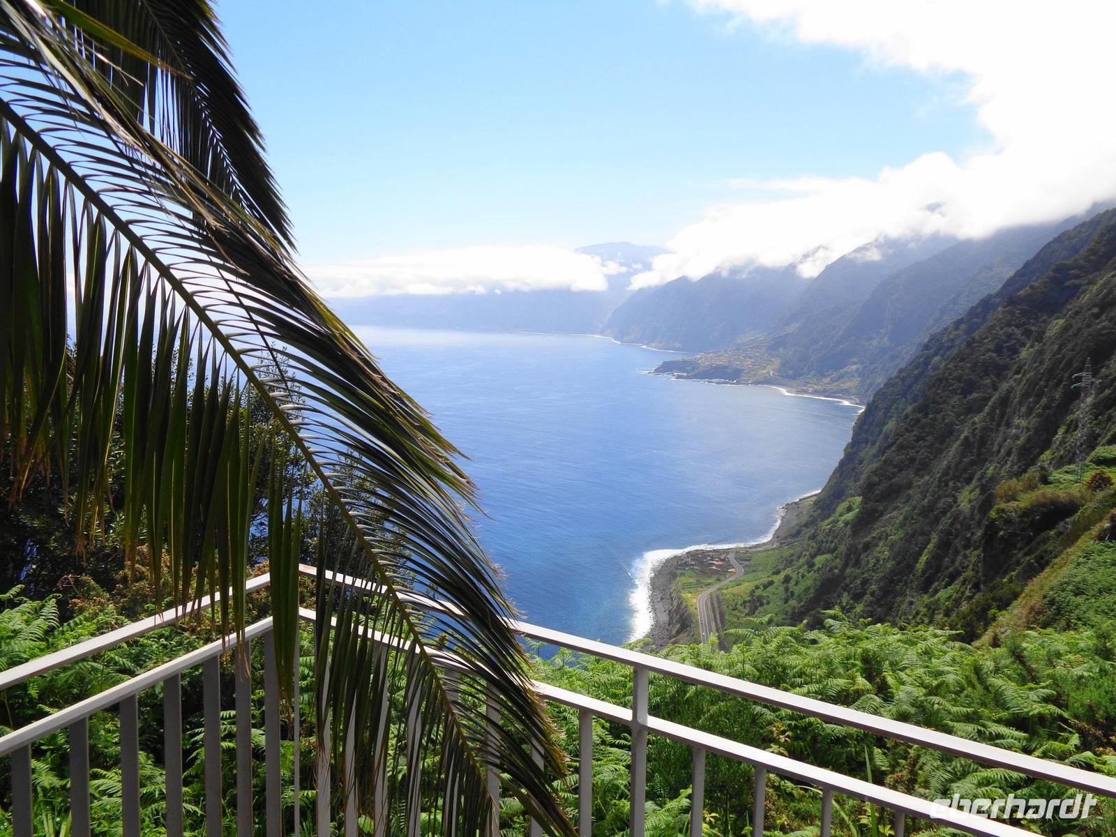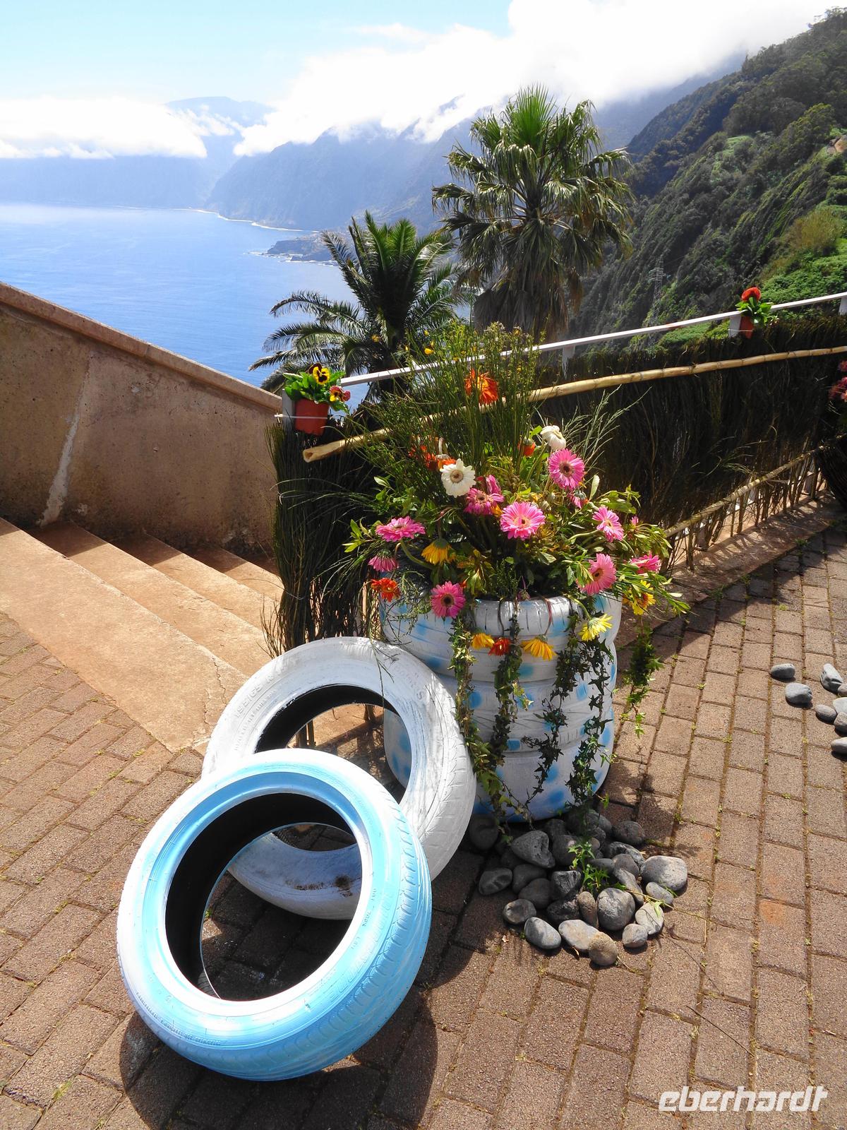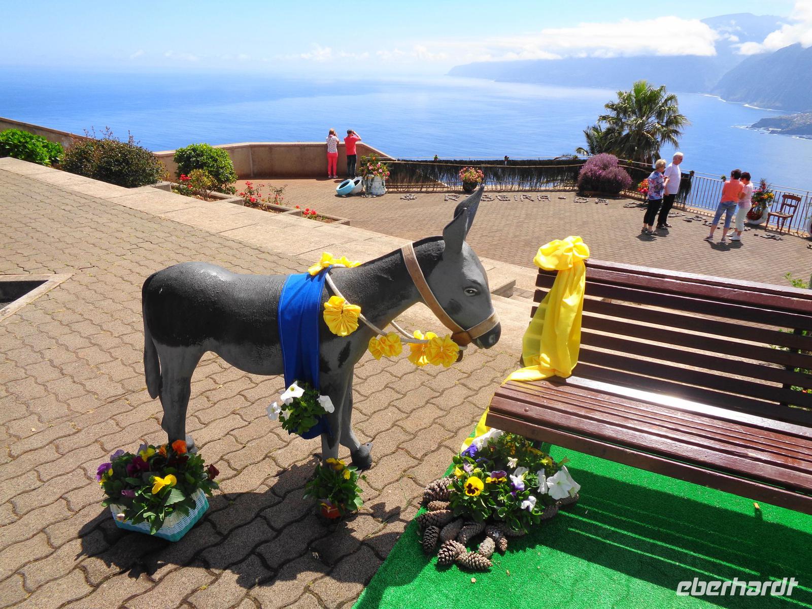 Weiter ging es zur längsten und tiefsten Schlucht Madeiras, der Ribeira da Janela, unserem nächsten Fotostopp. Beim Aussichtspunkt „Miradouro da Ribeira da Janela" boten sich atemberaubende Ausblicke auf die Dörfer Seixal, São Vicente und Ponta Delgada und auf die „Rocha da Janela", eine bizarre Felsformation vor der Nordküste. Wegen des großen Blumenfestes auf der Insel war der Aussichtspunkt liebevoll mit Arrangements aus frischen Blumen und sogar einem Eselchen geschmückt. Mit dem berühmten Blumenfest, der „Festa da Flor", wird auf der Insel traditionell der Frühling begrüßt. Der Höhepunkt des Festes, der große Blumenkorso, zieht jedes Jahr tausende Besucher an.
