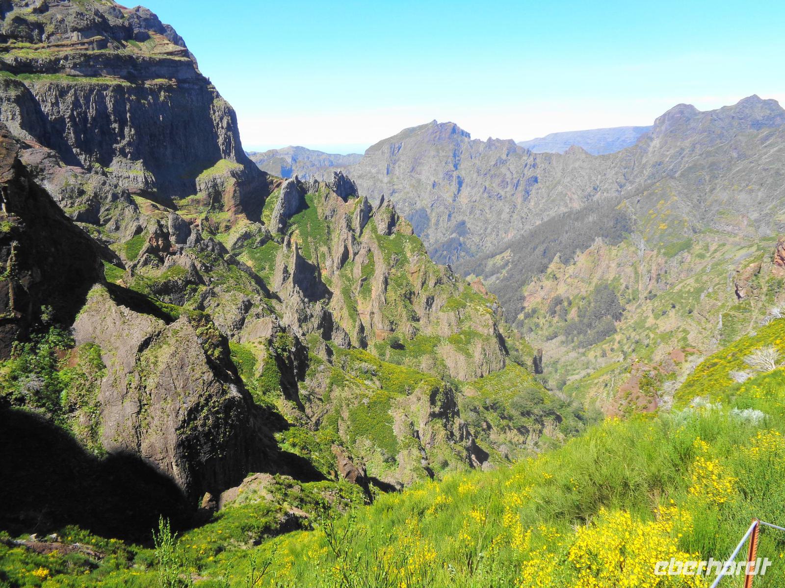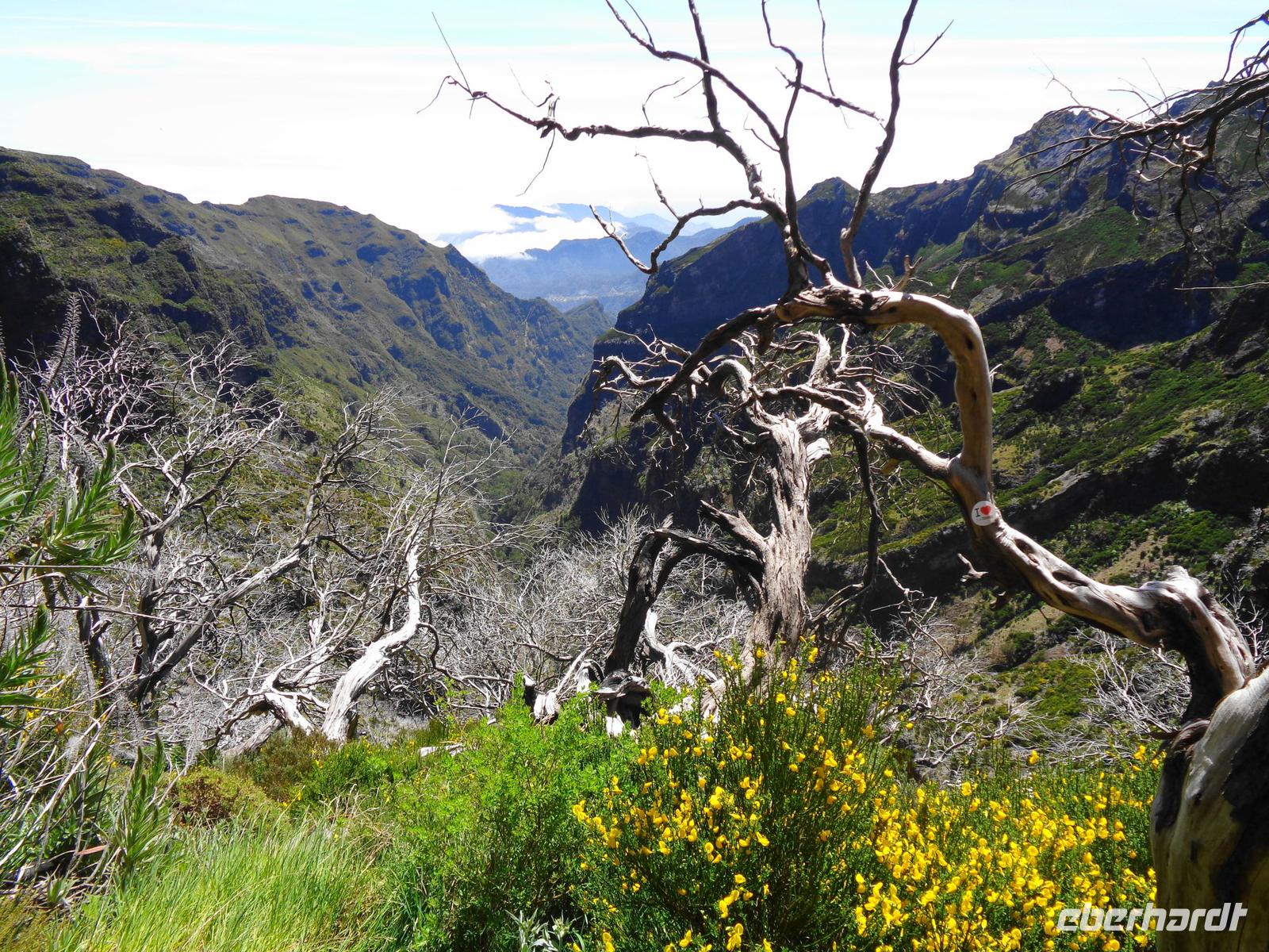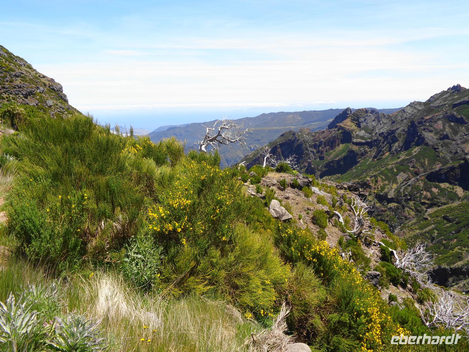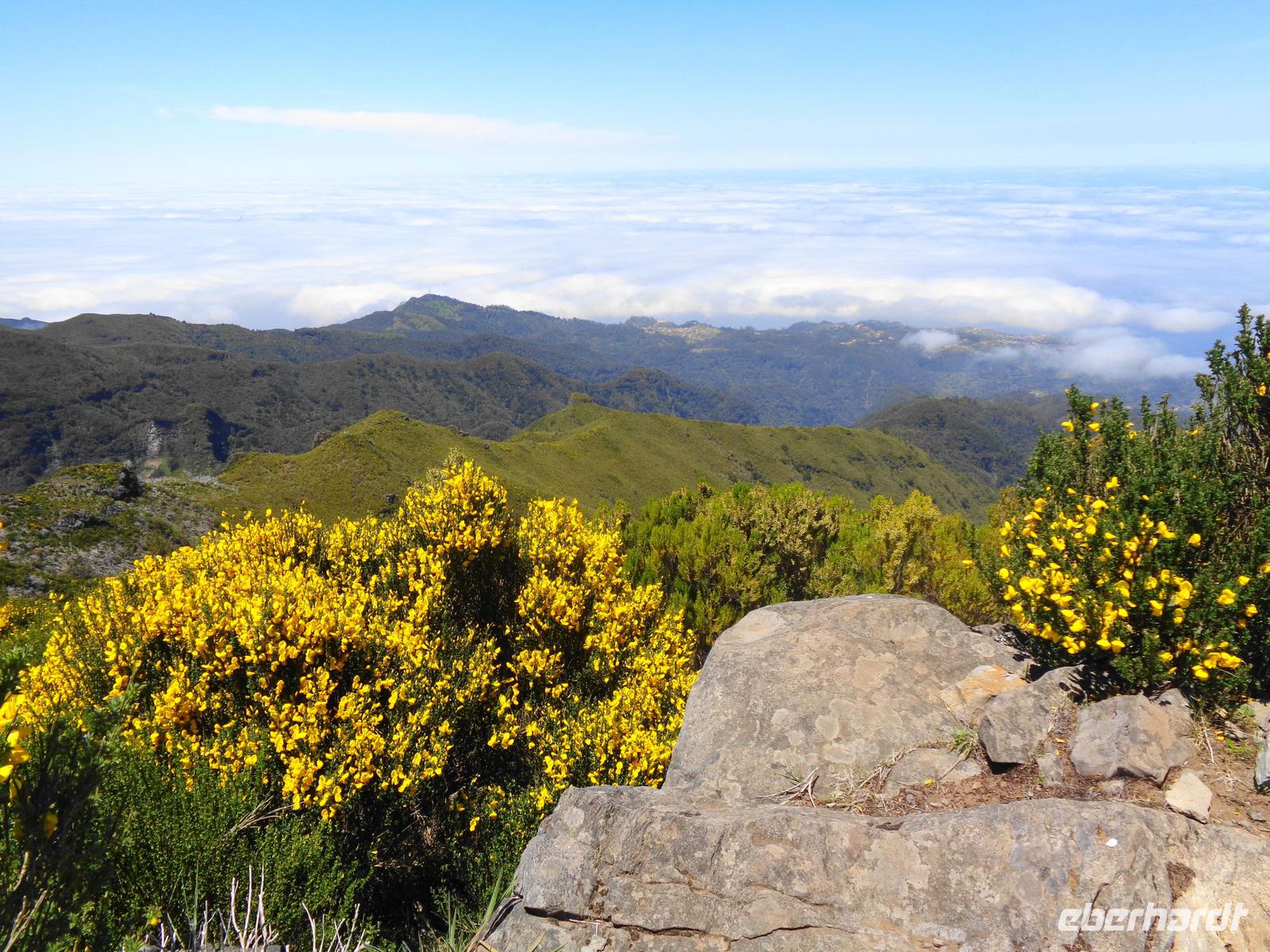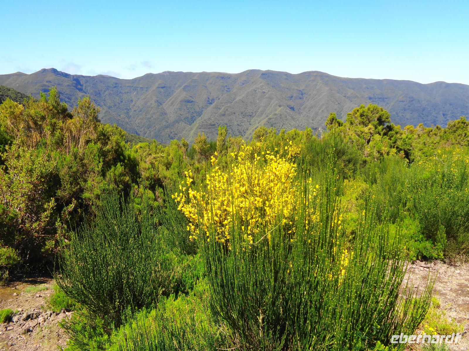 Auf der Passhöhe legten wir bei herrlicher Fernsicht auf 1007 m Höhe einen Fotostopp ein und die Gäste waren sehr beeindruckt von der wildromantischen Berglandschaft und dem allseits üppig blühenden gelben Ginster. Von der Hochebene Paúl da Serra aus genossen wir auch unvergessliche Ausblicke auf die Nord- und Südküste der Insel.