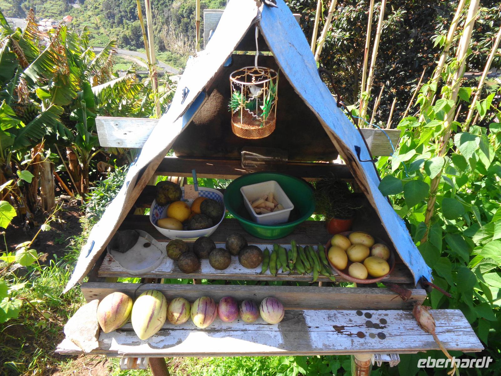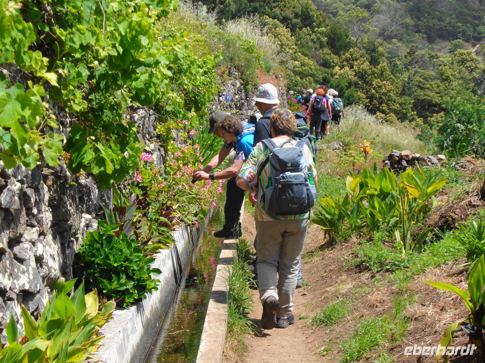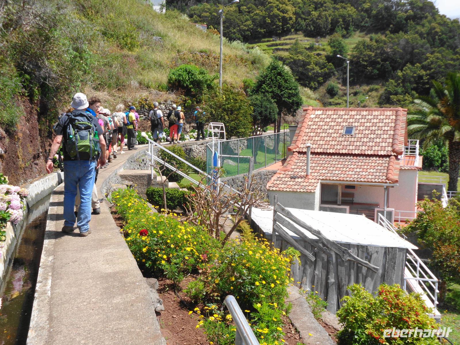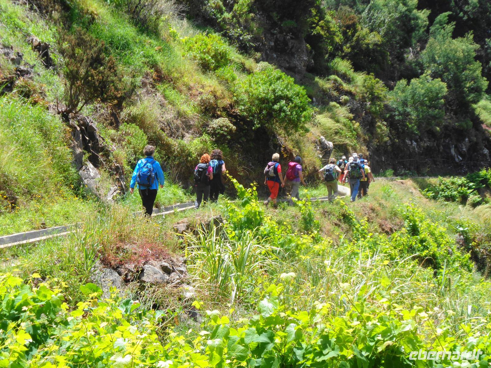 Die heutige Wanderung entlang der „Levada dos Maroços" hatte noch einmal einen ganz anderen Charakter als die vorangegangenen. Der wunderschöne Weg beginnt in Maroços, verläuft gemächlich und fast ohne Gefälle immer am Hang entlang und führt an vielen Terrassenfeldern vorbei, wo man die Kleinbauern und ihre Frauen beim Bestellen der kleinen Felder beobachten kann. Das frisch geerntete Gemüse und Obst wird an improvisierten Verkaufsständen zum Verkauf angeboten. Die Levada wird auch „Akazien-Levada" genannt, da im Frühjahr unzählige gelb blühende Akazien den Weg säumen. Immer wieder eröffneten sich uns fantastische Ausblicke auf die Küste, das Städtchen Machico und den tiefblauen Atlantik. Ab und an kommt man an einem Stall vorbei. Da diese klein und fensterlos sind, werden sie heute zum Glück kaum mehr verwendet. Auf dem Weg kehrten wir in einer Bar ein, wo uns Eberhardt zur Verkostung der lokalen Spezialitäten „Poncha" (Zuckerrohrschnaps, Honig und Zitrone) oder „Cortado" (heißer Kaffee mit Madeira-Wein) einlud.