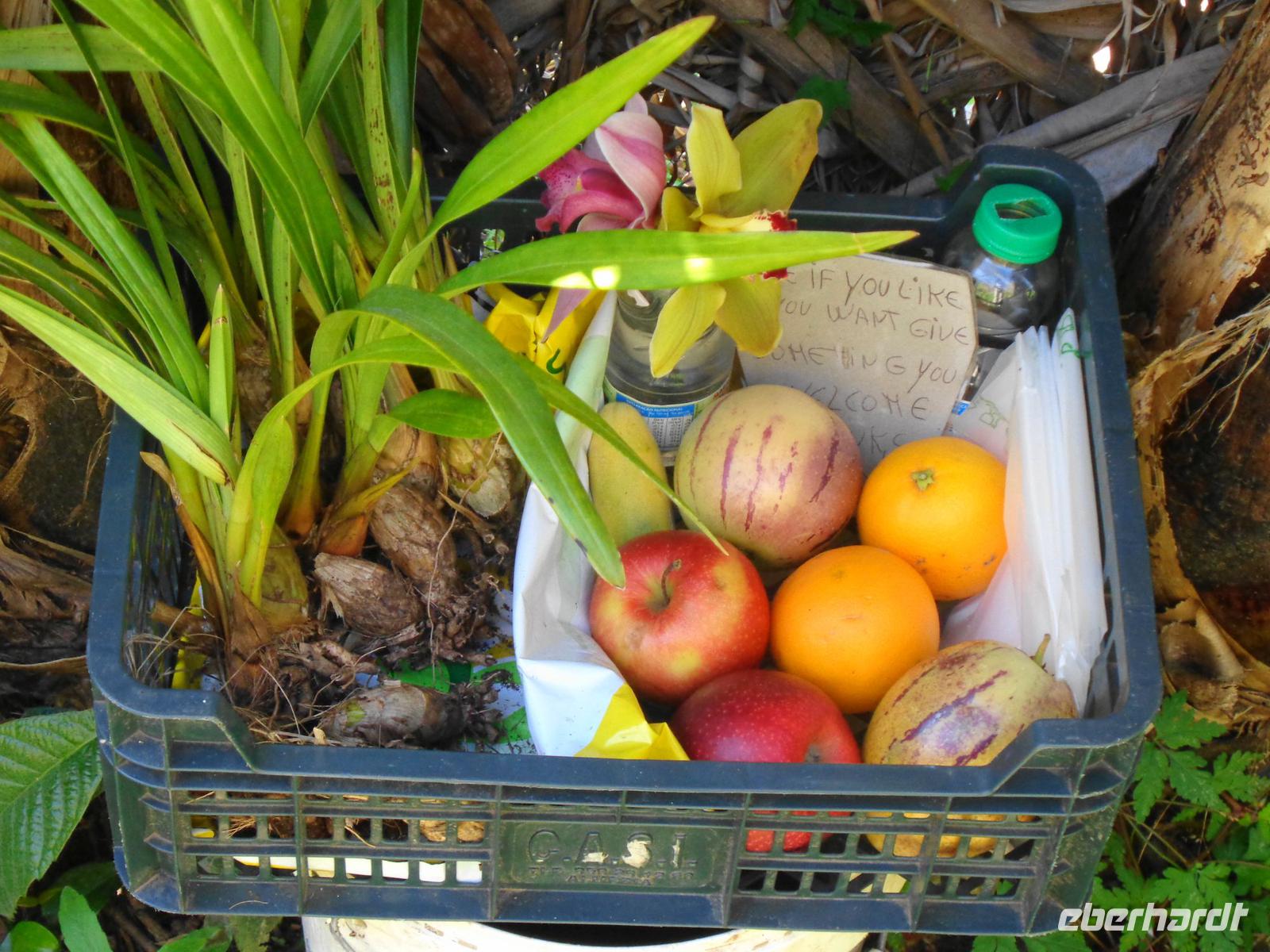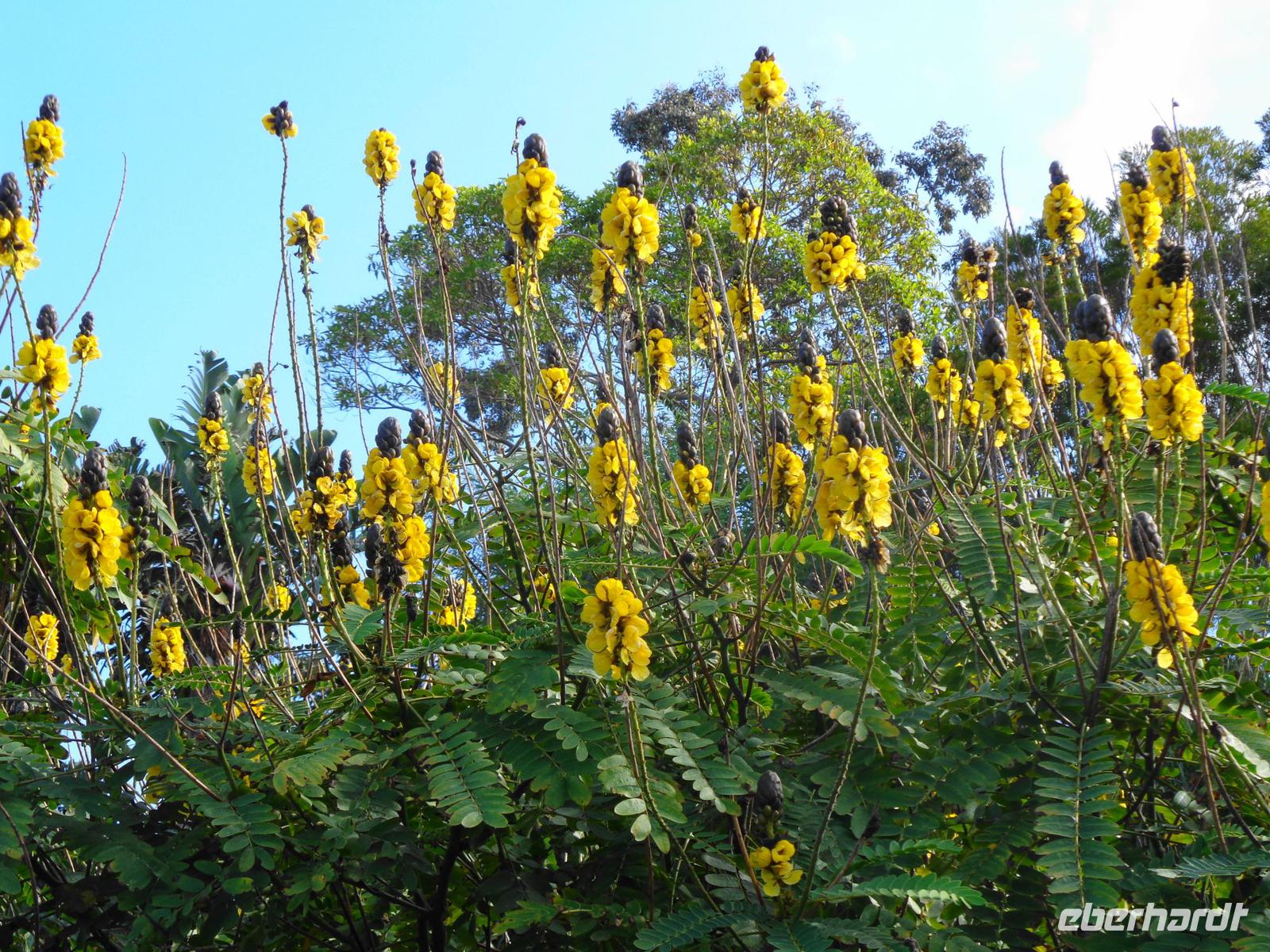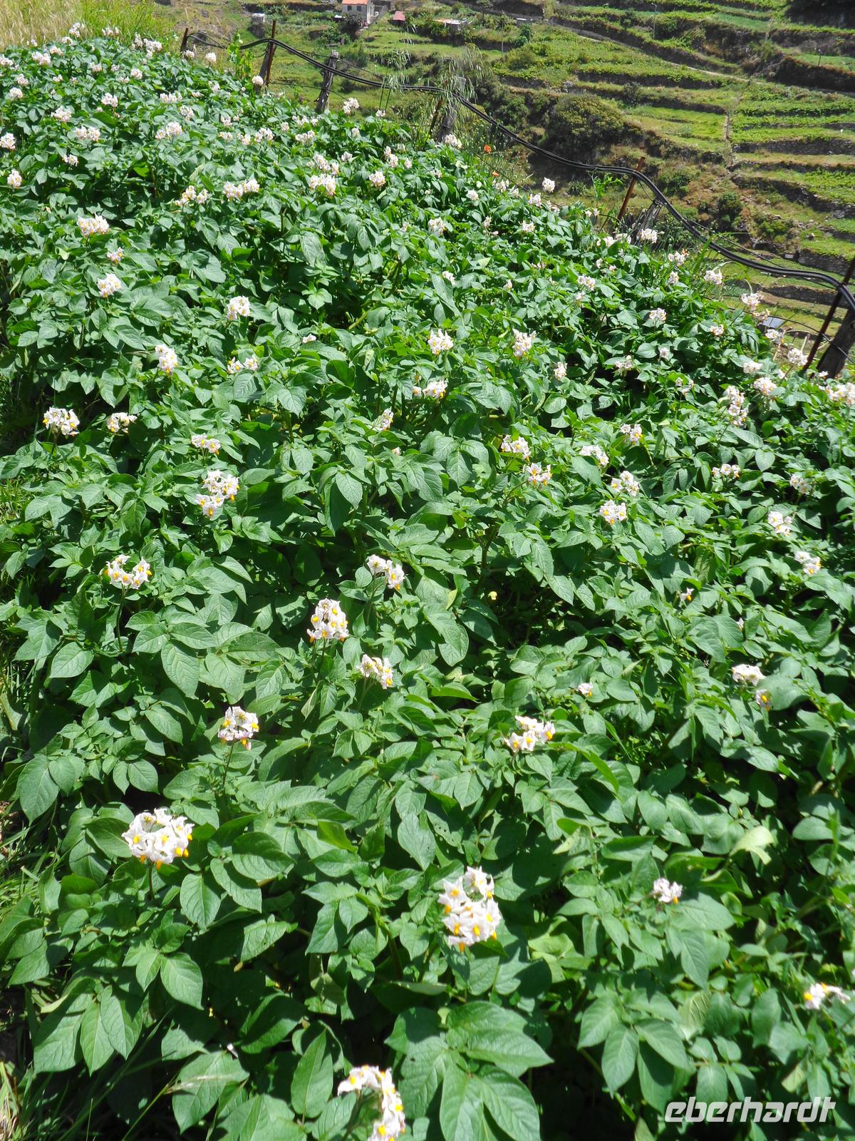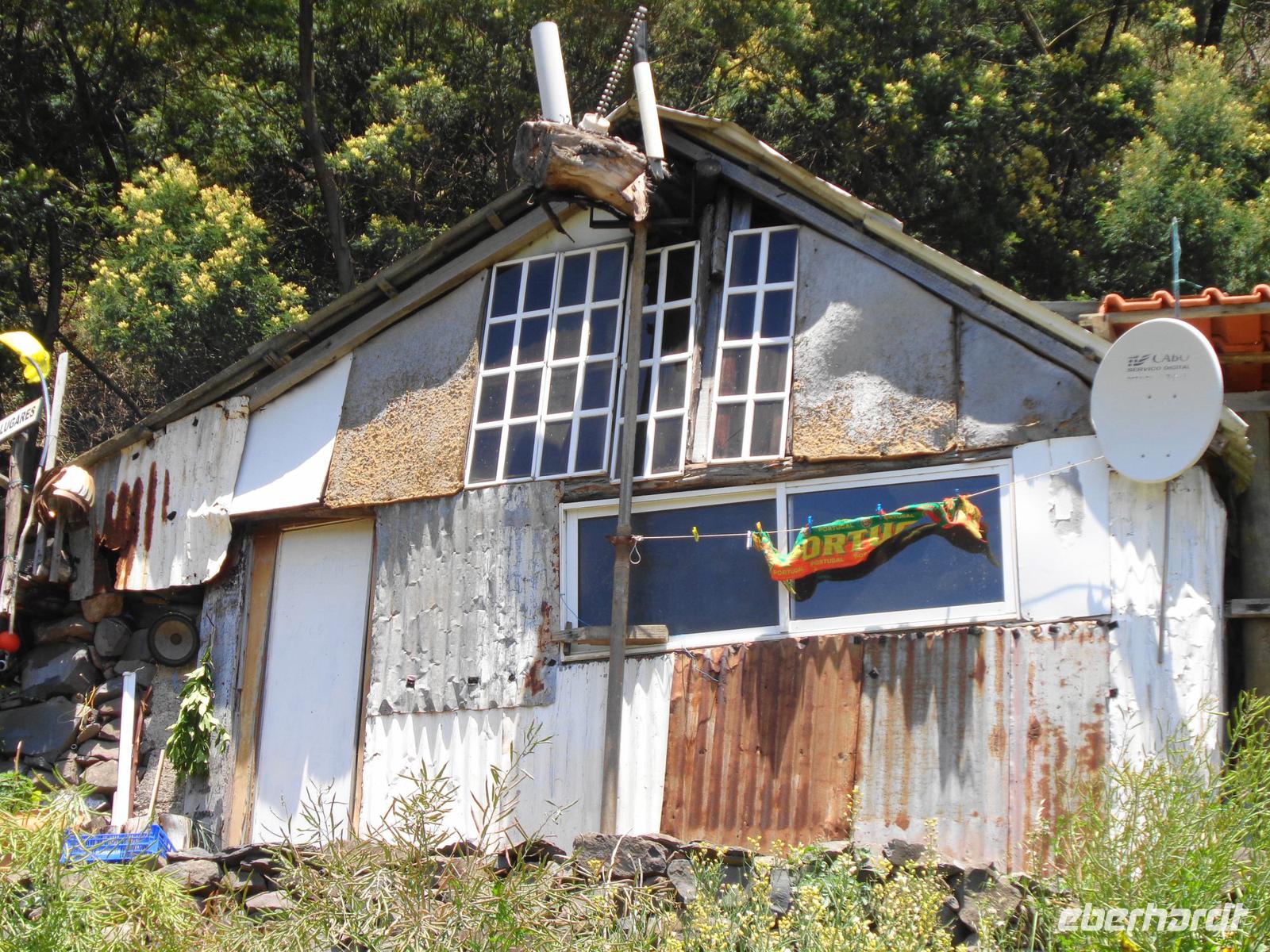 Die heutige Wanderung entlang der „Levada dos Maroços" hatte noch einmal einen ganz anderen Charakter als die vorangegangenen. Der wunderschöne Weg beginnt in Maroços, verläuft gemächlich und fast ohne Gefälle immer am Hang entlang und führt an vielen Terrassenfeldern vorbei, wo man die Kleinbauern und ihre Frauen beim Bestellen der kleinen Felder beobachten kann. Das frisch geerntete Gemüse und Obst wird an improvisierten Verkaufsständen zum Verkauf angeboten. Die Levada wird auch „Akazien-Levada" genannt, da im Frühjahr unzählige gelb blühende Akazien den Weg säumen. Immer wieder eröffneten sich uns fantastische Ausblicke auf die Küste, das Städtchen Machico und den tiefblauen Atlantik. Ab und an kommt man an einem Stall vorbei. Da diese klein und fensterlos sind, werden sie heute zum Glück kaum mehr verwendet. Auf dem Weg kehrten wir in einer Bar ein, wo uns Eberhardt zur Verkostung der lokalen Spezialitäten „Poncha" (Zuckerrohrschnaps, Honig und Zitrone) oder „Cortado" (heißer Kaffee mit Madeira-Wein) einlud.