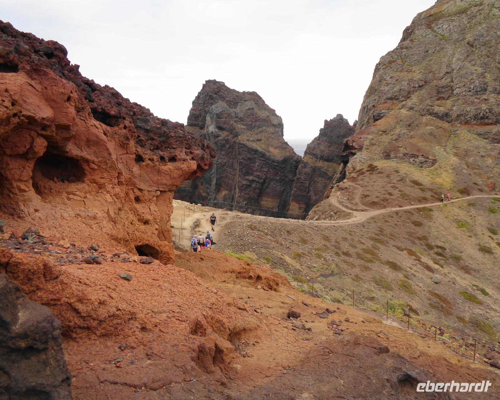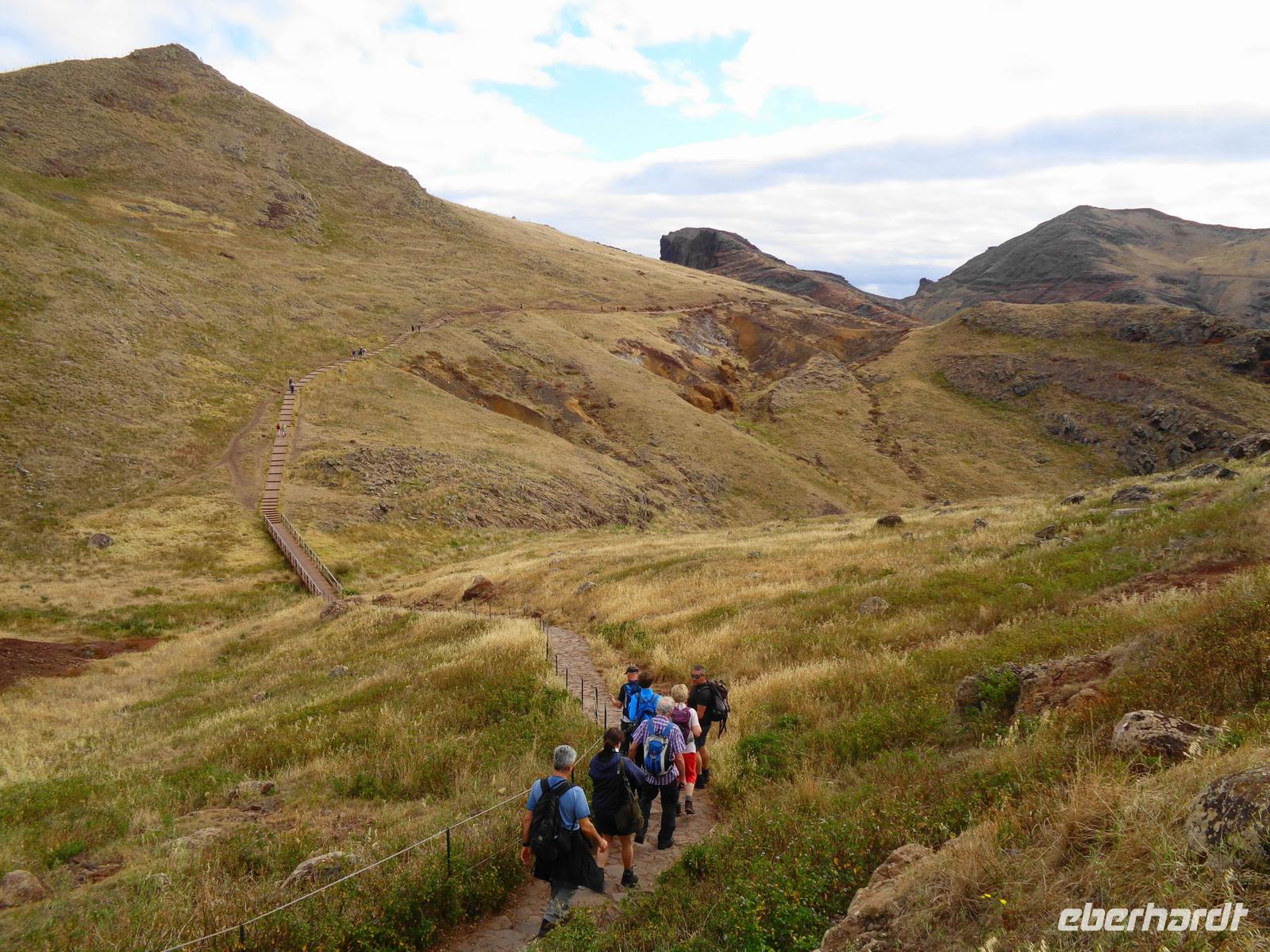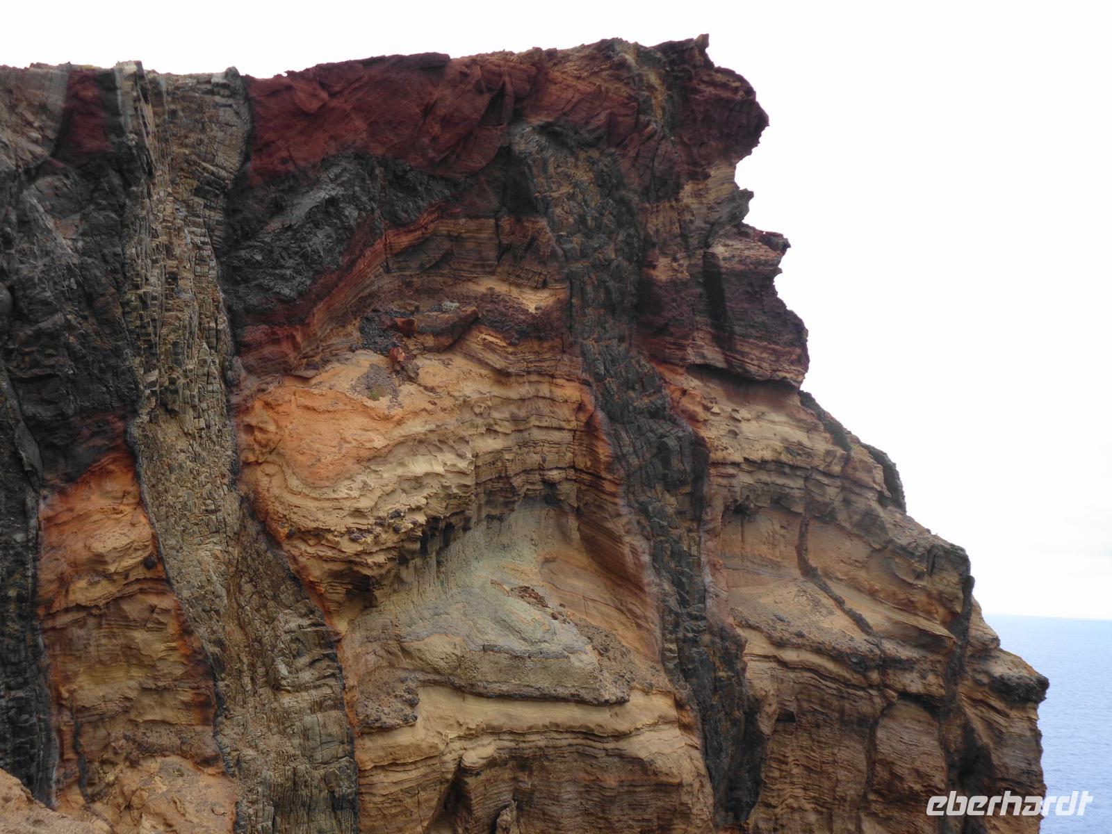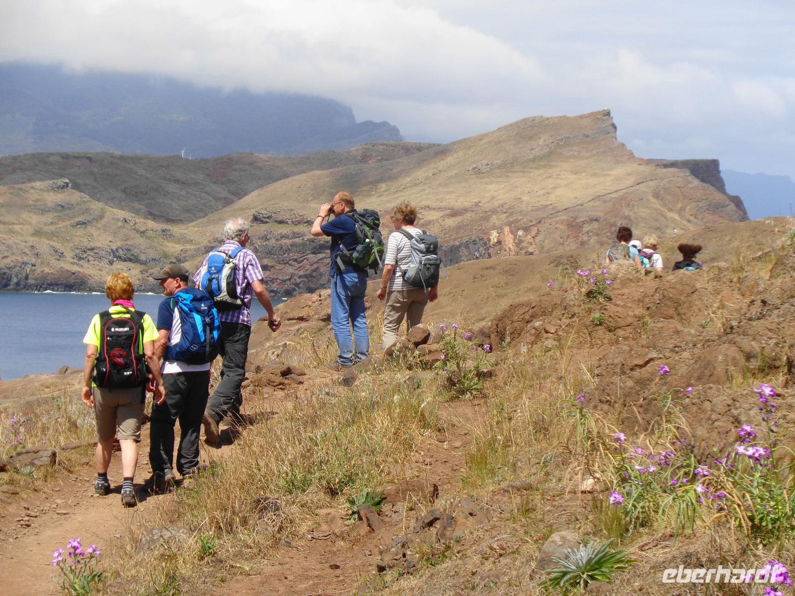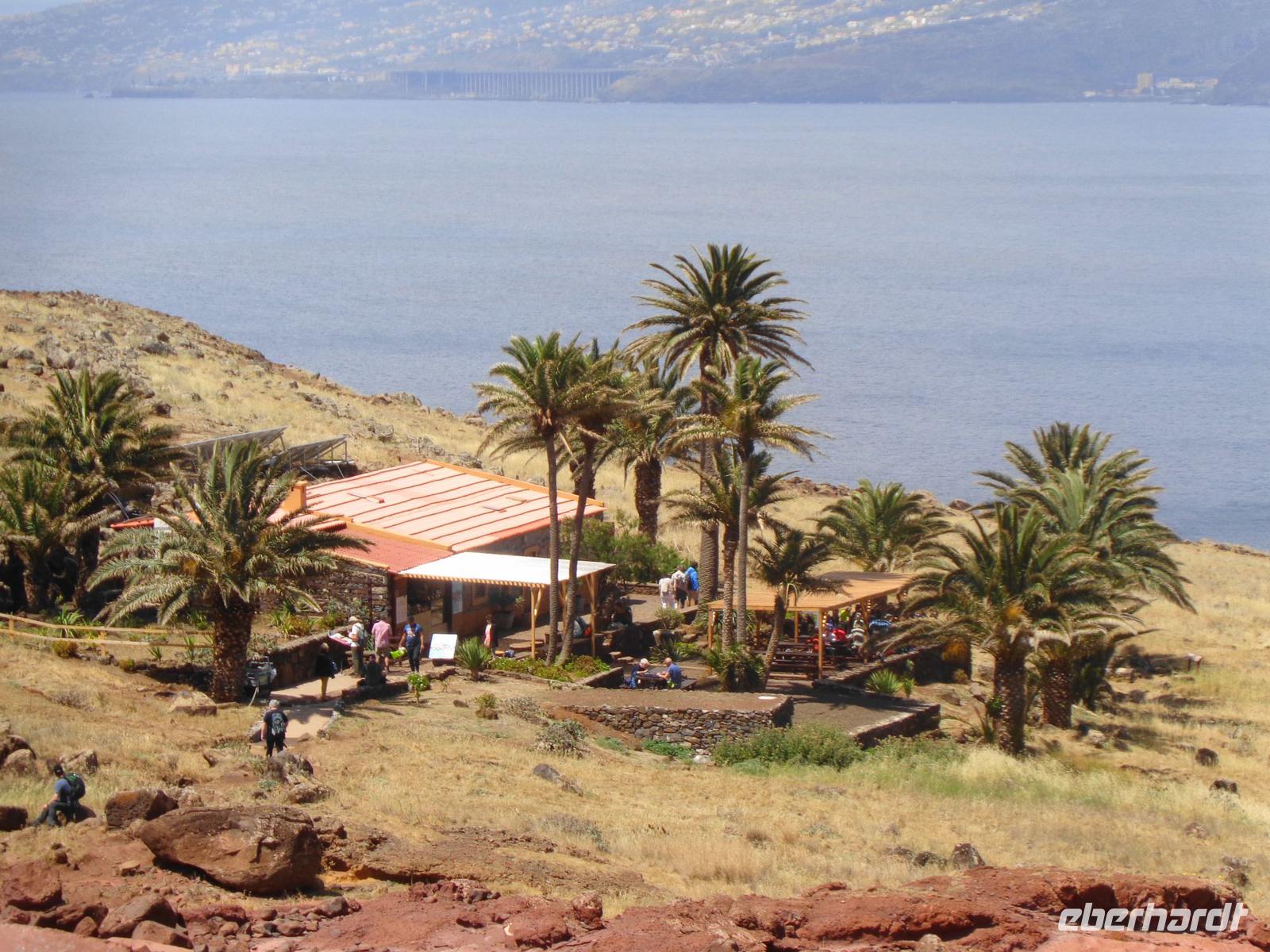 Spektakulär sind auf dieser Wanderung die Blicke auf die Felsabbrüche, wo man den vulkanischen Ursprung der Insel nachvollziehen kann. Die Felsabbrüche legen verschiedenfarbige rote, schwarze und orange Gesteinsschichten frei, die einen tollen Kontrast mit dem tiefblauen Meer bilden. Vom Weg aus hat man ständig wechselnde Ausblicke sowohl auf die raue Nordküste mit der starken Brandung als auch auf die liebliche Südseite der Halbinsel. Nach ca. 1 ¾ Stunden erreichten wir den östlichsten Punkt unserer Wanderung, das Schutzhaus „Casa Sardinha". Dieser Stützpunkt der Naturparkverwaltung ist inzwischen bewirtschaftet und unter schattigen Palmen kann man sich gemütlich für eine Rast niederlassen. Insgesamt bietet die Anlage den Eindruck einer Oase in der Wüste. Einige Gäste ließen es sich nicht nehmen, den angrenzenden Berg zu besteigen, um die Aussicht auf den östlichsten Zipfel von Madeira zu genießen. Zurück ging es auf dem gleichen Weg. Es ist bemerkenswert, wie anders sich die Landschaft darstellt, selbst wenn man auf demselben Weg zurück geht.