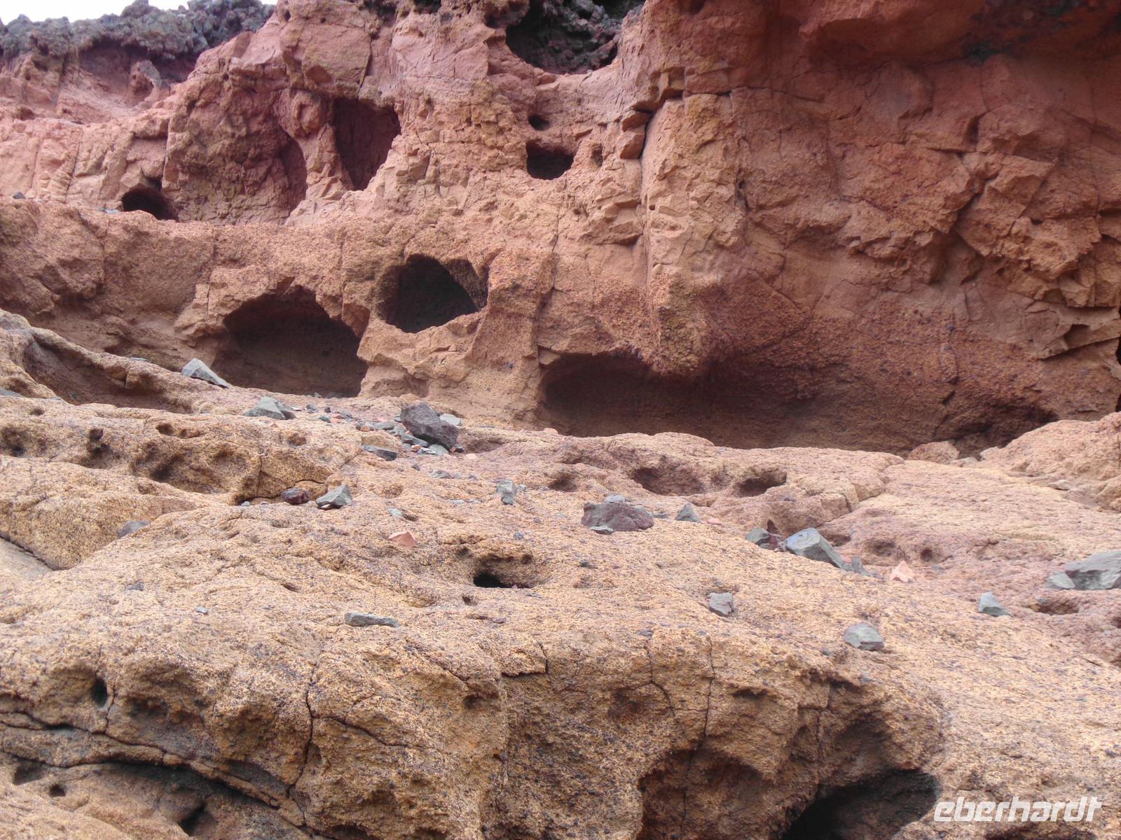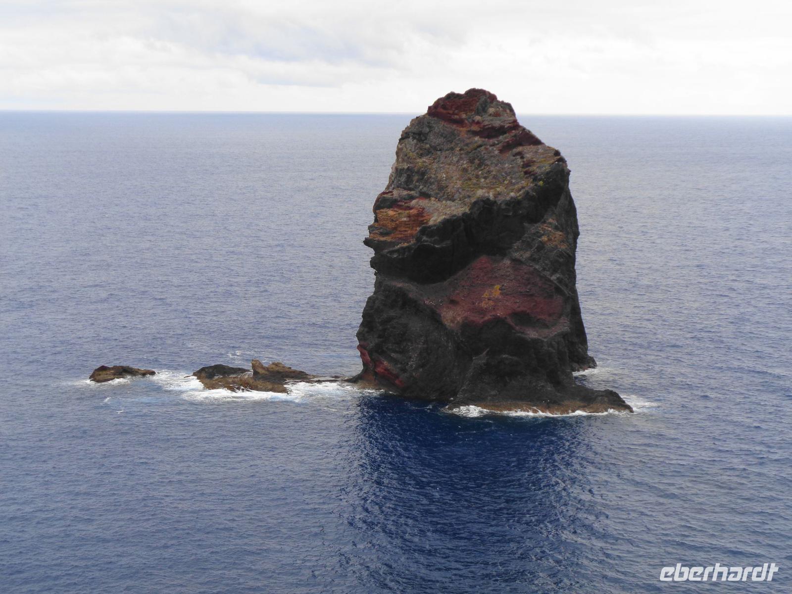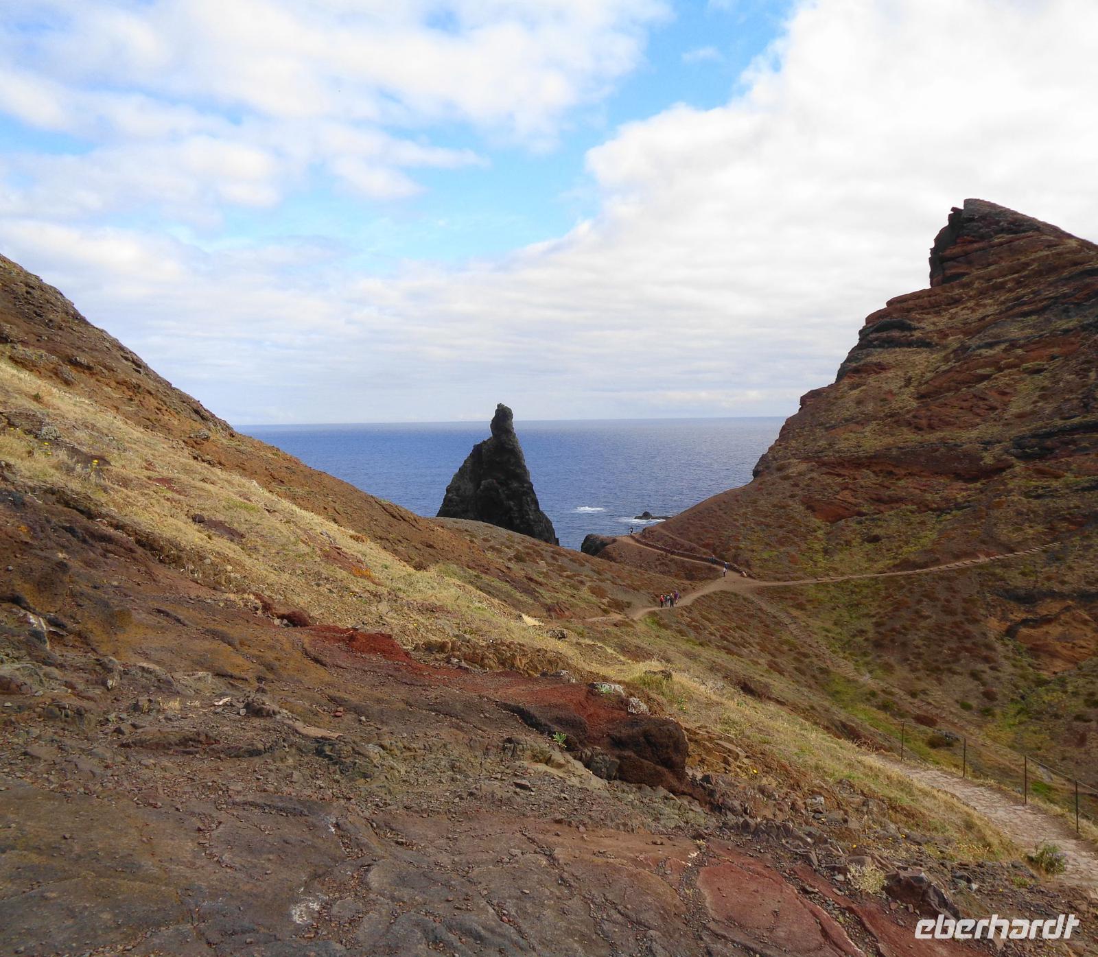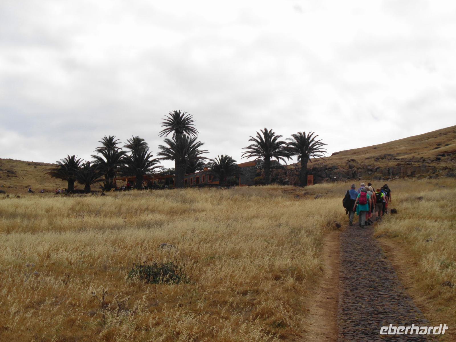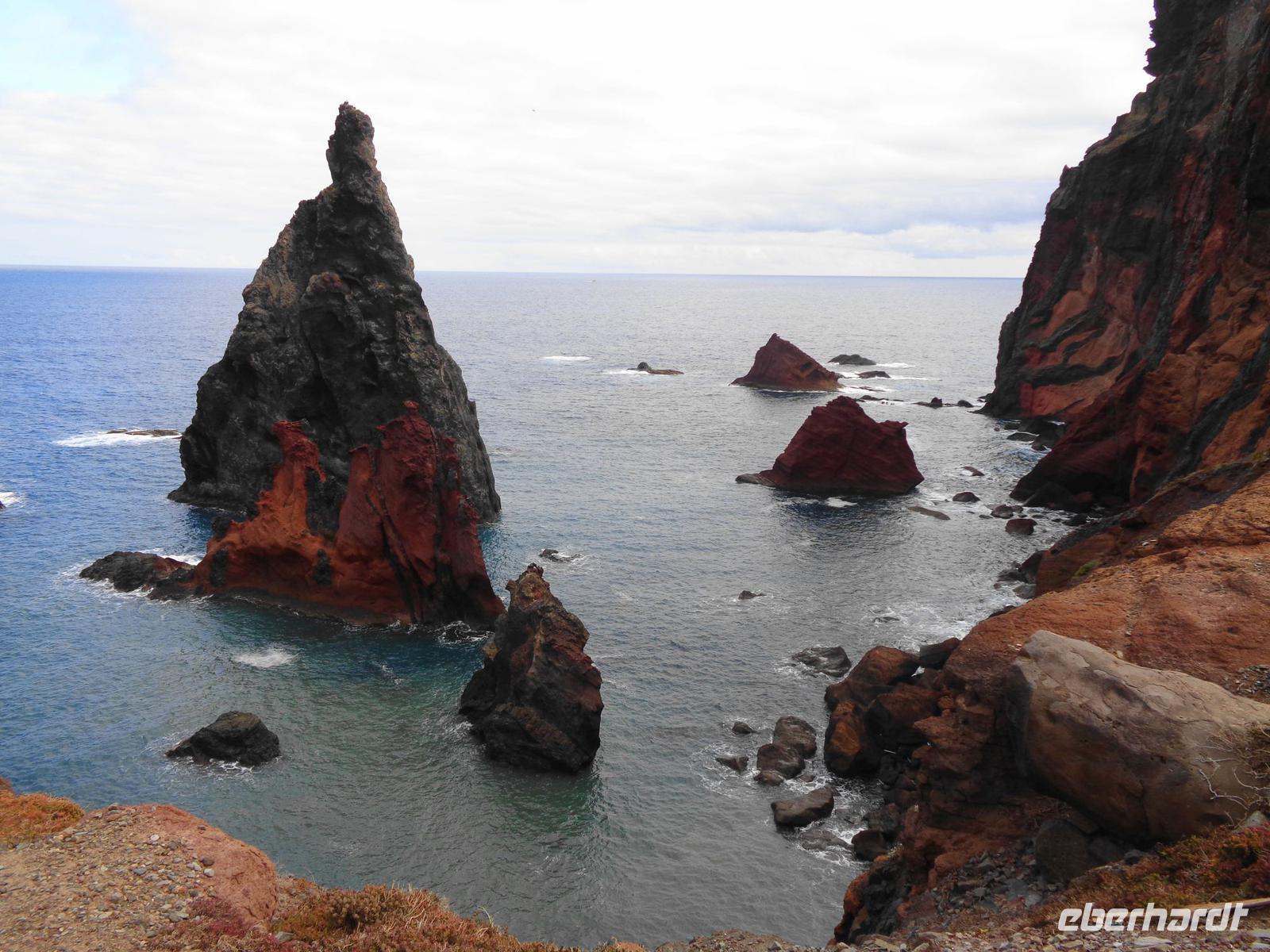 Spektakulär sind auf dieser Wanderung die Blicke auf die Felsabbrüche, wo man den vulkanischen Ursprung der Insel nachvollziehen kann. Die Felsabbrüche legen verschiedenfarbige rote, schwarze und orange Gesteinsschichten frei, die einen tollen Kontrast mit dem tiefblauen Meer bilden. Vom Weg aus hat man ständig wechselnde Ausblicke sowohl auf die raue Nordküste mit der starken Brandung als auch auf die liebliche Südseite der Halbinsel. Nach ca. 1 ¾ Stunden erreichten wir den östlichsten Punkt unserer Wanderung, das Schutzhaus „Casa Sardinha". Dieser Stützpunkt der Naturparkverwaltung ist inzwischen bewirtschaftet und unter schattigen Palmen kann man sich gemütlich für eine Rast niederlassen. Insgesamt bietet die Anlage den Eindruck einer Oase in der Wüste. Einige Gäste ließen es sich nicht nehmen, den angrenzenden Berg zu besteigen, um die Aussicht auf den östlichsten Zipfel von Madeira zu genießen. Zurück ging es auf dem gleichen Weg. Es ist bemerkenswert, wie anders sich die Landschaft darstellt, selbst wenn man auf demselben Weg zurück geht.