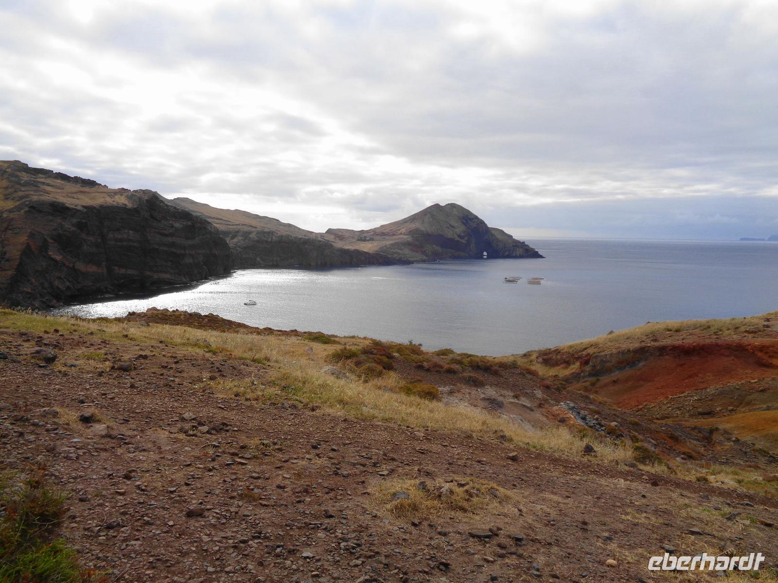 Nachdem wir uns alle mit einem kleinen Picknick für die Wanderung eingedeckt hatten, fuhr uns unser Bus zum Einstieg der heutigen Wanderung, einem Parkplatz über der Abra-Bucht am Ostkap der Insel. Die Ponta de São Lourenço ist mit einer Länge von 9 km und einer Breite von 2 km eine einzigartige Landschaft, die hinter Caniçal beginnt. 1982 wurde dieses Gebiet mit dem Ziel der Erhaltung seiner Fauna, Flora und des geologischen Erbes zum Naturreservat erklärt. Die karge, wüstenähnliche Landschaft steht im krassen Gegensatz zu den fruchtbaren, subtropischen Wäldern und Anpflanzungen in anderen Teilen der Insel oder gar dem wasserreichen Rabaçal. Der Ostzipfel Madeiras ist karg, felsig und rau. Hier weht immer Wind und die Regenwolken finden keinen Halt, um sich abzuregnen. Dementsprechend ist die Vegetation karg: niedrige Kiefern, Disteln und Eisenkraut. In der Nähe lebt auch eine kleine Kolonie von Seelöwen.