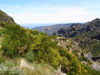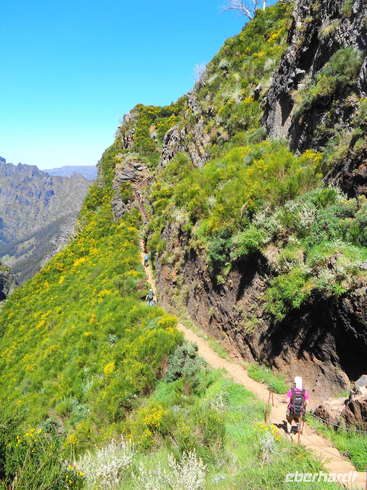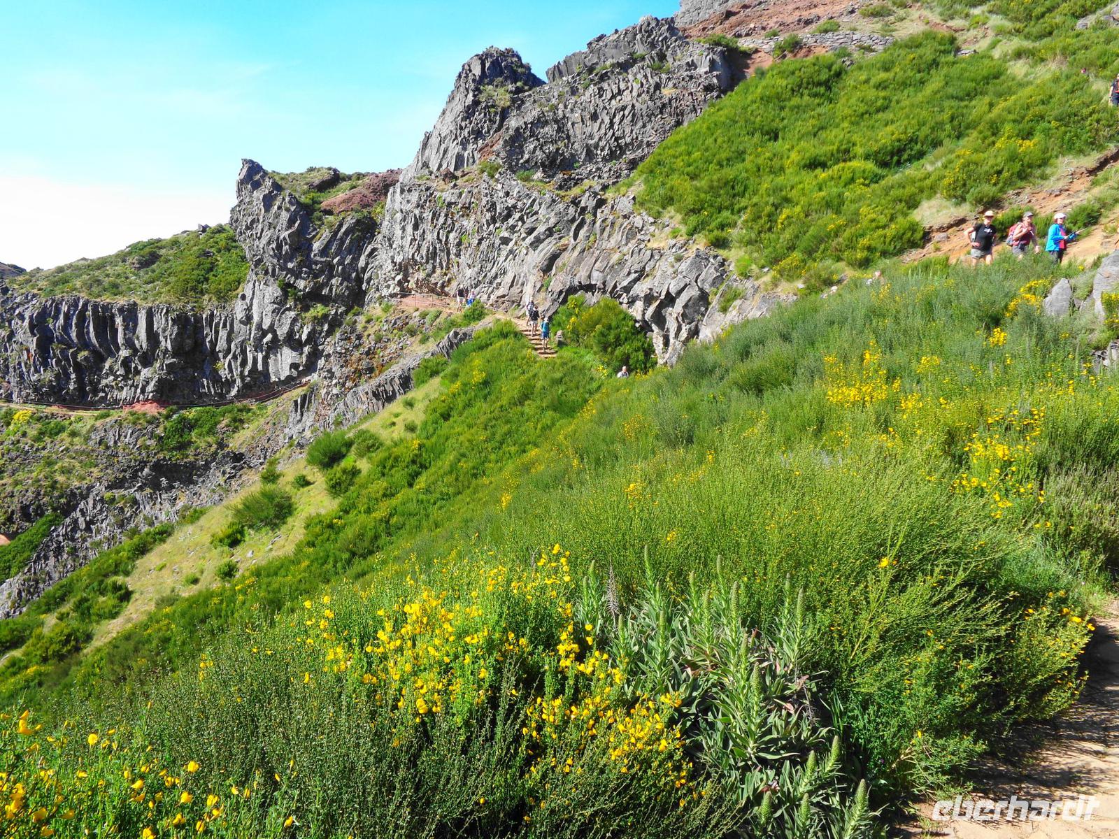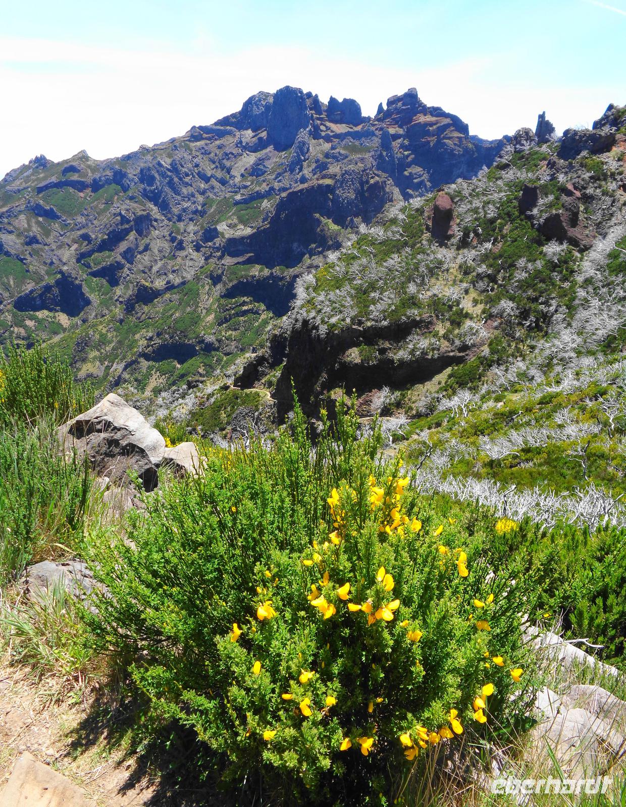 Wir genossen zunächst ausgiebig die tolle Rundumsicht auf dem Pico do Arieiro. Auf mehr oder weniger schmalen Pfaden wanderten wir dann im steten Auf und Ab dem weithin sichtbaren Ziel, dem Pico Ruivo, entgegen. Passagen, die in der Steilwand verlaufen, etwas ausgesetzt sind und Schwindelfreiheit erfordern, sind gut mit Drahtseilen abgesichert. Teile des Weges sind recht mühevoll, da man immer wieder steile Steinstufen erklimmen muss, aber die atemberaubenden Panoramablicke auf die umliegenden Bergkämme und die Nordküste machten alle Mühen vergessen. Es müssen auch mehrere Tunnel durchquert werden, für die sich die Mitnahme einer Taschenlampe empfiehlt. Nach ca. 3 Stunden kamen wir etwas erschöpft an der Hütte unterhalb des Pico Ruivo an. Sie ist bewirtschaftet und war lebhaft frequentiert. Die meisten Gäste gingen noch die letzte ¼ Stunde hinauf zum Gipfel, um die atemberaubende Rundumsicht zu genießen. Nach einer ausgiebigen Rast machten wir uns auf den Abstieg nach Achada do Teixeira. Ein breiter, bequemer Plattenweg führt durch den herrlich gelb blühenden Ginster zum Parkplatz, wo uns unser Bus erwartete. Schön, dass uns somit der Rückweg auf derselben Strecke erspart blieb.