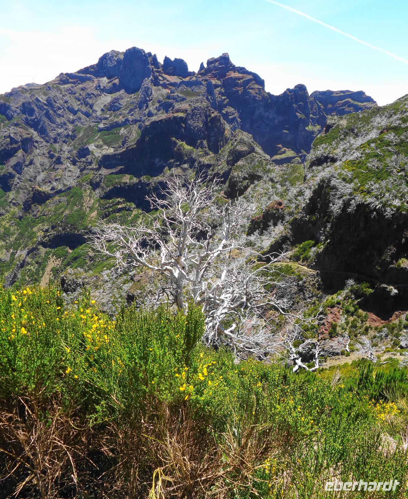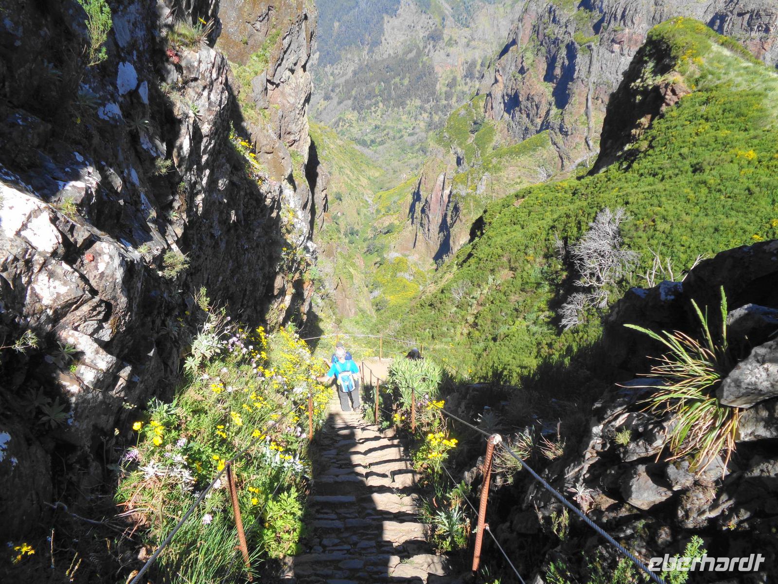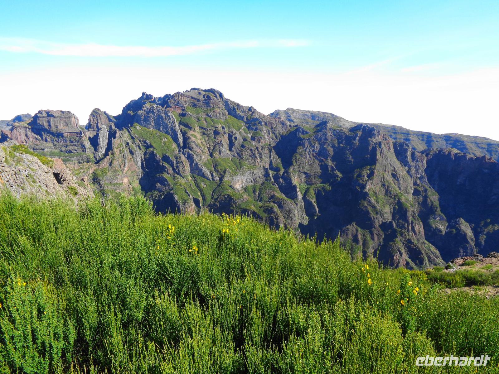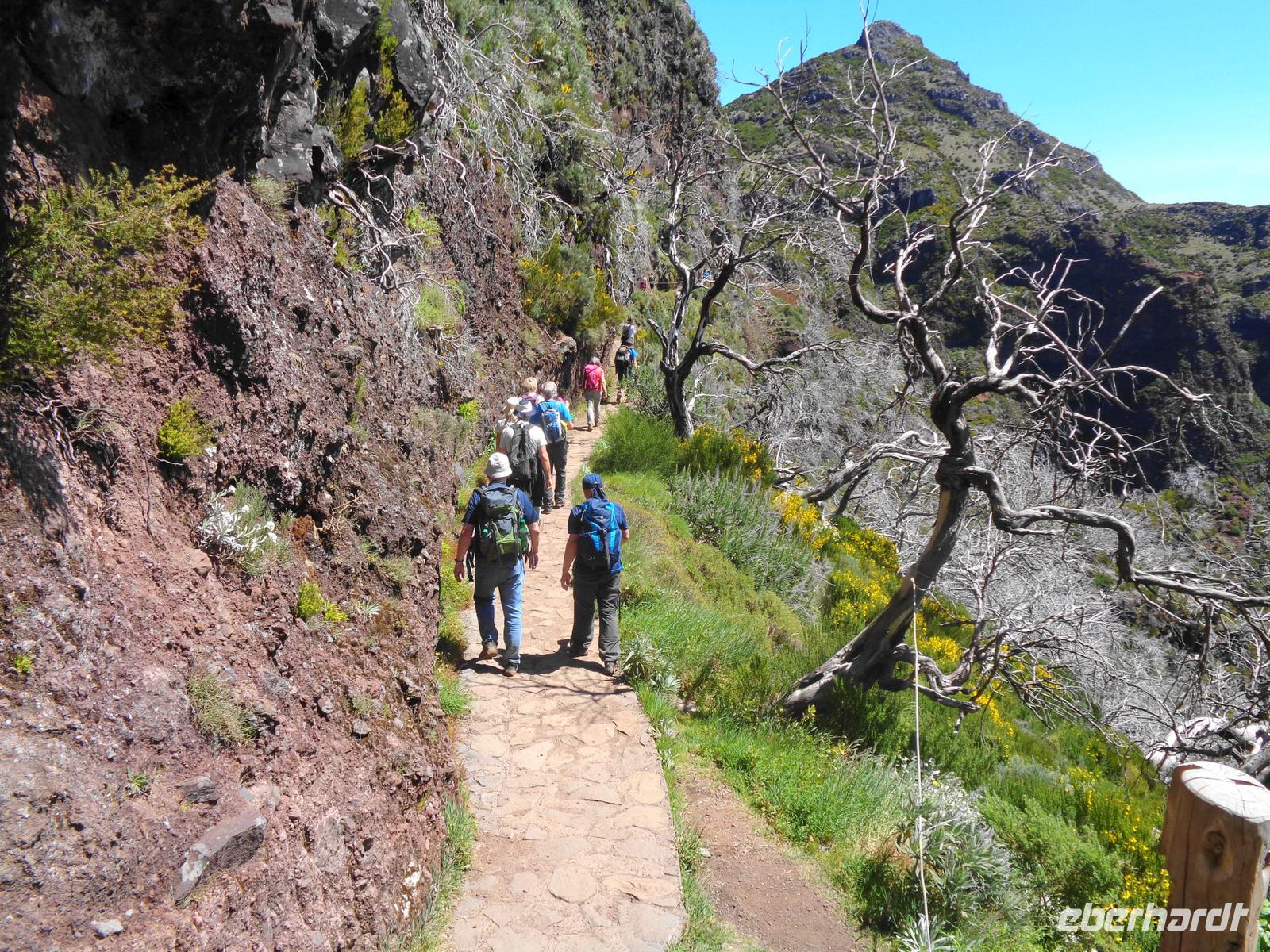 Wir genossen zunächst ausgiebig die tolle Rundumsicht auf dem Pico do Arieiro. Auf mehr oder weniger schmalen Pfaden wanderten wir dann im steten Auf und Ab dem weithin sichtbaren Ziel, dem Pico Ruivo, entgegen. Passagen, die in der Steilwand verlaufen, etwas ausgesetzt sind und Schwindelfreiheit erfordern, sind gut mit Drahtseilen abgesichert. Teile des Weges sind recht mühevoll, da man immer wieder steile Steinstufen erklimmen muss, aber die atemberaubenden Panoramablicke auf die umliegenden Bergkämme und die Nordküste machten alle Mühen vergessen. Es müssen auch mehrere Tunnel durchquert werden, für die sich die Mitnahme einer Taschenlampe empfiehlt. Nach ca. 3 Stunden kamen wir etwas erschöpft an der Hütte unterhalb des Pico Ruivo an. Sie ist bewirtschaftet und war lebhaft frequentiert. Die meisten Gäste gingen noch die letzte ¼ Stunde hinauf zum Gipfel, um die atemberaubende Rundumsicht zu genießen. Nach einer ausgiebigen Rast machten wir uns auf den Abstieg nach Achada do Teixeira. Ein breiter, bequemer Plattenweg führt durch den herrlich gelb blühenden Ginster zum Parkplatz, wo uns unser Bus erwartete. Schön, dass uns somit der Rückweg auf derselben Strecke erspart blieb.