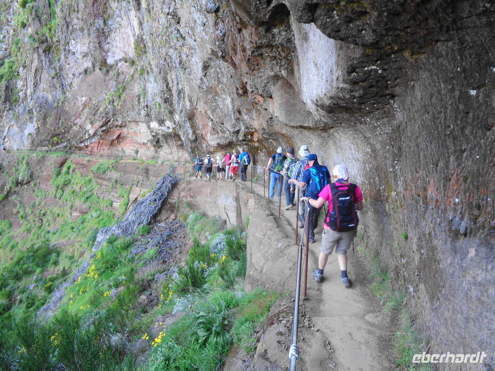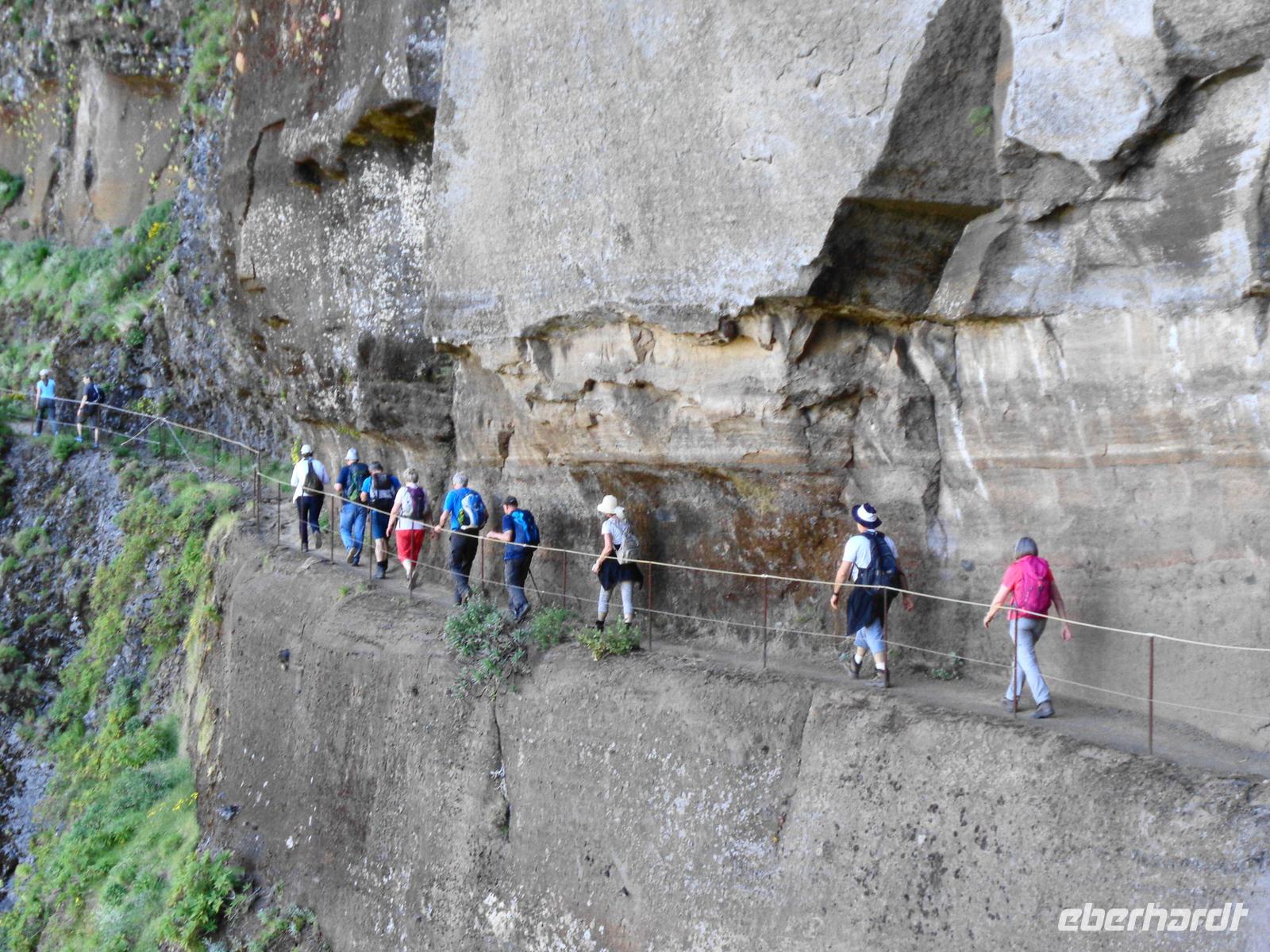 Gut ausgeruht von der anstrengenden Anreise starteten wir heute voller Erwartung zu unserer ersten Levada-Wanderung. Levadas wurden bereits im 15. Jh. gebaut, um das lebenswichtige Wasser aus dem regenreichen Norden und dem Zentrum der Insel zu den Feldern und Ansiedlungen im Südteil zu leiten, der weit weniger Niederschläge aufweist. Im Rabaçal, dem Gebiet unserer heutigen Wanderung, befinden sich große natürliche Wasserreservoirs, die durch ein weitverzweigtes Levada-System erschlossen wurden. Die Levadas wurden über die Jahrhunderte in zum Teil steil abfallendem Gelände und unter Verlust vieler Menschleben in die unwegsame Natur geschlagen und bestehen aus dem eigentlichen Wasserkanal, der Begrenzungsmauer und dem Wartungsweg. Sie sind heute überaus beliebt als Wanderwege für Touristen und gewähren Zugang zu Gebieten, in die man mit Fahrzeugen nie vordringen könnte.