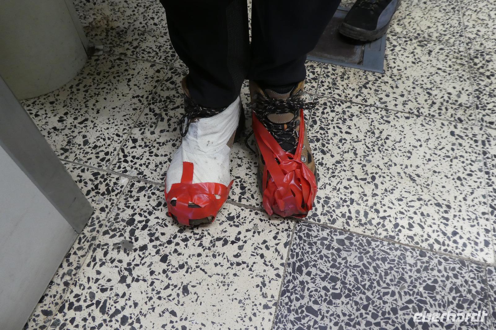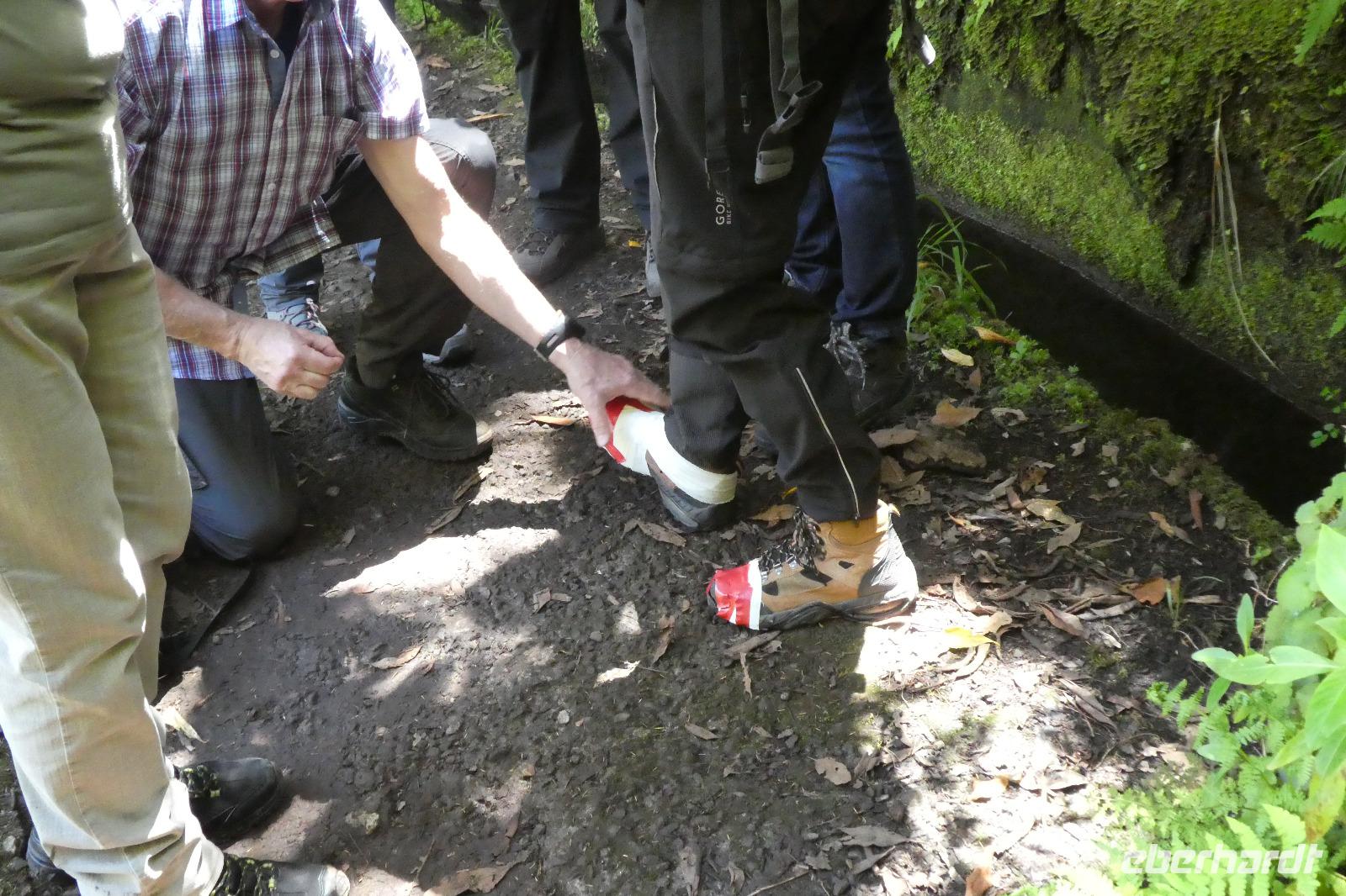 Auf dem Rückweg versagte ein Paar Wanderschuhe seiner Trägerin den Dienst: zunächst löste sich eine Sohle ab. Nachdem diese aufwändig mit Mullbinde und Klebeband fixiert worden war, traf es auch die zweite. Auch diese konnte „verarztet" werden und die Dame konnte die Wanderung bis zum Ende fortsetzen.