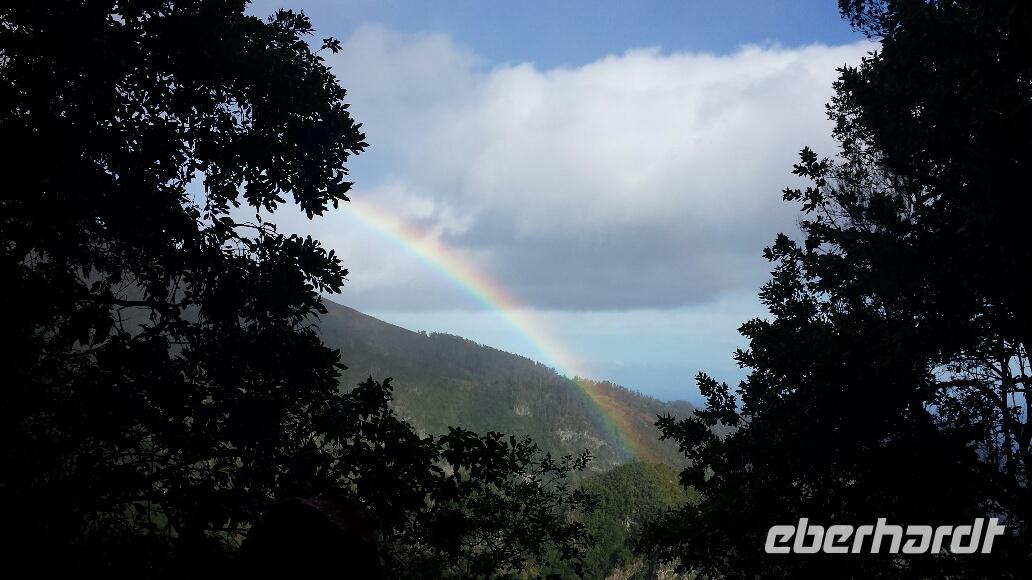 Heute haben wir wieder einen tollen Tag vor uns. Wir erkunden den Nordosten Madeiras. Zunächst möchten wir zum Pico do Areiro, aber Petrus ist irgendwie ein wenig verstimmt und öffnet seine Schleusen hoch oben im Gebirge, so dass wir vor Regen und ein wenig Nebel nicht wirklich viel vom tollen Bergpanorama sehen. Aber da kennt er uns schlecht, wenn wir uns dadurch die Laune verderben lassen. Wir ziehen einfach weiter und stoppen in Ribeiro frio und begeben uns mit denen, die Lust haben, auf eine kurze Levada Wanderung zum Aussichtspunkt Balcoes. Gut geschützt durch unsere Kleidung und die Bäume von oben, wandern wir fast trockenen Fußes und werden von einem herrlichen Regenbogen empfangen. Nach diesem schönen Spaziergang geht es weiter zum Guindaste-Aussichtspunkt, wo wir tolle Bilder von der Küste schießen und das Farbenspiel aus Wolken, Sonne und Meer genießen. Weiter geht's, Santana wartet. Wir staunen über die liebevoll gedeckten Häuschen und es entstehen unzählige Fotos. Nach einem köstlichen Mittagessen und schönem Aufenthalt schlendern wir im Anschluss durch Porto do Cruz am Meer entlang. Herrlich die milden Temperaturen und die Sonne lässt sich auch wieder blicken. Abschließend halten wir noch am Pico do Facho und es entstehen schöne Aufnahmen der unzähligen blühenden Baumaloen. Hier sehen wir auch die besondere Landebahn des Flughafens von Madeira, der uns schon an die morgen bevorstehende Abreise erinnert. Ach du schönes Madeira, so wirklich gerne wollen wir eigentlich nicht nach Hause! Abschließend kann man jedoch sicher sagen, dass es eine tolle Woche war mit einer sehr netten Reisegruppe. Ein besonderer Dank an all unsere Gäste für die Freundlichkeit, die täglich nette Stimmung und die vielen gemeinsamen Erlebnisse. Wir waren bei unserer Reiseleitung Fatima sehr gut aufgehoben, die uns mit ihrer herzlichen Art, ihrem fundierten Wissen und exzellenten Deutschkenntnissen einen wunderbaren Eindruck über Madeira vermittelt hat. Möge ihr für uns vorgetragenes „Touristen-Gebet" zu Hause erhört worden sein! ? Dazu unser sehr besonnener Busfahrer Mauro, bei dem wir uns stets sicher an Bord fühlten und der uns all die Tage wunderbar über die Insel gefahren hat. Nun endet eine wunderschöne Zeit mit Jahreswechsel auf der Blumeninsel Madeira. Sicher kommen wir gerne nochmals wieder.