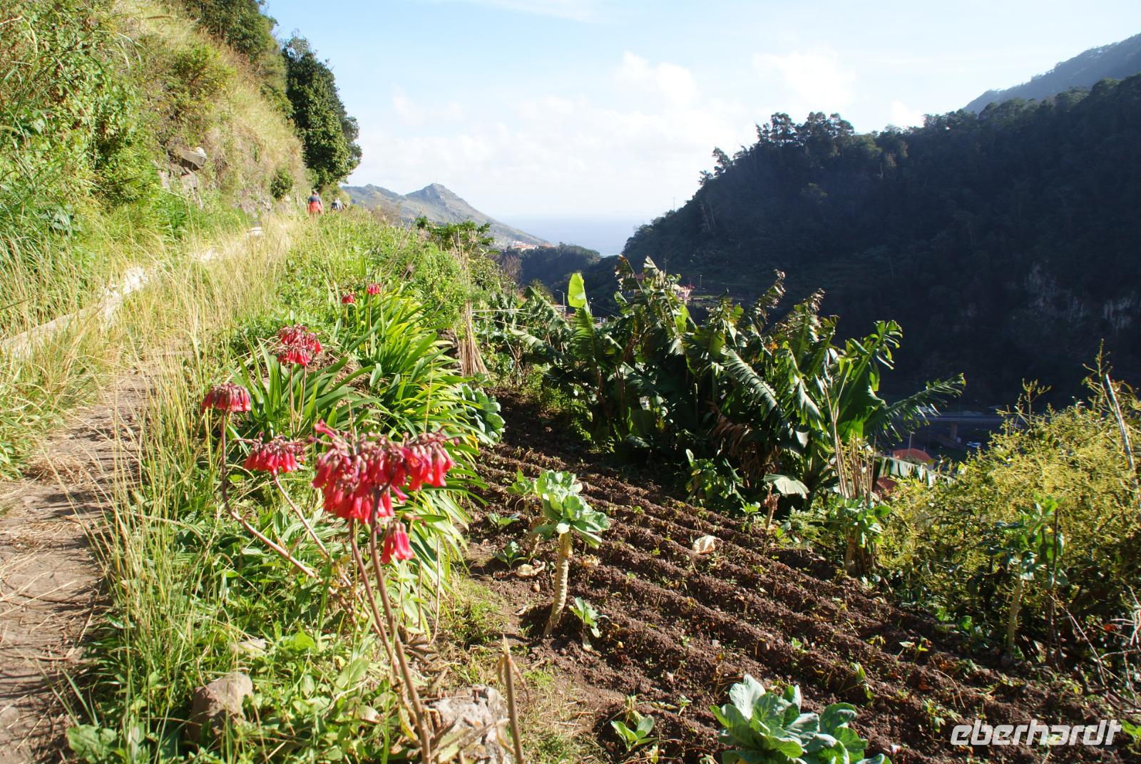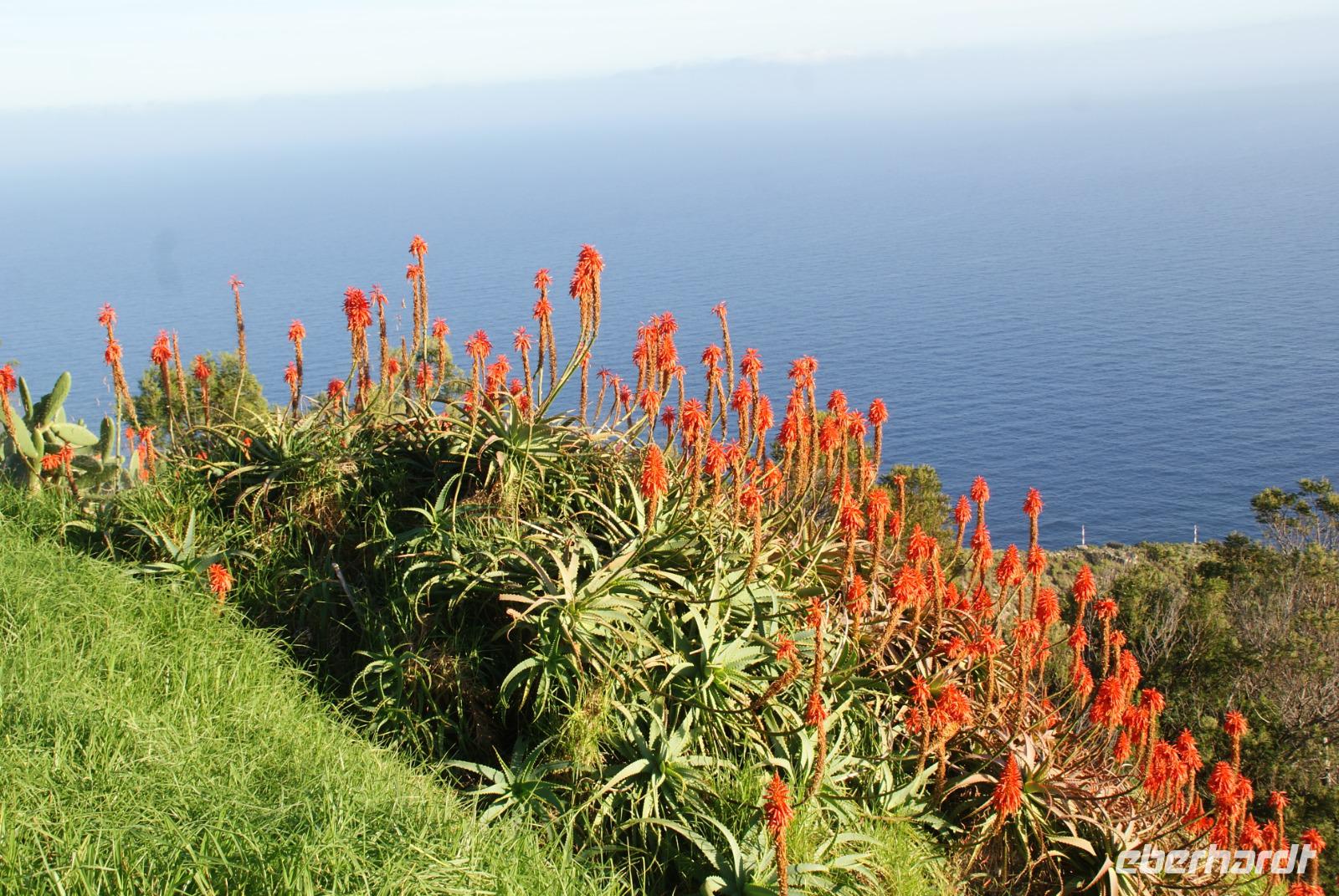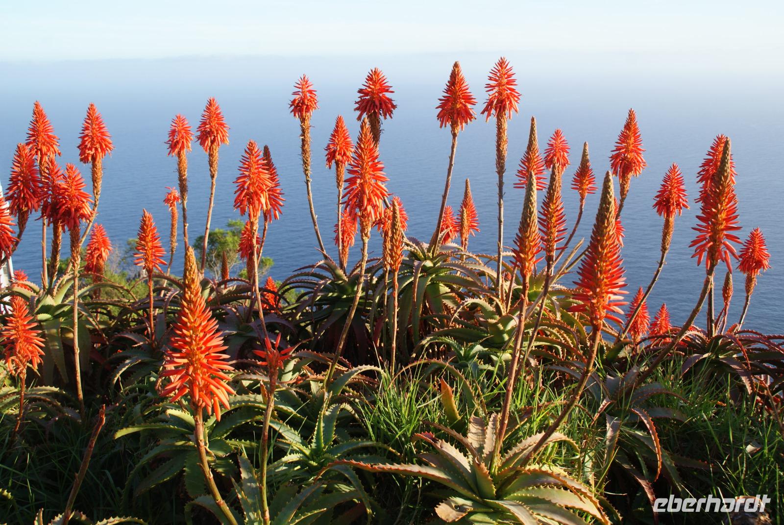 Welch ein Tag! Schon früh am Morgen lacht die Sonne bei milden Temperaturen, die sich im Laufe des Tages bis auf 24 Grad hinaufschrauben...Nach einem köstlichen Frühstück mit frisch gebackenem Brot starten wir die heutige Tour in den Nordosten der Insel mit unserer Reiseleiterin Fatima und Busfahrer Bruno. Unser erstes Ziel ist Pico do Ariero, der dritt höchste Berg der Insel Madeira. Von der Küste aus begeben wir uns durch vier Vegetationsstufen und starten von tropisch und subtropisch bis hin zur alpinen Vegetation in luftiger Höhe, wo dann nur noch Pflanzen wachsen, die die Kälte vertragen können wie beispielsweise Stechginster, Heidelbeeren, etc. Angekommen auf 1818m Höhe haben wir eine herrliche Fernsicht über die komplette Insel, die von West nach Ost 57 Km und von Nord nach Süd 23 Km breit ist. So sehen wir unter anderem die Hochebene von Paul da Serra und können bis Funchal hinab sehen. Ideales Bergwetter, dazu ein leichter Wind und auch hier oben angenehm milde Temperaturen. Der weitere Vormittag führt uns nach Ribeiro frio, dem kalten Bach, wo wir uns zunächst die Forellenzucht anschauen und uns anschließend auf unsere erste Levadawanderung begeben. Levadas sind die bekannten Bewässerungskanäle, die die Insel umsäumen und insbesondere den trockeneren Süden mit reichlich Wasser versorgen. Am Aussichtspunkt Balcoes haben wir zum einen den herrlichen Blick auf die umliegende Bergwelt und auch die possierlichen Madeira Buchfinken ziehen uns in ihren Bann, erfreuen sich über unser mitgebrachtes Vogelfutter. Wieder im Tal angekommen, fahren wir weiter Richtung Küste. Links und rechts des Weges sehen wir Avocadobäume, Papayapflanzen, Bananen, Baumtomaten, Kaffeesträucher und die sogenannte Cherimoya, auch Zuckerapfel genannt. Unser Mittagsziel ist Santana mit seinen für Madeira bekannten strohgedeckten Häusern, wo wir zum ersten Mal den berühmten schwarzen Degenfisch, den Espada, testen. Nach einem reichhaltigen Mahl entstehen herrliche Aufnahmen mit den bunten Häusern, die rund um das Rathaus stehen. Wie wir von Fatima erfahren, leben in Santana noch rund zwanzig Familien auf diese traditionelle Art und Weise und wir hören, dass ein solches Strohdach alle vier Jahre erneuert werden muss und der Austausch ca. 2000 € kostet. Trotz allem eine bescheidene Art des Wohnens, denn Platz ist wenig, so dass sich Küche und Badezimmer außerhalb des Hauses befinden. Nach einem Fotostopp mit Blick auf Faial und sogar die Ostspitze der Insel spazieren wir gemütlich am Meer entlang, besichtigen in Porto da Cruz eine Zuckerrohrfabrik und genießen auf Einladung von Eberhardt TRAVEL eine leckere Poncha. Diese Spezialität Madeiras besteht auf Zuckerrohrschnaps, Zitrone, Orangen-oder Maracujasaft und Honig und ist einfach nur lecker. Bevor wir nach Funchal zurückkehren stoppen wir nochmals am Pico do Facho, von wo wir einen schönen Blick auf die Südseite Madeiras und den Flughafen mit der besonderen Landebahn haben. Wie wir hören, war diese einst nur 1600 m lang, wurde jedoch nach und nach verlängert und misst seit dem Jahr 1986 bereits 2800 m. Zurück in der Hauptstadt Madeiras, die übersetzt „Fenchel" (Funchal) bedeutet, genießen wir das heutigen Themenbuffet „Fisherman's Night" und erfreuen uns an den vielen Köstlichkeiten. Beim anschließenden Folkloreabend in der Hotelbar unterhält uns eine einheimische Gruppe auf das Beste und abschließend schwingen wir alle gemeinsam das Tanzbein.