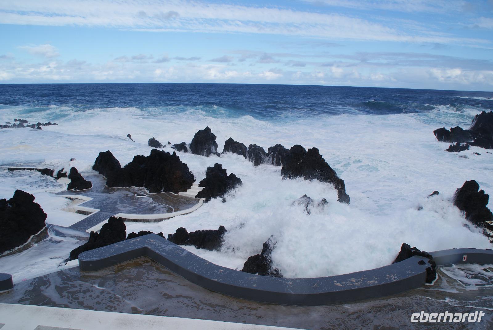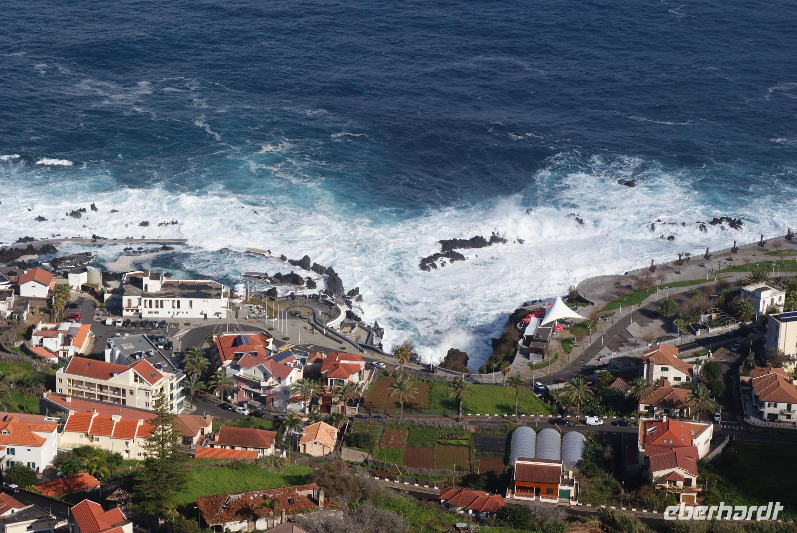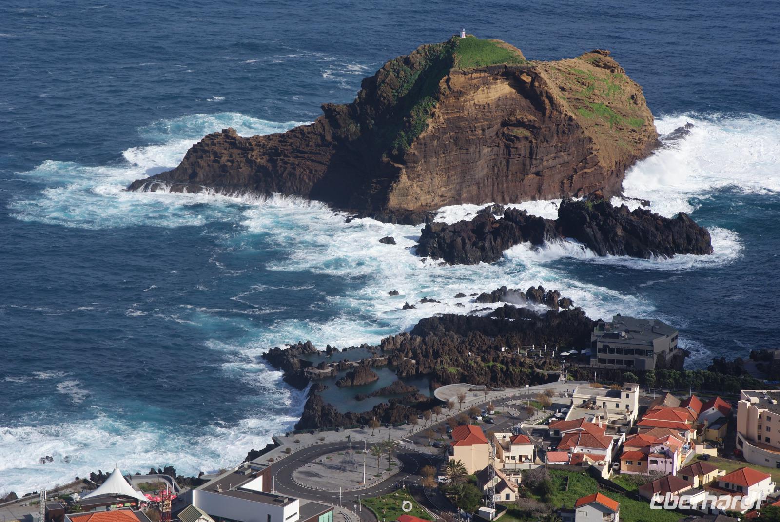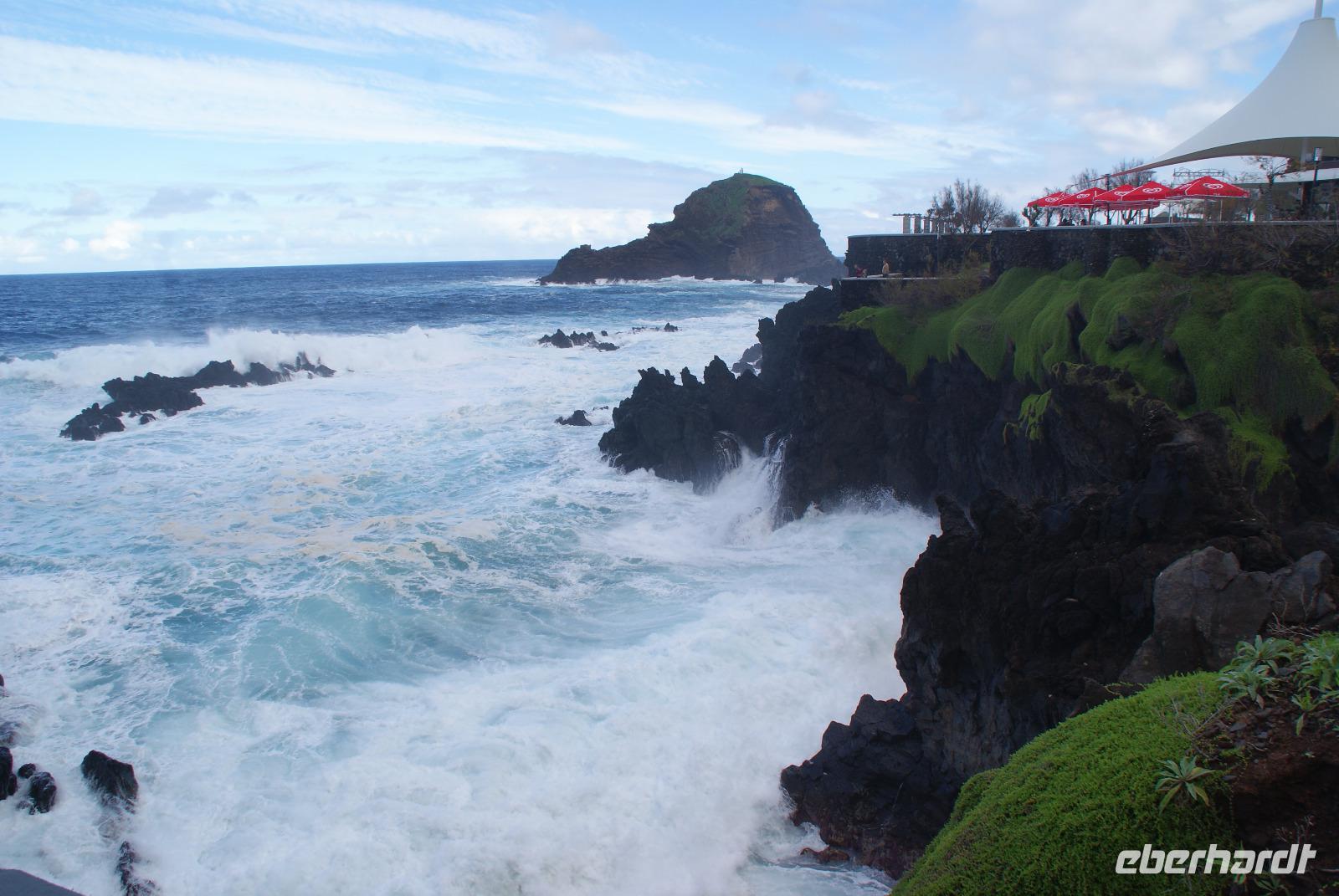 Der Wettergott meint es erneut gut mit uns...gut gefrühstückt starten wir über die alte Panoramastraße Richtung Ribeira Brava (dem wilden Bach) und lassen aus luftiger Höhe die Eindrücke von Landschaft und Meer auf uns wirken. Fatima berichtet von den Spezialitäten der Insel wie die der Nikita, bestehend aus einheimischem Bier (Curral), Weißwein und Ananassaft, die Poncha haben wir ja bereits kennengelernt. Vorbei an vielen einheimischen Häusern wird erklärt, dass die Tontauben auf den Dächern symbolisch für den heiligen Geist und die Tonköpfe Engel symbolisieren. Beides soll Glück bringen und die Häuser schützen. In Ribeira Brava direkt am Meer liegend angekommen, schauen wir uns die Heilige Benediktinerkirche aus dem 15. Jahrhundert an und schlendern ein wenig durch die kleinen Gassen bevor wir uns zur Auffahrt zum auf 1007m hochgelegenen Encumeada Pass begeben. Oben angekommen haben wir bei Traumwetter einen zeitgleichen Ausblick auf die Nord-und Südseite der Insel. Einfach phantastisch und wie fast überall in den letzten Tagen, sind wir auch hier beinahe alleine unterwegs und können ungestört genießen. Wenig später erreichen wir die Hochebene Paúl da Serra auf 1500m und halten für einen weiteren Fotostopp. Herrliche Bergsicht, Sonnenschein, milde Temperaturen verleiten hier viele Wanderer, die umliegenden Wanderwege zu erkunden. Hier ist auch Start der berühmten Levadawanderung von Rabacal der „25 Quellen". Unser Mittagsziel ist der bekannte Küstenort Porto Moniz, der für seine Naturschwimmbecken mit Meerwasser gefüllt berühmt ist. Oberhalb halten wir zum Fotostopp und sehen einen herrlichen Regenbogen, der sich über dem Meer formiert hat. Nach einem leckeren Mittagessen im Restaurant Polo Norte bleibt noch genügend Zeit, das heutige Wellenspektakel zu bestaunen. Bedingt durch den heutigen Seegang sind die aus Lavagestein geformten Schwimmbecken aus Sicherheitsgründen geschlossen. Nichtsdestotrotz genießen wir das Naturschauspiel in vollen Zügen, welches sogar noch Anlass zur Taufe gibt ...! Wir ziehen weiter und fahren durch den beschaulichen Ort Seixal, der ebenfalls direkt oberhalb des Meeres liegt. Ein schöner Fotostopp erfolgt nun am Brautschleierwasserfall mit wunderschöner Kulisse der abfallenden Felsen der Nordseite der Insel und so mancher Schwanenhalsagave als Fotomotiv. Unser letzter Halt führt uns in das nahegelegene Bergdörfchen Sao Vincente, wo wir auch der aus dem 17. Jahrhundert stammenden Kirche „Igreja Matriz de Sao Vincente" einen Besuch abstatten. Noch schnell einen „Cafézinho" und wir treten die Rückfahrt nach Funchal an. Den heutigen Ausflug möchten wir sicherlich nicht missen und haben nun auch den Nordwesten Madeiras kennengelernt.
