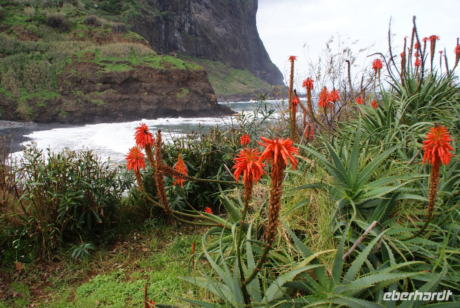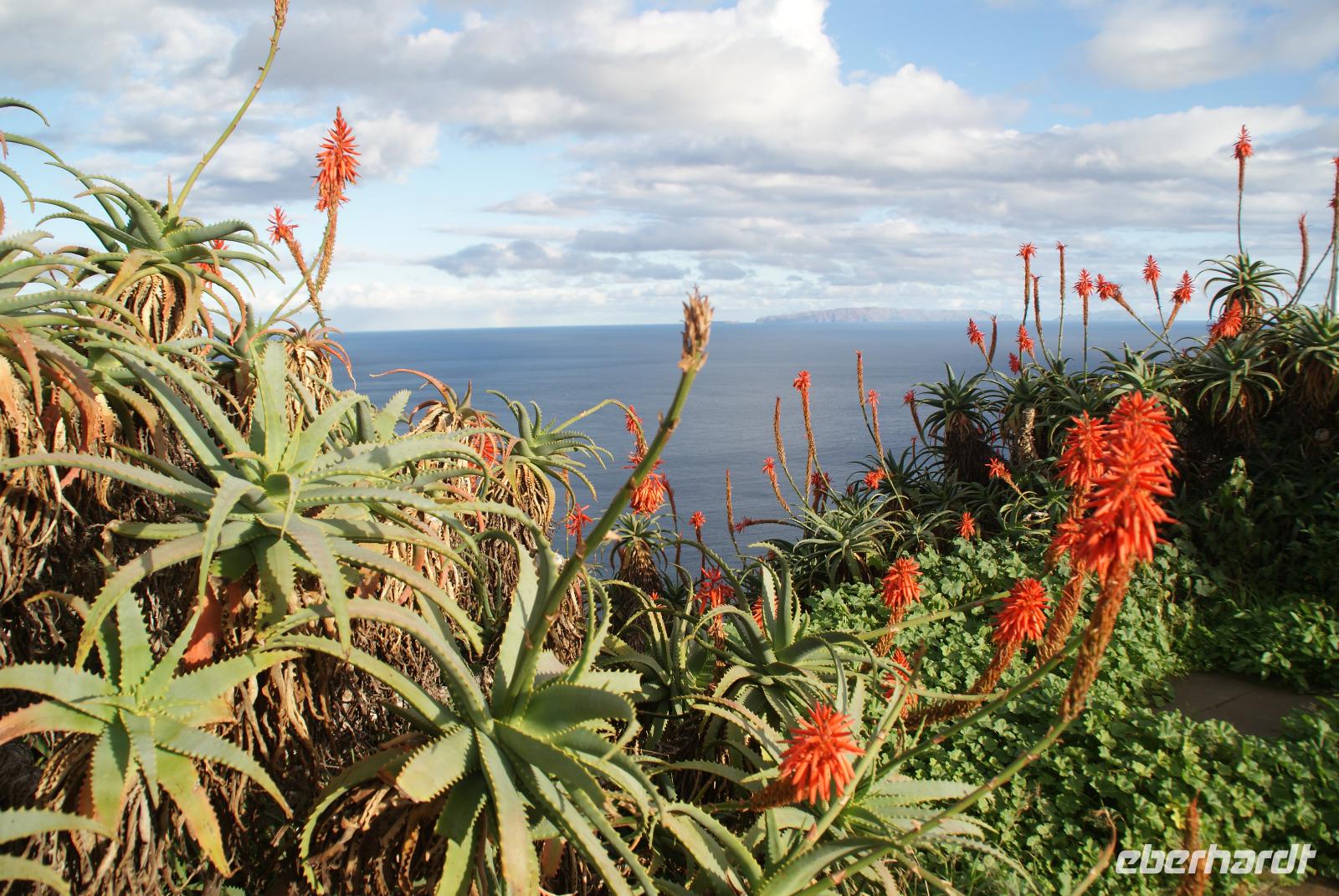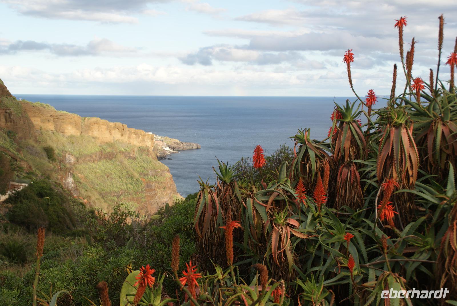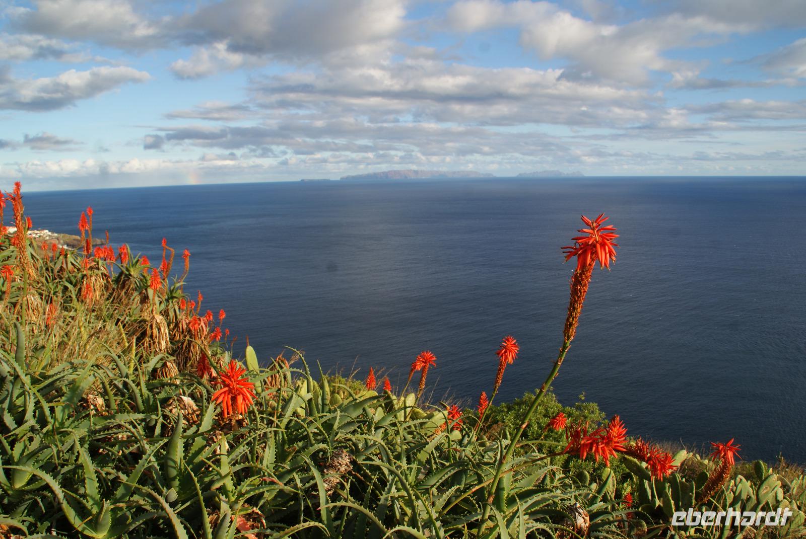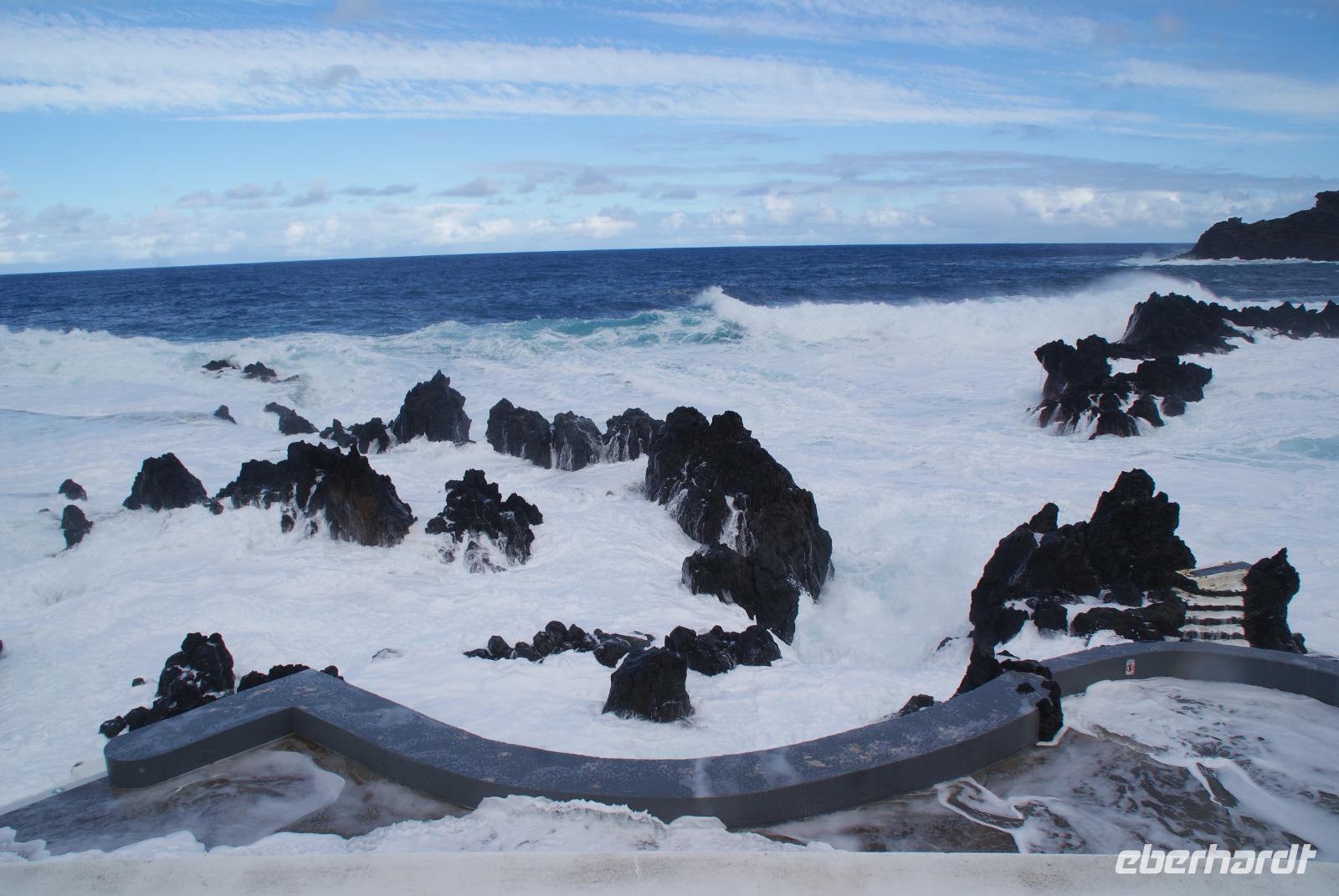 Der Wettergott meint es erneut gut mit uns...gut gefrühstückt starten wir über die alte Panoramastraße Richtung Ribeira Brava (dem wilden Bach) und lassen aus luftiger Höhe die Eindrücke von Landschaft und Meer auf uns wirken. Fatima berichtet von den Spezialitäten der Insel wie die der Nikita, bestehend aus einheimischem Bier (Curral), Weißwein und Ananassaft, die Poncha haben wir ja bereits kennengelernt. Vorbei an vielen einheimischen Häusern wird erklärt, dass die Tontauben auf den Dächern symbolisch für den heiligen Geist und die Tonköpfe Engel symbolisieren. Beides soll Glück bringen und die Häuser schützen. In Ribeira Brava direkt am Meer liegend angekommen, schauen wir uns die Heilige Benediktinerkirche aus dem 15. Jahrhundert an und schlendern ein wenig durch die kleinen Gassen bevor wir uns zur Auffahrt zum auf 1007m hochgelegenen Encumeada Pass begeben. Oben angekommen haben wir bei Traumwetter einen zeitgleichen Ausblick auf die Nord-und Südseite der Insel. Einfach phantastisch und wie fast überall in den letzten Tagen, sind wir auch hier beinahe alleine unterwegs und können ungestört genießen. Wenig später erreichen wir die Hochebene Paúl da Serra auf 1500m und halten für einen weiteren Fotostopp. Herrliche Bergsicht, Sonnenschein, milde Temperaturen verleiten hier viele Wanderer, die umliegenden Wanderwege zu erkunden. Hier ist auch Start der berühmten Levadawanderung von Rabacal der „25 Quellen". Unser Mittagsziel ist der bekannte Küstenort Porto Moniz, der für seine Naturschwimmbecken mit Meerwasser gefüllt berühmt ist. Oberhalb halten wir zum Fotostopp und sehen einen herrlichen Regenbogen, der sich über dem Meer formiert hat. Nach einem leckeren Mittagessen im Restaurant Polo Norte bleibt noch genügend Zeit, das heutige Wellenspektakel zu bestaunen. Bedingt durch den heutigen Seegang sind die aus Lavagestein geformten Schwimmbecken aus Sicherheitsgründen geschlossen. Nichtsdestotrotz genießen wir das Naturschauspiel in vollen Zügen, welches sogar noch Anlass zur Taufe gibt ...! Wir ziehen weiter und fahren durch den beschaulichen Ort Seixal, der ebenfalls direkt oberhalb des Meeres liegt. Ein schöner Fotostopp erfolgt nun am Brautschleierwasserfall mit wunderschöner Kulisse der abfallenden Felsen der Nordseite der Insel und so mancher Schwanenhalsagave als Fotomotiv. Unser letzter Halt führt uns in das nahegelegene Bergdörfchen Sao Vincente, wo wir auch der aus dem 17. Jahrhundert stammenden Kirche „Igreja Matriz de Sao Vincente" einen Besuch abstatten. Noch schnell einen „Cafézinho" und wir treten die Rückfahrt nach Funchal an. Den heutigen Ausflug möchten wir sicherlich nicht missen und haben nun auch den Nordwesten Madeiras kennengelernt.
