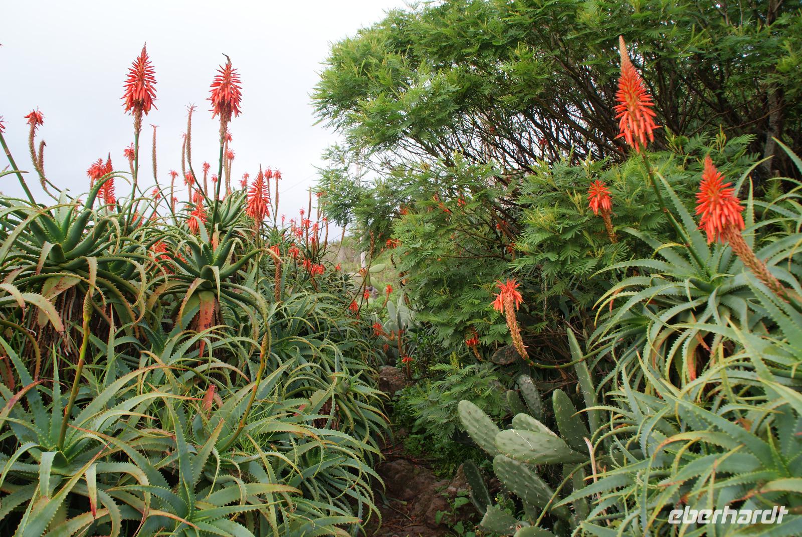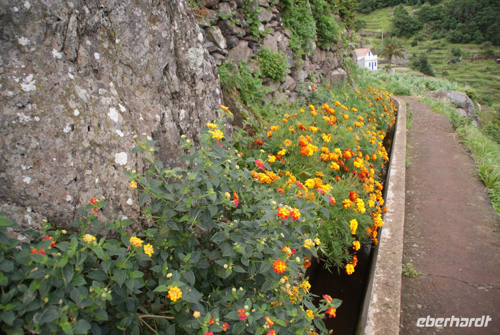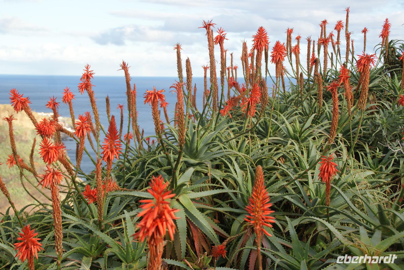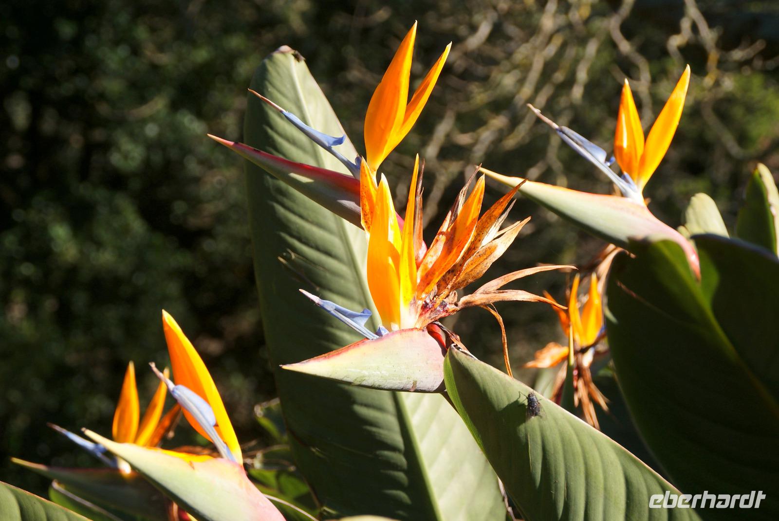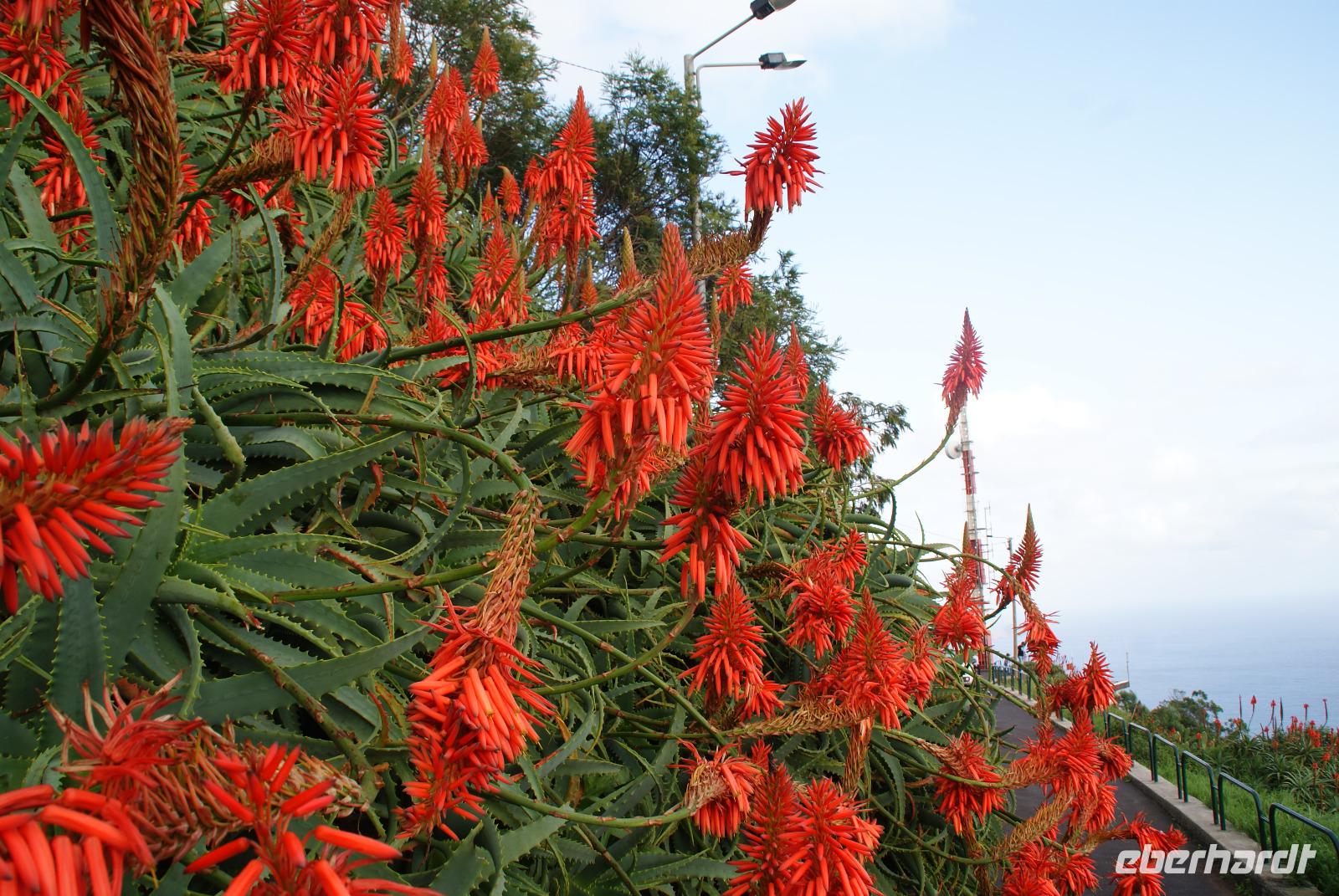 Geschlafen wie die Steine treffen wir uns zum leckeren Frühstück wieder. Unser erster Programmpunkt nach Abfahrt mit Fatima und Humberto ist der Pico do Ariero, der mit 1818 m dritt höchste Berg der Insel Madeira. Wir erhoffen uns ein schönes Panorama über die Insel, die von West nach Ost 57 Km und von Nord nach Süd 22 Km misst. Entlang unserer Strecke auf dem Weg nach oben bis auf luftige 1810m sehen wir schon die ersten Afrikanischen Tulpenbäume sowie Kapokbäume, auch Seidenwollbäume genannt werden. Deren Früchte wurden einst für Kopfkissen und Matratzen verwendet. Schöne Baumaloen, die hier auch Weihnachtskerzen genannt werden säumen den Wegesrand. Strelitzien dürfen natürlich auch nicht fehlen, die zu Ehren der britischen Königin Sophie Charlotte, einer geborenen Prinzessin von Mecklenburg-Strelitz benannt wurden. Feuerranken oder Feuerbegonien leuchten uns orange entgegen und die Blumeninsel gibt sich schon jetzt die Ehre. Wir hören von Fatima, dass die Stadt Funchal von Funcho (Fenchel) kommt und vom einstigen Entdecker João Gonçalves Zarco entsprechend benannt wurde, der hier viel Fenchel vorfand. Unser Bus passiert Monte, wo sich auch die bekannte Wallfahrtskirche befindet und wo der letzte Kaiser von Österreich, Karl der 1. im Jahr 1922 im Exil gestorben ist. Je höher wir die Serpentinen nach oben nehmen umso mehr ändert sich die Vegetation. Auf dem Poiso Pass in nunmehr 1412m Höhe sehen wir Eukalyptus und Akazien sowie auch Heidelbeersträucher, die uns riesig groß erscheinen. Wie meint Fatima so schön? Auf Madeira wird alles groß-bis auf die Menschen und die Bananen...Auf dem Pico do Ariero angekommen, können wir etwas von der Fernsicht erahnen, die sich hier sonst bei gutem Wetter bietet. Wolken kommen und gehen in Windeseile und wir sehen einen Teil der wunderbaren Bergwelt um uns herum. Da es hier heute jedoch sehr windig und frisch ist, ziehen wir weiter in wieder tiefer gelegene Gefilde und steuern Ribeiro Frio (den kalten Bach) an. Hier besuchen wir zunächst die Forellenzuchtanlage und sehen die Exemplare von klein bis groß. Anschließend erfolgt unsere erste Levadawanderung mit Ziel der Aussichtsplattform Balcoes. Ein gemütlicher Spaziergang entlang einer der berühmten Bewässerungskanäle der Insel führt uns auch durch einen Lorbeerwald und es fühlt sich alles recht mystisch an. An Balcoes haben wir mit Sonne einen herrlichen Blick auf die Bergwelt und das unter uns liegende Tal. Hier erwarten uns bereits die possierlichen Madeira Buchfinken und wir halten ein bisschen Vogelfutter für sie bereit. Unser Mittagsziel erreichen wir im Anschluss in Santana, wo wir zunächst ein leckeres Mittagessen einnehmen, die einen kosten den schwarzen Degenfisch, Espada, der hier vorzugsweise mit Banane gegessen wird und auch den leckeren Bolo do Caco (Süßkartoffelbrot mit Knoblauchbutter) testen wir zum ersten Mal -einfach nur köstlich. Schöne Aufnahmen entstehen im Anschluss bei den berühmten strohgedeckten Bauernhäusern und wir genießen es, diese ohne viele andere Touristen in Ruhe anschauen zu können. Ein anschließender Spaziergang in Porto da Cruz erfolgt am Nachmittag und auch einen Blick in die Zuckerrohrfabrik lassen wir uns nicht nehmen. Bevor es nach Funchal zurück geht, halten wir noch am Pico do Facho, wo wir am Aussichtspunkt zum einen auf die Landebahn des Flughafens von Santa Cruz schauen und auch die Ostspitze der Insel in voller Größe sehen können. Abschließend fahren wir unter der Landebahn hindurch zurück nach Funchal. Ein ereignisreicher Ausflugstag liegt hinter uns. Wir lassen uns das Abendessen im Hotel schmecken und so mancher lauscht den Fadoklängen, die uns heute geboten werden.