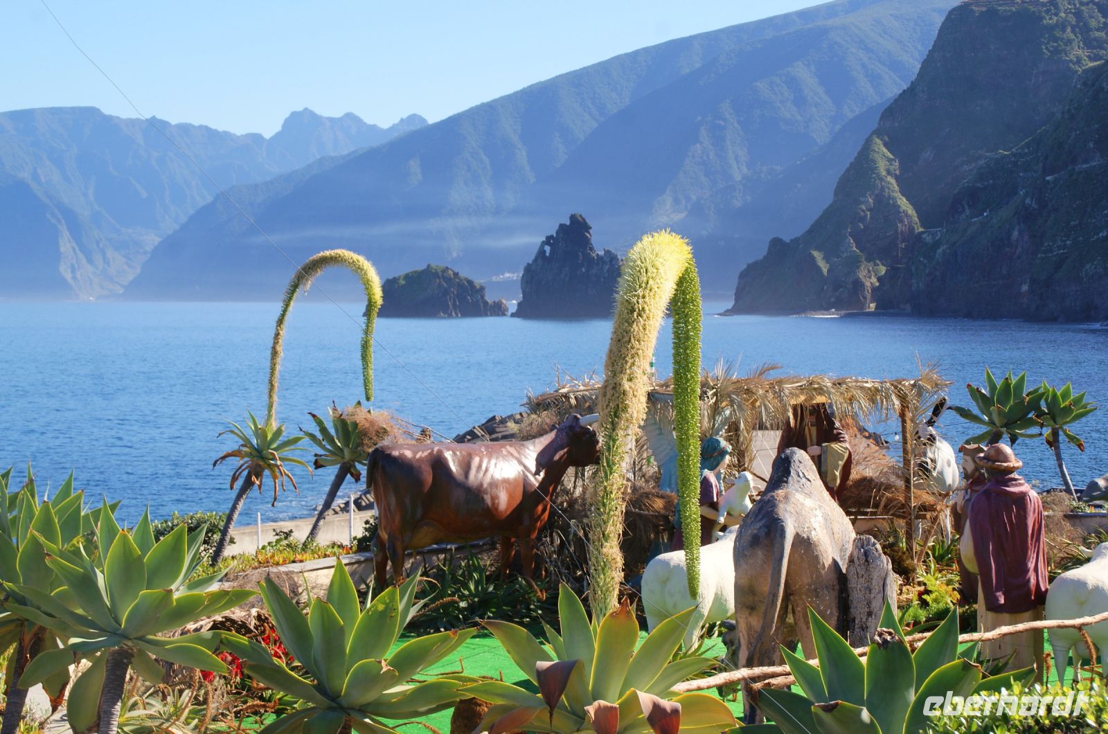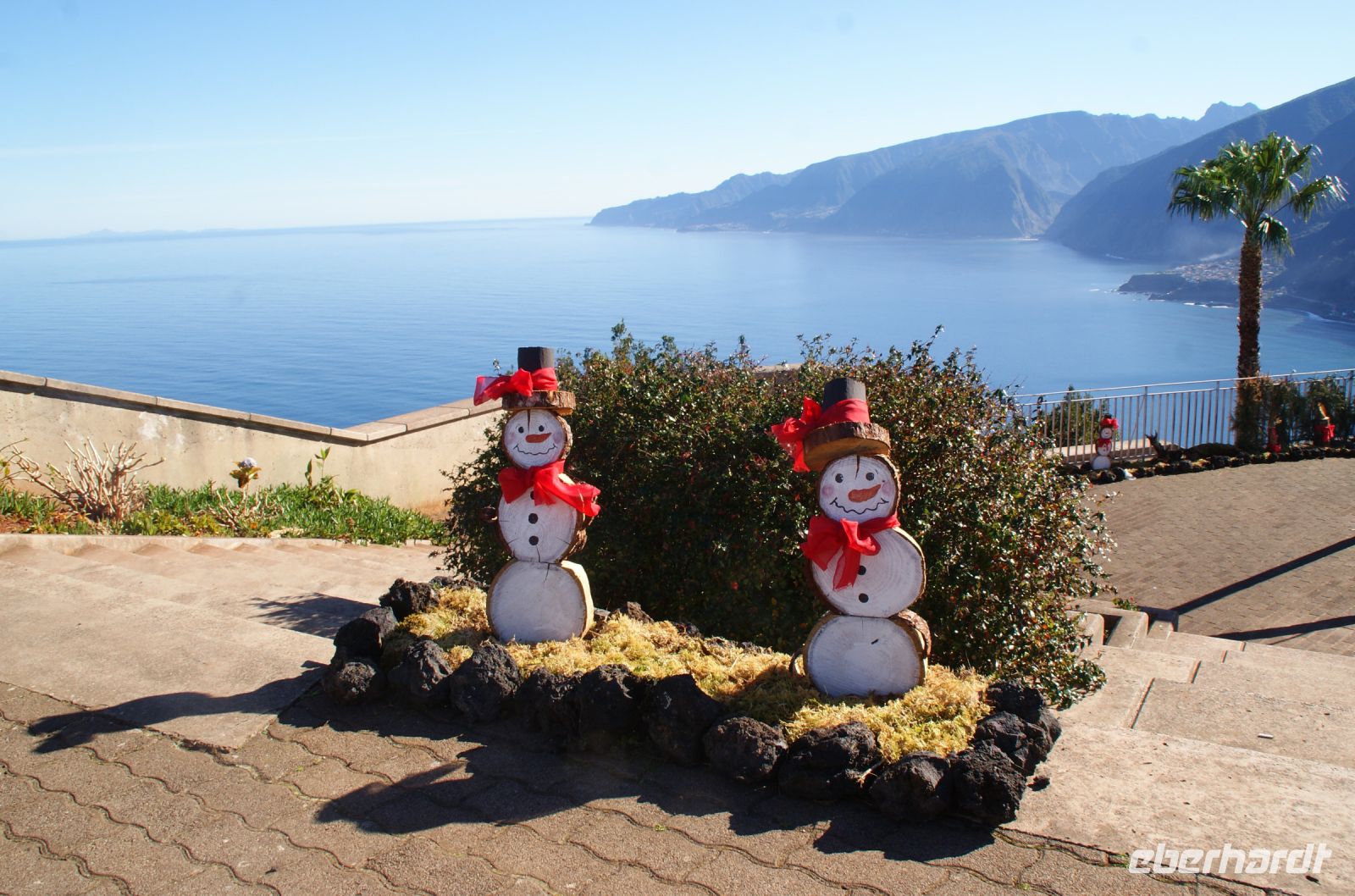Heute beginnt der letzte Tag unseres wunderschönen Madeira Aufenthalts. Der Tag steht zur freien Verfügung und so kann jeder entscheiden, wie er diesen genießen möchte. Die meisten von uns entscheiden sich für den optionalen Ausflug, um den Nordwesten der Insel kennenzulernen. Auch heute herrschen hierzu die allerbesten Wettervoraussetzungen und so genießen wir die Panoramastraße, die ca. 500 m oberhalb der Küste entlang führt. Kleine Ortschaften mit wunderschönen, gepflegten Häusern, Vorgärten mit den typischen Madeira Pflanzen ziehen an uns vorbei und erneut staunen wir über die Gelassenheit unseres Busfahrers Luis, der uns gemächlich entlang der engen Straßen fährt. Unseren ersten Halt machen wir, wieder an der Küste angekommen, in Ribeira Brava (dem wilden Bach) und spazieren hier am Meer entlang, schauen uns den Ort und die Barrockkirche des heiligen Benedict an. Auf vielen Dächern entdecken wir an den Ecken Tauben und Köpfe aus Ton, die als Glücksbringer und Schutz der Häuser fungieren. Die Tauben symbolisieren den Heiligen Geist und die Köpfe Engel. Im Anschluss geht es hinauf zum Encumeada Pass und schon bald befinden wir uns in 1007 m Höhe. An einem Aussichtspunkt und der heutigen besonders klaren Sicht können wir gleichzeitig die Nord-und Südseite der Insel sehen. Ein herrliches Bergpanorama bietet sich hier oben bei alpiner Vegetation mit viel Stechginster und oft auch teils mannshohen Erikasträuchern. Kurz darauf passieren wir die höchste Ebene der Insel, Paúl da Serra, welche auf 1500 m gelegen ist. Wir staunen nicht schlecht über diese riesige Fläche und auch ein paar grasende Kühe sind zu sehen, die sonst aufgrund der steilen Felder nur in Ställen gehalten werden. An der Nordküste angekommen haben wir einen erneut herrliches Panorama und bestaunen kurz darauf das sogenannte „Bachfenster“ Ribeira da Janela, eine Felsformation mit einem Loch in der Mitte, welches wie der afrikanische Kontinent aussieht. Unser Mittagsziel erreichen wir in Porto Moniz und nehmen hier ein frisches Bad in den sogenannten Naturschwimmbecken, für die der Ort berühmt wurde. Angenehme 23 Grad, dazu volle Sonne lässt viele ins kühle Nass abtauchen und dieses Naturschauspiel genießen. Wir fahren weiter die Nordküste entlang, passieren idyllische kleine Ortschaften und am sogenannten Brautschleierwasserfall entstehen nochmals herrliche Aufnahmen. Bevor wir nach Funchal zurückkehren, spazieren wir durch das kleine Bergdorf Sao Vincente und auch hier statten wir einer Barrockkirche einen Besuch ab. Vorbei an der Kapelle der heiligen Fatima fahren wir in die Hauptstadt zurück. Als Vorbereitung zu unserer Rückreise steht für uns alle noch ein Schnelltest an, den wir geduldig über uns ergehen lassen. Als Abschluss unserer wunderschönen Silvesterreise steht heute ein Abendessen in einem Panoramarestaurant oberhalb der Stadt auf dem Plan. So kehren wir in die Quinta Estacao ein, um den bekannten Rindfleischspieß „Espetada“ zu kosten, der mit typischen Beilagen wie beispielsweise Milho Frito (Art frittierte Maispolenta) und Salat serviert wird. Natürlich darf hier vorweg das berühmte und äußerst köstliche Süßkartoffelbrot mit Knoblauchbutter (Bolo do Caco) nicht fehlen. Als typisches Dessert der Insel wird hier ein Maracujapudding gereicht und ein leckerer Ginjinha (Sauerkirschlikör) rundet unser leckeres Menü ab. Abschließend begeben wir uns noch auf eine Lichterfahrt, um das noch weihnachtlich geschmückte Funchal bei Nacht zu bestaunen. Unzählige Beleuchtungen, bunte Lichter, überdimensionale Weihnachtskugeln, begehbare Weihnachtsbäume, beleuchtete Tunnel, mit Musik untermalt, all dies bietet Funchal zur Weihnachtszeit und ist ein Rausch für die Sinne. Nochmals lassen wir alles auf uns wirken und sind uns einig, dass wir einfach nur froh sind, diese wunderschöne 8-tägige Silvesterreise mit unzähligen Eindrücken erlebt zu haben.