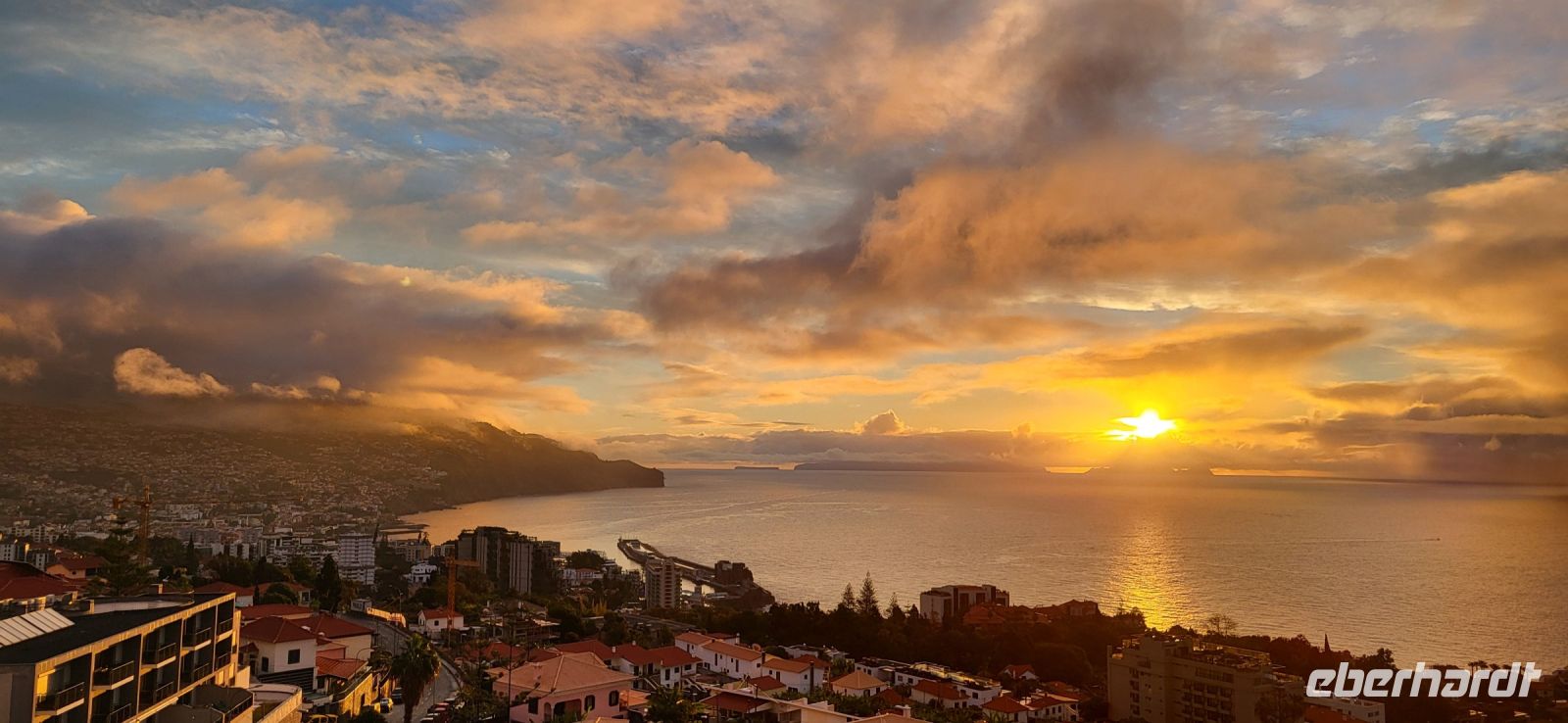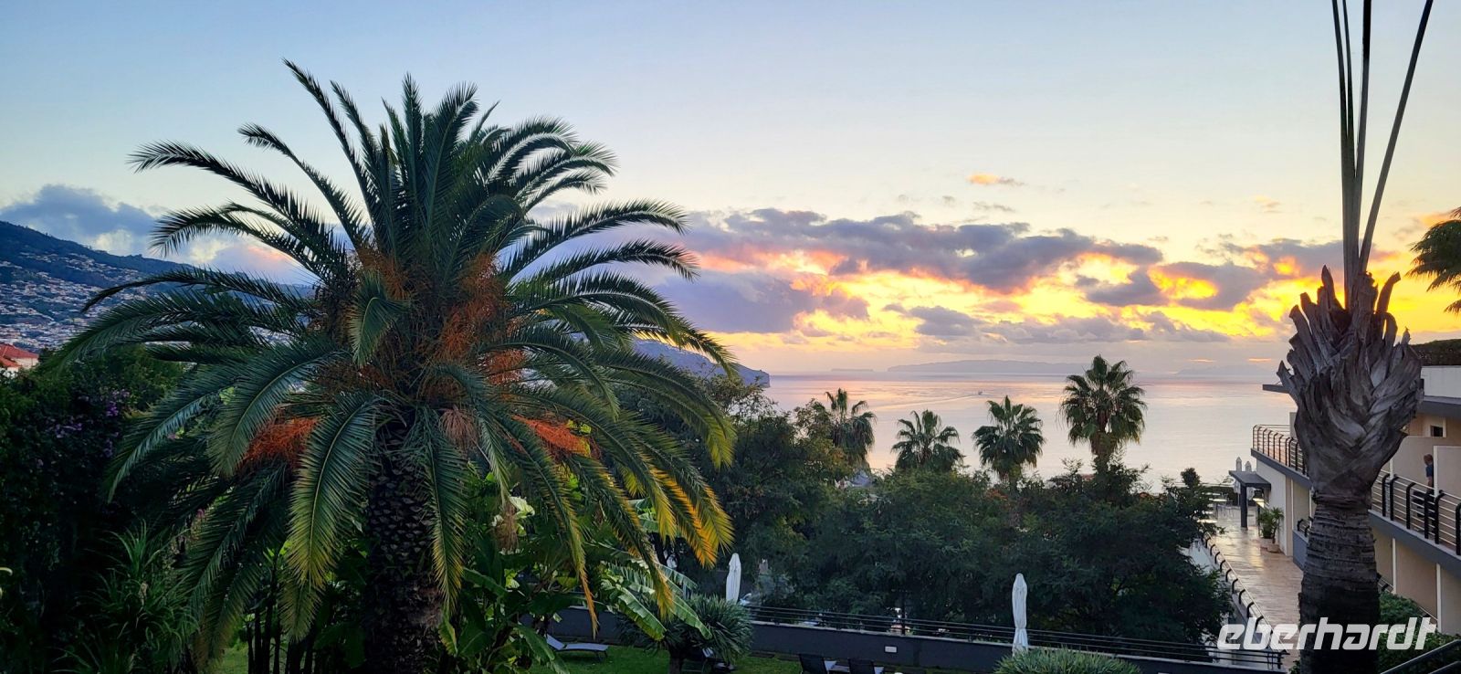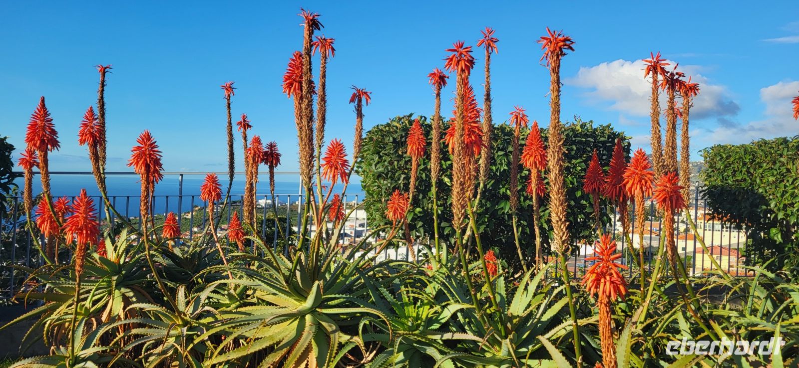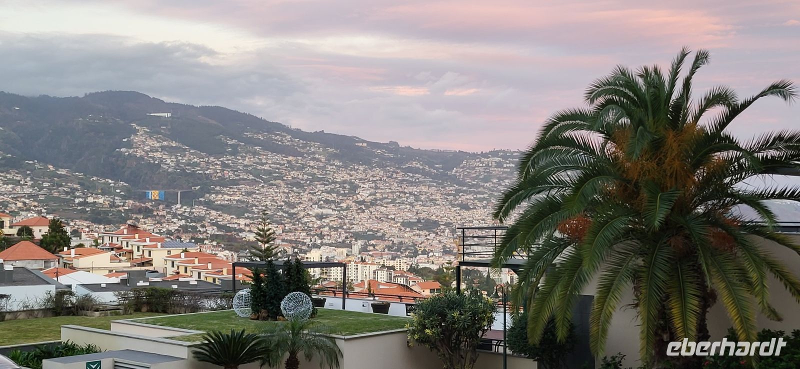 Voller Spannung auf unsere bevorstehende Silvesterreise zur Blumeninsel Madeira treten wir heute die Flüge aus verschiedensten Himmelsrichtungen Deutschlands nach Funchal, der Hauptstadt Madeiras an. Unser freundlicher Pilot erklärt allen Gästen, dass nur besonders trainierte Piloten auf Madeira landen dürfen und diese alle sechs Monate an einem Flugsimulator ihre Fähigkeiten auffrischen müssen. Da die Insel mitten im Atlantik liegt, haben so manche Flugzeuge mit den vorherrschenden Winden zu kämpfen, die jedoch alle mit Bravour meistern. Die Ankunft gelingt somit reibungslos und schnell. Reiseleiterin Fatima Pereira und Susanne Schirmann, Reisebegleiterin Eberhardt TRAVEL erwarten die Gäste und schon bald bringt uns unser nagelneuer Bus mit 55 Plätzen und unserem freundlichen Busfahrer Nuno zum 4-Sterne-Hotel Panoramico, welches oberhalb der Stadt Funchal, mit einem fantastischen Blick auf die Bucht gelegen ist. Auf dem Weg dorthin gewinnen wir erste Eindrücke der herrlichen Natur und sehen blühende Aloen, Schwanenhalsagaven, Feuerranken und vieles mehr. Vor uns liegt die Bucht von Funchal, die einem Amphitheater gleicht. Wir checken zügig mithilfe der freundlichen Mitarbeiter des Panoramico ein und so mancher ist schon kurz darauf mit dem kostenfreien Hotelshuttle auf dem Weg in die Stadt, um sich einen ersten Überblick zu verschaffen. Alternativ spazieren wir zum Supermarkt in unserer Nähe und auch die Bäckerei daneben will entdeckt werden. Ein erster herrlicher portugiesischer Kaffee wird genossen und gesellig sitzen wir zum Austausch zusammen. Vor dem Abendessen treffen wir uns zu einem Infogespräch und lernen die Besonderheiten dieser Reise und unsere Mitreisenden bei einem Glas Poncha kennen. Ein leckeres Buffet erwartet uns im Anschluss, wir langen kräftig zu. Anschließend lädt die Cocktailbar zum geselligen Beisammensein ein - für die, die heute noch fit sind. Ein erster erlebnisreicher Auftakt unserer Silvestertour, zumal wir ja heute Morgen noch im trüben Deutschland waren …wir ahnen es schon-Es war bestimmt die richtige Entscheidung hierher zu reisen!
