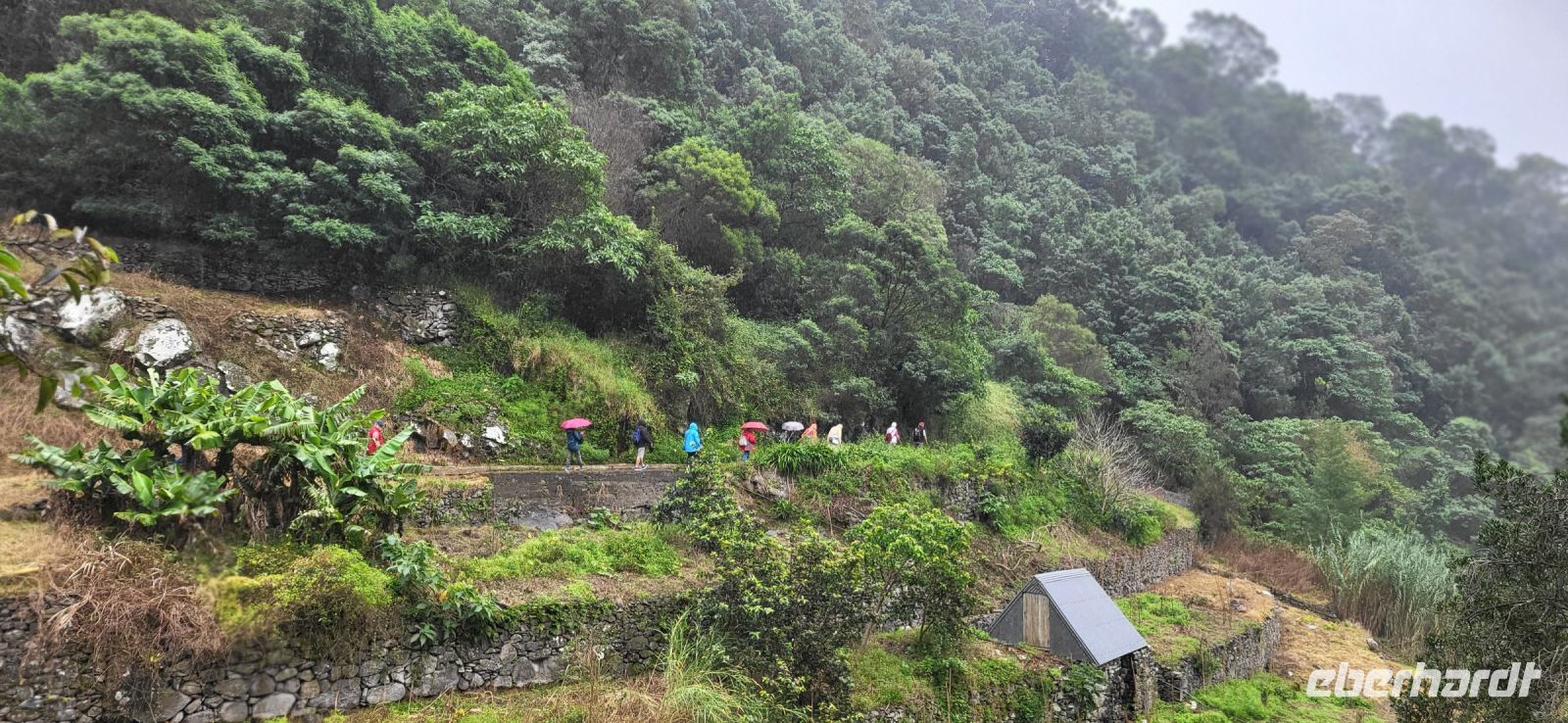 Nach so viel Silvesterfreude ist heute erst mal Ausschlafen angesagt und wir genießen das herrliche Neujahrsbuffet auf der Terrasse des Hotel Panoramico. Mittags starten wir dann nach Marocos um von hier aus eine geführte Levadawanderung anzutreten. Da wir eine kleinere Wandergruppe sind, nehmen wir heute einen Minibus, der uns nach der Wanderung direkt am Ziel der Bar „O Jacaré“ abholen kann. Wir haben ca. 7 Km vor uns und Fatima erklärt uns viele Pflanzen und Bäume, die wir am Wegesrand sehen. So wandern wir fröhlich bei eher mäßigem Wetter am Hang entlang, mit Blick auf Machico im Tal unter uns gelegen. Wie wir von Fatima hören, sind Levadas die bekannten Bewässerungskanäle Madeiras, die sich über ein Streckennetz von 3000 Km über die Insel verteilen. Die längste unter ihnen misst beachtliche 106 Km. Die Instandhalter und Bewässerer nennen sich Levadeiros und sorgen dafür, dass die Kanäle zum einen sauber gehalten werden und das bestellte Wasser entsprechend verteilt wird. Ein schöner Blick aufs Meer hier, schöne Terrassenfelder, Häuser, Hütten da … dazwischen Pflanzen wie Agapanthus, Hortensien, Calas, Bäume wie Avocado, Guaven, Feigen, Tiere, wenige Menschen … wir genießen die Wanderung und kehren zum Schluss in die Bar O Jacaré ein, wo wir ein kühles Bier, einen Kaffee oder ein Stückchen Kuchen genießen können. So haben wir das neue Jahr sportlich begonnen und dürfen heute Abend wieder das leckere Buffet ohne schlechtes Gewissen genießen.