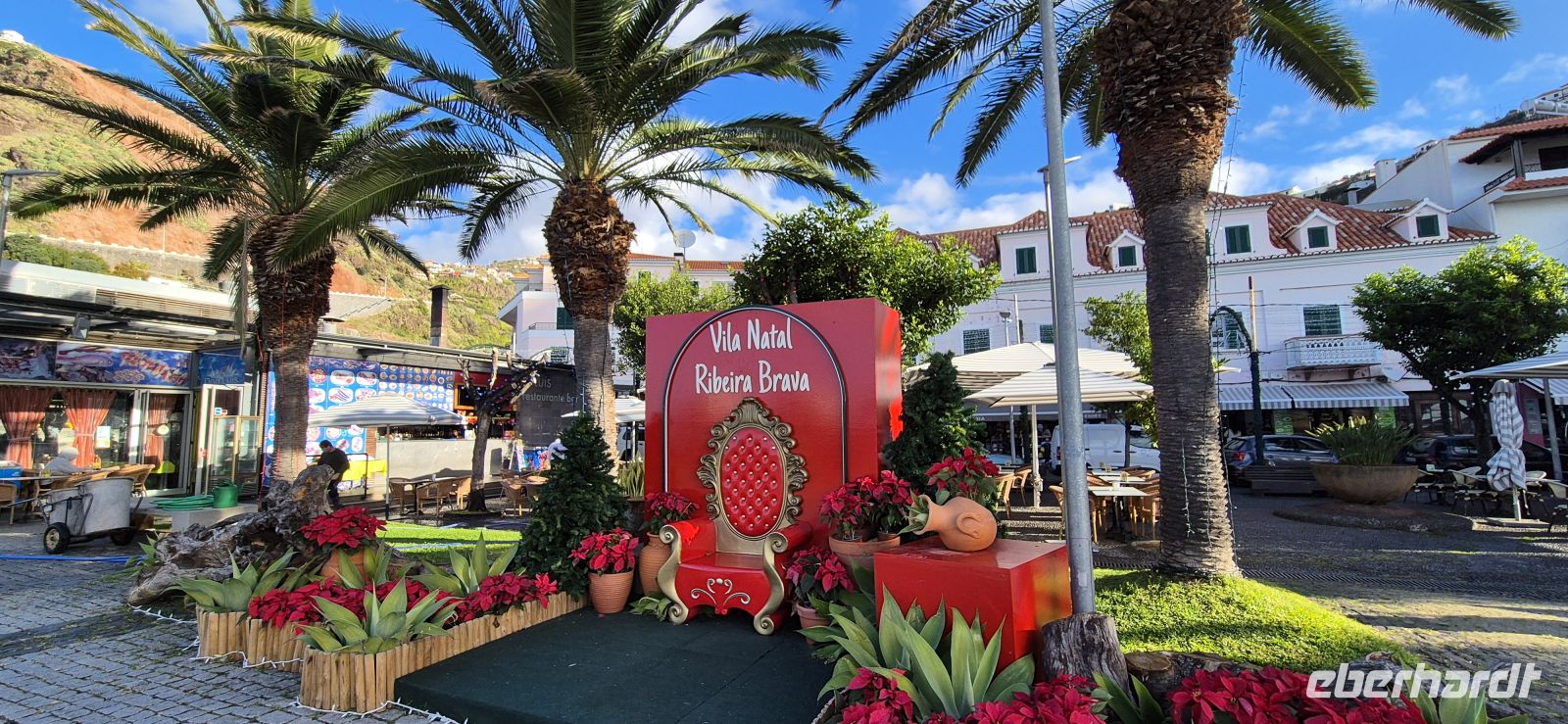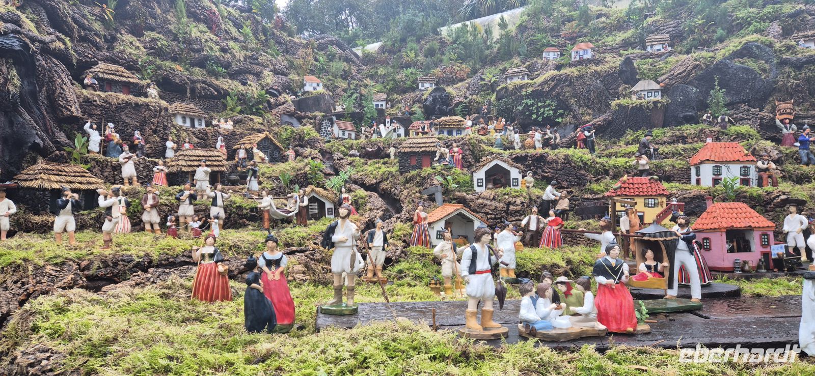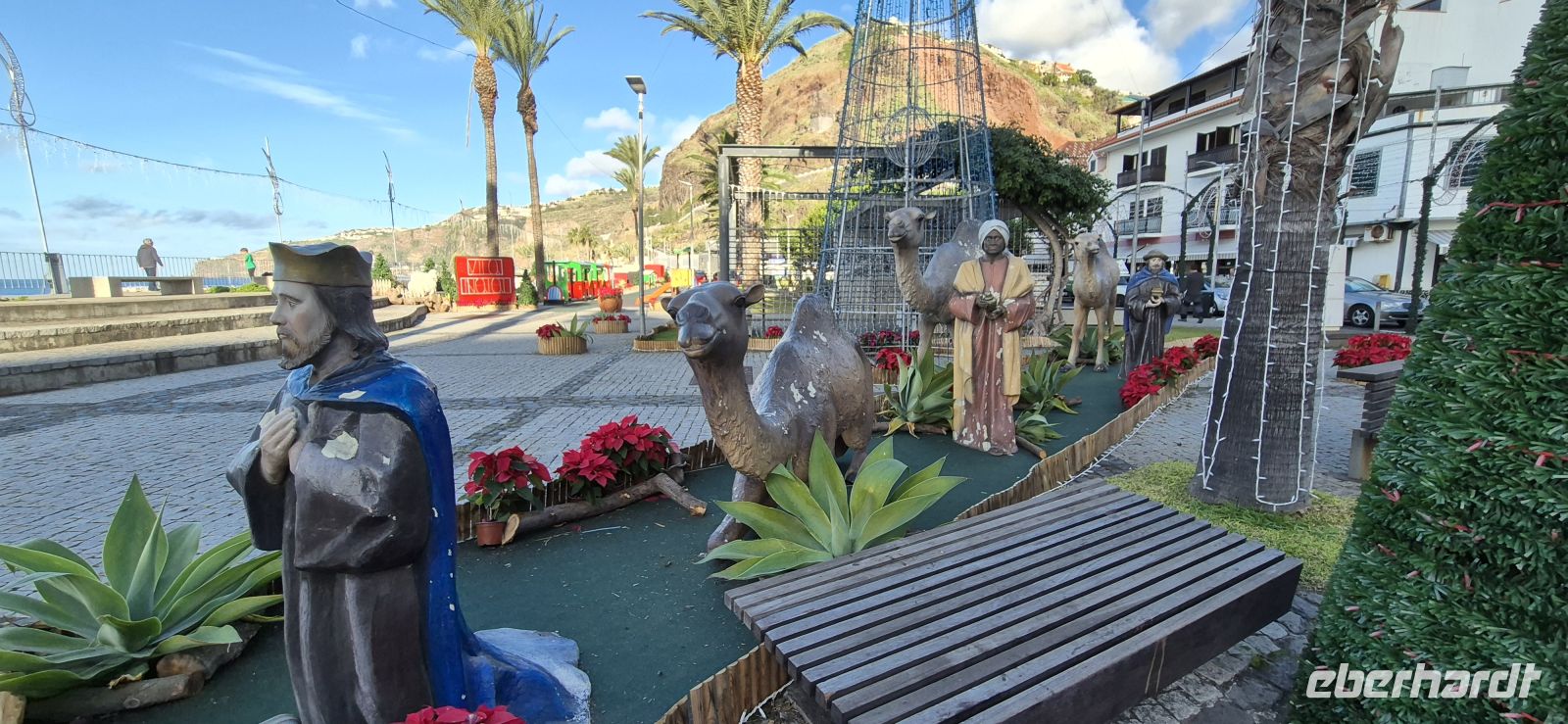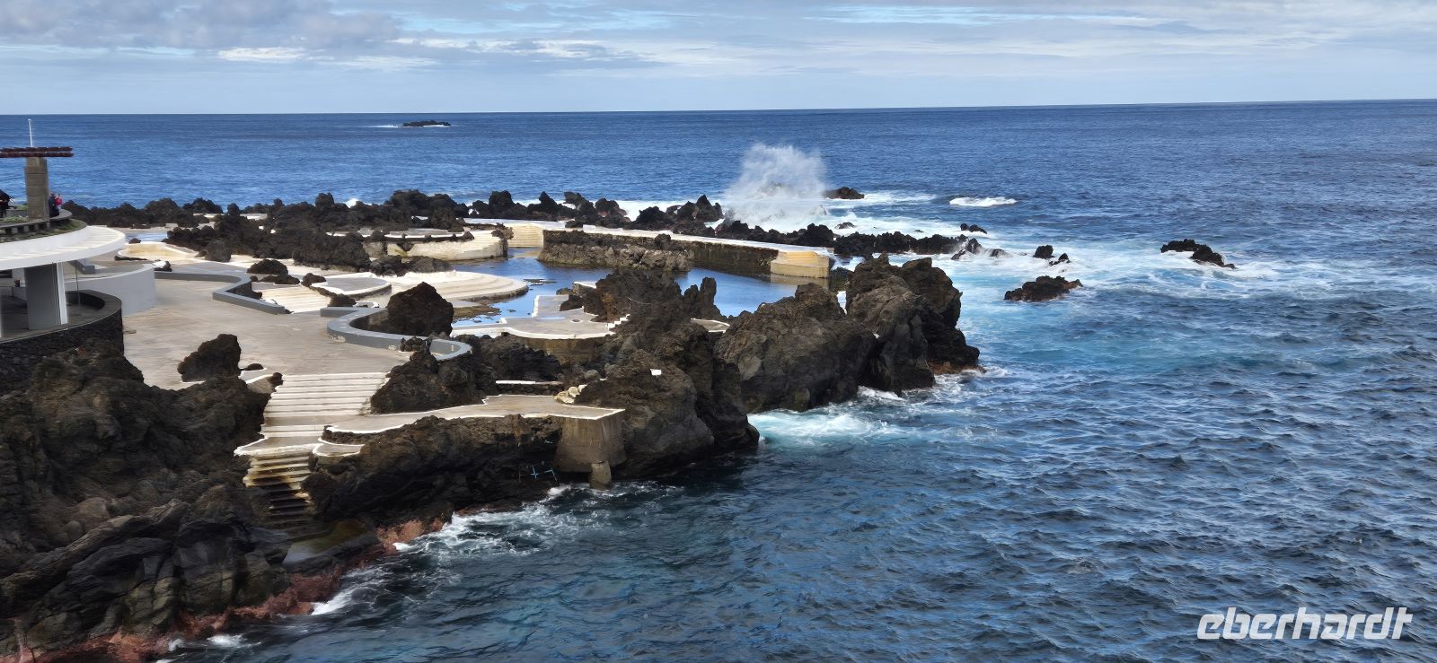 An der Nordküste angekommen blicken wir nun auf steil abfallende Felsen, die uns bis nach Porto Moniz begleiten. Dort legen wir unsere Mittagspause ein. Einige von uns wagen sich in die berühmten Naturschwimmbecken aus Lavagestein – das Wasser ist mit rund 19 Grad zwar frisch, aber herrlich belebend. Wer nicht schwimmt, kann das Spektakel vom Ufer aus genießen und gemütlich am Meer entlang schlendern. Gestärkt und erfrischt fahren wir weiter entlang der Nordküste, vorbei an kleinen Ortschaften wie Seixal mit traumhaftem Meerblick. Selbst die Friedhöfe liegen hier spektakulär. Unser letzter Halt des Ausflugs planen wir in São Vicente ein und spazieren durch das ruhige Dorf, besuchen die barocke Kirche aus dem Jahr 1692 – ein weiteres schönes Zeugnis der Geschichte Madeiras. Auf der Rückfahrt haben wir eigentlich vor, mit unserem Bus über den Pass und nicht durch den Tunnel zu fahren. Doch auf halber Strecke macht uns ein Steinschlag auf der Straße einen Strich durch die Rechnung. Ein Weiterkommen ist unmöglich – wenden kann unser langer Bus hier ebenfalls nicht. Also heißt es: rund 25 Minuten rückwärts den Berg hinunter. Eine echte Meisterleistung unseres Busfahrers Luis, der uns ruhig und sicher wieder nach unten bringt. Einen großen Applaus spendend und wohlbehalten entscheiden wir uns anschließend doch für den Tunnel und erreichen über die Südseite wieder Funchal – erleichtert und beeindruckt zugleich. Am Abend lassen wir den Tag genussvoll ausklingen. In einem typischen Spezialitätenrestaurant, der „Quinta Estacao“ probieren wir die berühmte Insel-Spezialität: den traditionellen „Espetada“-Rindfleischspieß. Anschließend erleben wir Funchal leider mit kühlem Nass von oben bei einer stimmungsvollen Panorama- und Lichterfahrt. Die Stadt ist festlich geschmückt, weihnachtlich beleuchtet und zeigt sich von ihrer festlichen Seite – ein wunderschöner Abschluss dieses erlebnisreichen Tages.