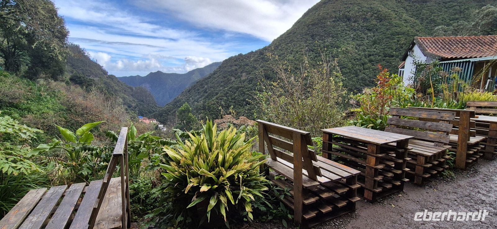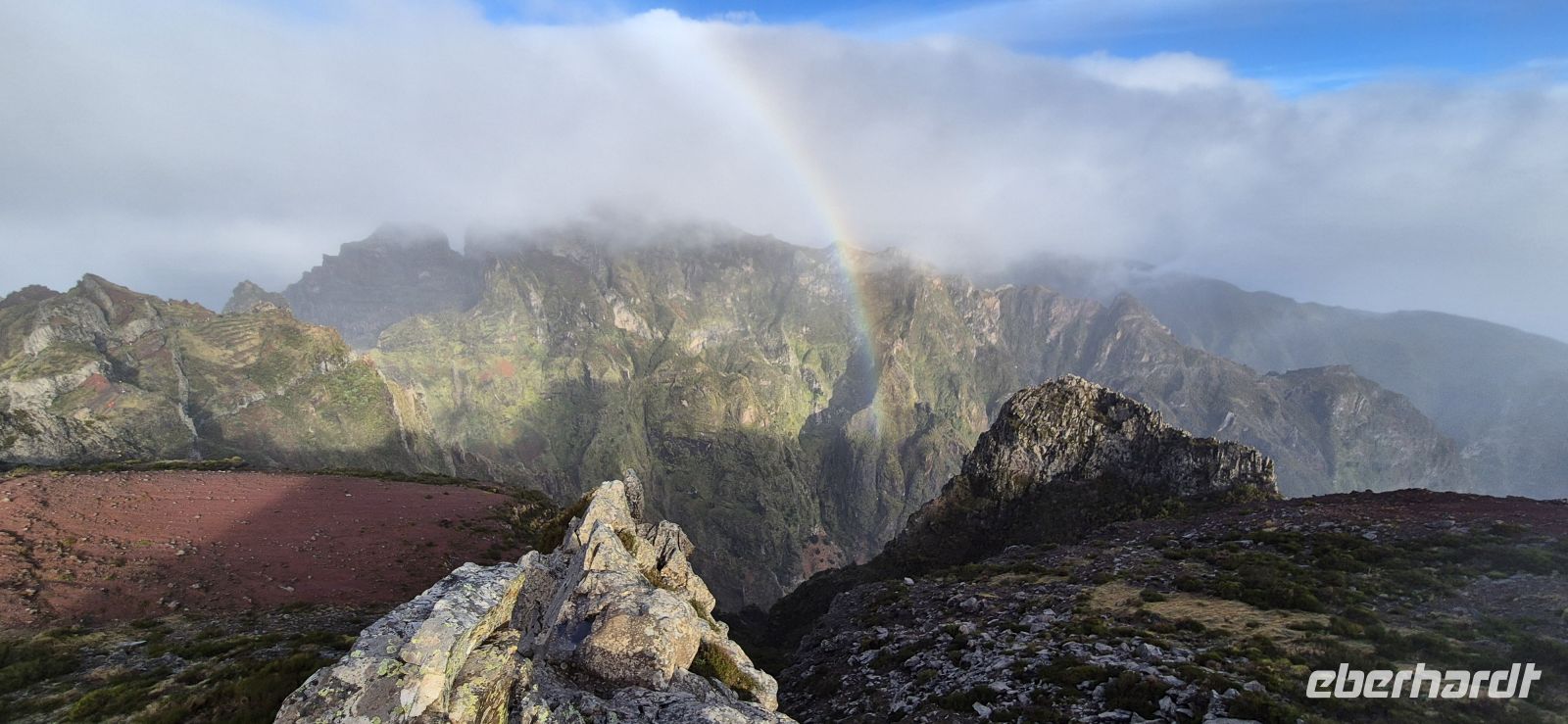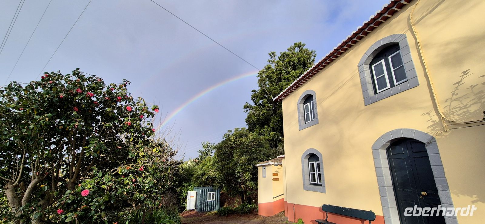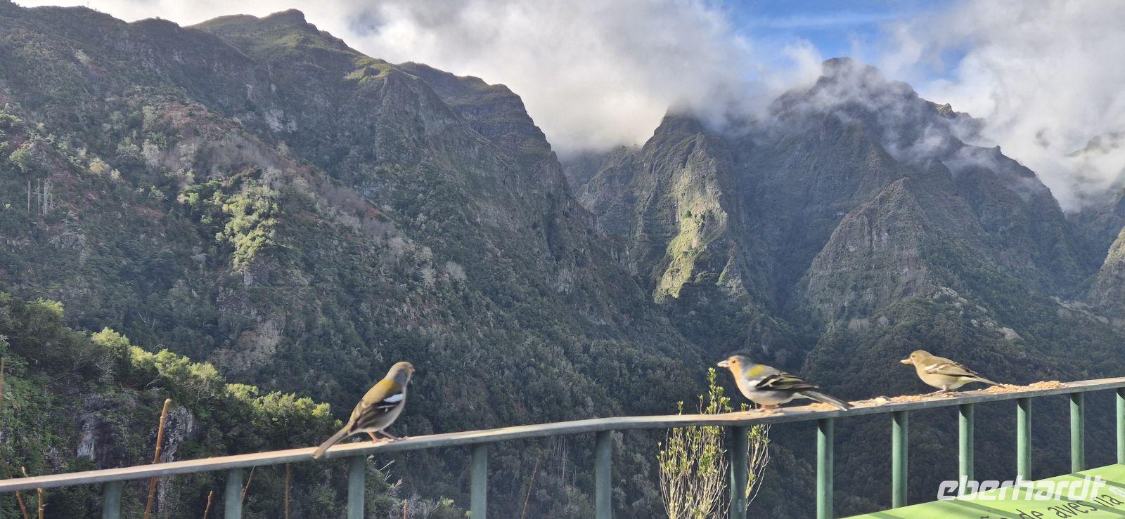 Im Nu sind wir am Pico do Arieiro angekommen und befinden uns indessen auf stattlichen 1.818 m Höhe und somit der 3. höchsten Erhebung der Insel, welche im Übrigen 57 km lang und 23 km breit ist. Für den absoluten Panoramablick ist zwar noch Luft nach oben, doch Madeira wäre nicht Madeira, wenn es nicht doch noch einen magischen Moment gäbe. Die Wolken lichten sich kurz und wir haben freien Blick inklusive Regenbogen auf die dramatische Berglandschaft. Weiter geht es nach Ribeiro Frio. Hier kommen nun unsere Wanderschuhe zum Einsatz und wir folgen einer Levada bis zum Aussichtspunkt Balcões. Der Weg ist leicht, die Natur üppig – und die Madeira-Buchfinken sind unsere treuen Begleiter. Zutraulich und neugierig sorgen sie für heitere Fotomomente am Aussichtspunkt „Balcoes“, von wo wir einen tollen Blick auf die umliegende Bergkulisse und Sicht auf die 40 km Entfernung gelegene Badeinsel Porto Santo, Madeiras kleine, sandige Schwesterinsel haben.