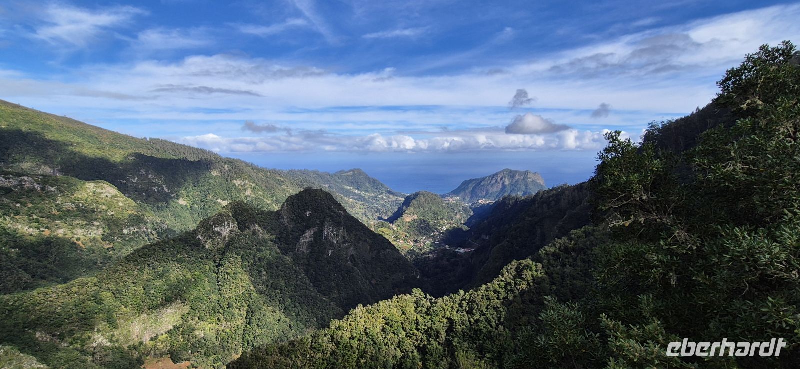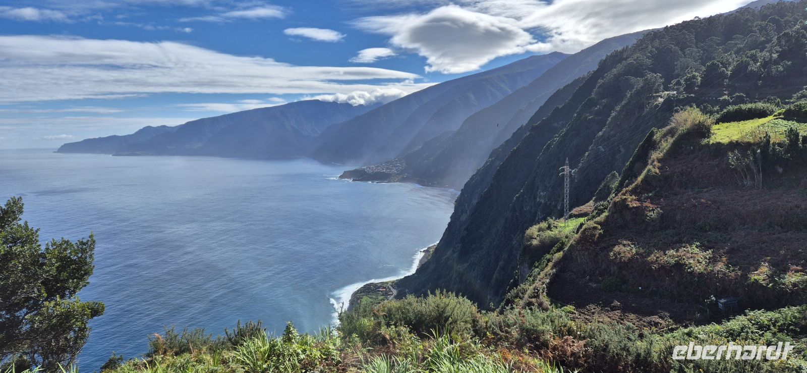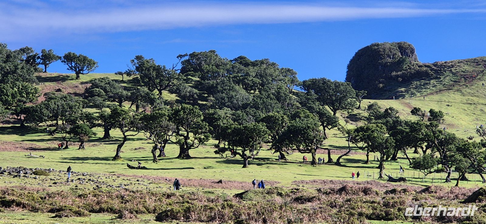 Ein neuer Tag auf Madeira liegt vor uns. Heute haben wir die Wahl, entweder ein Tag zur freien Verfügung oder unser optionaler Ausflug an die abwechslungsreiche Nordwestküste der Insel, welchem sich die meisten von uns anschließen. Unsere Fahrt beginnt in Funchal und führt uns nach Campanario, wo wir die alte Straße nehmen. Immer wieder eröffnet sich uns ein wunderschöner Blick auf die Südküste, eingerahmt von gepflegten Häusern und üppiger, typisch madeirensischer Vegetation mit Bananenplantagen und so manchem Weinberg. Besonders auffällig sind die kleinen Tonköpfe und Tauben auf den Dächern – sie gelten als Glücksbringer und Schutzsymbole und geben uns einen schönen Einblick in alte madeirensische Traditionen. Gelassen und souverän bringt uns unser Busfahrer Luis durch die teils engen, kurvenreichen Straßen – allein das ist hier schon ein Erlebnis. Unser erster Halt ist der einheimische Ort Ribeira Brava, übersetzt „wilder Bach“. Umgeben von einer imposanten Bergkulisse spazieren wir durch den Ort und besuchen die barocke Kirche São Bento. Anschließend geht es hinauf auf die Hochebene von Paúl da Serra auf rund 1.400 Metern Höhe. Das Landschaftsbild überrascht uns: weite Flächen, niedriger Bewuchs und grasende Kühe – ganz anders als das sonst so grüne, steile Madeira. Die Tiere nehmen es hier gemütlich, speisen entlang der Straße, was für ein paar schmunzelnde Momente sorgt. Da das Wetter grandios ist, halten wir für diverse Fotostopps und spazieren ein Stück zu den alten Lorbeerbäumen. Selbst ein mit viel Wasser gefüllter Vulkankrater ist heute gut sichtbar.