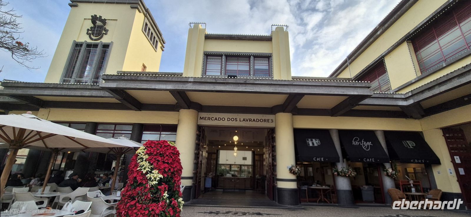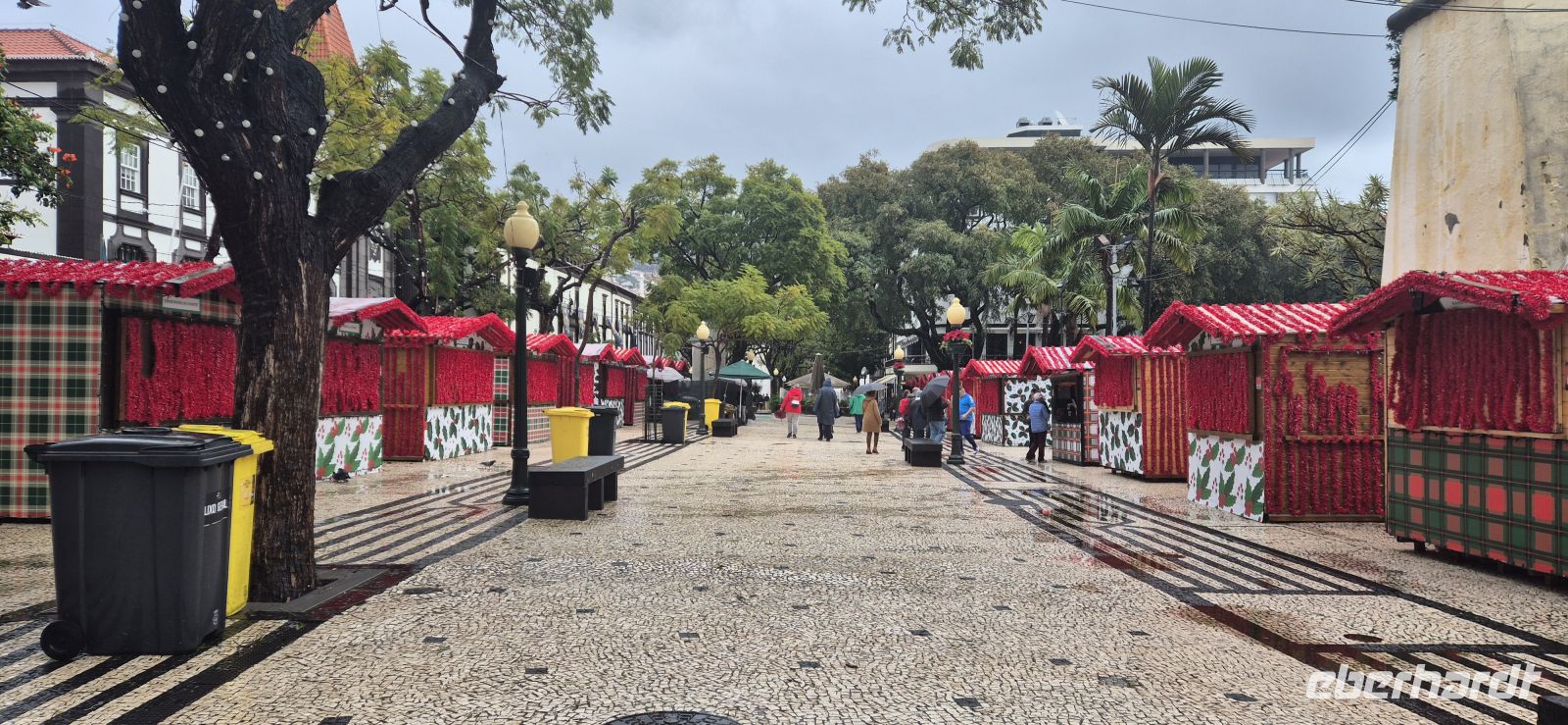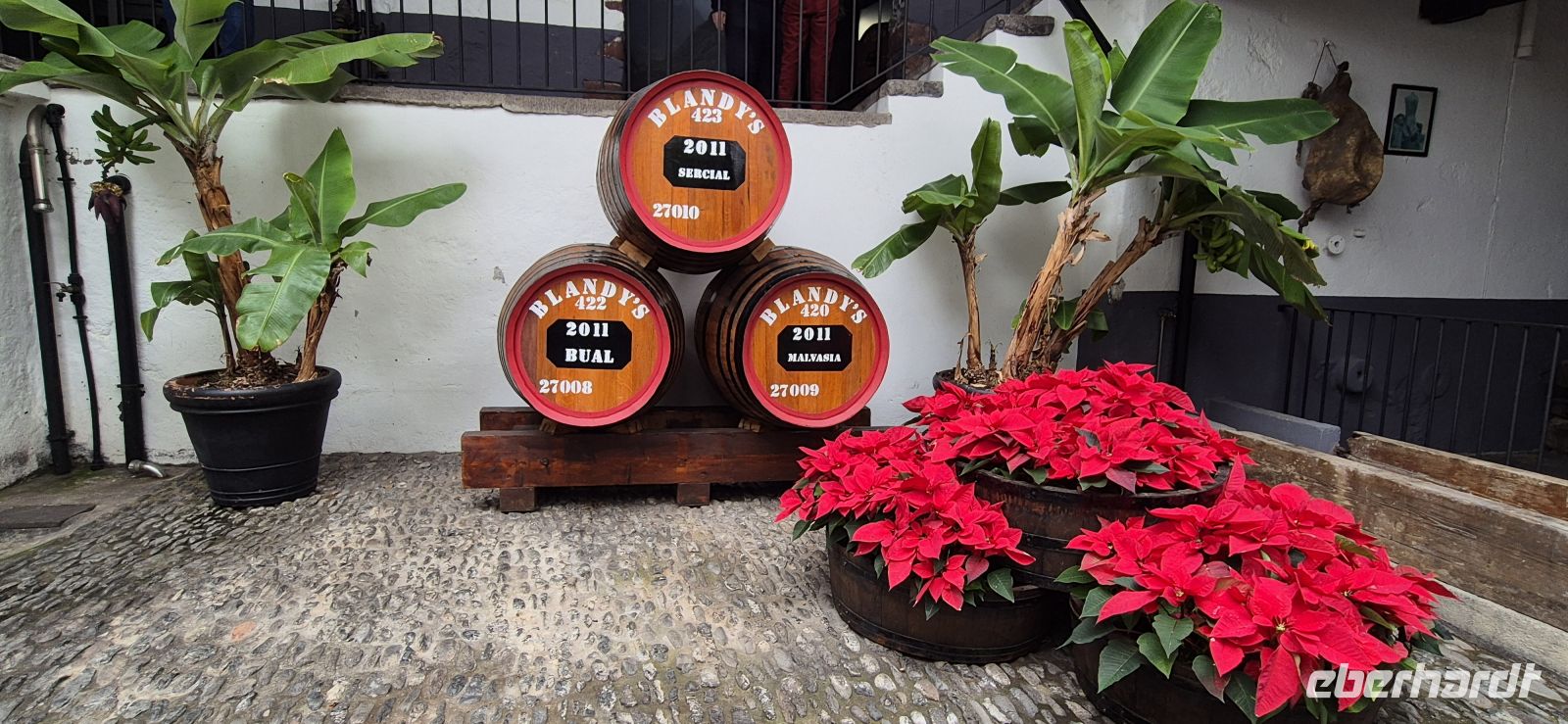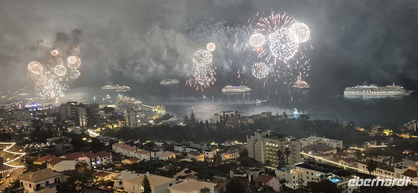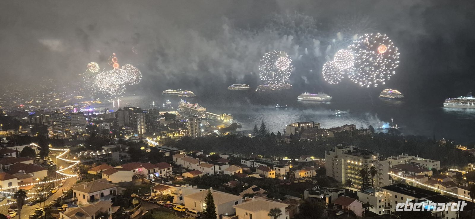 Gut gestärkt machen wir uns auf den Weg, die Hauptstadt der Insel, Funchal, mit 108.000 Einwohnern und einigen Kreuzfahrern näher kennenzulernen. Mit unserer liebenswerten Reiseleiterin Fatima tauchen wir direkt ins Stadtleben ein – dank Funkgeräten hören wir jedes Wort, selbst wenn wir ein paar Schritte zurückfallen. Schon bald wird klar: Auf Madeira kommt man an Cristiano Ronaldo nicht vorbei. Sein Name begegnet uns überall und gehört hier einfach dazu. Unsere Fahrt führt uns vorbei an sattgrünen Bananenstauden und üppig blühenden Pflanzen, während der Atlantik immer wieder durchblitzt. In der Altstadt spazieren wir durch schmale Gassen, entdecken fantasievoll bemalte Haustüren und lassen uns vom bunten Treiben auf dem Mercado dos Lavradores mitreißen. Exotische Früchte stapeln sich an den Ständen, und der schwarze Degenfisch in der Fischhalle sorgt für staunende Blicke, wie meinte Fatima so schön: „zum Glück schmeckt er besser, als er aussieht!“. Nachdem wir etwas Zeit zur freien Verfügung hatten und die Markthalle ausgiebig besichtigen konnten, spazieren wir weiter durch die Haupteinkaufstraße der Stadt. Vorbei an typisch portugiesischen Spezialitäten wie Stockfisch (Bacalhau), Pastel de Nata oder Bolo do Caco, einfach nur köstlich, muss man probiert haben. Ein genussvoller Stopp erwartet uns im Anschluss in der Blandy’s Wine Lodge. Bei einer Führung durch Fatima erfahren wir, was den Madeira-Wein so besonders macht, bevor wir zwei Sorten verkosten – ein echtes Stück Inseltradition im Glas. Danach geht es weiter nach Caniço zur Quinta Splendida. Hier werden wir kulinarisch mit Tee, Kaffee sowie saftigem Schokoladen- und Apfelnusskuchen empfangen. Trotz des regnerischen Wetters nehmen die meisten von uns an einer Führung über das Anwesen teil und spazieren mit Fatima durch die gepflegten Gärten, vorbei an Blumen, Kräutern und dem hauseigenen Gemüsegarten. Das Wetter zeigt sich heute von seiner nassen Seite – Madeira im Regen. Hilft alles nichts, ohne Regen gäbe es hier nicht eine solch wundervolle Natur! Doch die Stimmung bleibt bestens, denn am Abend freuen wir uns auf ein festliches Silvester-Gala-Buffet. In geselliger Runde lassen wir das Jahr ausklingen und hoffen auf einen gelungenen Jahreswechsel mit funkelndem Feuerwerk, das wir von unserer Dachterrasse aus bewundern dürfen.