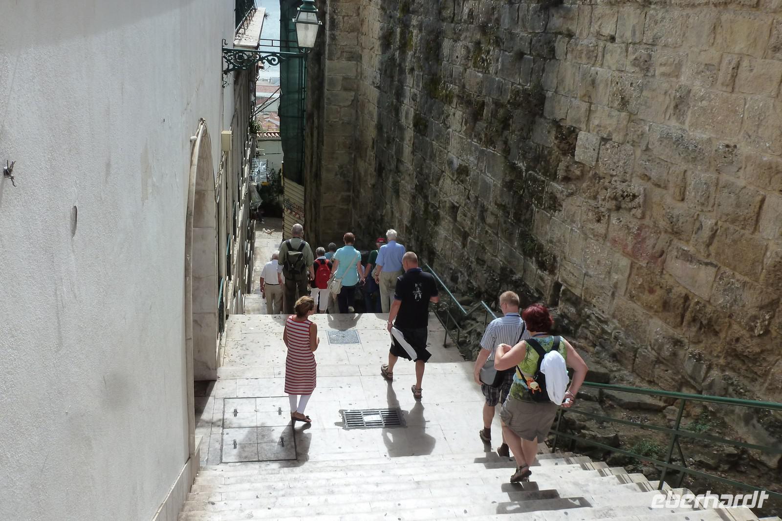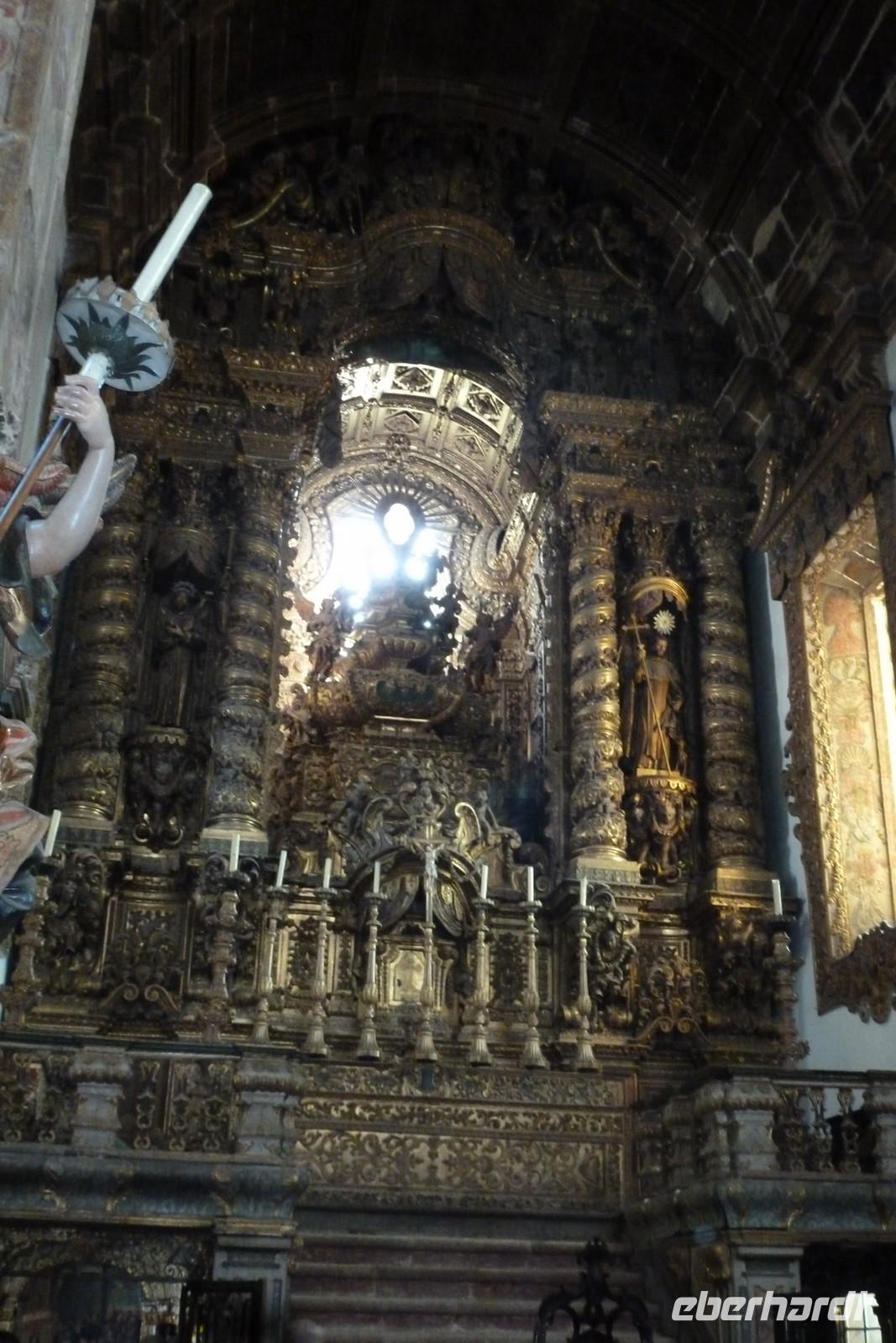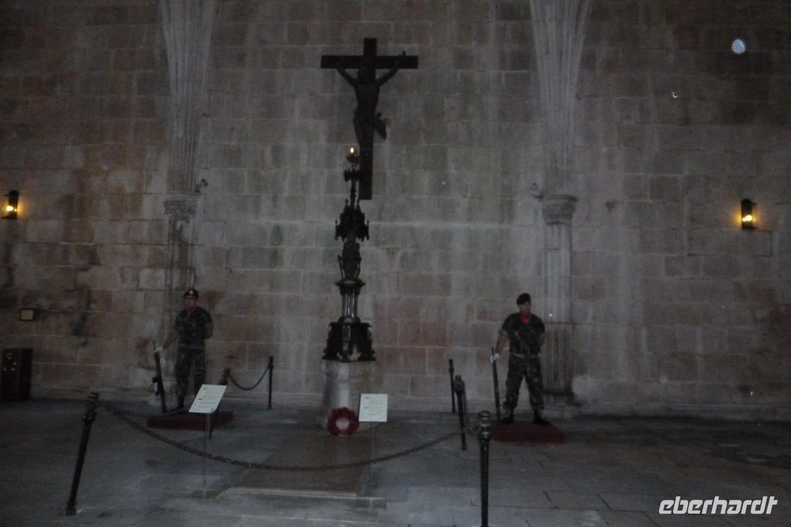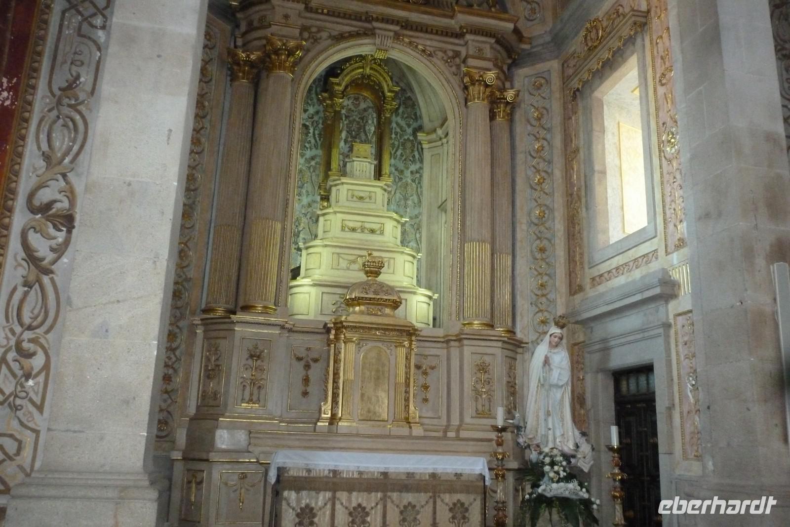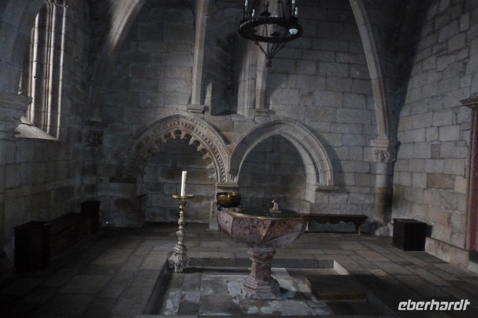 Heute ging es nach Guimaraes, der Wiege Portugals, wo unsere Besichtigung mit der alten Burganlage und der S.Miguel-Kapelle begann. In der Kapelle erzählt uns Luisa die Gründungsgeschichte Portugals sowie die inoffizielle, erwachsene Version. Anschließend ging es hinab ins Stadtzentrum, wo wir durch enge Gassen liefen und vor dem Regen dann zuerst unter dem alten Rathaus und dann in der Kathedrale Schutz suchten. In der Kathedrale hatten wir die Gelegenheit, eine Konzert der anderen Art zu hören, dass uns asiatisch inspirierte Improvisationsmusik darbot. Auf dem Weg zum Wallfahrtsort Bom Jesus erzählt uns Luisa von den verschiedenen Völkern, die im Laufe der Geschichte das Gebiet des heutigen Portugals besiedelten, darunter Iberer, Kelten, Römer, Germanen, Mauren und Spanier. Von der Wallfahrtskirche aus könnte man bei schönem Wetter einen fantastischen Blick auf Braga genießen, doch leider ist es bewölkt, wenn es nicht gerade regnet. Im Inneren der Kirche ist besonders der Reliquienschrein (hinter Glas) und das Altarbild zu empfehlen, wobei letzteres durch die plastischen Figuren mehr an eine Theaterszene erinnert als an ein Bild. Ein Highlight ist aber in jedem Fall auch die Fahrt mit der wasserbetriebenen, wirklich steilen Standseilbahn aus dem 19. Jahrhundert.Danach fahren wir weiter nach Braga und gönnen uns eine gemütliche Mittagspause. Luisa führt uns anschließend vorbei am Wehrturm zum Bischofspalast, dem alten Klarissinnen-Kloster, dem Garten der Heiligen Barbara und in die Kathedrale Sé ? einen romanischen Bau mit teils barocker Innenraumgestaltung im vorderen Hauptschiff sowie einem gotischen Eingangsportal. Am späten Nachmittag fahren wir nach Porto zurück und da unser Busfahrer ein großer Fan des FC Porto ist, macht es ihm nichts aus, uns für einen Fotostopp noch zum Stadion seines Lieblingsvereins zu fahren. Ein Tag mit vielen portugiesischen Facetten geht in unserem schönen Hotel zu Ende.