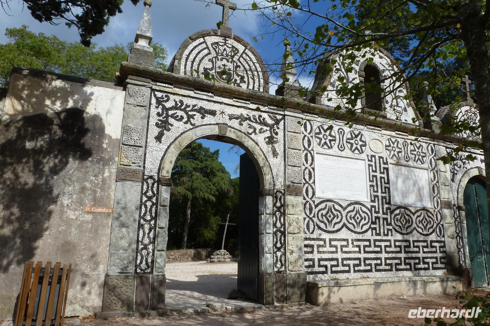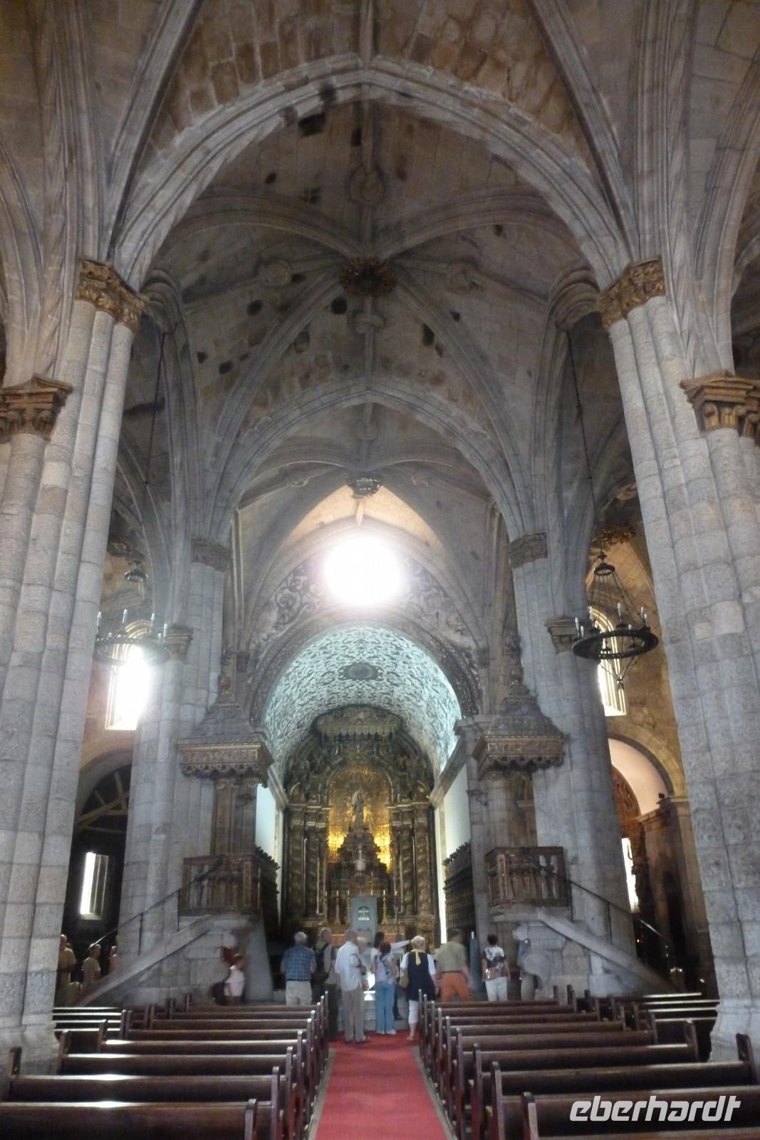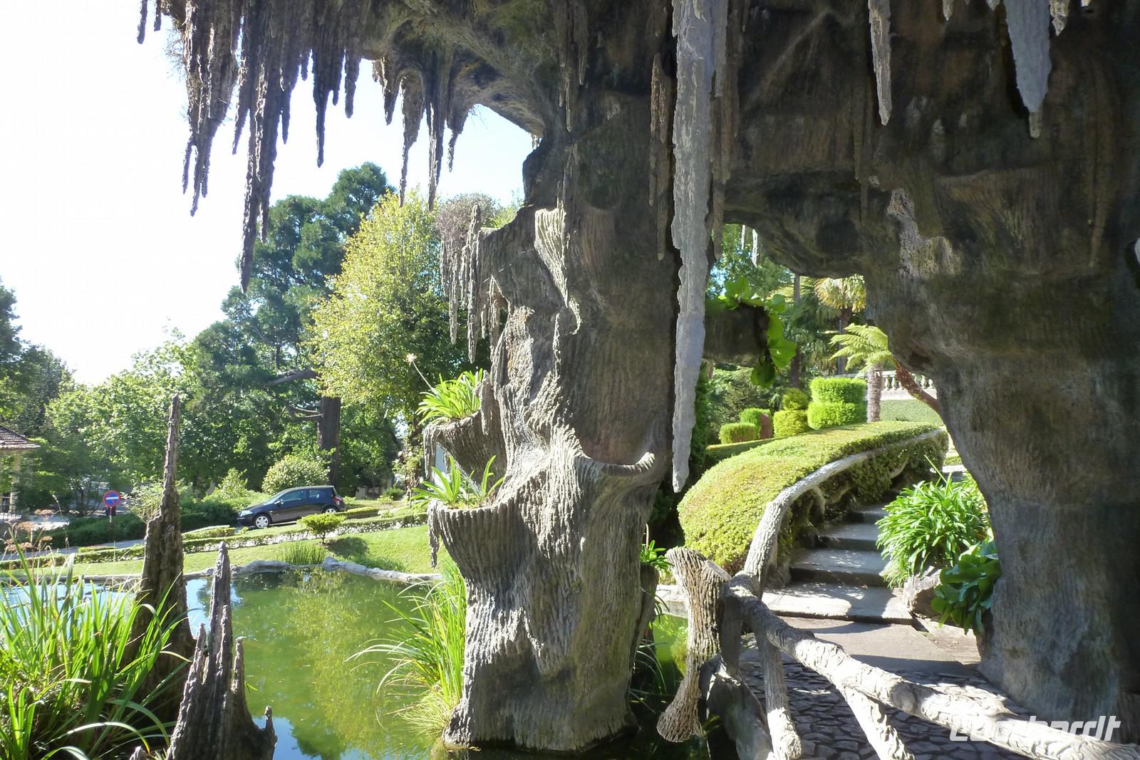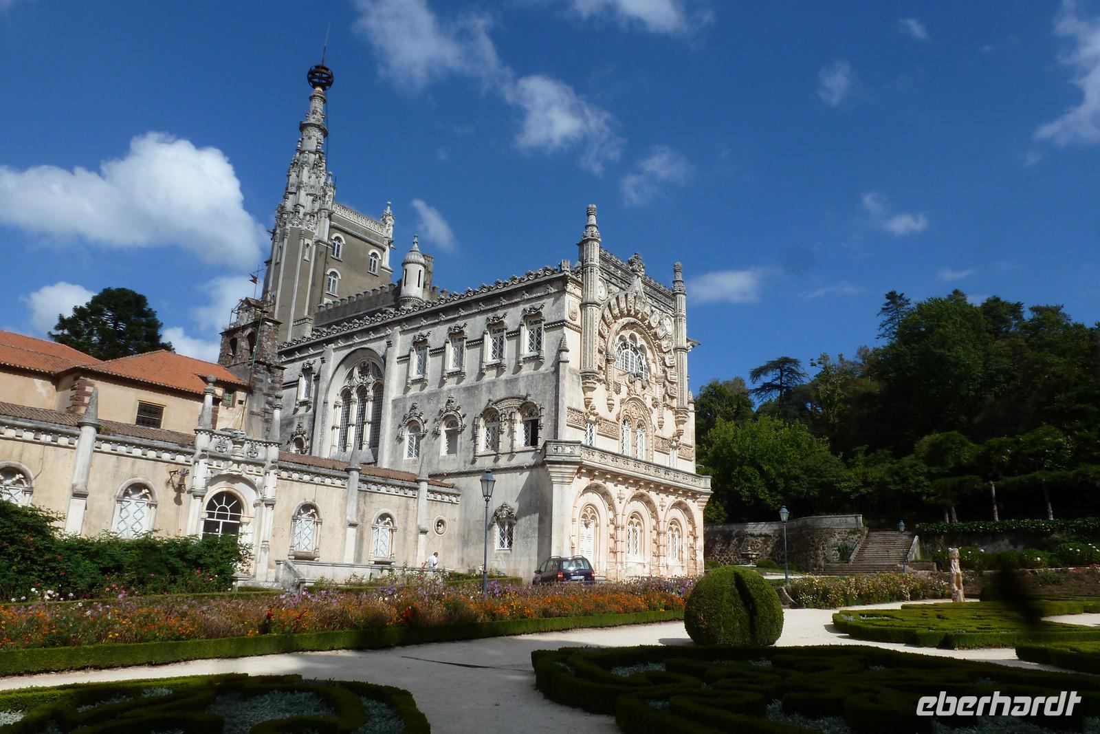 Zunächst fuhren wir nach Viseu, wo wir die Altstadt mit Kathedrale ? hier ist die Decke mit Knoten und Seilen aus Stein verziert - samt Kreuzgang besichtigten. Danach ging es weiter nach Luso, der Region der Spanferkel und Heilquellen. Unterwegs gibt uns Luisa einen Einblick in das Schul- und Sozialsystem von Portugal. Nach unserer Mittagspause bei deftigem Spanferkel bringt uns Vitor weiter nach Bucaco. Dieser Park mit seinen Azaleen, Rhododendren, Oleandersträuchern, Lilien, Farnen und vielen anderen Pflanzen, Sträuchern und Bäumen sowie dem ehemaligen Karthäuser-Kloster und nun Hotel/Palast im neo-manuelinischen Stil ist eigentlich eine Augenweide, doch für uns auf Grund des Regens leider nur aus dem Bus erfahrbar.