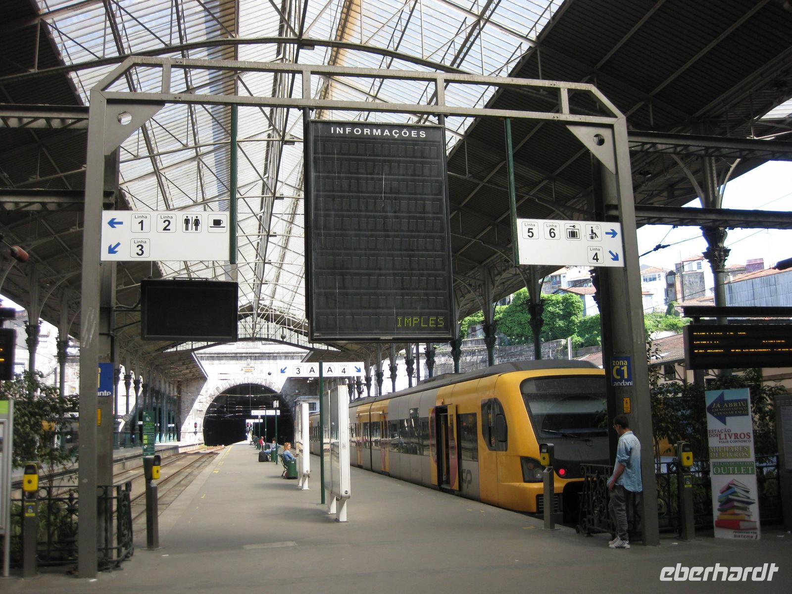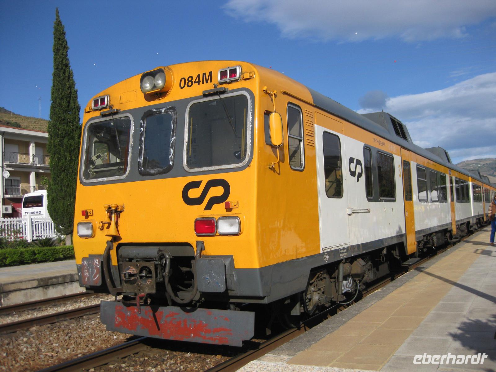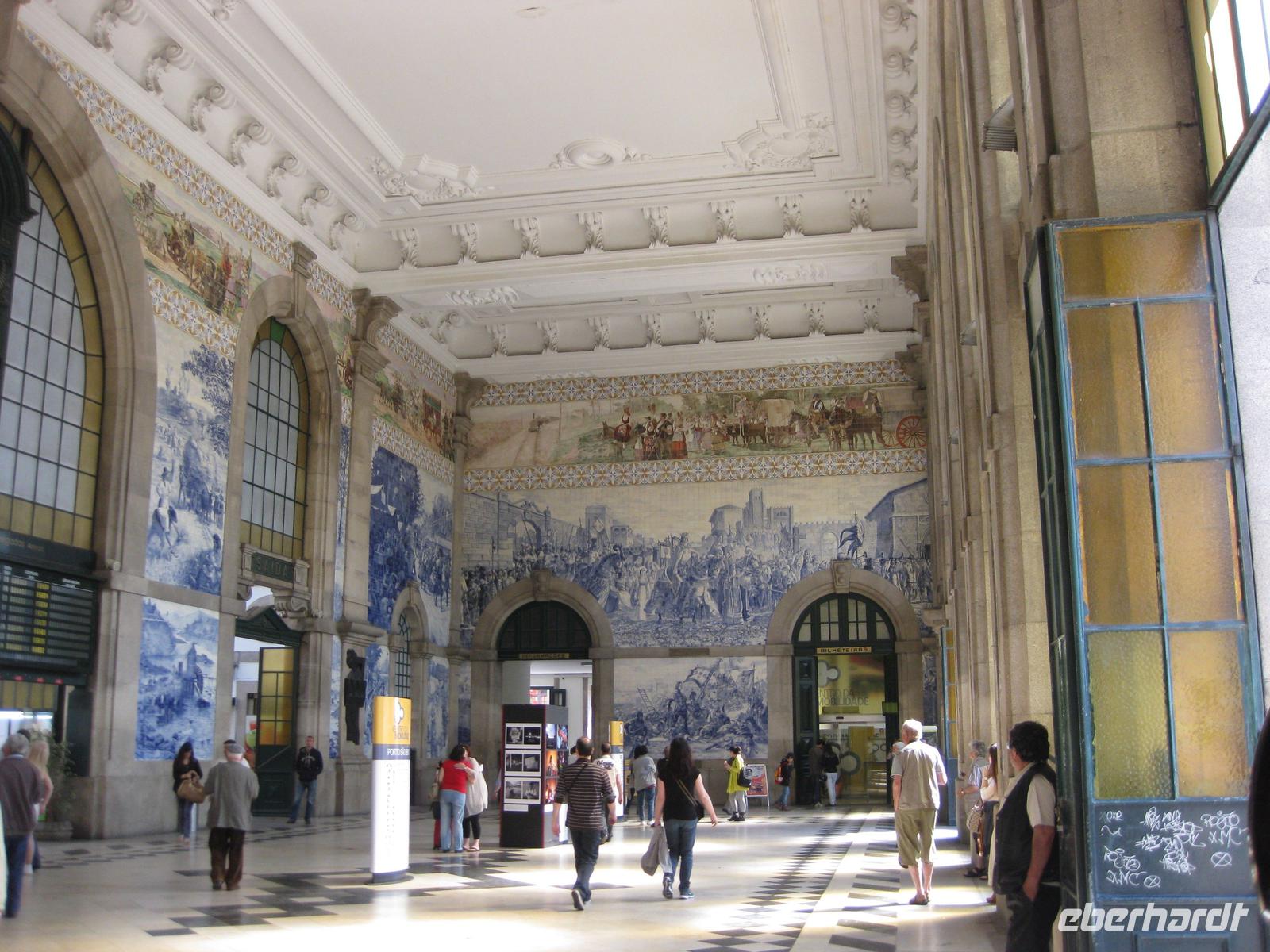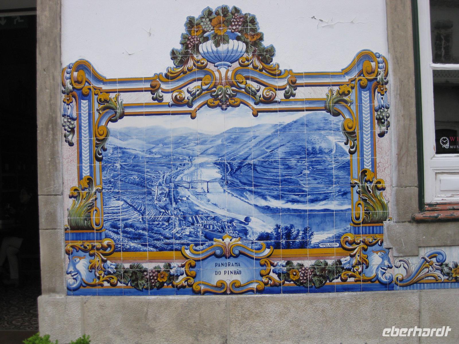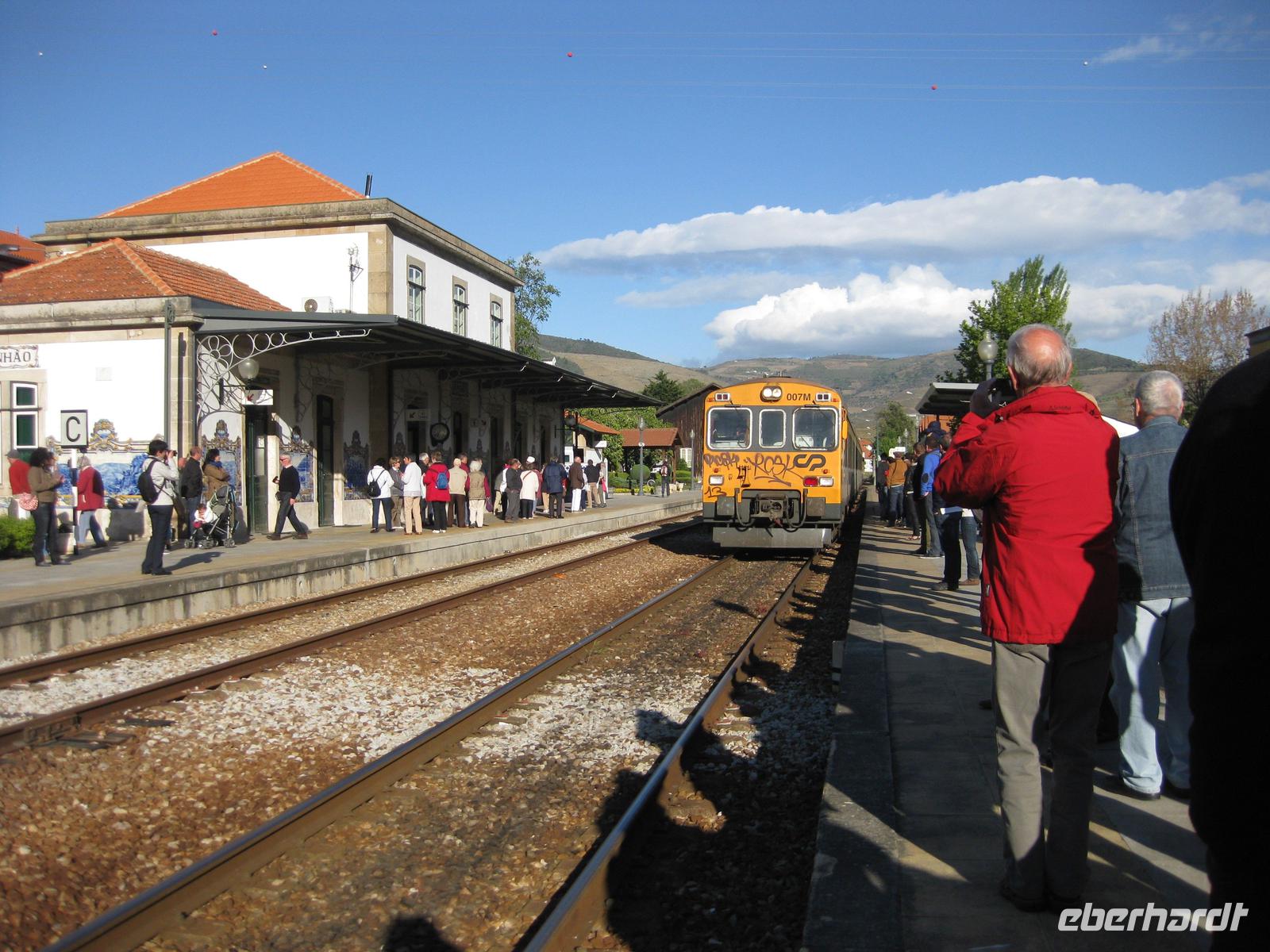 Dann fahren wir im Douro-Tal weiter bis Pinhao. Wir sehen die Weinberge aller berühmten Portweinkellereien. In Pinhao steigen wir am Bahnhof aus dem Bus und schicken unsere Fahrer mit dem leeren Bus nach Peso da Regua zum Hotel zurück. Wir fahren mit dem Zug zurück - ein besonderes Erlebnis. Der Bahnhof in Pinhao ist ein Kleinod, denn er ist mit lauter Kachelbildern rund um den Weinanbau geschmückt.