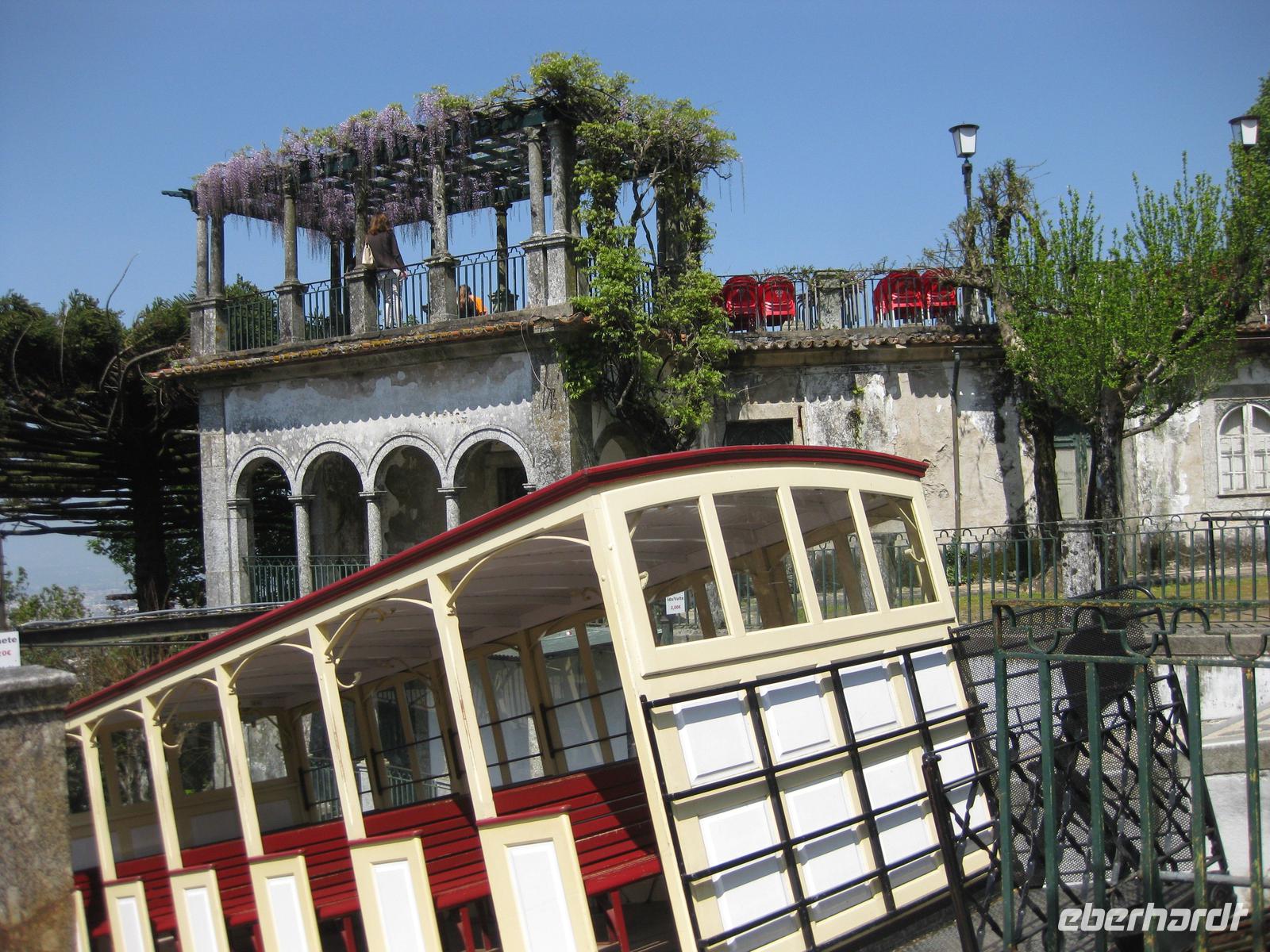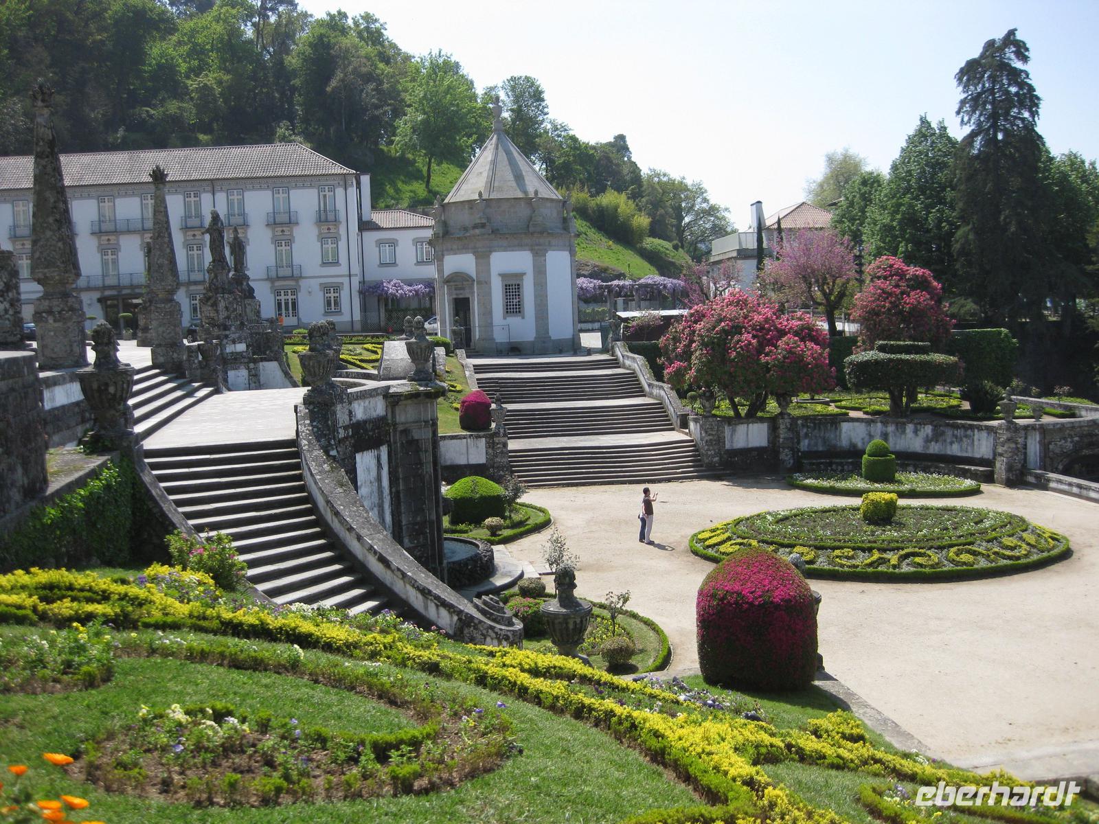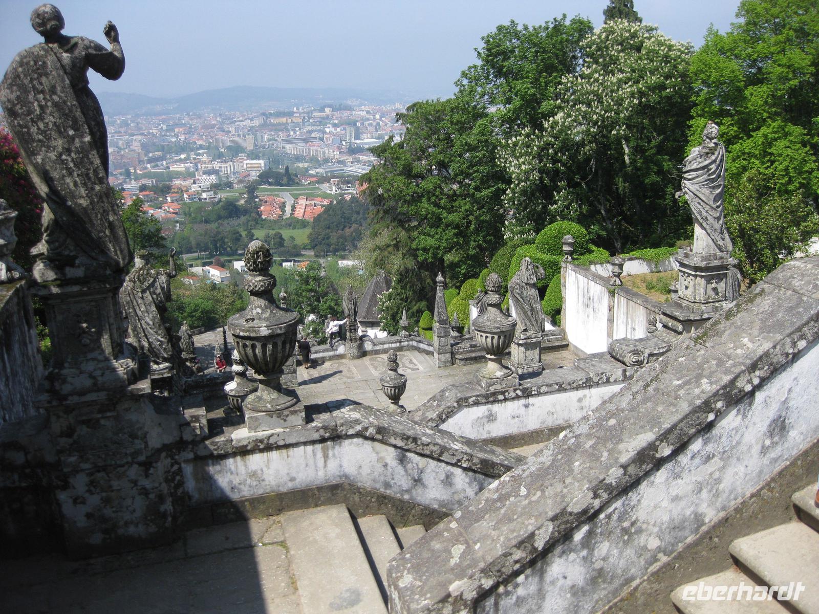 11.00 Uhr fahren wir weiter in Richtung Braga / Bergheiligtum Santuario do Bom Jesus. Um zum Bergheiligtum Santuario do Bom Jesus hinaufzukommen gibt es mehrere Möglichkeiten: zu Fuß die berühmte Freitreppe hinauf steigen, mit dem Bus hinauf fahren oder mit einer alten mit Wasser beschwerten Standseilbahn hinauf fahren. Wir fahren mit der Standseilbahn hinauf - ein besonderes Erlebnis. Oben angekommen sind wir total überrascht von der Schönheit der ganzen Anlage. Die Kirche ist von einem wunderschönen Park umgeben. Und hier oben befinden sich ein schickes Hotel und Restaurant, in denen man gut besondere Feste feiern kann. Und von hier oben eröffnet sich ein toller Blick auf die Stadt Braga. 13.00 Uhr fahren wir dann hinab in die Stadt Braga. Am unteren Ende der Freitreppe halten wir noch mal und können so unser eigenes Foto von dem berühmten Motiv schießen.