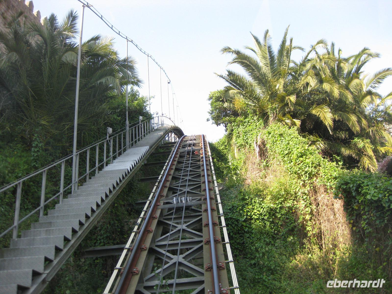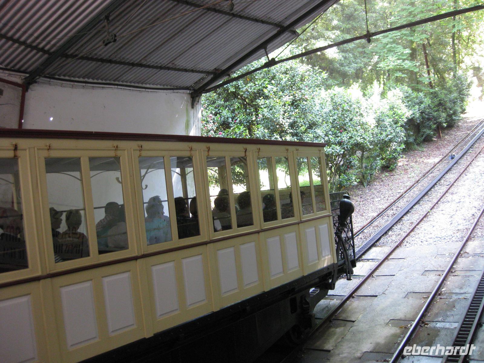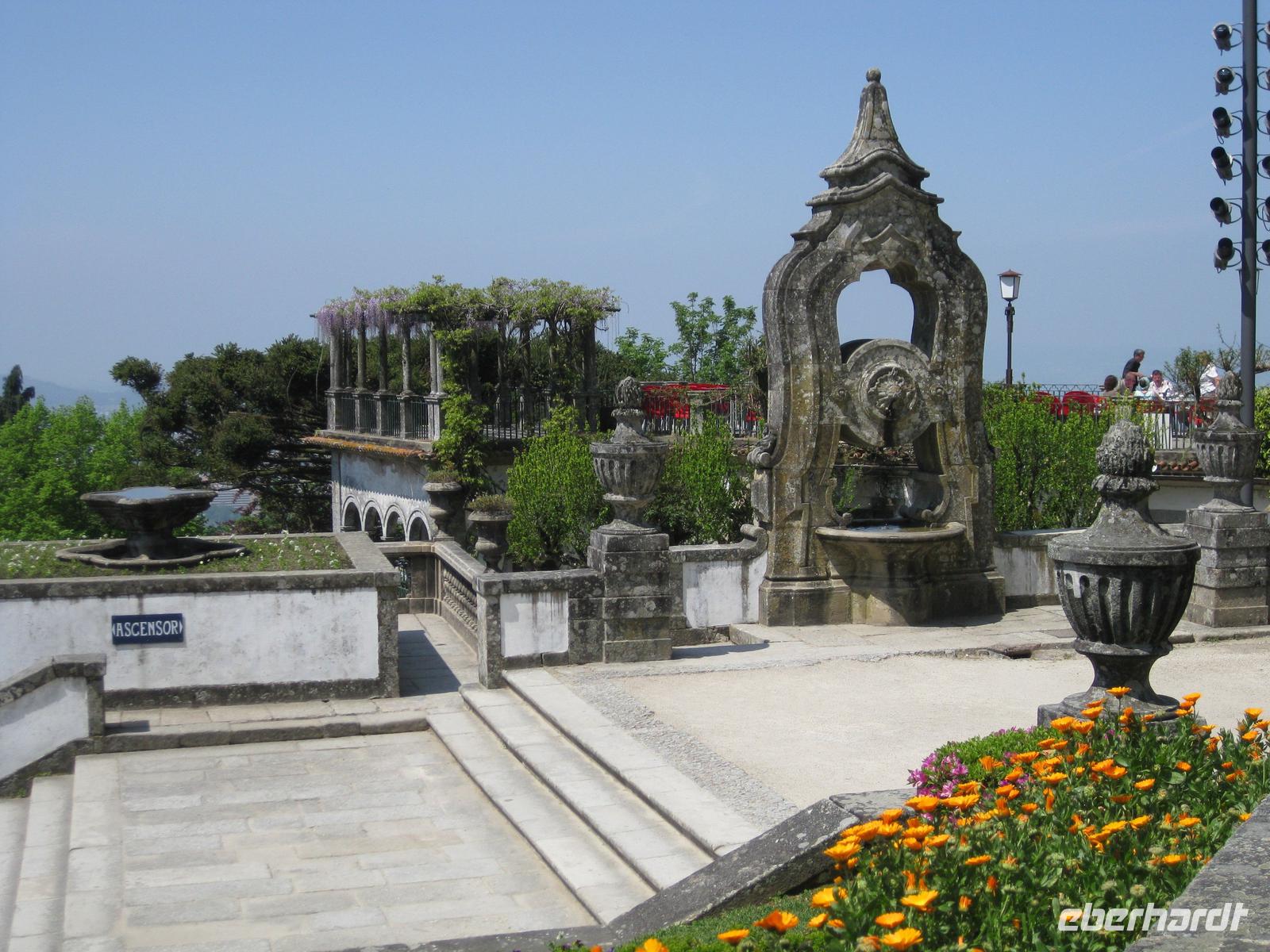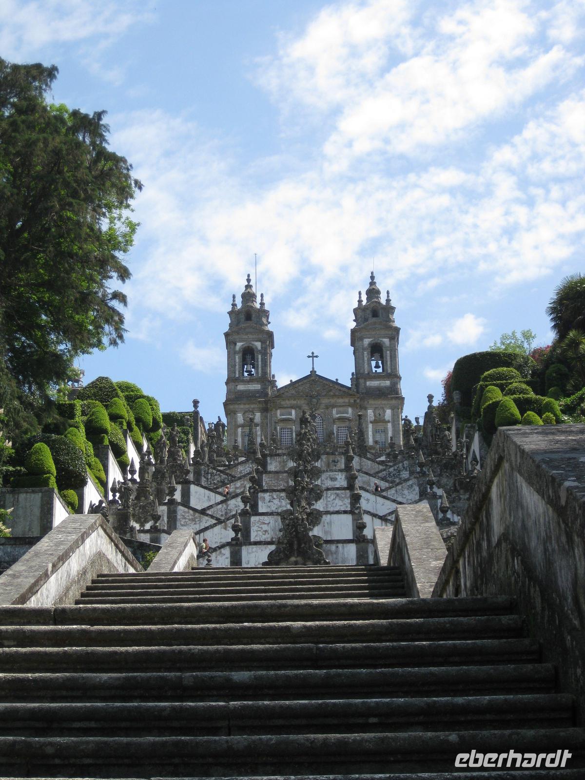 11.00 Uhr fahren wir weiter in Richtung Braga / Bergheiligtum Santuario do Bom Jesus. Um zum Bergheiligtum Santuario do Bom Jesus hinaufzukommen gibt es mehrere Möglichkeiten: zu Fuß die berühmte Freitreppe hinauf steigen, mit dem Bus hinauf fahren oder mit einer alten mit Wasser beschwerten Standseilbahn hinauf fahren. Wir fahren mit der Standseilbahn hinauf - ein besonderes Erlebnis. Oben angekommen sind wir total überrascht von der Schönheit der ganzen Anlage. Die Kirche ist von einem wunderschönen Park umgeben. Und hier oben befinden sich ein schickes Hotel und Restaurant, in denen man gut besondere Feste feiern kann. Und von hier oben eröffnet sich ein toller Blick auf die Stadt Braga. 13.00 Uhr fahren wir dann hinab in die Stadt Braga. Am unteren Ende der Freitreppe halten wir noch mal und können so unser eigenes Foto von dem berühmten Motiv schießen.