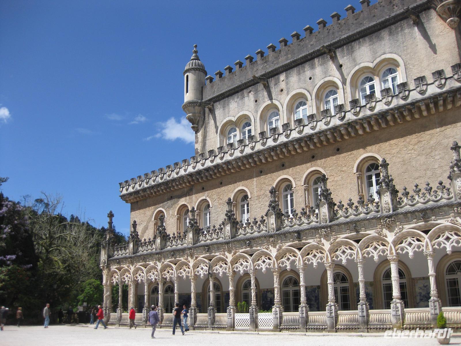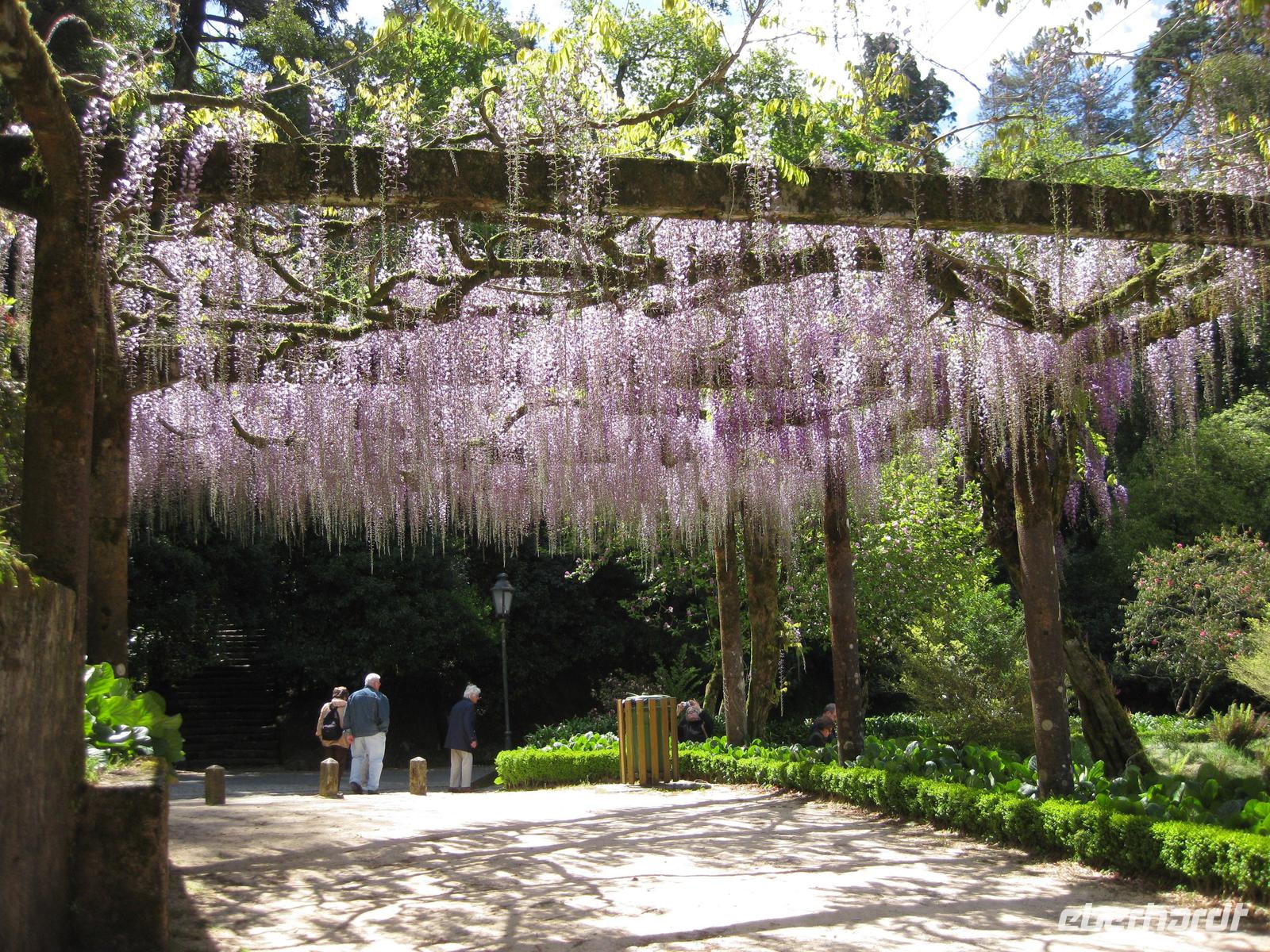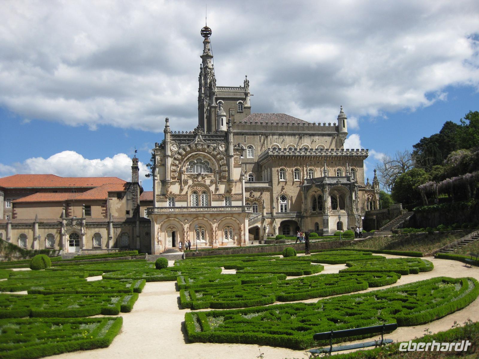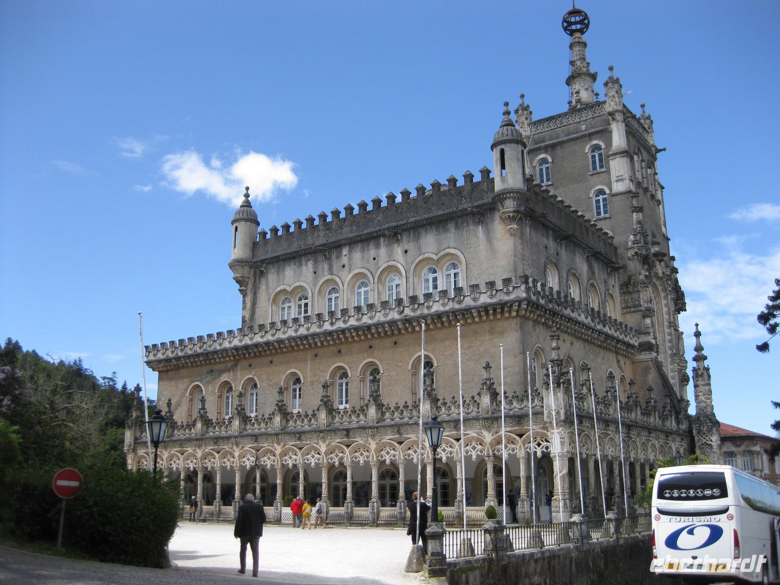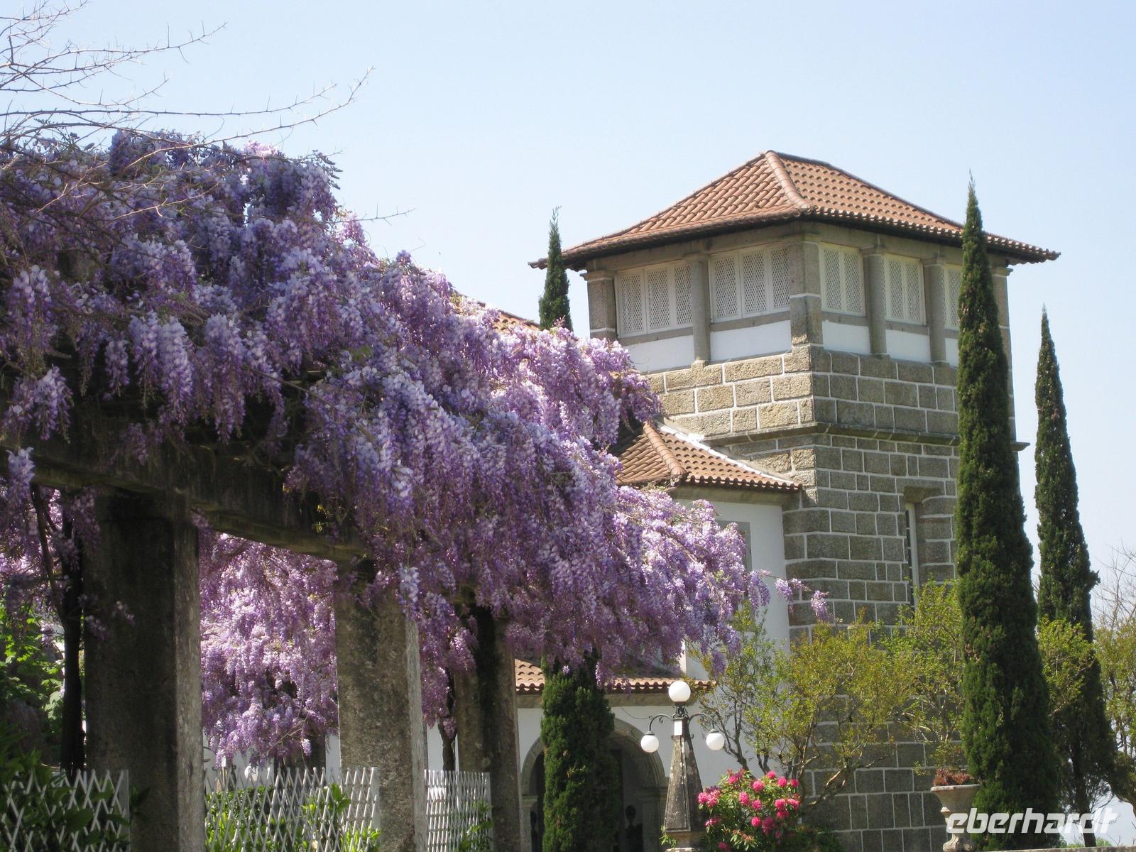 Dann geht es weiter bis zum Parque Nacional do Bucaco bei Luso. Der Parque Nacional do Bucaco ist ein riesiger Waldpark mit einer Sammlung unzähliger Arten von Pflanzen und Bäumen aus aller Welt. Und mittendrin ist ein "Märchenschloss", dass uns vom Baustil her an unser Schloss Neuschwanstein erinnert. Das war früher die Sommerresidenz der portugisischen Königsfamilie und ist jetzt das Luxushotel "Palacio Hotel do Bucaco". Es ist umgeben von einem schönen Park mit vielen Blumen und Pflanzen, besonders beeindruckend ist der mit Blauregen überdachte Wandelgang.