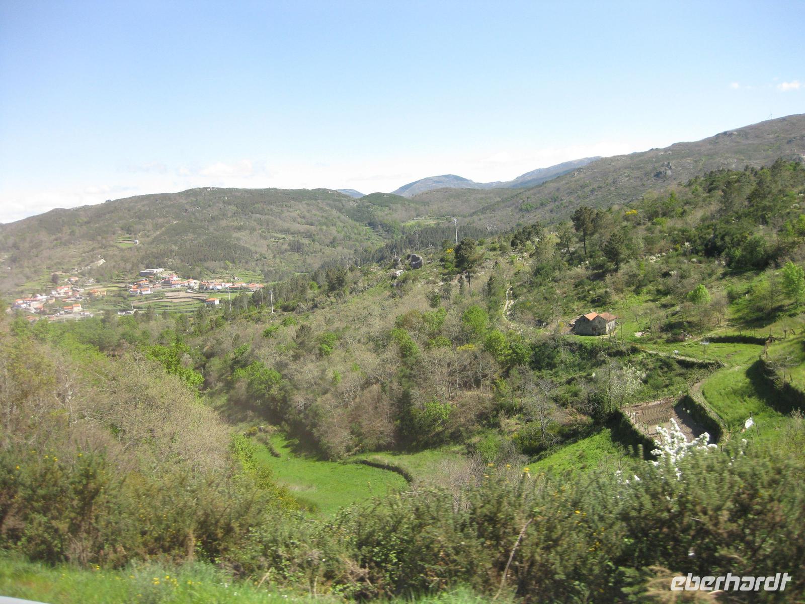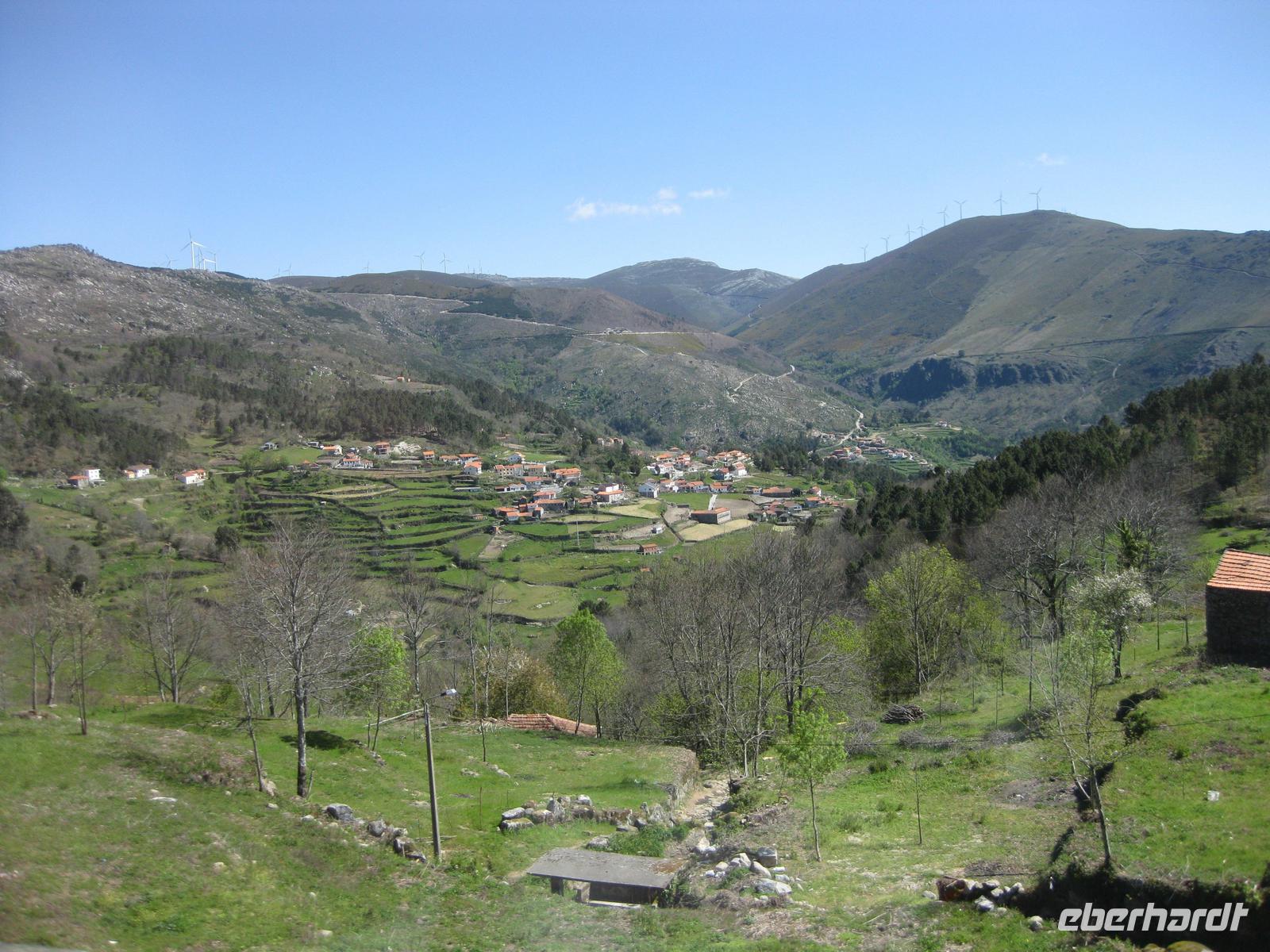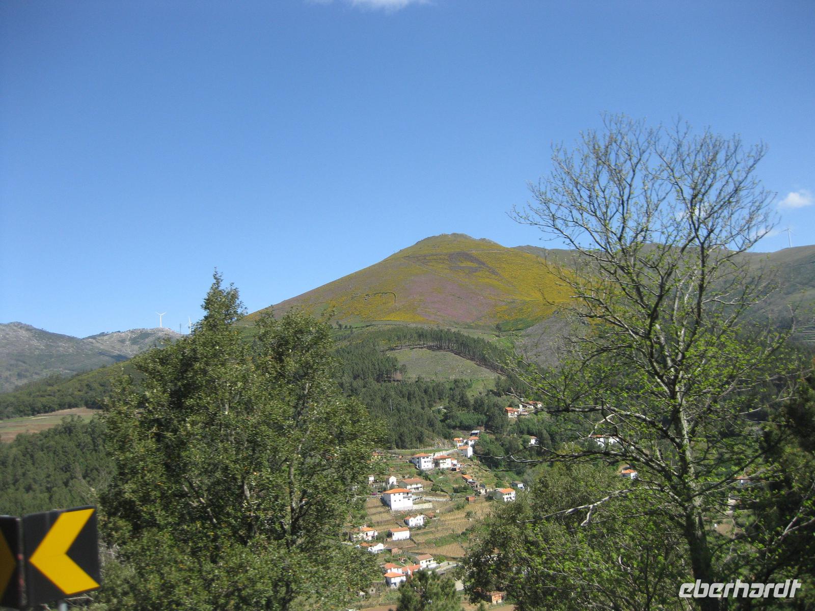 Weiter geht unsere Fahrt über's Gebirge, die Serra do Marao in Richtung Osten, spanische Grenze. Wir fahren eine Serpentinenstraße, überqueren einen Pass und fahren wieder hinunter. Das Gebirge ist so hoch wie unsere Mittelgebirge. Es kann schon mal schneien, aber zum Skifahren reicht es nicht aus. Zum Glück haben wir heute wieder "Kaiserwetter". Unterwegs sehen wir kleine Dörfer und einzelne Qintas. Hier wird schon Wein angebaut. Auf den Bergrücken stehen Windräder zur Stromerzeugung. An den Berghängen blüht es gelb, rot, blau und lila. Es sieht toll aus.