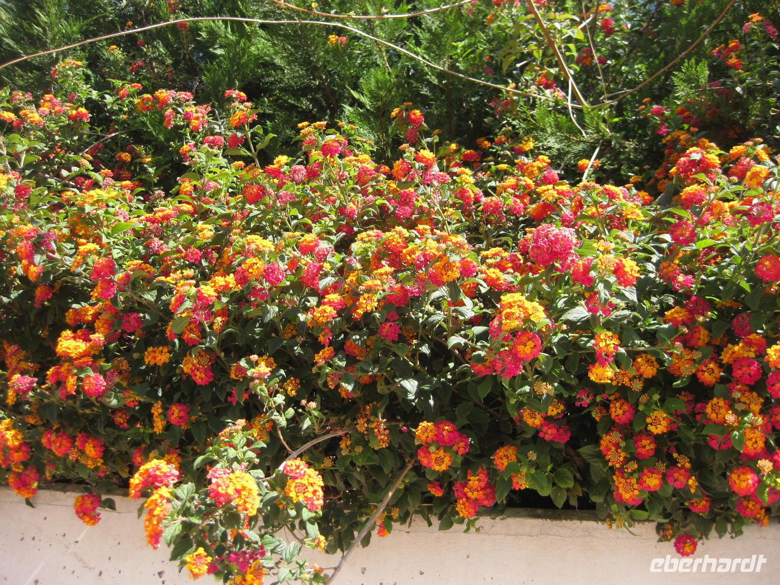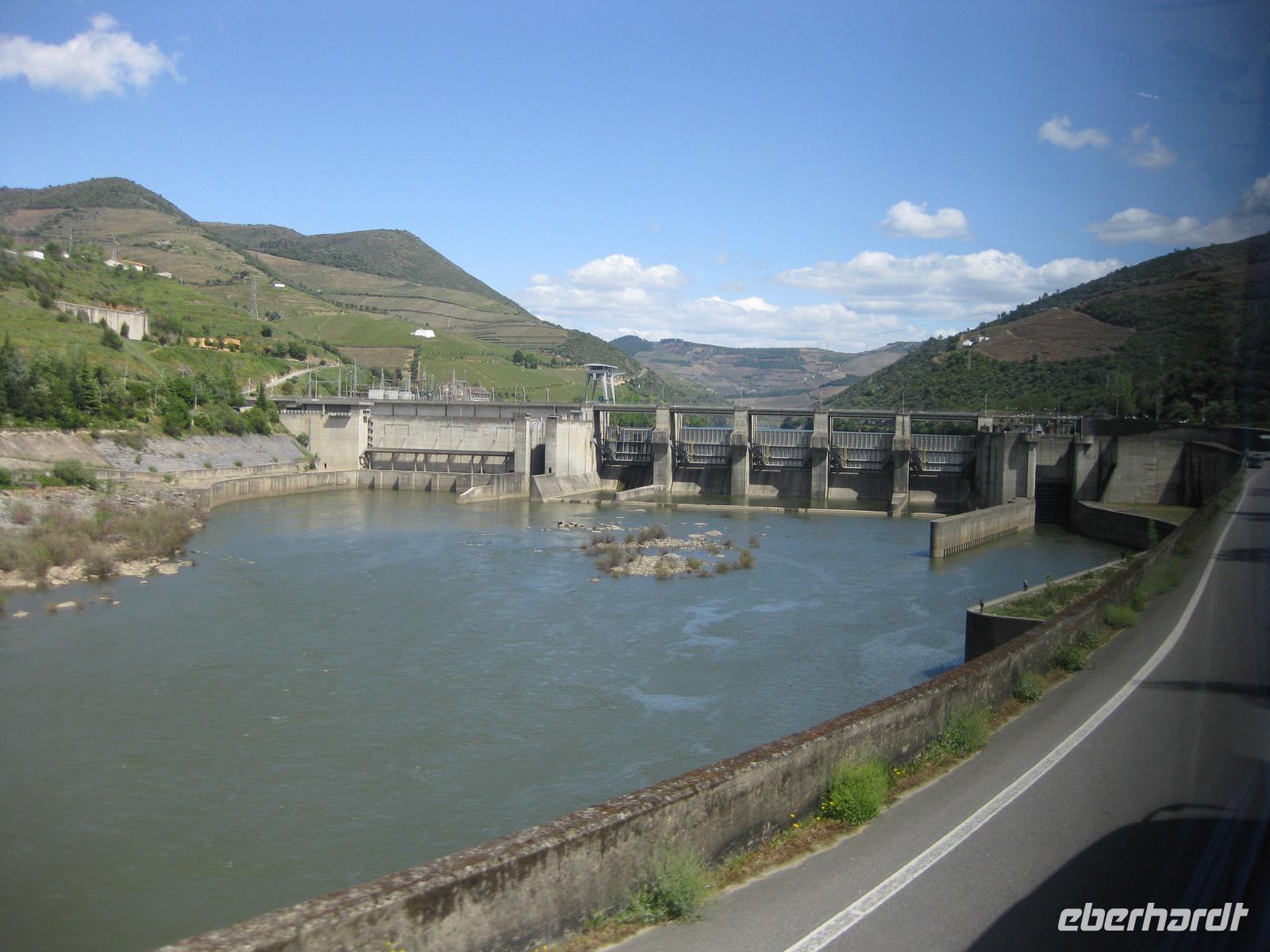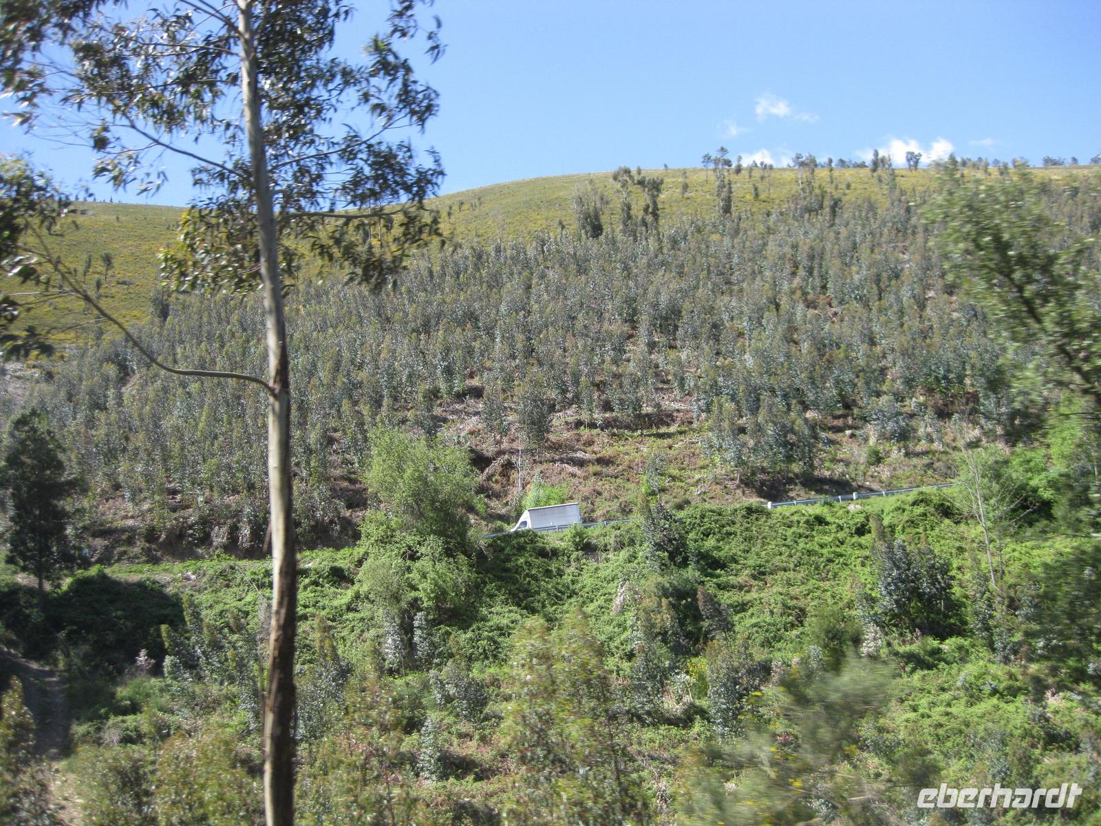 Weiter geht unsere Fahrt über's Gebirge, die Serra do Marao in Richtung Osten, spanische Grenze. Wir fahren eine Serpentinenstraße, überqueren einen Pass und fahren wieder hinunter. Das Gebirge ist so hoch wie unsere Mittelgebirge. Es kann schon mal schneien, aber zum Skifahren reicht es nicht aus. Zum Glück haben wir heute wieder "Kaiserwetter". Unterwegs sehen wir kleine Dörfer und einzelne Qintas. Hier wird schon Wein angebaut. Auf den Bergrücken stehen Windräder zur Stromerzeugung. An den Berghängen blüht es gelb, rot, blau und lila. Es sieht toll aus.