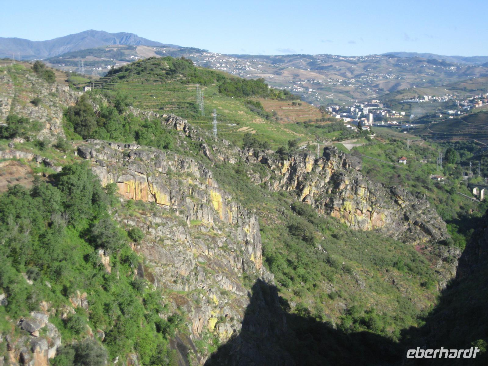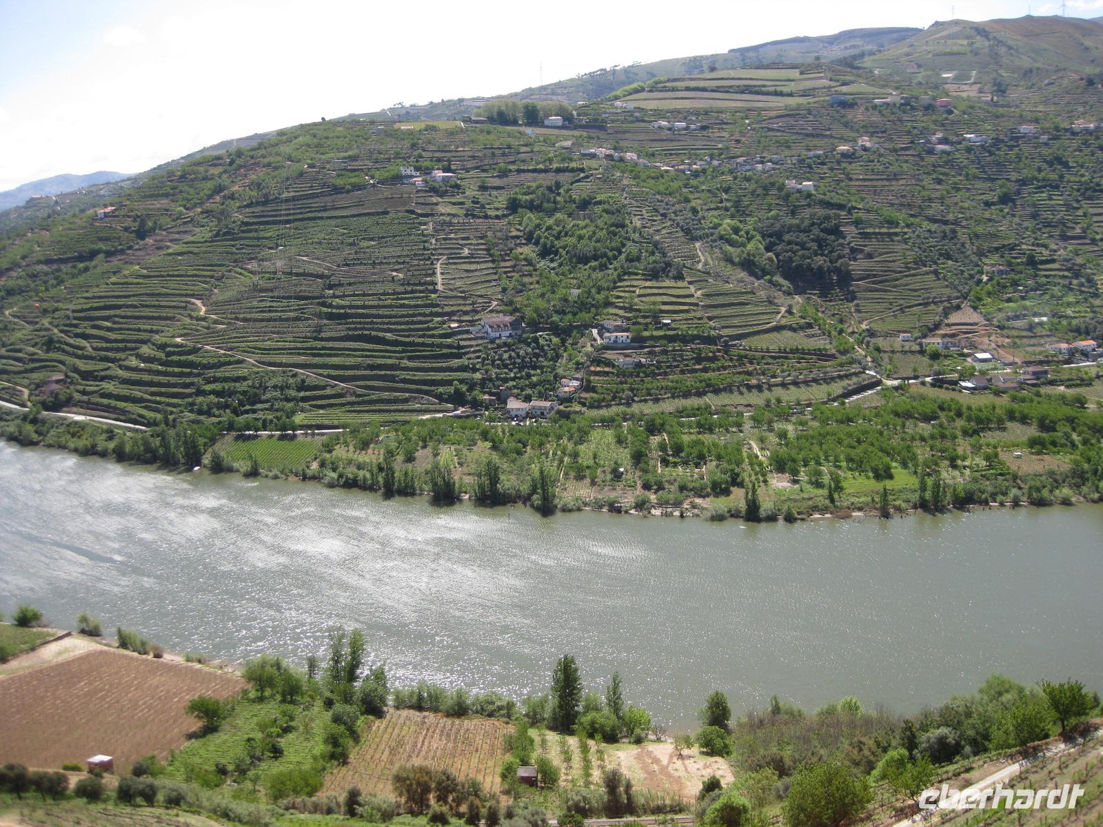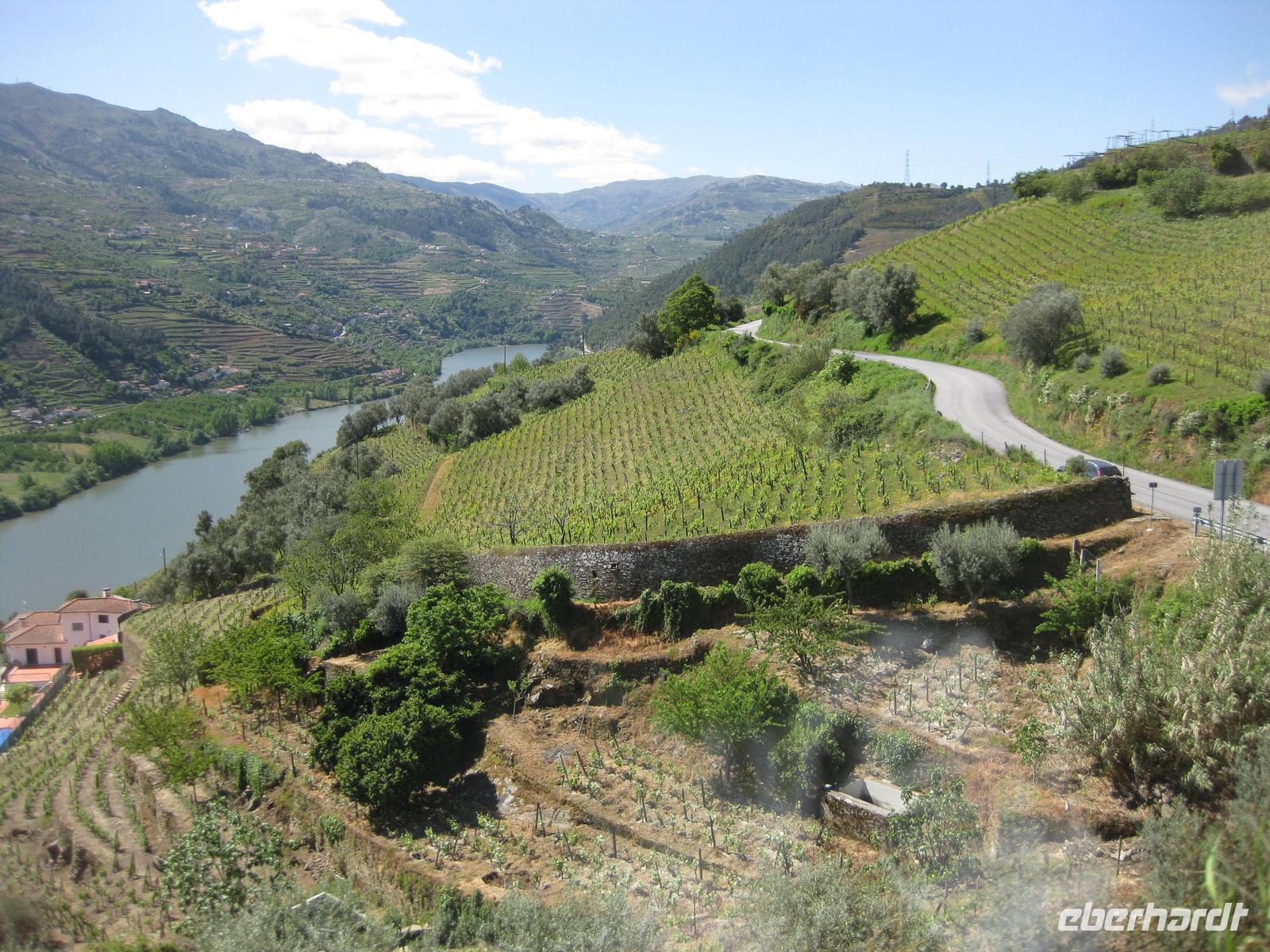 Dann kommen wir in das Weinanbaugebiet am Douro, es wurde zum Weltkulturerbe der Unesco erklärt. Hier wachsen die Rebstöcke für den Portwein. Das Zusammenwirken der Schieferfelsen im Boden, die hier vertikal angeordnet sind, der Fluß mittendrin und die vielen Sonnentage im Jahr begünstigen dieses Gebiet und lassen die Weintrauben für den Portwein reifen. Am Aussichtspunkt halten wir und genießen den Blick über diese wundervolle Landschaft. Überall sind Qintas, die für diese Gegend typischen Herrenhäuser, zu sehen.